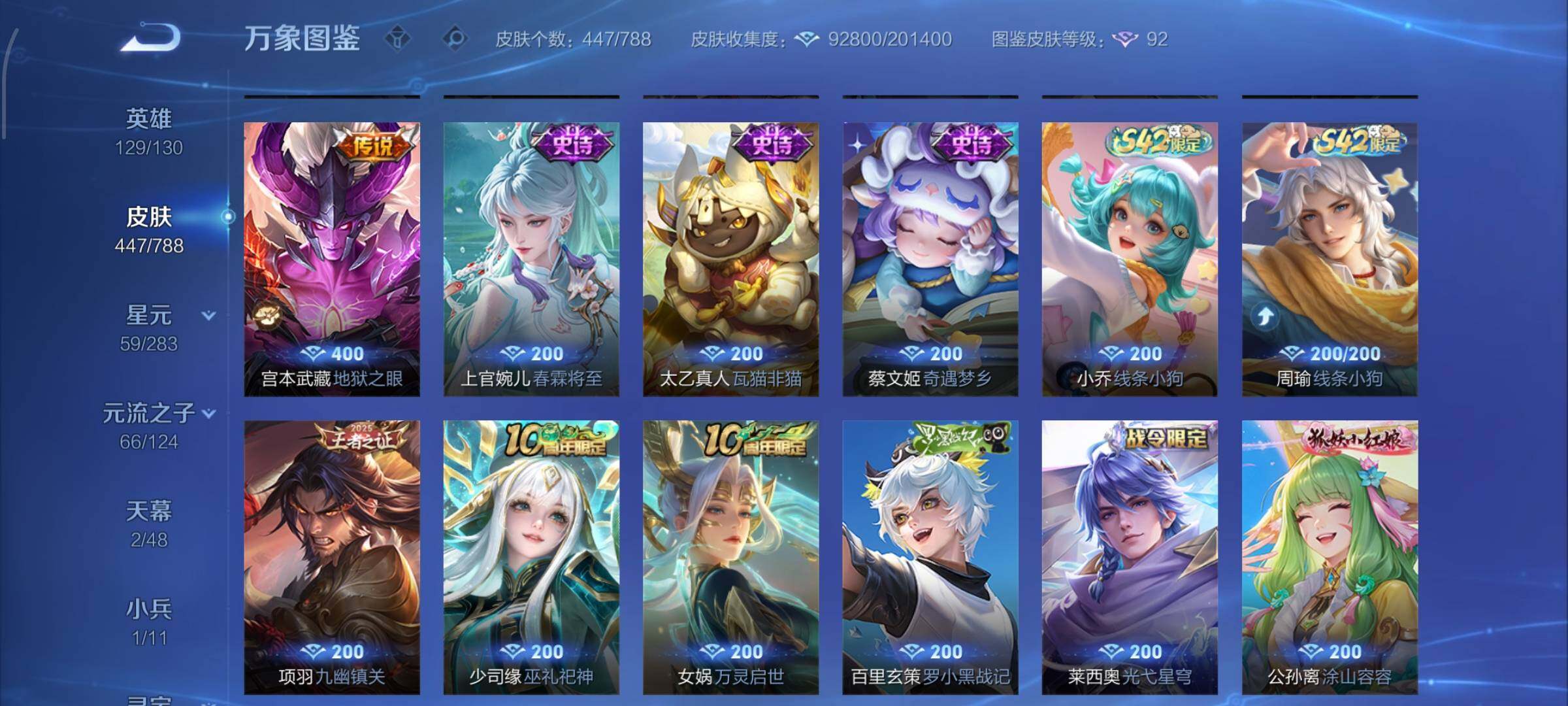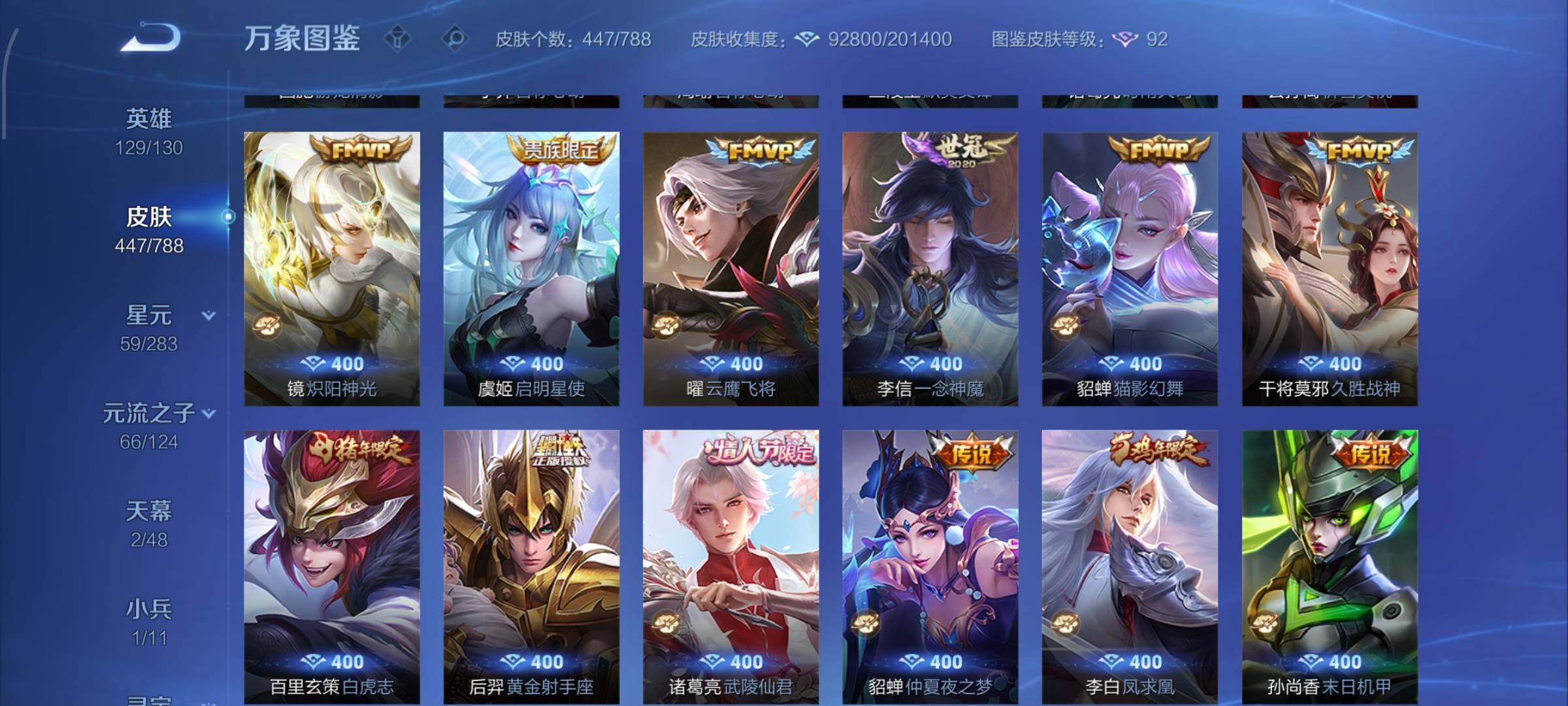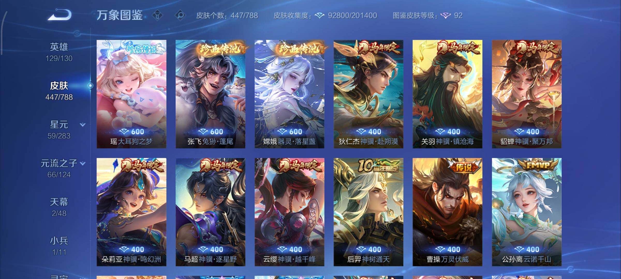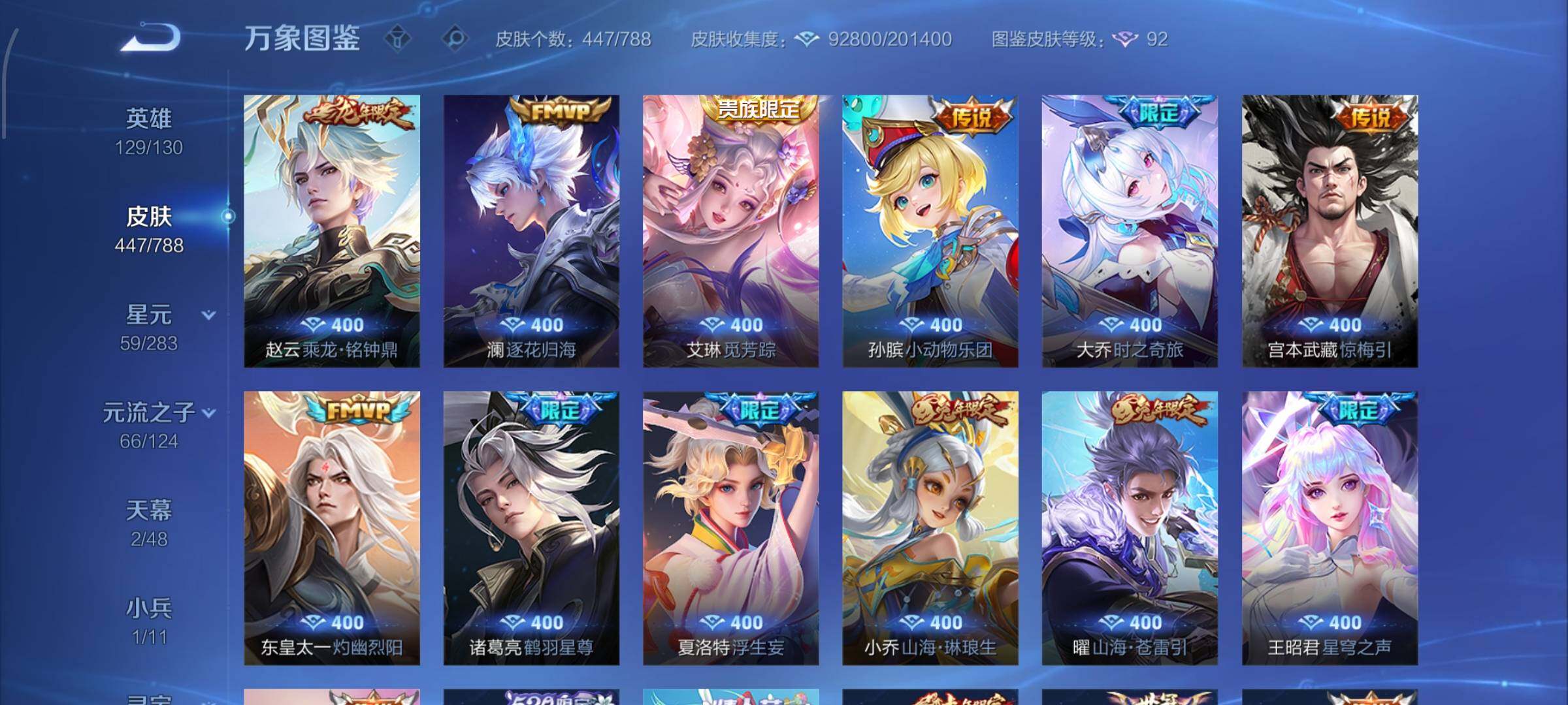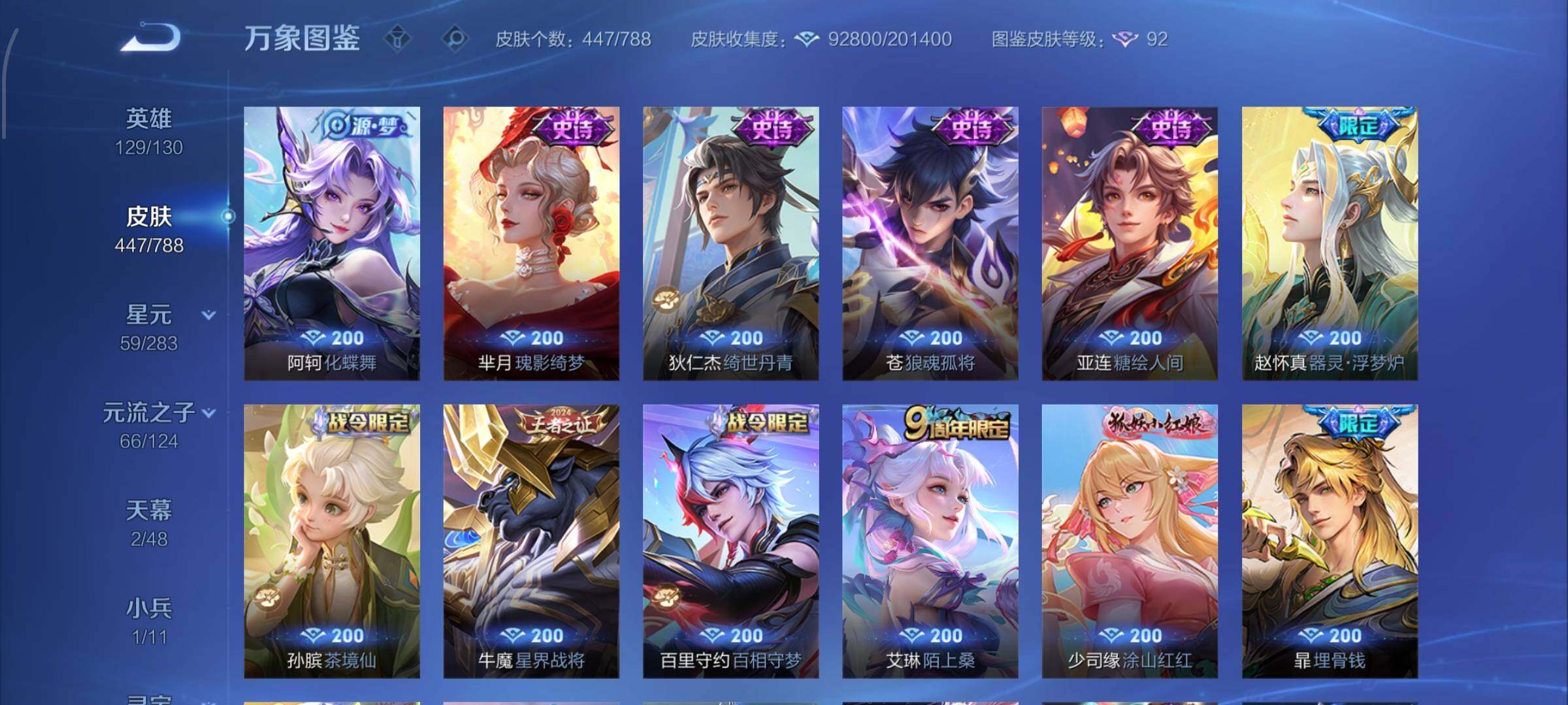 【史诗皮肤】:上官婉儿春霖将至,太乙真人瓦猫非猫,蔡文姬奇遇梦乡,周瑜线条小狗,小乔线条小狗,项羽九幽镇关,少司缘巫礼祀神,女娲万灵启世,百里玄策罗小黑战记,莱西奥光弋星穹,公孙离涂山容容,弈星守夜人,西施织梦人,朵莉亚幻珠鲛人,黄忠百相守梦,云缨赞萌露比,周瑜百相守梦,后羿石田雨龙,亚瑟布丁狗之誓,百里守约雪豹霜爪,扁鹊灵蛊蚀心,狂铁龙之律动,刘禅鸭鸭历险记,阿轲化蝶舞,芈月瑰影绮梦,狄仁杰绮世丹青,苍狼魂孤将,亚连糖绘人间,赵怀真器灵浮梦炉,孙膑茶境仙,牛魔星界战将,百里守约百相守梦,艾琳陌上桑,少司缘涂山红红,暃埋骨钱,蔡文姬夏日便利店,海诺心动手记,镜青焰无极,上官婉儿群星魔术团,桑启奇遇星旅,鲁班七号蔬乡物语,安琪拉乘龙聚宝船,蒙恬荣光圣徽,高渐离燃音魔法,妲己灵卜魔法,蒙犽百解令,西施至美乘鲤谣,阿古朵江河有灵,司空震地狱燃心,百里守约真我赫兹,米莱狄完美假期,戈娅驭风魔法,刘禅电玩爆裂旋风,蔡文姬电玩兔顽号,关羽百相守梦,扁鹊奇幻香踪,杨玉环银翎春语,瑶山海碧波行,盘古冰霜神祇,马可波罗山海玄木吟,暃星界游侠,梦奇顽趣,元歌无心,上官婉儿神器万象笔,盾山梦圆繁星,鬼谷子五谷丰年,妲己时之奇旅,弈星滕王阁序,钟无艳超时空战士,庄周天秀幻梦,狂铁电玩高手,貂蝉唤灵魅影,明世隐吟游魔法,艾琳奇遇舞章,澜赏金猎手,赵云百木心枪,夏洛特永昼,孙膑寅虎展翼,廉颇寅虎御盾,杨玉环寅虎心曲,韩信傲雪梅枪,雅典娜黎明之约,黄忠火炮绅士,嫦娥拒霜思,司马懿暗渊魔法,孙悟空孙行者,安琪拉时之奇旅,钟馗乐园奇幻夜,沈梦溪月团寄思,干将莫邪真爱魔法,伽罗天狼溯光者,百里玄策热力回旋,西施诗语江南,米莱狄胡桃异想国,花木兰默契交锋,吕布御风骁将,芈月白晶晶,元歌云间偶戏,云中君纤云弄巧,百里玄策原初追逐者,蒙犽狂想玩偶喵,马可波罗暗影游猎,上官婉儿天狼绘梦者,孙尚香时之恋人,赵云龙胆,瑶遇见神鹿,马超神威,橘右京修罗,阿轲迷踪丽影,不知火舞魅语,小乔青蛇,大乔白蛇,后羿如梦令,甄姬幽恒,妲己时之彼端,韩信飞衡,娜可露露晚萤,蔡文姬繁星吟游,公孙离无限星赏官,狄仁杰鹰眼统帅,鲁班七号狮舞东方,伽罗箭羽风息,大乔猫狗日记,孙策猫狗日记,杨玉环遇见飞天,阿轲节奏热浪,白起星夜王子,程咬金功夫厨神,李元芳逐浪之夏,刘禅天才门将,蔡文姬舞动绿茵,铠曙光守护者,百里守约特工魅影,安琪拉心灵骇客,雅典娜冰冠公主,亚瑟心灵战警,诸葛亮黄金分割率,兰陵王暗隐猎兽者,小乔缤纷独角兽,夏侯惇乘风破浪,刘邦德古拉伯爵,花木兰水晶猎龙者,王昭君凤凰于飞,貂蝉逐梦之音,张飞乱世虎臣,安琪拉魔法小厨娘,吕布末日机甲,李白千年之狐,曹操幽灵船长,刘禅绅士熊喵,吕布圣诞狂欢,墨子金属风暴,墨子龙骑士,妲己女仆咖啡,妲己魅力维加斯,嬴政摇滚巨星,嬴政暗夜贵公子,嬴政优雅恋人,孙尚香水果甜心,宫本武藏鬼剑武藏,廉颇地狱岩魂,狄仁杰魔术师,王昭君偶像歌手,甄姬冰雪圆舞曲,貂蝉圣诞恋歌,赵云未来纪元,赵云皇家上将,阿轲暗夜猫娘,露娜紫霞仙子,鲁班七号电玩小子