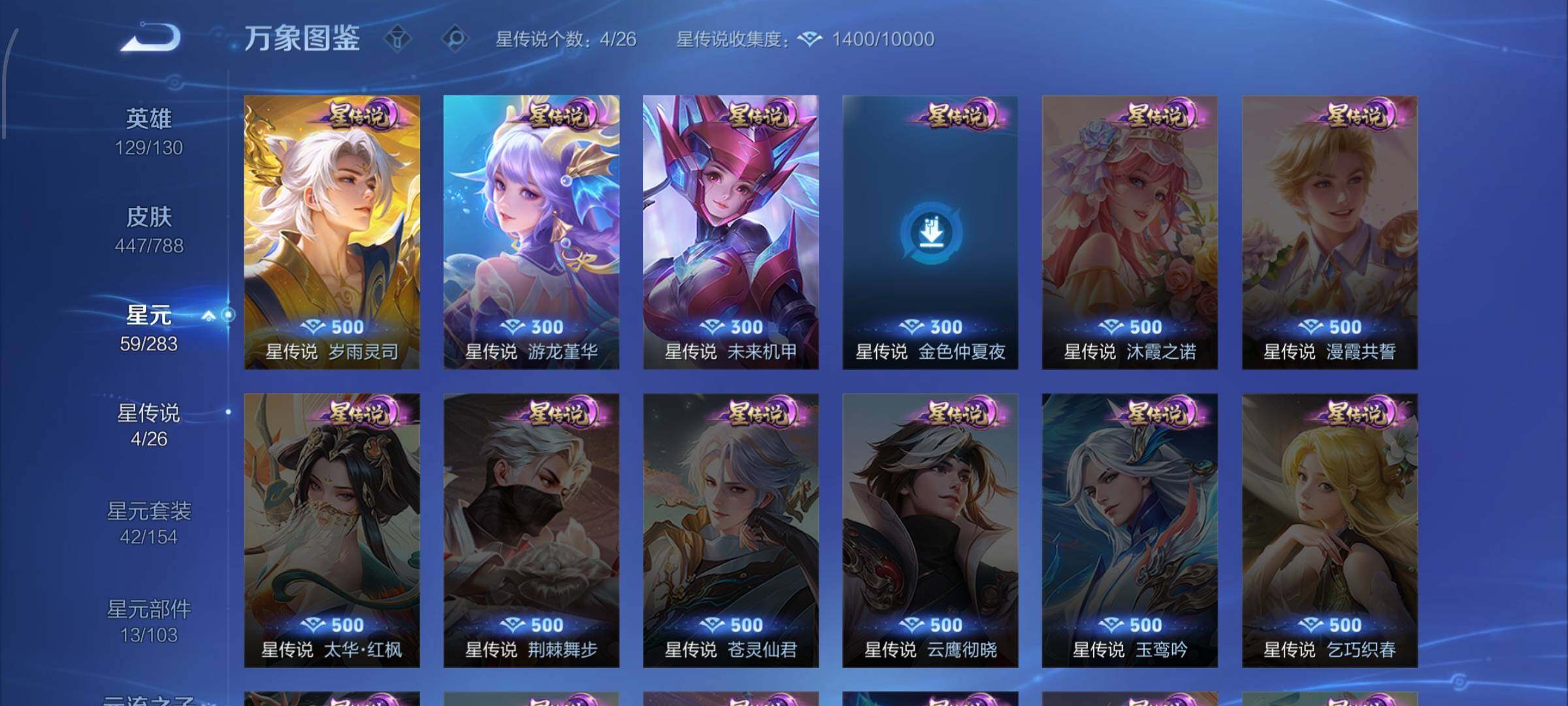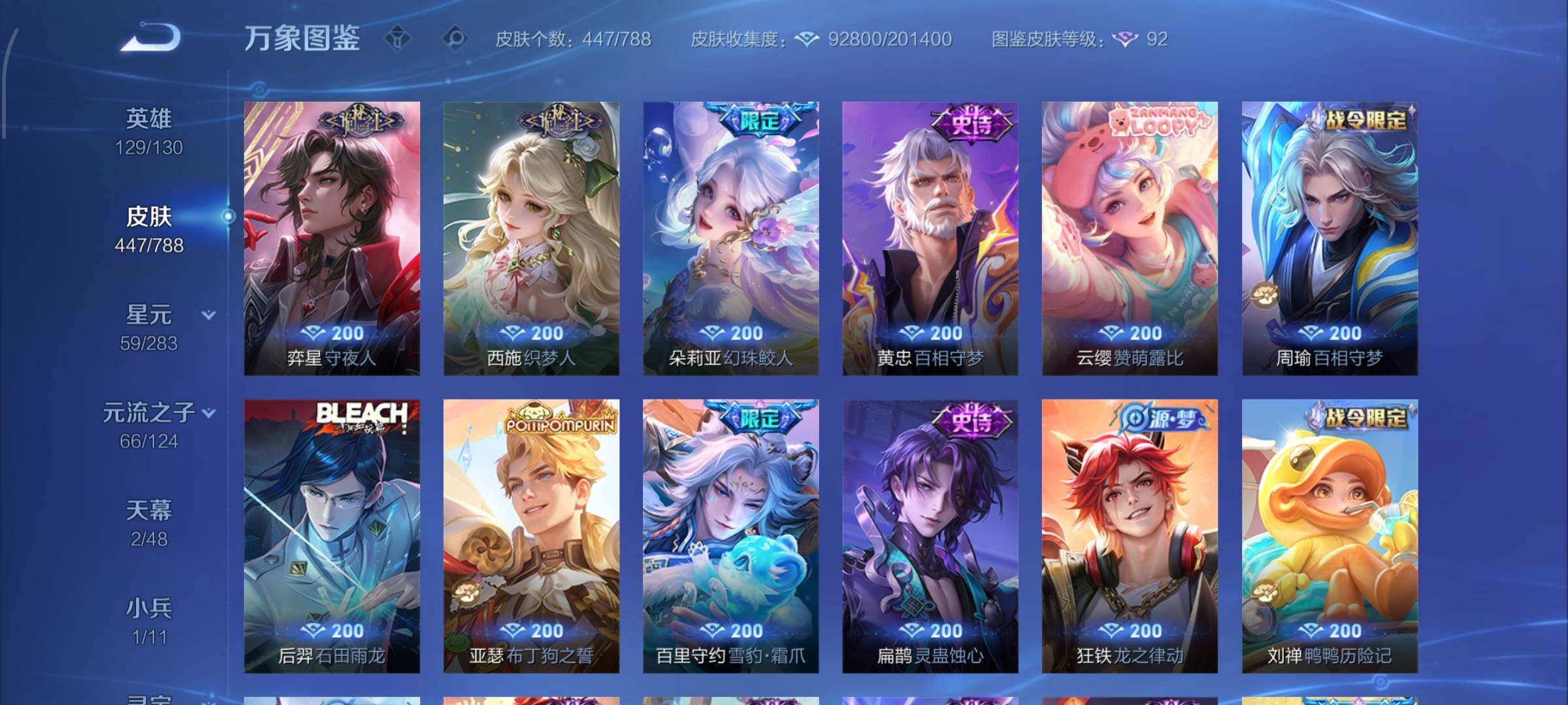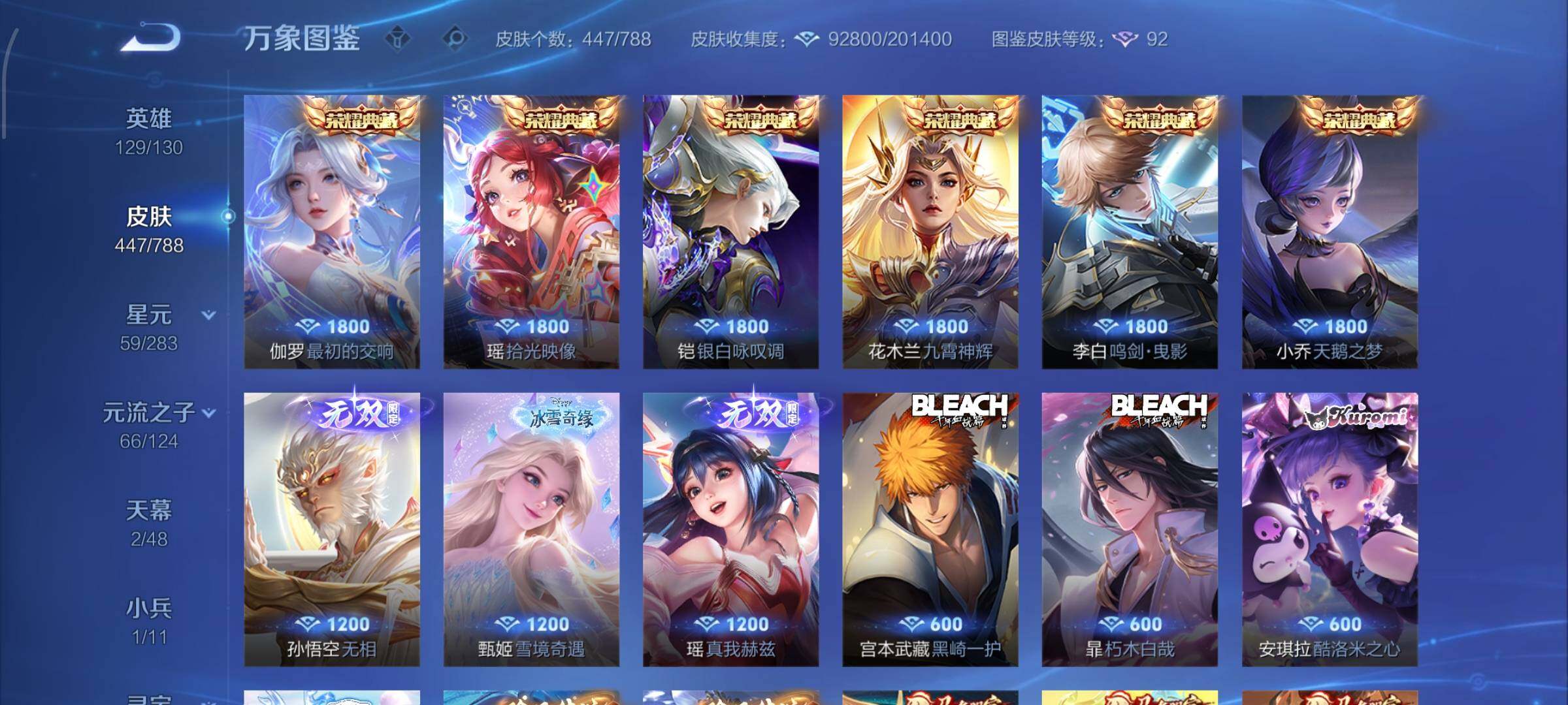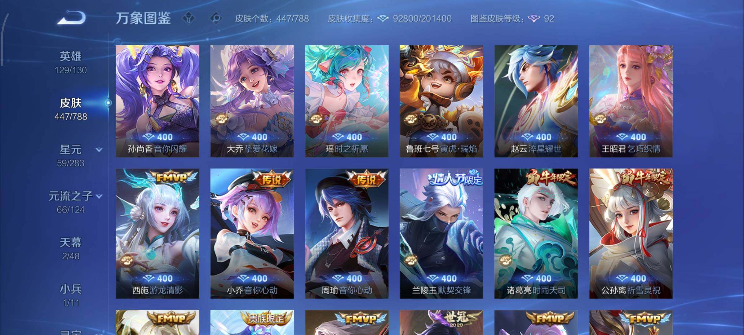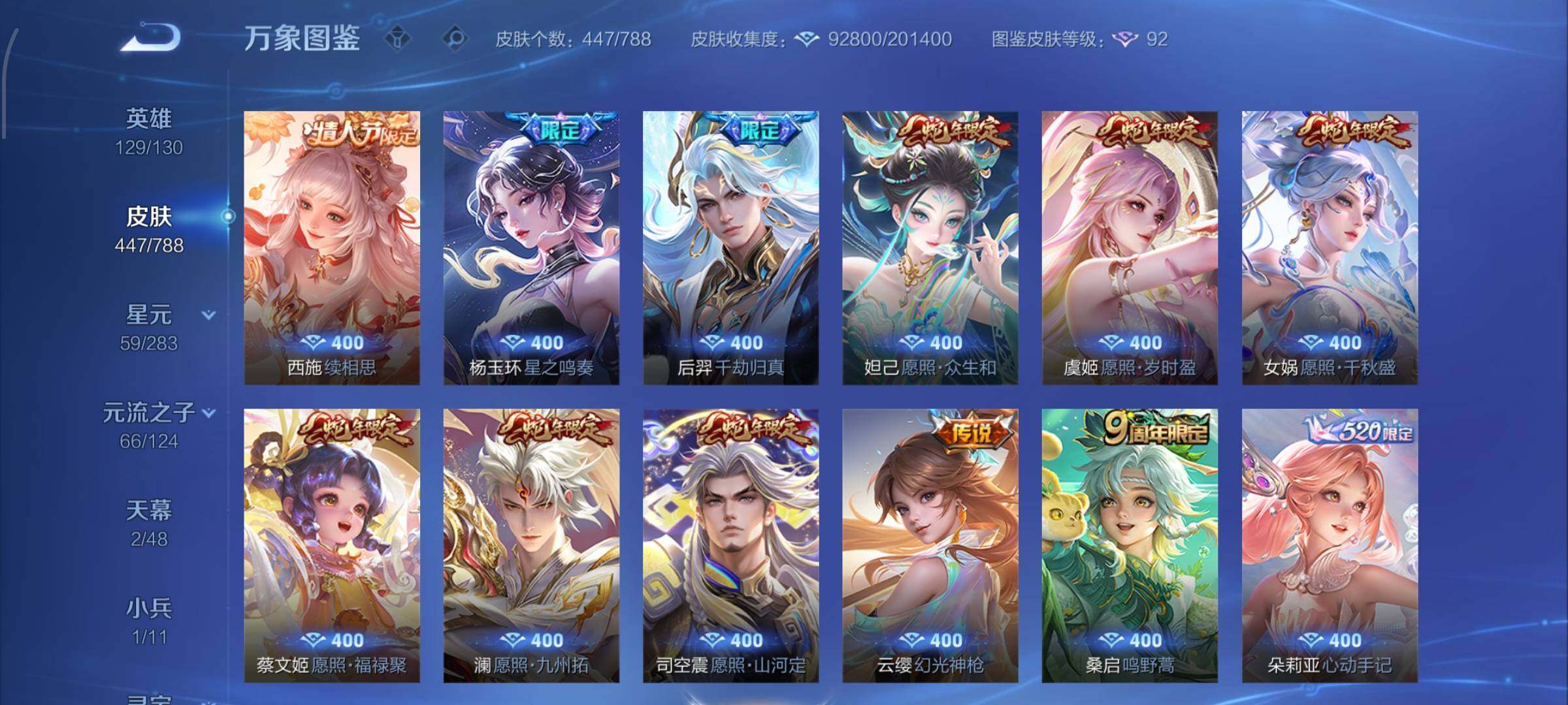 【史诗皮肤】:上官婉儿春霖将至,太乙真人瓦猫非猫,蔡文姬奇遇梦乡,周瑜线条小狗,小乔线条小狗,项羽九幽镇关,少司缘巫礼祀神,女娲万灵启世,百里玄策罗小黑战记,莱西奥光弋星穹,公孙离涂山容容,弈星守夜人,西施织梦人,朵莉亚幻珠鲛人,黄忠百相守梦,云缨赞萌露比,周瑜百相守梦,后羿石田雨龙,亚瑟布丁狗之誓,百里守约雪豹霜爪,扁鹊灵蛊蚀心,狂铁龙之律动,刘禅鸭鸭历险记,阿轲化蝶舞,芈月瑰影绮梦,狄仁杰绮世丹青,苍狼魂孤将,亚连糖绘人间,赵怀真器灵浮梦炉,孙膑茶境仙,牛魔星界战将,百里守约百相守梦,艾琳陌上桑,少司缘涂山红红,暃埋骨钱,蔡文姬夏日便利店,海诺心动手记,镜青焰无极,上官婉儿群星魔术团,桑启奇遇星旅,鲁班七号蔬乡物语,安琪拉乘龙聚宝船,蒙恬荣光圣徽,高渐离燃音魔法,妲己灵卜魔法,蒙犽百解令,西施至美乘鲤谣,阿古朵江河有灵,司空震地狱燃心,百里守约真我赫兹,米莱狄完美假期,戈娅驭风魔法,刘禅电玩爆裂旋风,蔡文姬电玩兔顽号,关羽百相守梦,扁鹊奇幻香踪,杨玉环银翎春语,瑶山海碧波行,盘古冰霜神祇,马可波罗山海玄木吟,暃星界游侠,梦奇顽趣,元歌无心,上官婉儿神器万象笔,盾山梦圆繁星,鬼谷子五谷丰年,妲己时之奇旅,弈星滕王阁序,钟无艳超时空战士,庄周天秀幻梦,狂铁电玩高手,貂蝉唤灵魅影,明世隐吟游魔法,艾琳奇遇舞章,澜赏金猎手,赵云百木心枪,夏洛特永昼,孙膑寅虎展翼,廉颇寅虎御盾,杨玉环寅虎心曲,韩信傲雪梅枪,雅典娜黎明之约,黄忠火炮绅士,嫦娥拒霜思,司马懿暗渊魔法,孙悟空孙行者,安琪拉时之奇旅,钟馗乐园奇幻夜,沈梦溪月团寄思,干将莫邪真爱魔法,伽罗天狼溯光者,百里玄策热力回旋,西施诗语江南,米莱狄胡桃异想国,花木兰默契交锋,吕布御风骁将,芈月白晶晶,元歌云间偶戏,云中君纤云弄巧,百里玄策原初追逐者,蒙犽狂想玩偶喵,马可波罗暗影游猎,上官婉儿天狼绘梦者,孙尚香时之恋人,赵云龙胆,瑶遇见神鹿,马超神威,橘右京修罗,阿轲迷踪丽影,不知火舞魅语,小乔青蛇,大乔白蛇,后羿如梦令,甄姬幽恒,妲己时之彼端,韩信飞衡,娜可露露晚萤,蔡文姬繁星吟游,公孙离无限星赏官,狄仁杰鹰眼统帅,鲁班七号狮舞东方,伽罗箭羽风息,大乔猫狗日记,孙策猫狗日记,杨玉环遇见飞天,阿轲节奏热浪,白起星夜王子,程咬金功夫厨神,李元芳逐浪之夏,刘禅天才门将,蔡文姬舞动绿茵,铠曙光守护者,百里守约特工魅影,安琪拉心灵骇客,雅典娜冰冠公主,亚瑟心灵战警,诸葛亮黄金分割率,兰陵王暗隐猎兽者,小乔缤纷独角兽,夏侯惇乘风破浪,刘邦德古拉伯爵,花木兰水晶猎龙者,王昭君凤凰于飞,貂蝉逐梦之音,张飞乱世虎臣,安琪拉魔法小厨娘,吕布末日机甲,李白千年之狐,曹操幽灵船长,刘禅绅士熊喵,吕布圣诞狂欢,墨子金属风暴,墨子龙骑士,妲己女仆咖啡,妲己魅力维加斯,嬴政摇滚巨星,嬴政暗夜贵公子,嬴政优雅恋人,孙尚香水果甜心,宫本武藏鬼剑武藏,廉颇地狱岩魂,狄仁杰魔术师,王昭君偶像歌手,甄姬冰雪圆舞曲,貂蝉圣诞恋歌,赵云未来纪元,赵云皇家上将,阿轲暗夜猫娘,露娜紫霞仙子,鲁班七号电玩小子