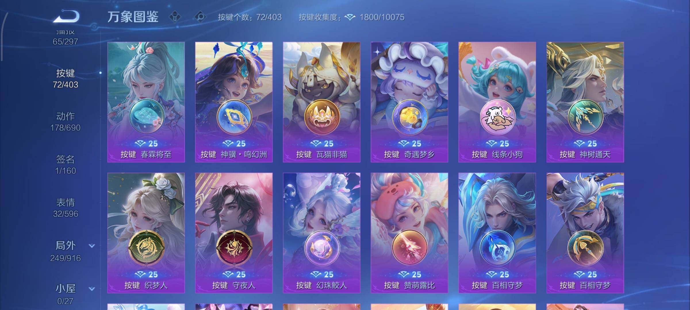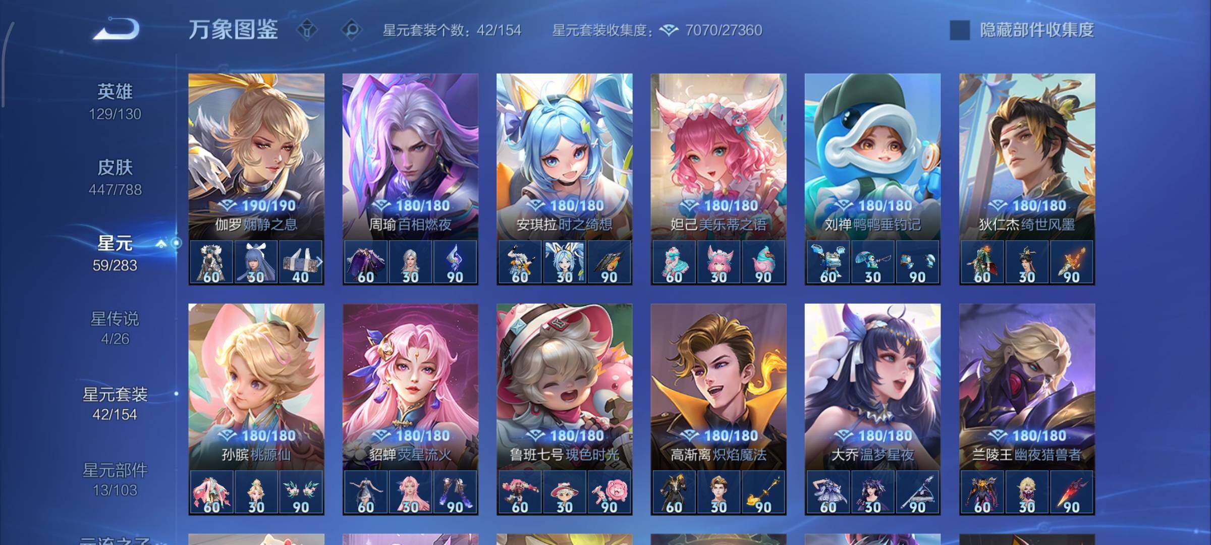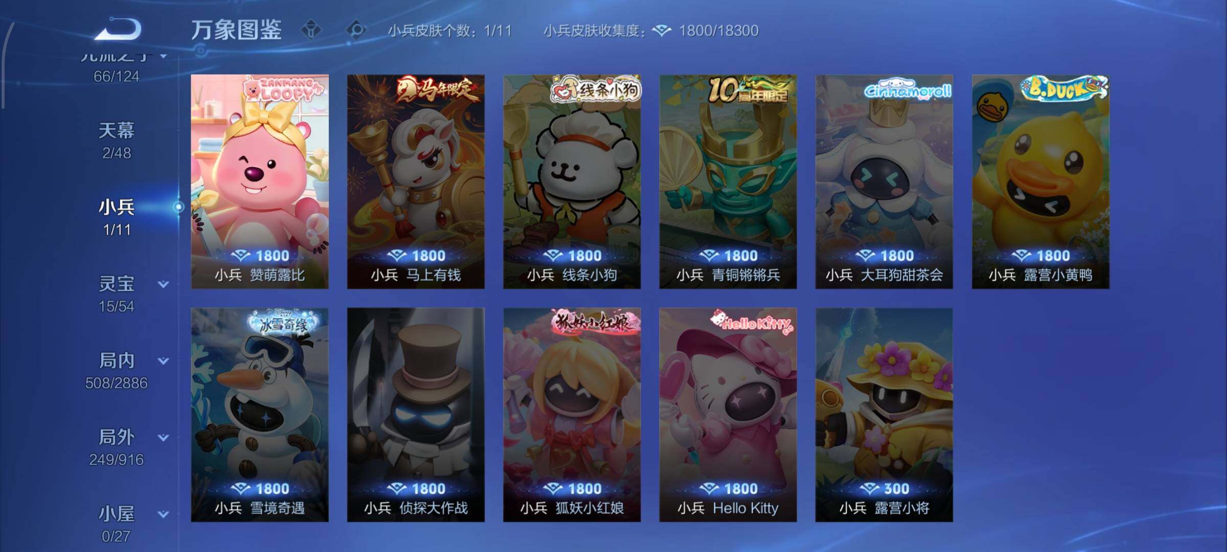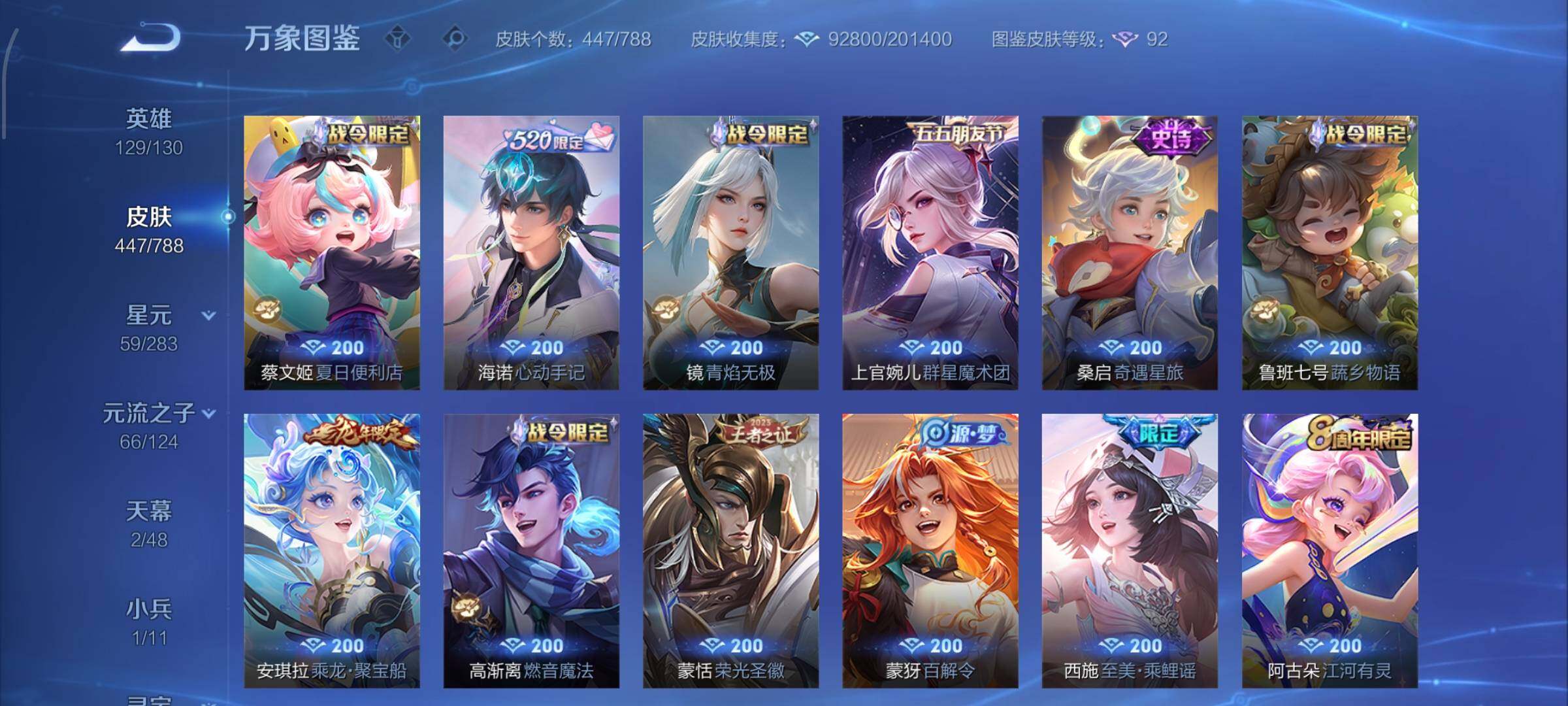 【战令限定】:吕布猎兽之王,女娲朔望之晖,鲁班七号狮舞东方,阿轲迷踪丽影,马可波罗暗影游猎,蒙犽狂想玩偶喵,雅典娜单词大作战,元歌云间偶戏,米莱狄胡桃异想国,干将莫邪真爱魔法,黄忠火炮绅士,芈月幻夜卜梦,明世隐吟游魔法,白起夜都怪侠,狂铁电玩高手,王昭君午后时光,钟无艳超时空战士,甄姬落雪兰心,暃星界游侠,嫦娥暖冬兔眠,扁鹊奇幻香踪,杨戬潮玩骑兵,戈娅驭风魔法,西施玲珑珍味,司空震地狱燃心,艾琳流音漫舞,高渐离燃音魔法,妲己灵卜魔法,鲁班七号蔬乡物语,李元芳蔬乡物语,镜青焰无极,项羽苍威无极,蔡文姬夏日便利店,虞姬夏日便利店,百里守约百相守梦,老夫子百相守梦,孙膑茶境仙,马超访茗客,刘禅鸭鸭历险记,沈梦溪鸭鸭历险记,周瑜百相守梦,孙策百相守梦,莱西奥光弋星穹,明世隐往忆晖光,周瑜线条小狗,小乔线条小狗