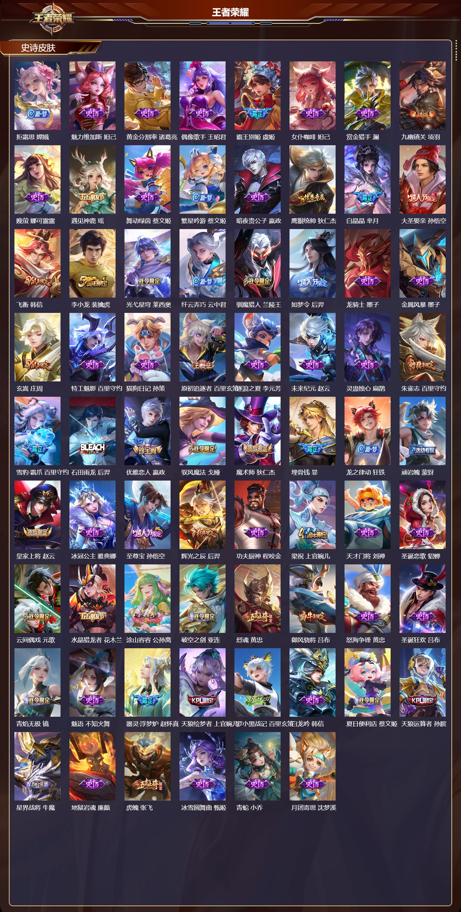 【129,史诗皮肤】奔雷神使,牛魔,电玩小子,鲁班七号,末日机甲,吕布,白昼王子,嬴政,紫霞仙子,露娜,百解令,蒙犽,银河之约,李元芳,云端筑梦师,庄周,雪夜绮愿,周瑜,暗渊魔法,司马懿,暗影游猎,马可波罗,苍穹之光,项羽,天秀·启明,杨戬,狮舞东方,鲁班七号,猫狗日记,大乔,妄想食味,姬小满,德古拉伯爵,刘邦,山海·玄木吟,马可波罗,心灵战警,亚瑟,五谷丰年,鬼谷子,无心,元歌,巫礼祀神,少司缘,鬼剑武藏,宫本武藏,百相守梦,黄忠,迷踪丽影,阿轲,星夜王子,白起,无限星赏官,公孙离,地狱燃心,司空震,线条小狗,周瑜,百晓客,明世隐,遇见飞天,杨玉环,摇滚巨星,嬴政,修罗,橘右京,拒霜思,嫦娥,魅力维加斯,妲己,黄金分割率,诸葛亮,偶像歌手,王昭君,霸王别姬,虞姬,女仆咖啡,妲己,赏金猎手,澜,九幽镇关,项羽,晚萤,娜可露露,遇见神鹿,瑶,舞动绿茵,蔡文姬,繁星吟游,蔡文姬,暗夜贵公子,嬴政,鹰眼统帅,狄仁杰,白晶晶,芈月,大圣娶亲,孙悟空,飞衡,韩信,李小龙,裴擒虎,光弋星穹,莱西奥,纤云弄巧,云中君,驯魔猎人,兰陵王,如梦令,后羿,龙骑士,墨子,金属风暴,墨子,玄嵩,庄周,特工魅影,百里守约,猫狗日记,孙策,原初追逐者,百里玄策,逐浪之夏,李元芳,未来纪元,赵云,灵蛊蚀心,扁鹊,朱雀志,百里守约,雪豹·霜爪,百里守约,石田雨龙,后羿,优雅恋人,嬴政,驭风魔法,戈娅,魔术师,狄仁杰,埋骨钱,暃,龙之律动,狂铁,顽岩魄,蒙犽,皇家上将,赵云,冰冠公主,雅典娜,至尊宝,孙悟空,辉光之辰,后羿,功夫厨神,程咬金,梁祝,上官婉儿,天才门将,刘禅,圣诞恋歌,貂蝉,云间偶戏,元歌,水晶猎龙者,花木兰,涂山容容,公孙离,破空之剑,亚连,烈魂,黄忠,御风骁将,吕布,怒海争锋,黄忠,圣诞狂欢,吕布,青焰无极,镜,魅语,不知火舞,器灵·浮梦炉,赵怀真,天狼绘梦者,上官婉儿,罗小黑战记,百里玄策,白龙吟,韩信,夏日便利店,蔡文姬,天狼运算者,孙膑,星界战将,牛魔,地狱岩魂,廉颇,虎魄,张飞,冰雪圆舞曲,甄姬,青蛇,小乔,月团寄思,沈梦溪,千年之狐,李白,节奏热浪,阿轲,暗夜猫娘,阿轲,织梦人,西施,曙光守护者,铠,万灵启世,女娲,心灵骇客,安琪拉,乘龙·聚宝船,安琪拉,箭羽风息,伽罗,乱世虎臣,张飞,天狼征服者,曹操,琥珀纪元,伽罗,谪仙醉月,李白,绅士熊喵,刘禅,缤纷独角兽,小乔,线条小狗,小乔,蓝屏警告,典韦,天狼狩猎者,裴擒虎,时之恋人,孙尚香,水果甜心,孙尚香,狂想玩偶喵,蒙犽,化蝶舞,阿轲,江河有灵,阿古朵,幽灵船长,曹操,乘风破浪,夏侯惇,暗隐猎兽者,兰陵王,