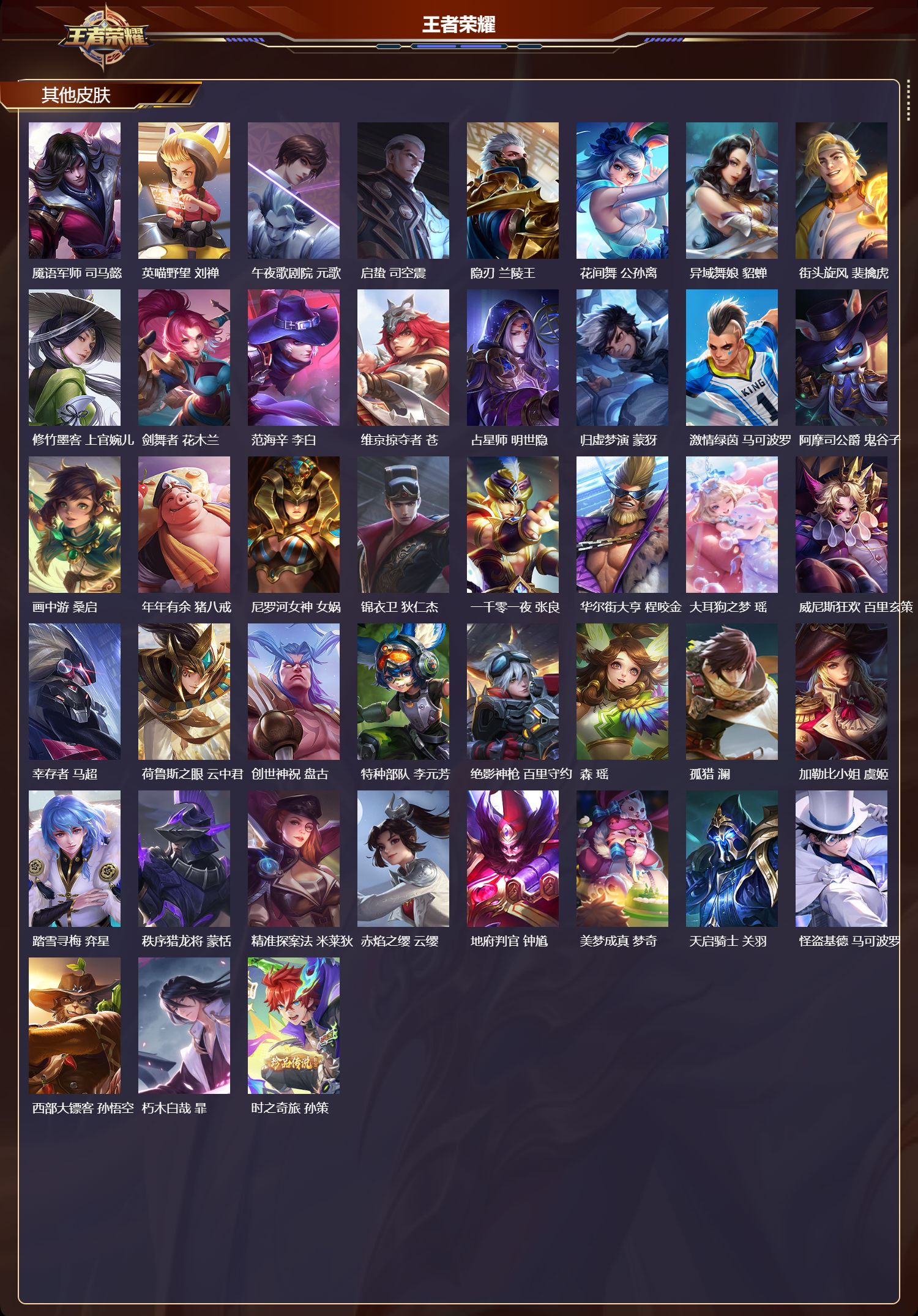 【64,其他皮肤】伊势巫女,大乔,前尘,金蝉,圣殿之光,刘邦,三太子,哪吒,极冰防御线,盾山,龙域领主,铠,死神来了,曹操,超能战警,曹操,花见巫女,伽罗,未来旅行,孙膑,灼热之刃,李信,熊喵少女,阿古朵,海之征途,孙策,火炮千金,孙尚香,木偶奇遇记,鲁班七号,帝国元帅,项羽,精灵王,后羿,绯红之刃,露娜,冰刃幻境,镜,碧珀绯影,暃,星航指挥官,诸葛亮,魇语军师,司马懿,英喵野望,刘禅,午夜歌剧院,元歌,启蛰,司空震,隐刃,兰陵王,花间舞,公孙离,异域舞娘,貂蝉,街头旋风,裴擒虎,修竹墨客,上官婉儿,剑舞者,花木兰,范海辛,李白,维京掠夺者,苍,占星师,明世隐,归虚梦演,蒙犽,激情绿茵,马可波罗,阿摩司公爵,鬼谷子,画中游,桑启,年年有余,猪八戒,尼罗河女神,女娲,锦衣卫,狄仁杰,一千零一夜,张良,华尔街大亨,程咬金,大耳狗之梦,瑶,威尼斯狂欢,百里玄策,幸存者,马超,荷鲁斯之眼,云中君,创世神祝,盘古,特种部队,李元芳,绝影神枪,百里守约,森,瑶,孤猎,澜,加勒比小姐,虞姬,踏雪寻梅,弈星,秩序猎龙将,蒙恬,精准探案法,米莱狄,赤焰之缨,云缨,地府判官,钟馗,美梦成真,梦奇,天启骑士,关羽,怪盗基德,马可波罗,西部大镖客,孙悟空,朽木白哉,暃,时之奇旅,孙策,