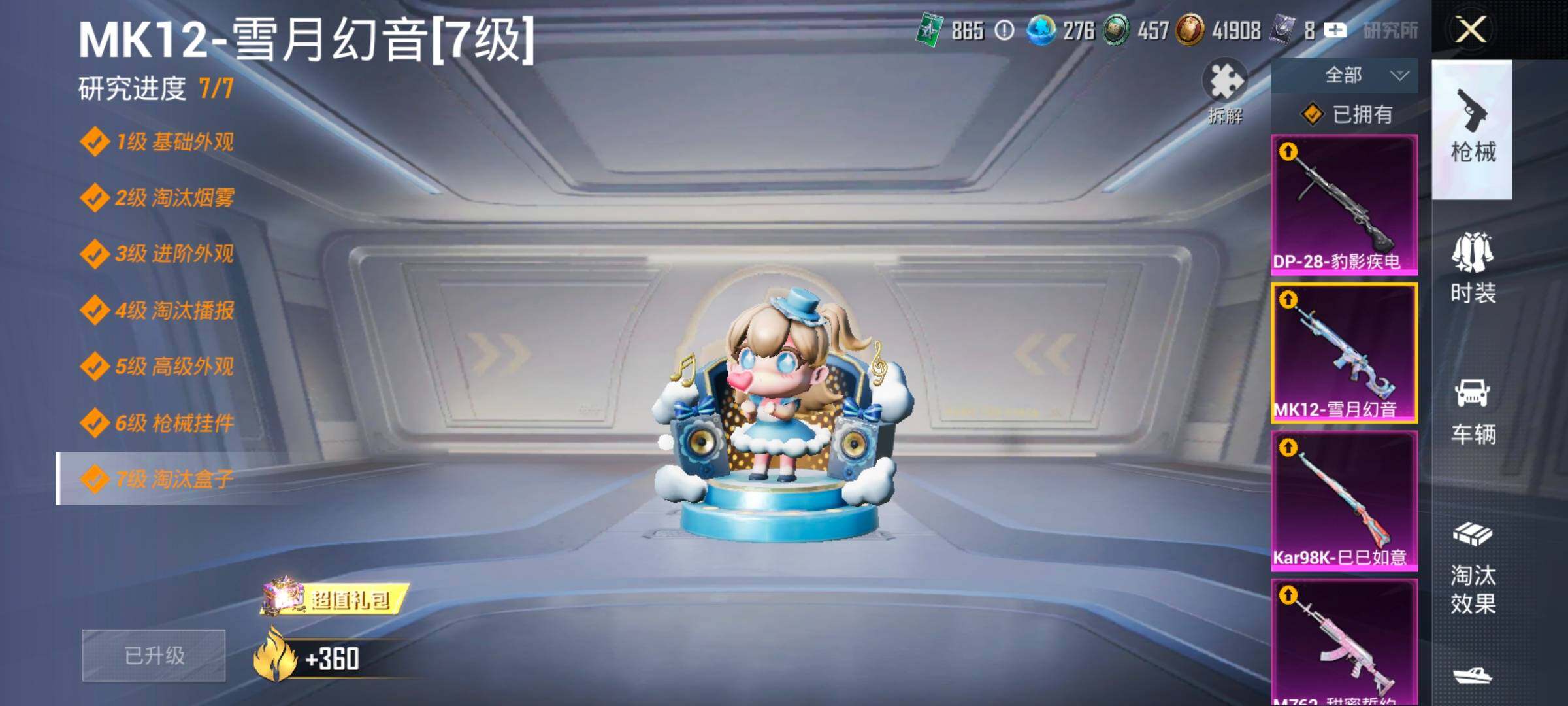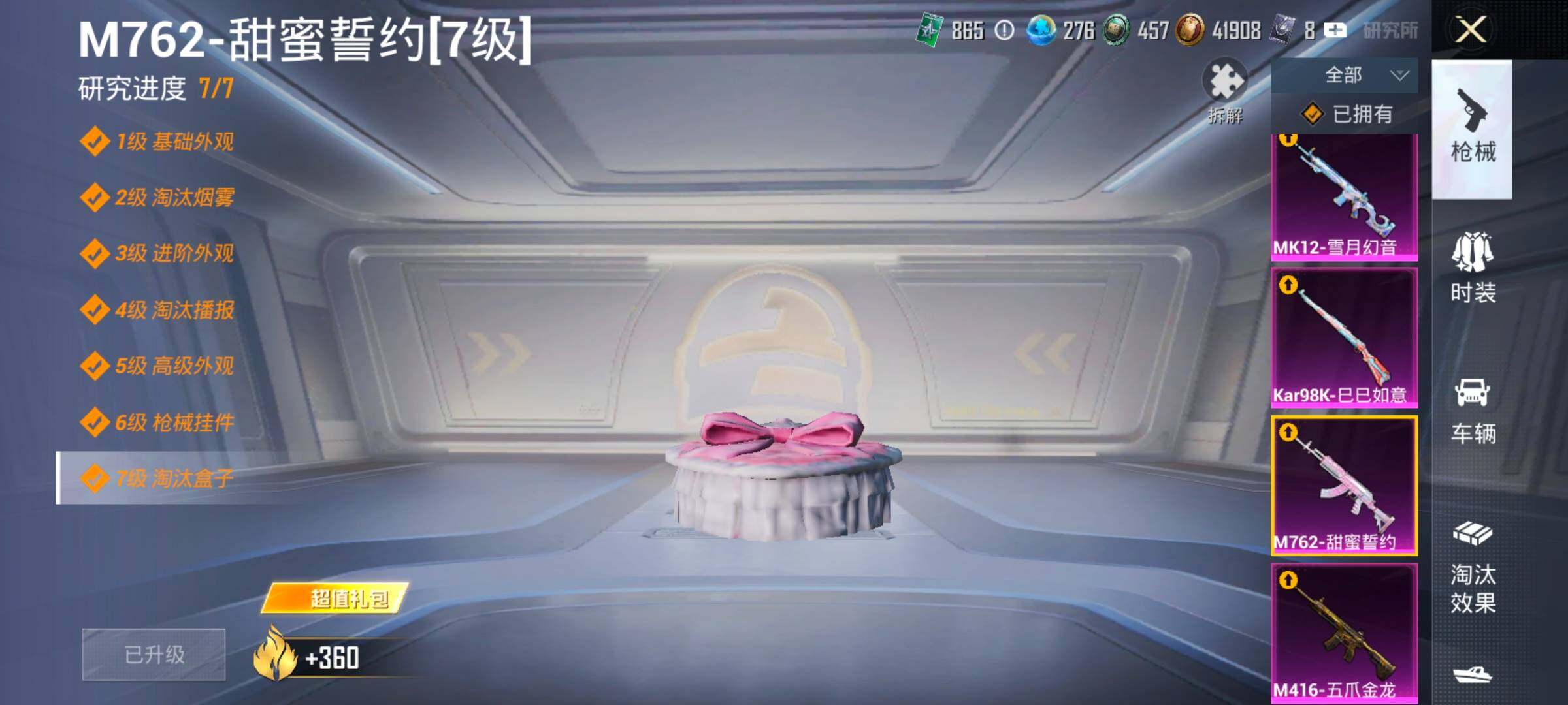 【5特效枪】,M416-五爪金龙,(7级),Kar98K-巳巳如意,(5级),M762-甜蜜誓约,(7级),DP-28-豹影疾电,(5级),MK12-雪月幻音,(7级),