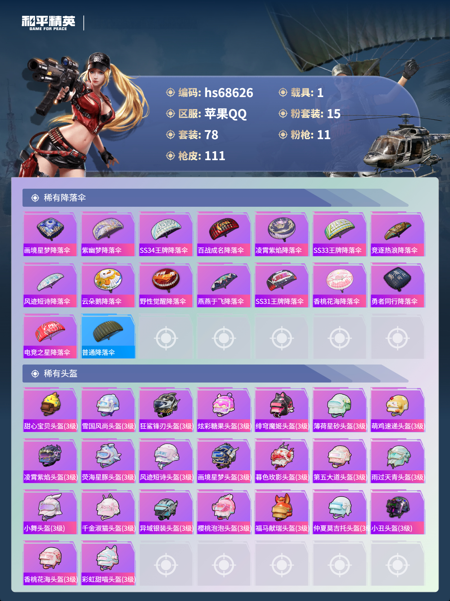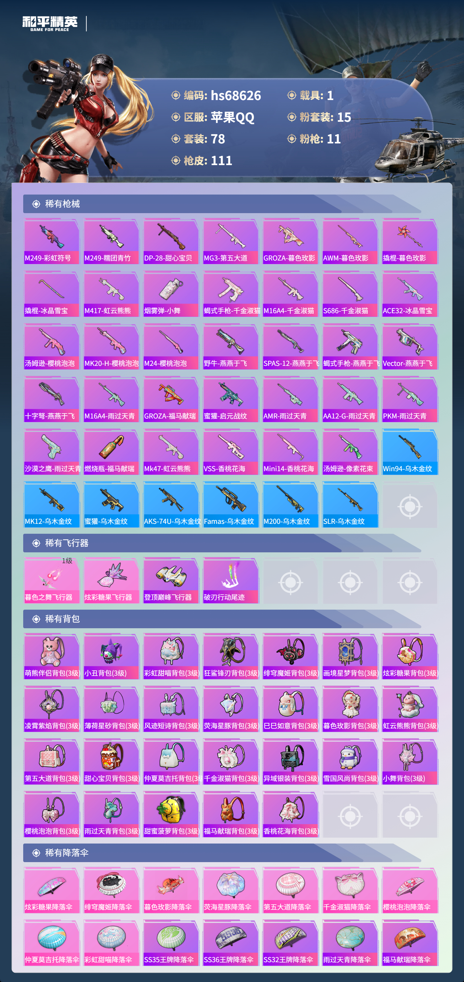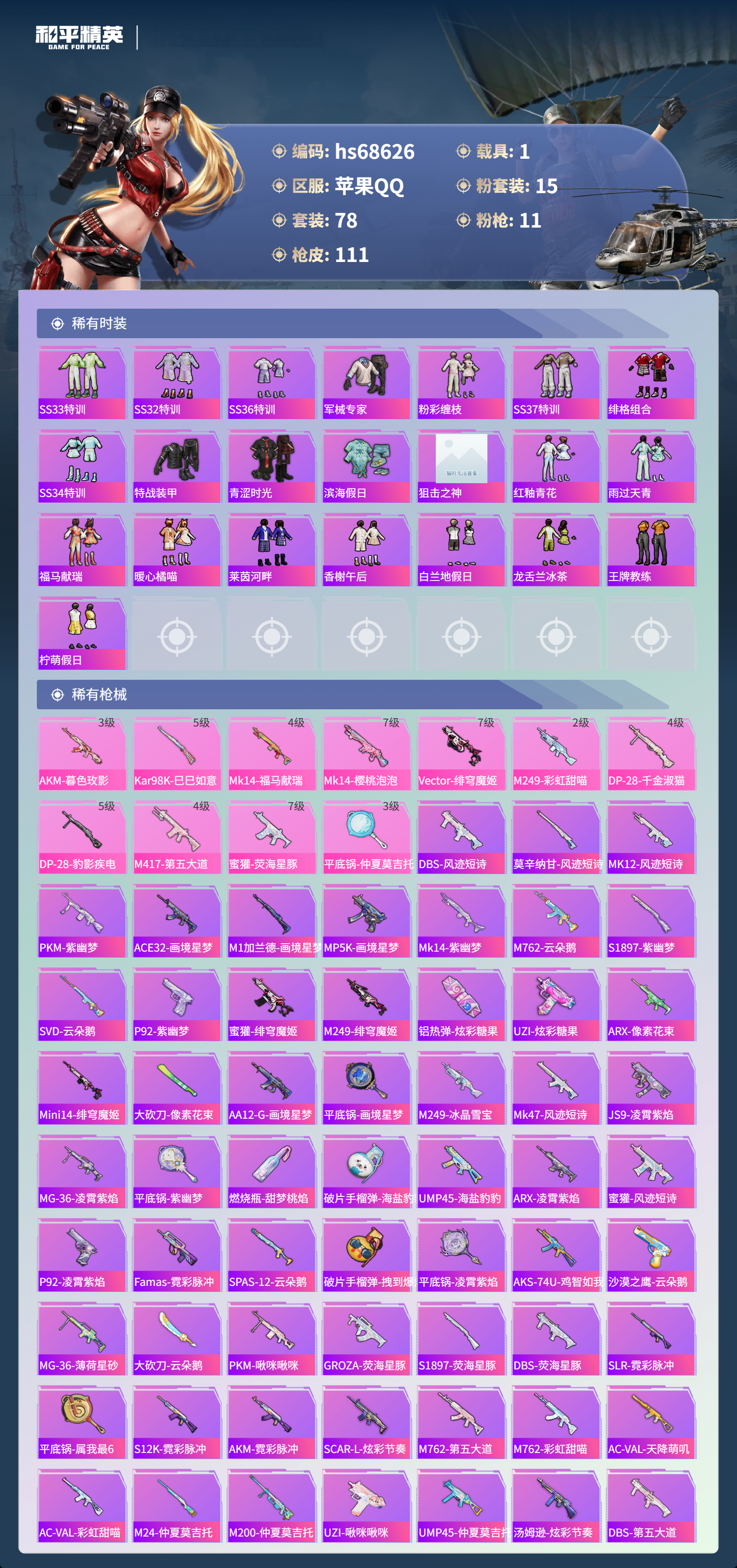【111稀有枪械】AKM-暮色玫影/3级,Kar98K-巳巳如意/5级,Mk14-福马献瑞/4级,Mk14-樱桃泡泡/7级,Vector-绯穹魔姬/7级,M249-彩虹甜喵/2级,DP-28-千金淑猫/4级,DP-28-豹影疾电/5级,M417-第五大道/4级,蜜獾-荧海星豚/7级,平底锅-仲夏莫吉托/3级,DBS-风迹短诗,莫辛纳甘-风迹短诗,Win94-乌木金纹,MK12-风迹短诗,MK12-乌木金纹,PKM-紫幽梦,ACE32-画境星梦,M1加兰德-画境星梦,MP5K-画境星梦,Mk14-紫幽梦,蜜獾-乌木金纹,M762-云朵鹅,S1897-紫幽梦,SVD-云朵鹅,P92-紫幽梦,蜜獾-绯穹魔姬,M249-绯穹魔姬,铝热弹-炫彩糖果,UZI-炫彩糖果,ARX-像素花束,Mini14-绯穹魔姬,大砍刀-像素花束,AA12-G-画境星梦,平底锅-画境星梦,M249-冰晶雪宝,Mk47-风迹短诗,JS9-凌霄紫焰,MG-36-凌霄紫焰,平底锅-紫幽梦,燃烧瓶-甜梦桃焰,破片手榴弹-海盐豹豹,UMP45-海盐豹豹,ARX-凌霄紫焰,AKS-74U-乌木金纹,蜜獾-风迹短诗,P92-凌霄紫焰,Famas-乌木金纹,Famas-霓彩脉冲,SPAS-12-云朵鹅,破片手榴弹-拽到爆炸,平底锅-凌霄紫焰,AKS-74U-鸡智如我,沙漠之鹰-云朵鹅,MG-36-薄荷星砂,大砍刀-云朵鹅,PKM-啾咪啾咪,GROZA-荧海星豚,S1897-荧海星豚,DBS-荧海星豚,SLR-霓彩脉冲,平底锅-属我最6,S12K-霓彩脉冲,AKM-霓彩脉冲,SCAR-L-炫彩节奏,M762-第五大道,M762-彩虹甜喵,AC-VAL-天降萌叽,AC-VAL-彩虹甜喵,M24-仲夏莫吉托,M200-仲夏莫吉托,UZI-啾咪啾咪,UMP45-仲夏莫吉托,汤姆逊-炫彩节奏,DBS-第五大道,M249-彩虹符号,M249-糯团青竹,DP-28-甜心宝贝,MG3-第五大道,GROZA-暮色玫影,AWM-暮色玫影,撬棍-暮色玫影,撬棍-冰晶雪宝,M417-虹云熊熊,烟雾弹-小舞,蝎式手枪-千金淑猫,M16A4-千金淑猫,S686-千金淑猫,ACE32-冰晶雪宝,汤姆逊-樱桃泡泡,MK20-H-樱桃泡泡,M24-樱桃泡泡,野牛-燕燕于飞,M200-乌木金纹,SPAS-12-燕燕于飞,蝎式手枪-燕燕于飞,Vector-燕燕于飞,十字弩-燕燕于飞,M16A4-雨过天青,GROZA-福马献瑞,蜜獾-启元战纹,AMR-雨过天青,SLR-乌木金纹,AA12-G-雨过天青,PKM-雨过天青,沙漠之鹰-雨过天青,燃烧瓶-福马献瑞,Mk47-虹云熊熊,VSS-香桃花海,Mini14-香桃花海,汤姆逊-像素花束