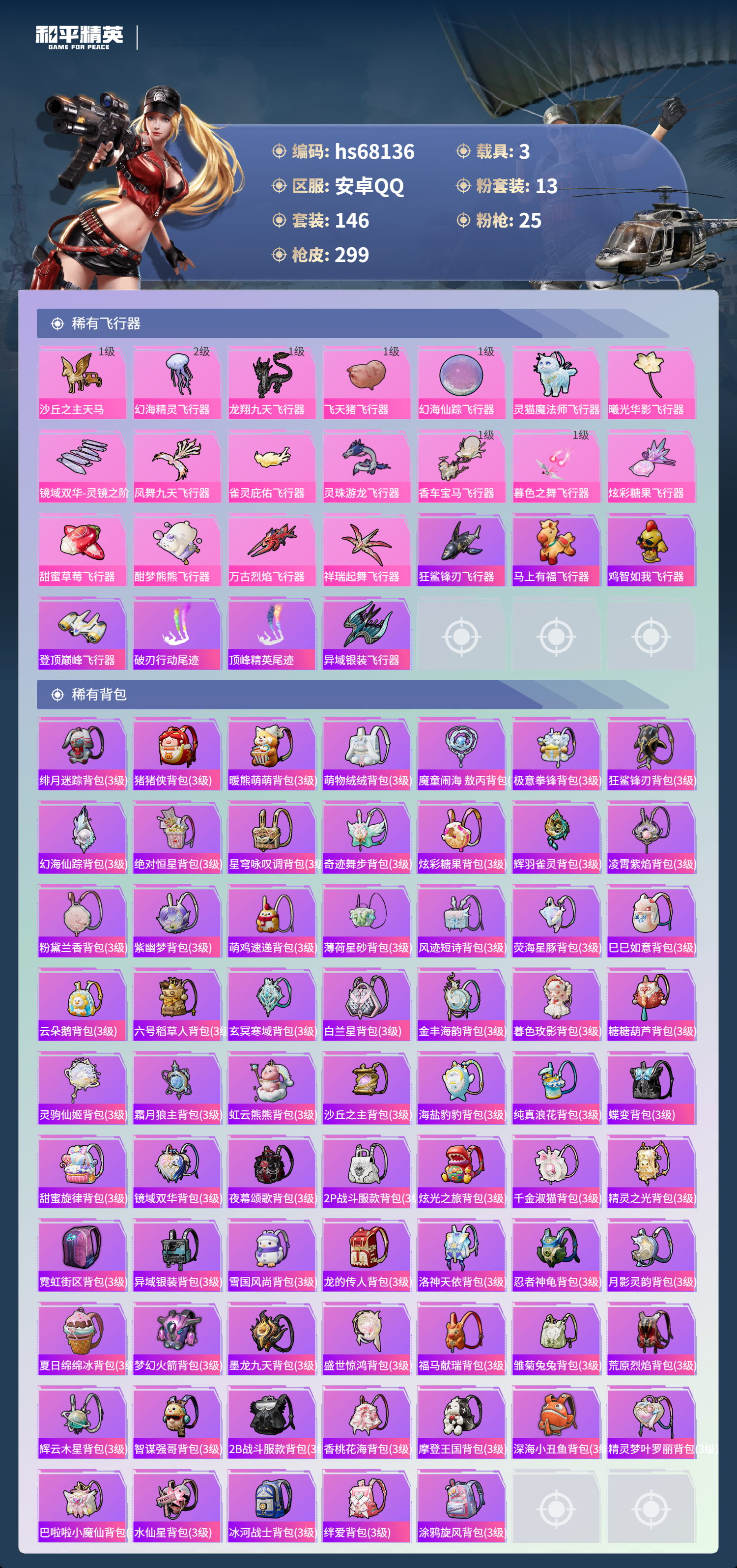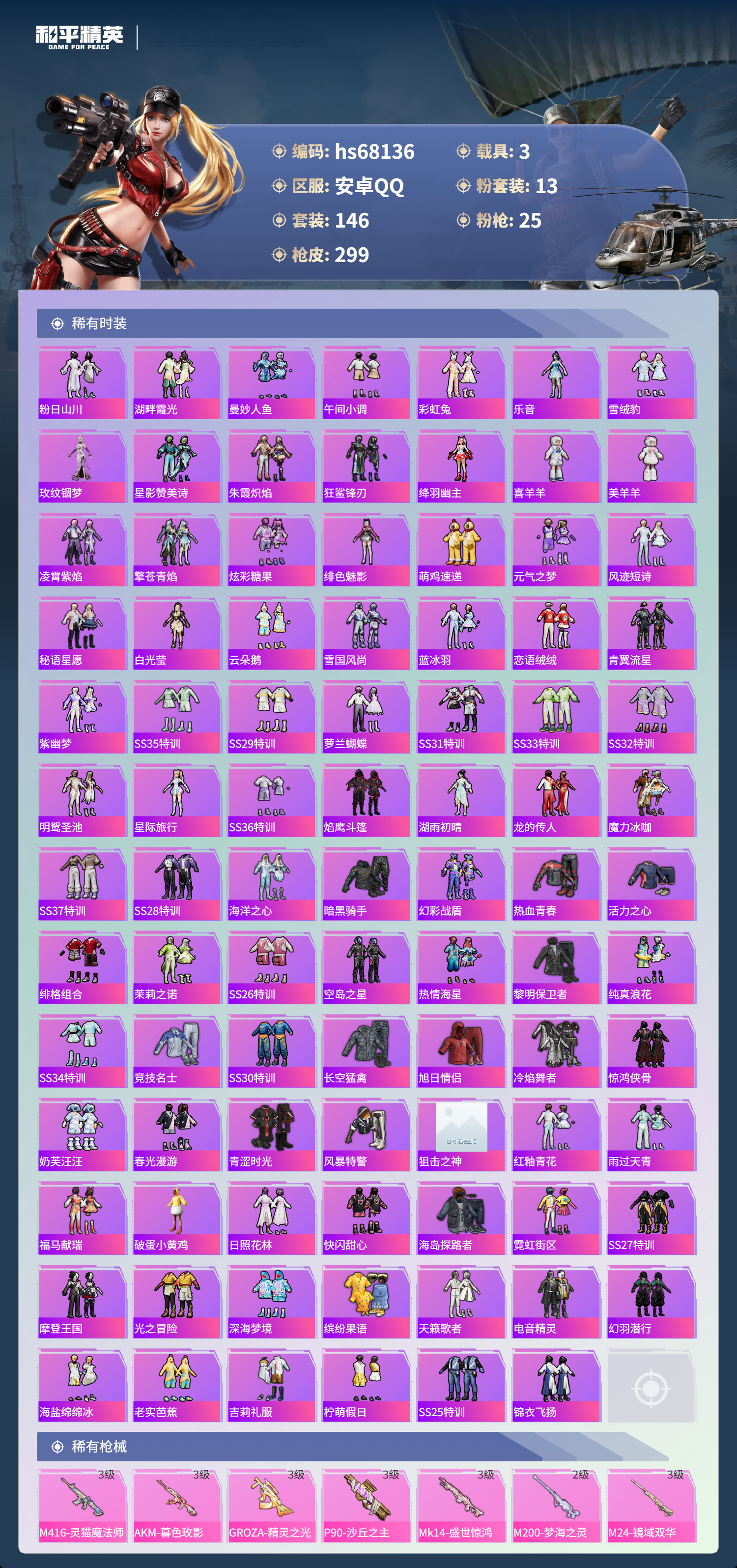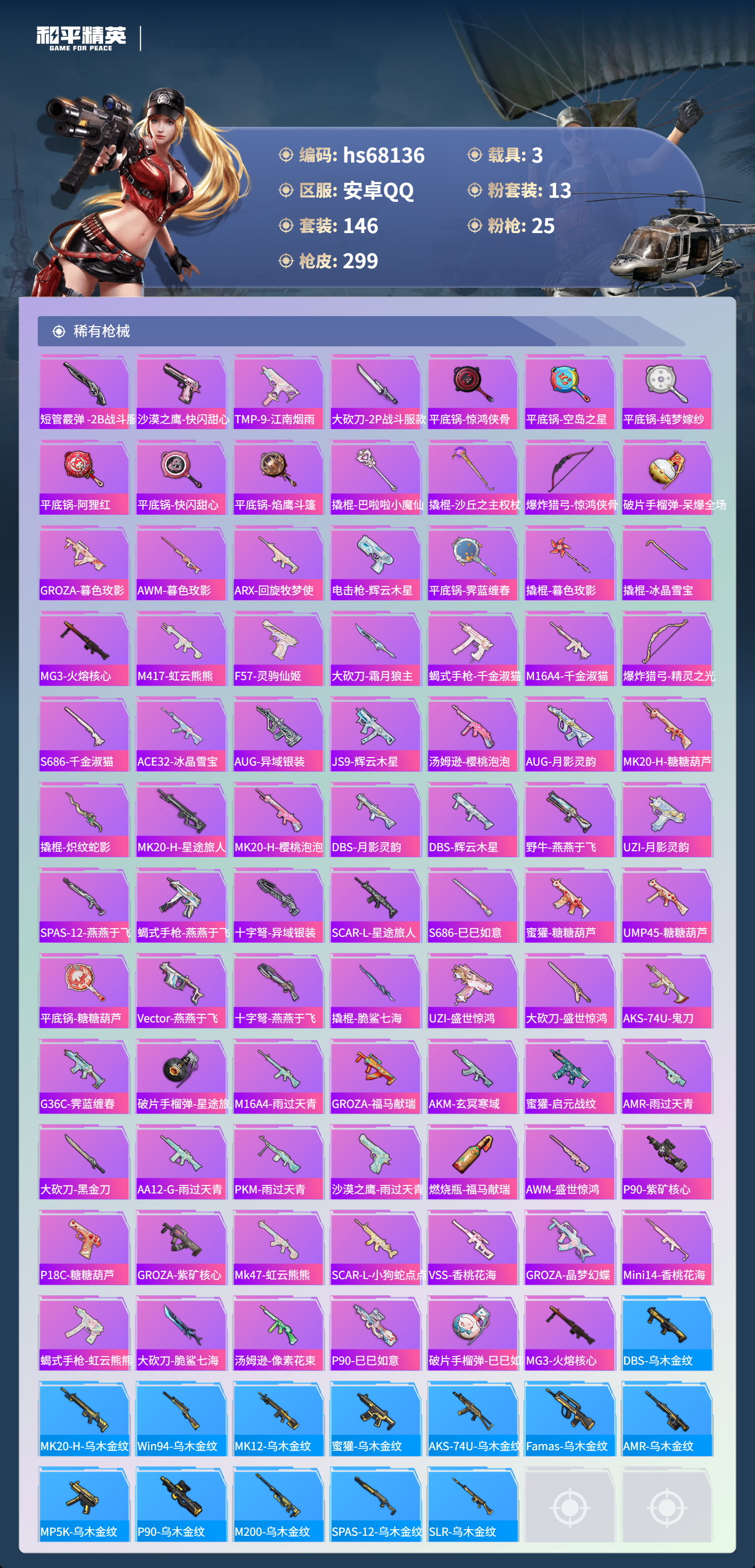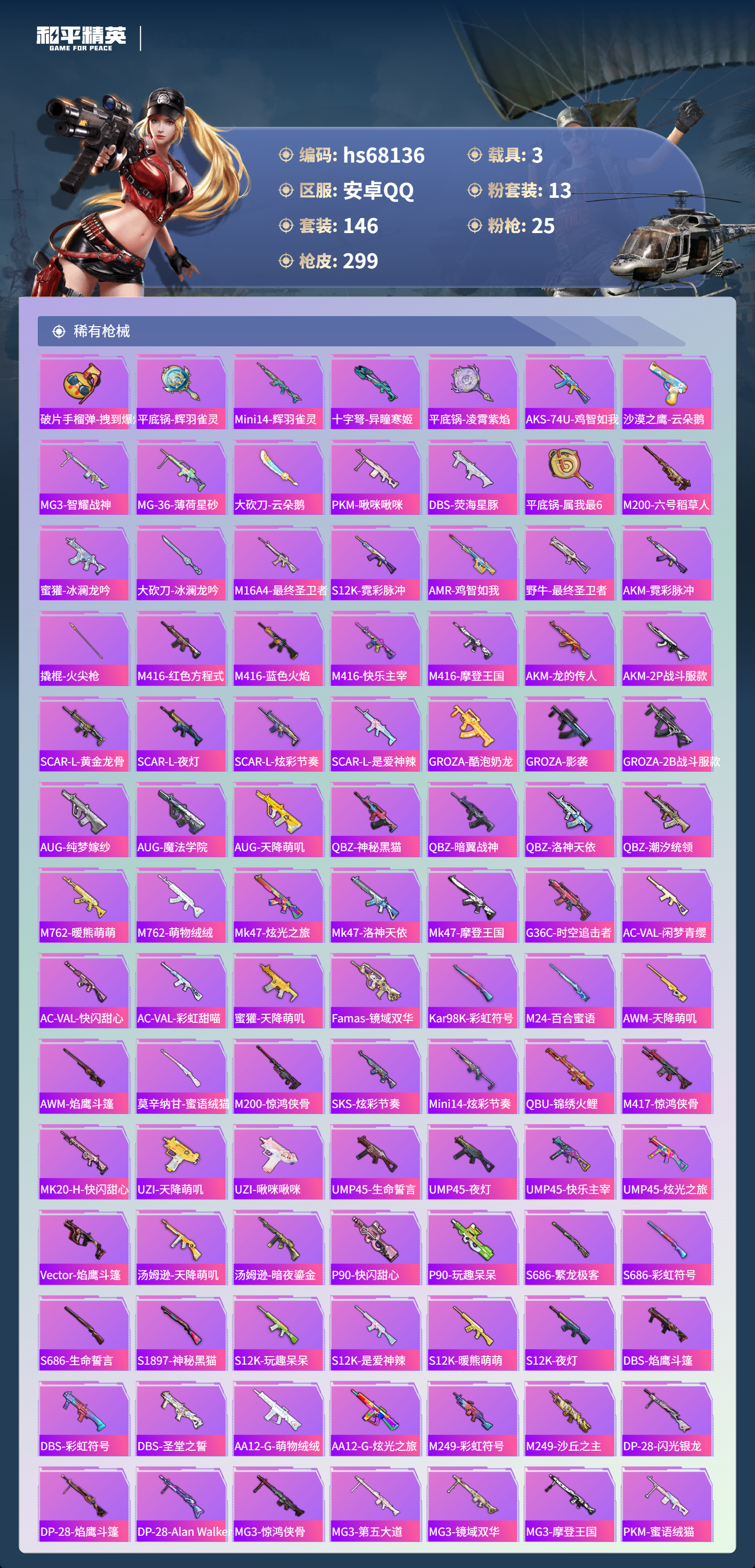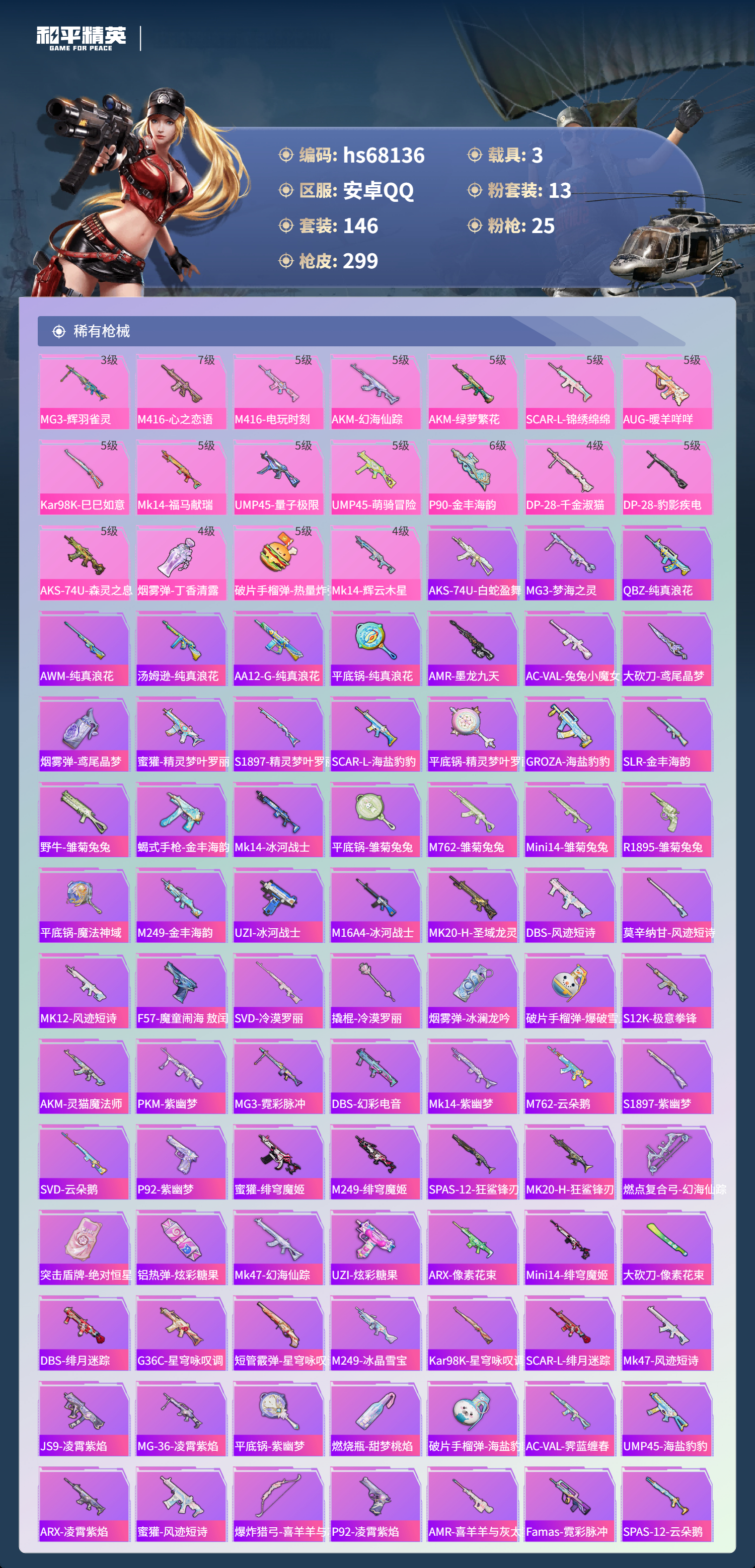 【299稀有枪械】M416-灵猫魔法师/3级,AKM-暮色玫影/3级,GROZA-精灵之光/3级,P90-沙丘之主/3级,Mk14-盛世惊鸿/3级,M200-梦海之灵/2级,M24-镜域双华/3级,MG3-辉羽雀灵/3级,M416-心之恋语/7级,M416-电玩时刻/5级,AKM-幻海仙踪/5级,AKM-绿萝繁花/5级,SCAR-L-锦绣绵绵/5级,AUG-暖羊咩咩/5级,Kar98K-巳巳如意/5级,Mk14-福马献瑞/5级,UMP45-量子极限/5级,UMP45-萌骑冒险/5级,P90-金丰海韵/6级,DP-28-千金淑猫/4级,DP-28-豹影疾电/5级,AKS-74U-森灵之息/5级,烟雾弹-丁香清露/4级,破片手榴弹-热量炸弹/5级,AKS-74U-白蛇盈舞,MG3-梦海之灵,QBZ-纯真浪花,AWM-纯真浪花,汤姆逊-纯真浪花,DBS-乌木金纹,AA12-G-纯真浪花,平底锅-纯真浪花,AMR-墨龙九天,AC-VAL-兔兔小魔女,大砍刀-鸢尾晶梦,烟雾弹-鸢尾晶梦,蜜獾-精灵梦叶罗丽,S1897-精灵梦叶罗丽,SCAR-L-海盐豹豹,平底锅-精灵梦叶罗丽,GROZA-海盐豹豹,SLR-金丰海韵,野牛-雏菊兔兔,蝎式手枪-金丰海韵,Mk14-冰河战士,平底锅-雏菊兔兔,M762-雏菊兔兔,Mini14-雏菊兔兔,R1895-雏菊兔兔,平底锅-魔法神域,M249-金丰海韵,UZI-冰河战士,M16A4-冰河战士,MK20-H-乌木金纹,MK20-H-圣域龙灵,DBS-风迹短诗,莫辛纳甘-风迹短诗,Win94-乌木金纹,MK12-风迹短诗,MK12-乌木金纹,F57-魔童闹海,敖闰,SVD-冷漠罗丽,撬棍-冷漠罗丽,烟雾弹-冰澜龙吟,破片手榴弹-爆破雪人,S12K-极意拳锋,AKM-灵猫魔法师,PKM-紫幽梦,MG3-霓彩脉冲,DBS-幻彩电音,Mk14-紫幽梦,蜜獾-乌木金纹,M762-云朵鹅,S1897-紫幽梦,SVD-云朵鹅,P92-紫幽梦,蜜獾-绯穹魔姬,M249-绯穹魔姬,SPAS-12-狂鲨锋刃,MK20-H-狂鲨锋刃,燃点复合弓-幻海仙踪,突击盾牌-绝对恒星,铝热弹-炫彩糖果,Mk47-幻海仙踪,UZI-炫彩糖果,ARX-像素花束,Mini14-绯穹魔姬,大砍刀-像素花束,DBS-绯月迷踪,G36C-星穹咏叹调,短管霰弹-星穹咏叹调,M249-冰晶雪宝,Kar98K-星穹咏叹调,SCAR-L-绯月迷踪,Mk47-风迹短诗,JS9-凌霄紫焰,MG-36-凌霄紫焰,平底锅-紫幽梦,燃烧瓶-甜梦桃焰,破片手榴弹-海盐豹豹,AC-VAL-霁蓝缠春,UMP45-海盐豹豹,ARX-凌霄紫焰,AKS-74U-乌木金纹,蜜獾-风迹短诗,爆炸猎弓-喜羊羊与灰太狼,P92-凌霄紫焰,AMR-喜羊羊与灰太狼,Famas-乌木金纹,Famas-霓彩脉冲,SPAS-12-云朵鹅,破片手榴弹-拽到爆炸,平底锅-辉羽雀灵,Mini14-辉羽雀灵,十字弩-异瞳寒姬,平底锅-凌霄紫焰,AKS-74U-鸡智如我,沙漠之鹰-云朵鹅,MG3-智耀战神,MG-36-薄荷星砂,大砍刀-云朵鹅,PKM-啾咪啾咪,DBS-荧海星豚,平底锅-属我最6,M200-六号稻草人,蜜獾-冰澜龙吟,大砍刀-冰澜龙吟,M16A4-最终圣卫者,S12K-霓彩脉冲,AMR-鸡智如我,野牛-最终圣卫者,AKM-霓彩脉冲,撬棍-火尖枪,M416-红色方程式,M416-蓝色火焰,M416-快乐主宰,M416-摩登王国,AKM-龙的传人,AKM-2P战斗服款,SCAR-L-黄金龙骨,SCAR-L-夜灯,SCAR-L-炫彩节奏,SCAR-L-是爱神辣,GROZA-酷泡奶龙,GROZA-影袭,GROZA-2B战斗服款,AUG-纯梦嫁纱,AUG-魔法学院,AUG-天降萌叽,QBZ-神秘黑猫,QBZ-暗翼战神,QBZ-洛神天依,QBZ-潮汐统领,M762-暖熊萌萌,M762-萌物绒绒,Mk47-炫光之旅,Mk47-洛神天依,Mk47-摩登王国,G36C-时空追击者,AC-VAL-闲梦青缨,AC-VAL-快闪甜心,AC-VAL-彩虹甜喵,蜜獾-天降萌叽,Famas-镜域双华,Kar98K-彩虹符号,M24-百合蜜语,AWM-天降萌叽,AWM-焰鹰斗篷,莫辛纳甘-蜜语绒猫,AMR-乌木金纹,M200-惊鸿侠骨,SKS-炫彩节奏,Mini14-炫彩节奏,QBU-锦绣火鲤,M417-惊鸿侠骨,MK20-H-快闪甜心,UZI-天降萌叽,UZI-啾咪啾咪,UMP45-生命誓言,UMP45-夜灯,UMP45-快乐主宰,UMP45-炫光之旅,Vector-焰鹰斗篷,汤姆逊-天降萌叽,汤姆逊-暗夜鎏金,MP5K-乌木金纹,P90-乌木金纹,P90-快闪甜心,P90-玩趣呆呆,S686-繁龙极客,S686-彩虹符号,S686-生命誓言,S1897-神秘黑猫,S12K-玩趣呆呆,S12K-是爱神辣,S12K-暖熊萌萌,S12K-夜灯,DBS-焰鹰斗篷,DBS-彩虹符号,DBS-圣堂之誓,AA12-G-萌物绒绒,AA12-G-炫光之旅,M249-彩虹符号,M249-沙丘之主,DP-28-闪光银龙,DP-28-焰鹰斗篷,DP-28-Alan,Walker潮音版,MG3-惊鸿侠骨,MG3-第五大道,MG3-镜域双华,MG3-摩登王国,PKM-蜜语绒猫,短管霰弹,-2B战斗服款,沙漠之鹰-快闪甜心,TMP-9-江南烟雨,大砍刀-2P战斗服款,平底锅-惊鸿侠骨,平底锅-空岛之星,平底锅-纯梦嫁纱,平底锅-阿狸红,平底锅-快闪甜心,平底锅-焰鹰斗篷,撬棍-巴啦啦小魔仙,撬棍-沙丘之主权杖,爆炸猎弓-惊鸿侠骨,破片手榴弹-呆爆全场,GROZA-暮色玫影,AWM-暮色玫影,ARX-回旋牧梦使,电击枪-辉云木星,平底锅-霁蓝缠春,撬棍-暮色玫影,撬棍-冰晶雪宝,MG3-火熔核心,M417-虹云熊熊,F57-灵驹仙姬,大砍刀-霜月狼主,蝎式手枪-千金淑猫,M16A4-千金淑猫,爆炸猎弓-精灵之光,S686-千金淑猫,ACE32-冰晶雪宝,AUG-异域银装,JS9-辉云木星,汤姆逊-樱桃泡泡,AUG-月影灵韵,MK20-H-糖糖葫芦,撬棍-炽纹蛇影,MK20-H-星途旅人,MK20-H-樱桃泡泡,DBS-月影灵韵,DBS-辉云木星,野牛-燕燕于飞,UZI-月影灵韵,M200-乌木金纹,SPAS-12-燕燕于飞,蝎式手枪-燕燕于飞,十字弩-异域银装,SCAR-L-星途旅人,S686-巳巳如意,蜜獾-糖糖葫芦,UMP45-糖糖葫芦,SPAS-12-乌木金纹,平底锅-糖糖葫芦,Vector-燕燕于飞,十字弩-燕燕于飞,撬棍-脆鲨七海,UZI-盛世惊鸿,大砍刀-盛世惊鸿,AKS-74U-鬼刀,G36C-霁蓝缠春,破片手榴弹-星途旅人,M16A4-雨过天青,GROZA-福马献瑞,AKM-玄冥寒域,蜜獾-启元战纹,AMR-雨过天青,SLR-乌木金纹,大砍刀-黑金刀,AA12-G-雨过天青,PKM-雨过天青,沙漠之鹰-雨过天青,燃烧瓶-福马献瑞,AWM-盛世惊鸿,P90-紫矿核心,P18C-糖糖葫芦,GROZA-紫矿核心,Mk47-虹云熊熊,SCAR-L-小狗蛇点点,Mk14-辉云木星/4级,VSS-香桃花海,GROZA-晶梦幻蝶,Mini14-香桃花海,蝎式手枪-虹云熊熊,大砍刀-脆鲨七海,汤姆逊-像素花