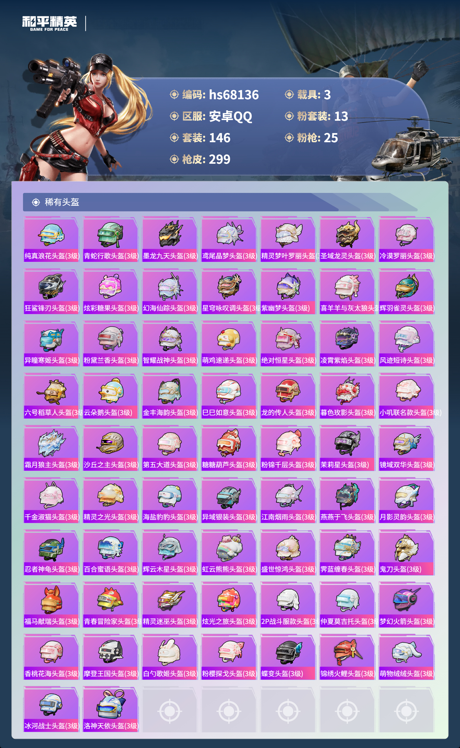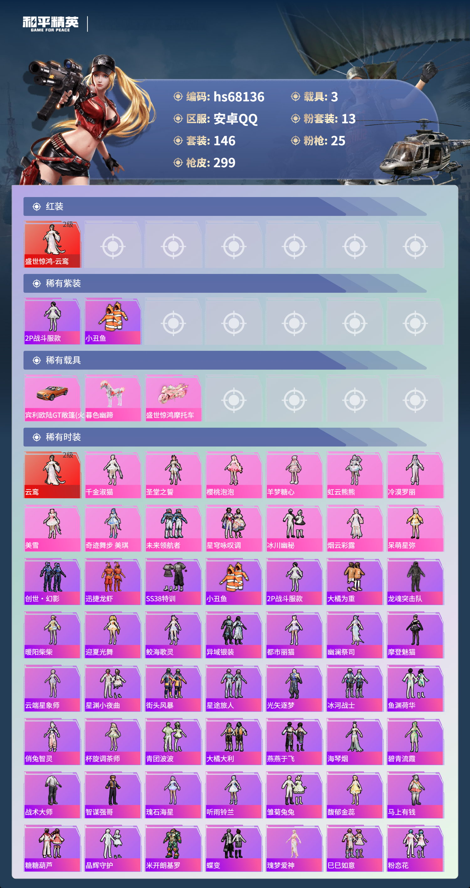 PX_2558622-,安卓手Q-12王牌印记-1红装-13粉装-25特效枪-3载具-热力值-146套装-299枪皮-6卓越印记-1传奇印记