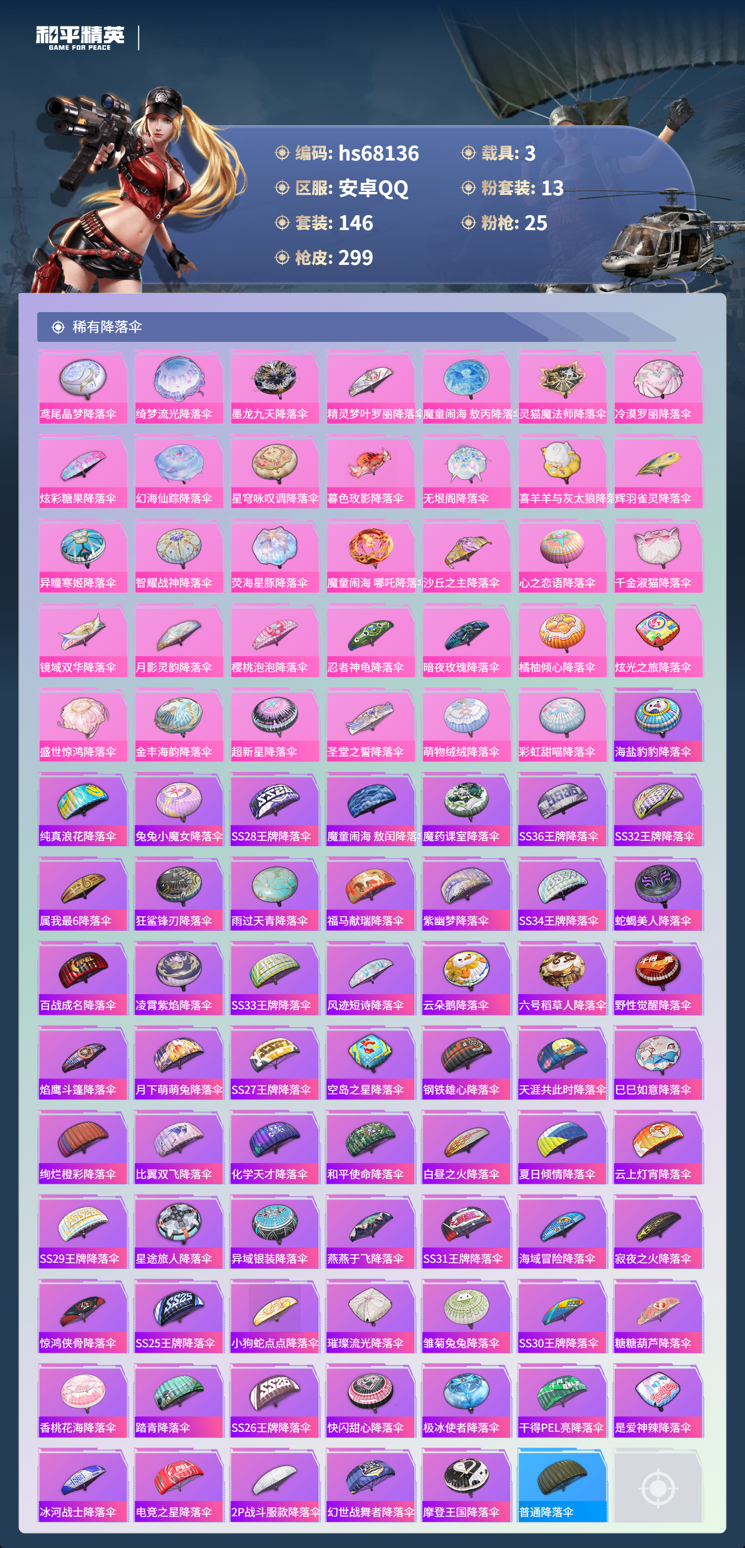 【97稀有降落伞】海盐豹豹降落伞,鸢尾晶梦降落伞,绮梦流光降落伞,纯真浪花降落伞,墨龙九天降落伞,兔兔小魔女降落伞,精灵梦叶罗丽降落伞,SS28王牌降落伞,魔童闹海,敖丙降落伞,魔童闹海,敖闰降落伞,魔药课室降落伞,SS36王牌降落伞,灵猫魔法师降落伞,冷漠罗丽降落伞,SS32王牌降落伞,属我最6降落伞,炫彩糖果降落伞,幻海仙踪降落伞,狂鲨锋刃降落伞,星穹咏叹调降落伞,雨过天青降落伞,暮色玫影降落伞,福马献瑞降落伞,紫幽梦降落伞,SS34王牌降落伞,蛇蝎美人降落伞,无垠阁降落伞,喜羊羊与灰太狼降落伞,百战成名降落伞,辉羽雀灵降落伞,异瞳寒姬降落伞,凌霄紫焰降落伞,SS33王牌降落伞,风迹短诗降落伞,智耀战神降落伞,云朵鹅降落伞,荧海星豚降落伞,六号稻草人降落伞,野性觉醒降落伞,魔童闹海,哪吒降落伞,焰鹰斗篷降落伞,沙丘之主降落伞,月下萌萌兔降落伞,SS27王牌降落伞,空岛之星降落伞,心之恋语降落伞,钢铁雄心降落伞,天涯共此时降落伞,巳巳如意降落伞,绚烂橙彩降落伞,普通降落伞,比翼双飞降落伞,千金淑猫降落伞,化学天才降落伞,和平使命降落伞,白昼之火降落伞,夏日倾情降落伞,镜域双华降落伞,月影灵韵降落伞,云上灯宵降落伞,樱桃泡泡降落伞,SS29王牌降落伞,忍者神龟降落伞,星途旅人降落伞,异域银装降落伞,燕燕于飞降落伞,SS31王牌降落伞,海域冒险降落伞,寂夜之火降落伞,暗夜玫瑰降落伞,橘柚倾心降落伞,惊鸿侠骨降落伞,SS25王牌降落伞,炫光之旅降落伞,小狗蛇点点降落伞,璀璨流光降落伞,雏菊兔兔降落伞,盛世惊鸿降落伞,SS30王牌降落伞,糖糖葫芦降落伞,香桃花海降落伞,踏青降落伞,SS26王牌降落伞,快闪甜心降落伞,极冰使者降落伞,金丰海韵降落伞,干得PEL亮降落伞,超新星降落伞,圣堂之誓降落伞,萌物绒绒降落伞,是爱神辣降落伞,冰河战士降落伞,彩虹甜喵降落伞,电竞之星降落伞,2P战斗服款降落伞,幻世战舞者降落伞,摩登王国降落伞