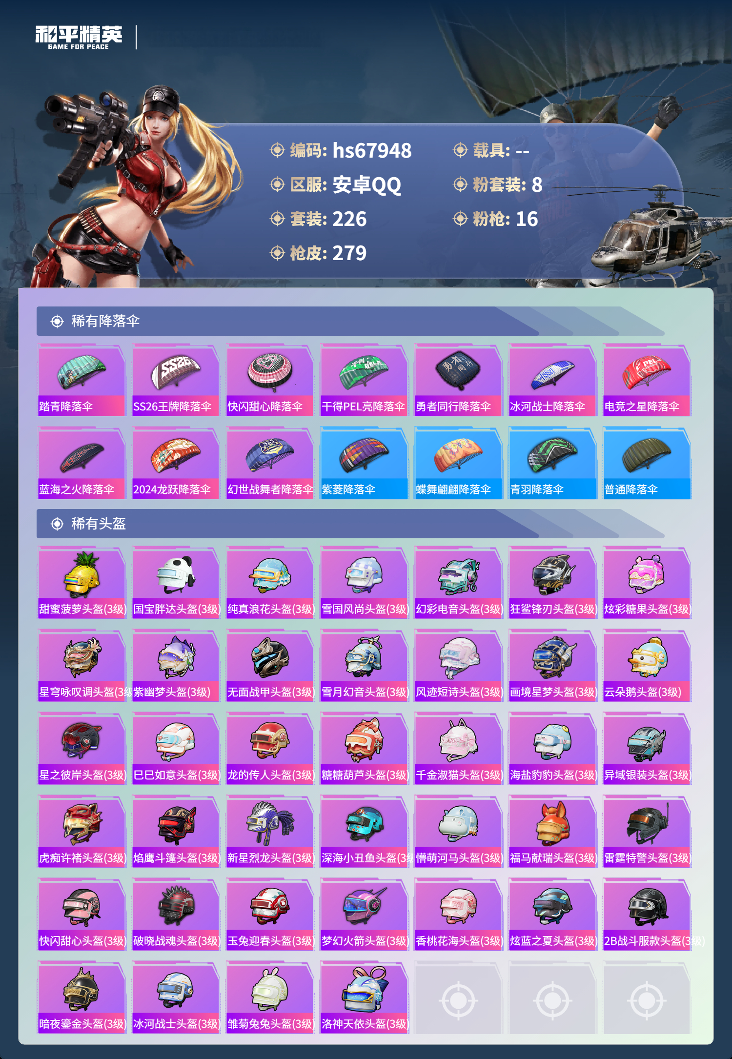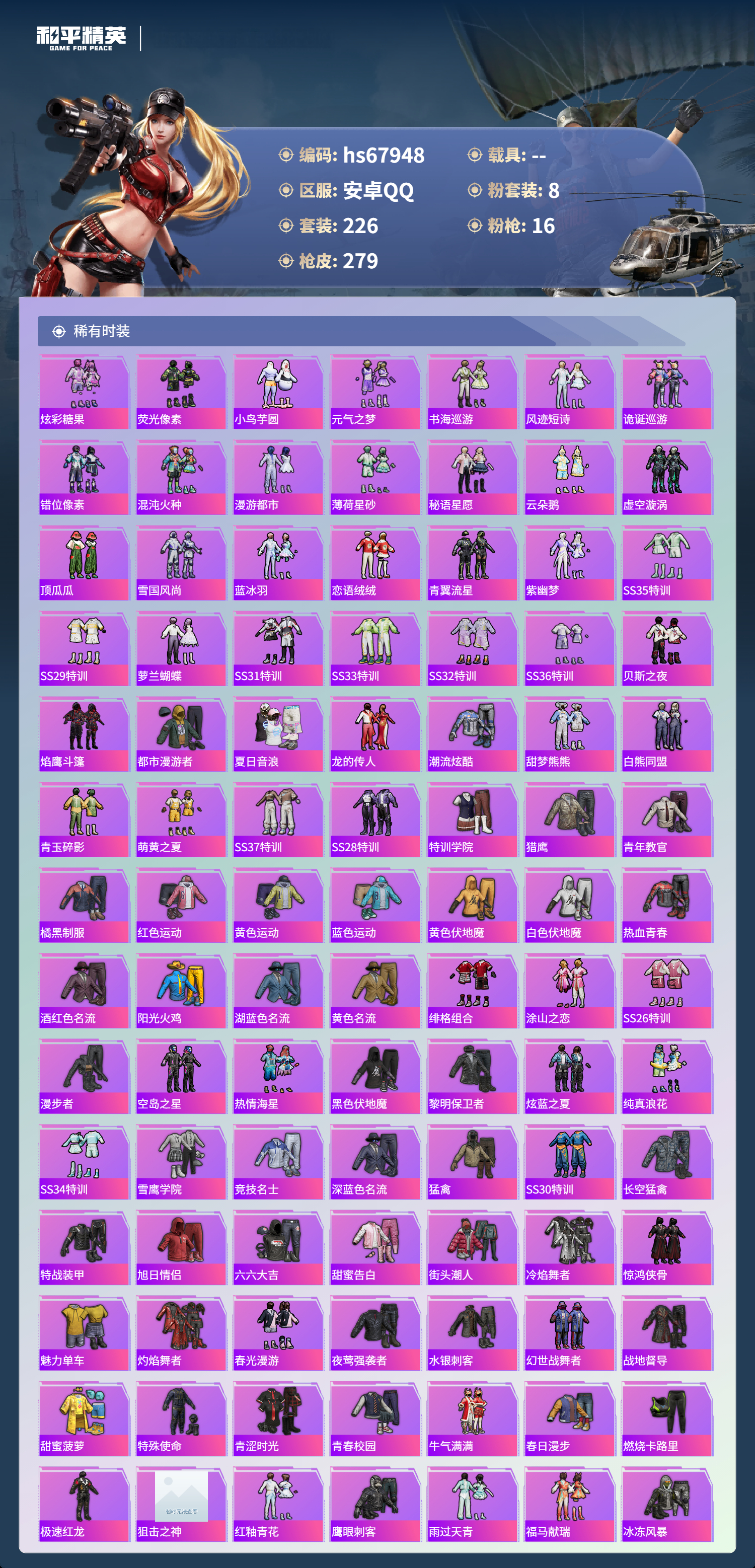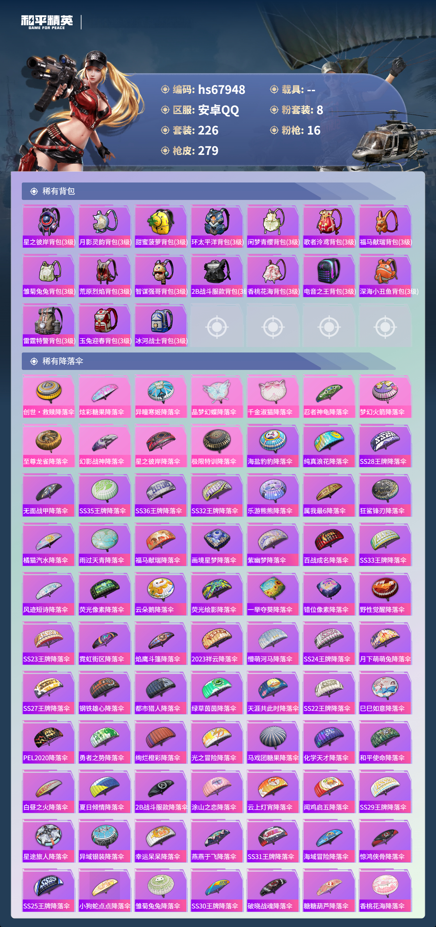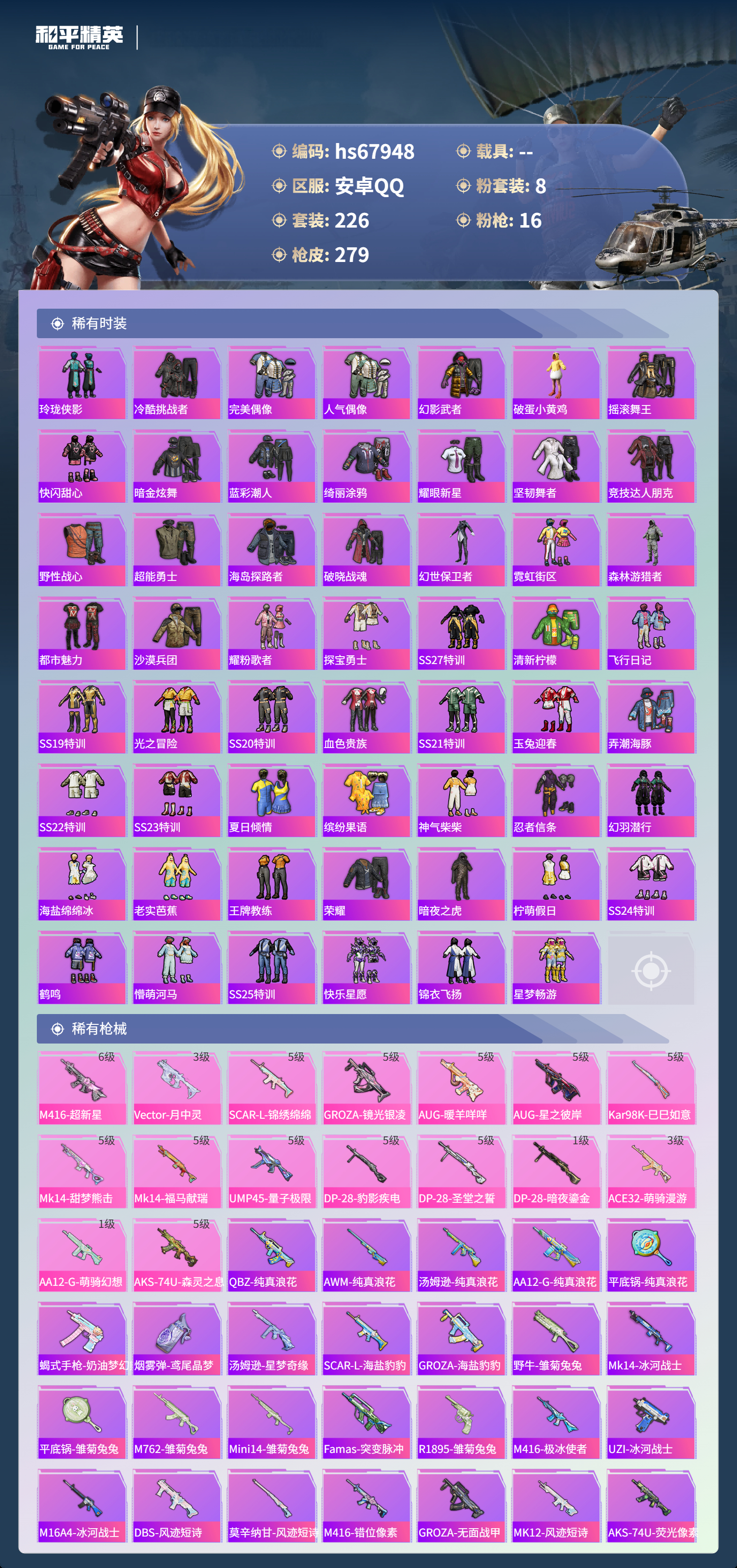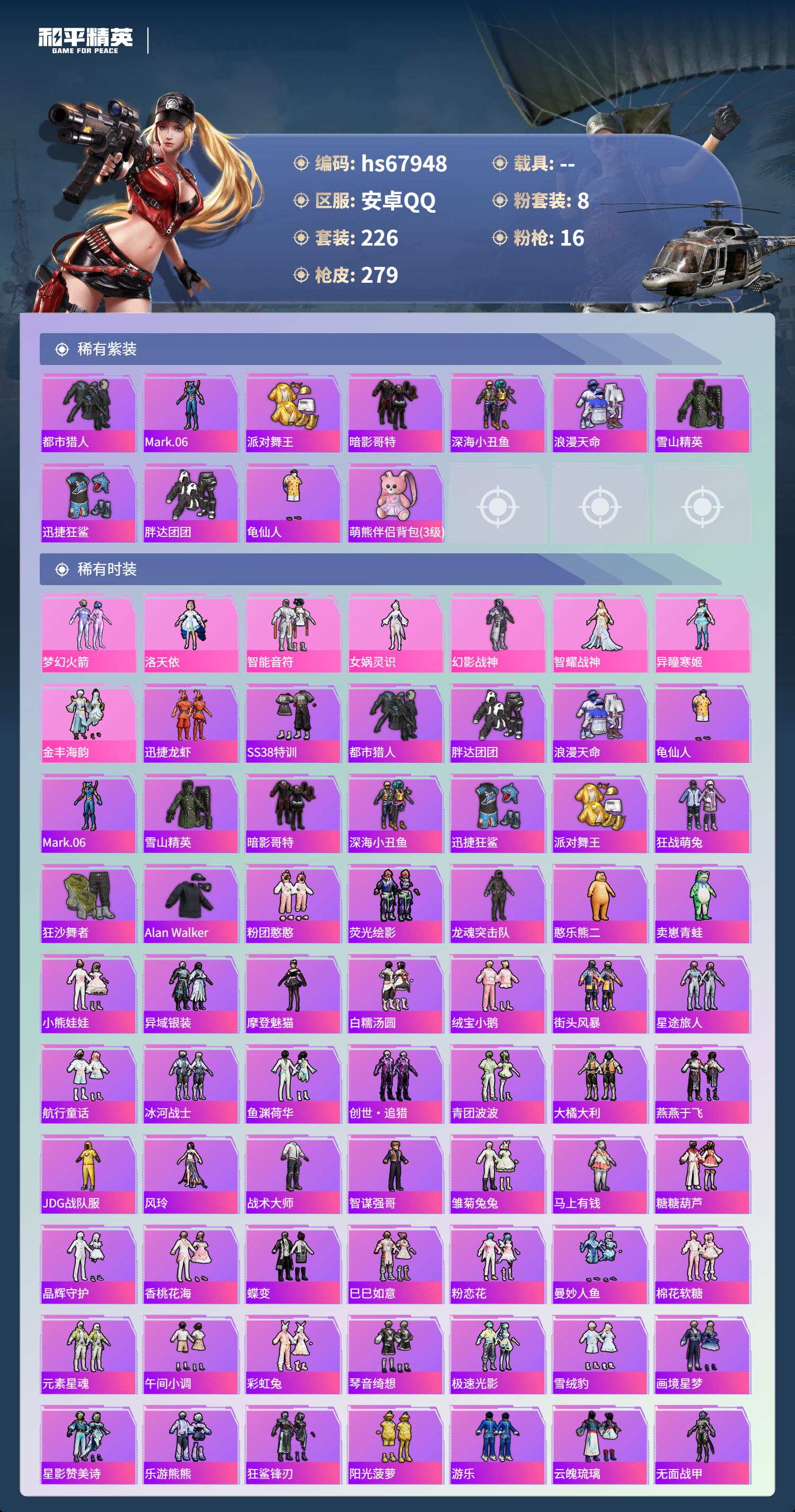 PX_2558623-,安卓手Q-15王牌印记-8粉装-16特效枪-84876热力值-226套装-279枪皮-8卓越印记-5传奇印记