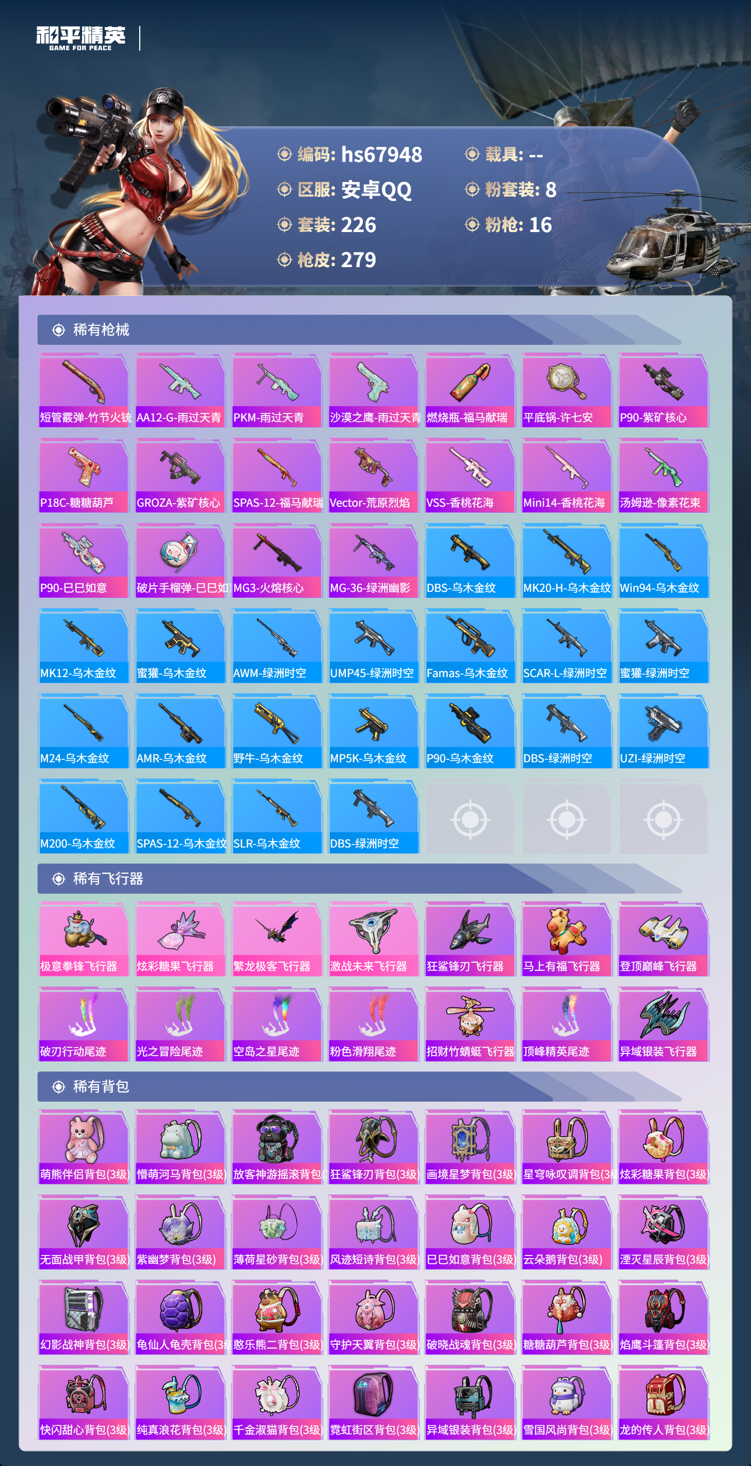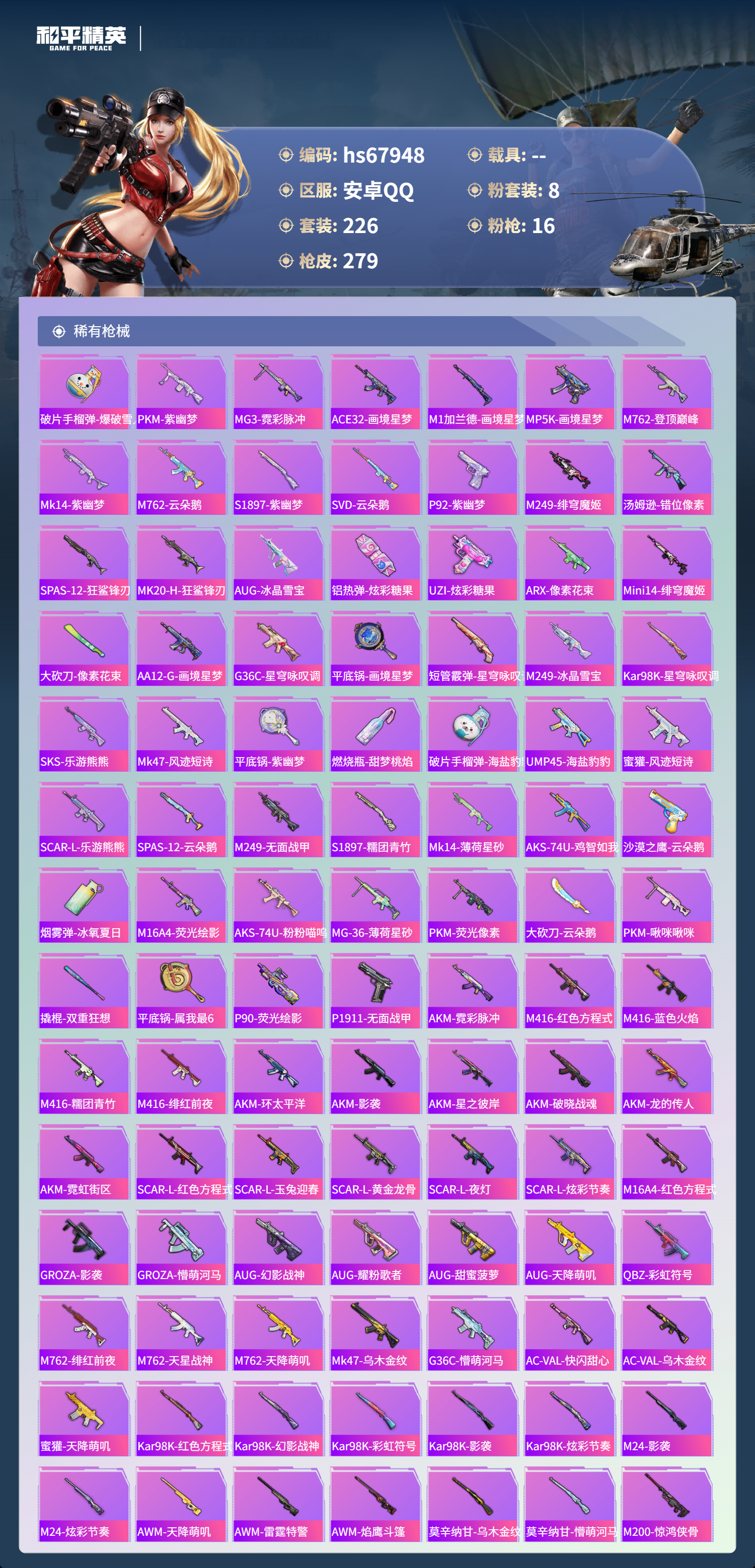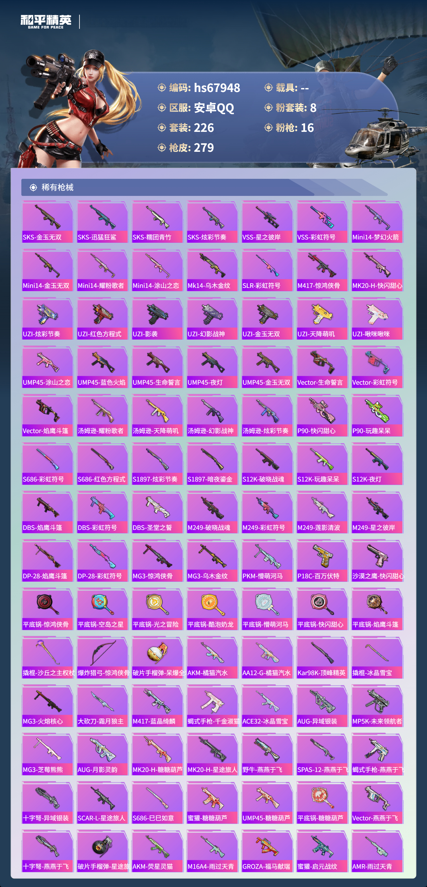 【277稀有枪械】M416-超新星/6级,Vector-月中灵/3级,SCAR-L-锦绣绵绵/5级,GROZA-镜光银凌/5级,AUG-暖羊咩咩/5级,AUG-星之彼岸/5级,Kar98K-巳巳如意/5级,Mk14-甜梦熊击/5级,Mk14-福马献瑞/5级,UMP45-量子极限/5级,DP-28-豹影疾电/5级,DP-28-圣堂之誓/5级,DP-28-暗夜鎏金/1级,ACE32-萌骑漫游/3级,AA12-G-萌骑幻想/1级,AKS-74U-森灵之息/5级,QBZ-纯真浪花,AWM-纯真浪花,汤姆逊-纯真浪花,DBS-乌木金纹,AA12-G-纯真浪花,平底锅-纯真浪花,蝎式手枪-奶油梦幻熊,烟雾弹-鸢尾晶梦,汤姆逊-星梦奇缘,SCAR-L-海盐豹豹,GROZA-海盐豹豹,野牛-雏菊兔兔,Mk14-冰河战士,平底锅-雏菊兔兔,M762-雏菊兔兔,Mini14-雏菊兔兔,Famas-突变脉冲,R1895-雏菊兔兔,M416-极冰使者,UZI-冰河战士,M16A4-冰河战士,MK20-H-乌木金纹,DBS-风迹短诗,莫辛纳甘-风迹短诗,M416-错位像素,GROZA-无面战甲,Win94-乌木金纹,MK12-风迹短诗,MK12-乌木金纹,AKS-74U-荧光像素,破片手榴弹-爆破雪人,PKM-紫幽梦,MG3-霓彩脉冲,ACE32-画境星梦,M1加兰德-画境星梦,MP5K-画境星梦,M762-登顶巅峰,Mk14-紫幽梦,蜜獾-乌木金纹,M762-云朵鹅,S1897-紫幽梦,SVD-云朵鹅,P92-紫幽梦,AWM-绿洲时空,M249-绯穹魔姬,汤姆逊-错位像素,SPAS-12-狂鲨锋刃,MK20-H-狂鲨锋刃,AUG-冰晶雪宝,铝热弹-炫彩糖果,UZI-炫彩糖果,UMP45-绿洲时空,ARX-像素花束,Mini14-绯穹魔姬,大砍刀-像素花束,AA12-G-画境星梦,G36C-星穹咏叹调,平底锅-画境星梦,短管霰弹-星穹咏叹调,M249-冰晶雪宝,Kar98K-星穹咏叹调,SKS-乐游熊熊,Mk47-风迹短诗,平底锅-紫幽梦,燃烧瓶-甜梦桃焰,破片手榴弹-海盐豹豹,UMP45-海盐豹豹,蜜獾-风迹短诗,SCAR-L-乐游熊熊,Famas-乌木金纹,SPAS-12-云朵鹅,M249-无面战甲,S1897-糯团青竹,Mk14-薄荷星砂,AKS-74U-鸡智如我,沙漠之鹰-云朵鹅,烟雾弹-冰氧夏日,M16A4-荧光绘影,AKS-74U-粉粉喵呜,MG-36-薄荷星砂,SCAR-L-绿洲时空,PKM-荧光像素,大砍刀-云朵鹅,PKM-啾咪啾咪,撬棍-双重狂想,平底锅-属我最6,蜜獾-绿洲时空,P90-荧光绘影,P1911-无面战甲,AKM-霓彩脉冲,M416-红色方程式,M416-蓝色火焰,M416-糯团青竹,M416-绯红前夜,AKM-环太平洋,AKM-影袭,AKM-星之彼岸,AKM-破晓战魂,AKM-龙的传人,AKM-霓虹街区,SCAR-L-红色方程式,SCAR-L-玉兔迎春,SCAR-L-黄金龙骨,SCAR-L-夜灯,SCAR-L-炫彩节奏,M16A4-红色方程式,GROZA-影袭,GROZA-懵萌河马,AUG-幻影战神,AUG-耀粉歌者,AUG-甜蜜菠萝,AUG-天降萌叽,QBZ-彩虹符号,M762-绯红前夜,M762-天星战神,M762-天降萌叽,Mk47-乌木金纹,G36C-懵萌河马,AC-VAL-快闪甜心,AC-VAL-乌木金纹,蜜獾-天降萌叽,Kar98K-红色方程式,Kar98K-幻影战神,Kar98K-彩虹符号,Kar98K-影袭,Kar98K-炫彩节奏,M24-乌木金纹,M24-影袭,M24-炫彩节奏,AWM-天降萌叽,AWM-雷霆特警,AWM-焰鹰斗篷,莫辛纳甘-乌木金纹,莫辛纳甘-懵萌河马,AMR-乌木金纹,M200-惊鸿侠骨,SKS-金玉无双,SKS-迅猛狂鲨,SKS-糯团青竹,SKS-炫彩节奏,VSS-星之彼岸,VSS-彩虹符号,Mini14-梦幻火箭,Mini14-金玉无双,Mini14-耀粉歌者,Mini14-涂山之恋,Mk14-乌木金纹,SLR-彩虹符号,M417-惊鸿侠骨,MK20-H-快闪甜心,UZI-炫彩节奏,UZI-红色方程式,UZI-影袭,UZI-幻影战神,UZI-金玉无双,UZI-天降萌叽,UZI-啾咪啾咪,UMP45-涂山之恋,UMP45-蓝色火焰,UMP45-生命誓言,UMP45-夜灯,UMP45-金玉无双,Vector-生命誓言,Vector-彩虹符号,Vector-焰鹰斗篷,汤姆逊-耀粉歌者,汤姆逊-天降萌叽,汤姆逊-幻影战神,汤姆逊-炫彩节奏,野牛-乌木金纹,MP5K-乌木金纹,P90-乌木金纹,P90-快闪甜心,P90-玩趣呆呆,S686-彩虹符号,S686-红色方程式,S1897-炫彩节奏,S1897-暗夜鎏金,S12K-破晓战魂,S12K-玩趣呆呆,S12K-夜灯,DBS-焰鹰斗篷,DBS-彩虹符号,DBS-圣堂之誓,M249-破晓战魂,M249-彩虹符号,M249-莲影清波,M249-星之彼岸,DP-28-焰鹰斗篷,DP-28-彩虹符号,MG3-惊鸿侠骨,MG3-乌木金纹,PKM-懵萌河马,P18C-百万伏特,沙漠之鹰-快闪甜心,平底锅-惊鸿侠骨,平底锅-空岛之星,平底锅-光之冒险,平底锅-酷泡奶龙,平底锅-懵萌河马,平底锅-快闪甜心,平底锅-焰鹰斗篷,撬棍-沙丘之主权杖,爆炸猎弓-惊鸿侠骨,破片手榴弹-呆爆全场,AKM-橘猫汽水,AA12-G-橘猫汽水,Kar98K-顶峰精英,撬棍-冰晶雪宝,DBS-绿洲时空,MG3-火熔核心,大砍刀-霜月狼主,UZI-绿洲时空,M417-蓝晶绮麟,蝎式手枪-千金淑猫,ACE32-冰晶雪宝,AUG-异域银装,MP5K-未来领航者,MG3-芝莓熊熊,AUG-月影灵韵,MK20-H-糖糖葫芦,MK20-H-星途旅人,野牛-燕燕于飞,M200-乌木金纹,SPAS-12-燕燕于飞,蝎式手枪-燕燕于飞,十字弩-异域银装,SCAR-L-星途旅人,S686-巳巳如意,蜜獾-糖糖葫芦,UMP45-糖糖葫芦,SPAS-12-乌木金纹,平底锅-糖糖葫芦,Vector-燕燕于飞,十字弩-燕燕于飞,破片手榴弹-星途旅人,AKM-荧星灵猫,M16A4-雨过天青,GROZA-福马献瑞,蜜獾-启元战纹,AMR-雨过天青,短管霰弹-竹节火铳,SLR-乌木金纹,AA12-G-雨过天青,PKM-雨过天青,沙漠之鹰-雨过天青,燃烧瓶-福马献瑞,平底锅-许七安,P90-紫矿核心,P18C-糖糖葫芦,GROZA-紫矿核心,SPAS-12-福马献瑞,Vector-荒原烈焰,VSS-香桃花海,Mini14-香桃花海,汤姆逊-像素花束,P90-巳巳如意,破片手榴弹-巳巳如意,DBS-绿洲时空,MG3-火熔核心,MG-36-绿洲幽影