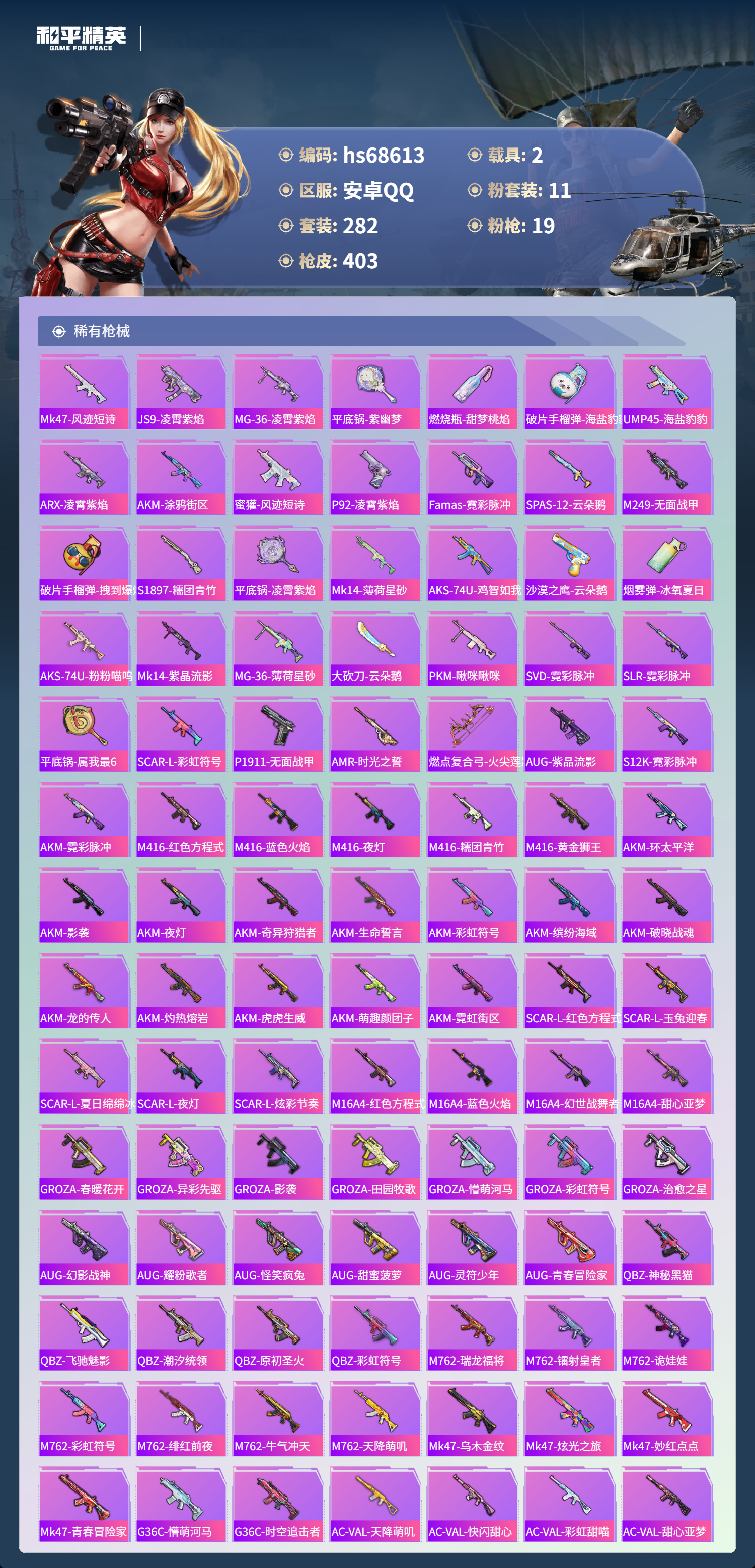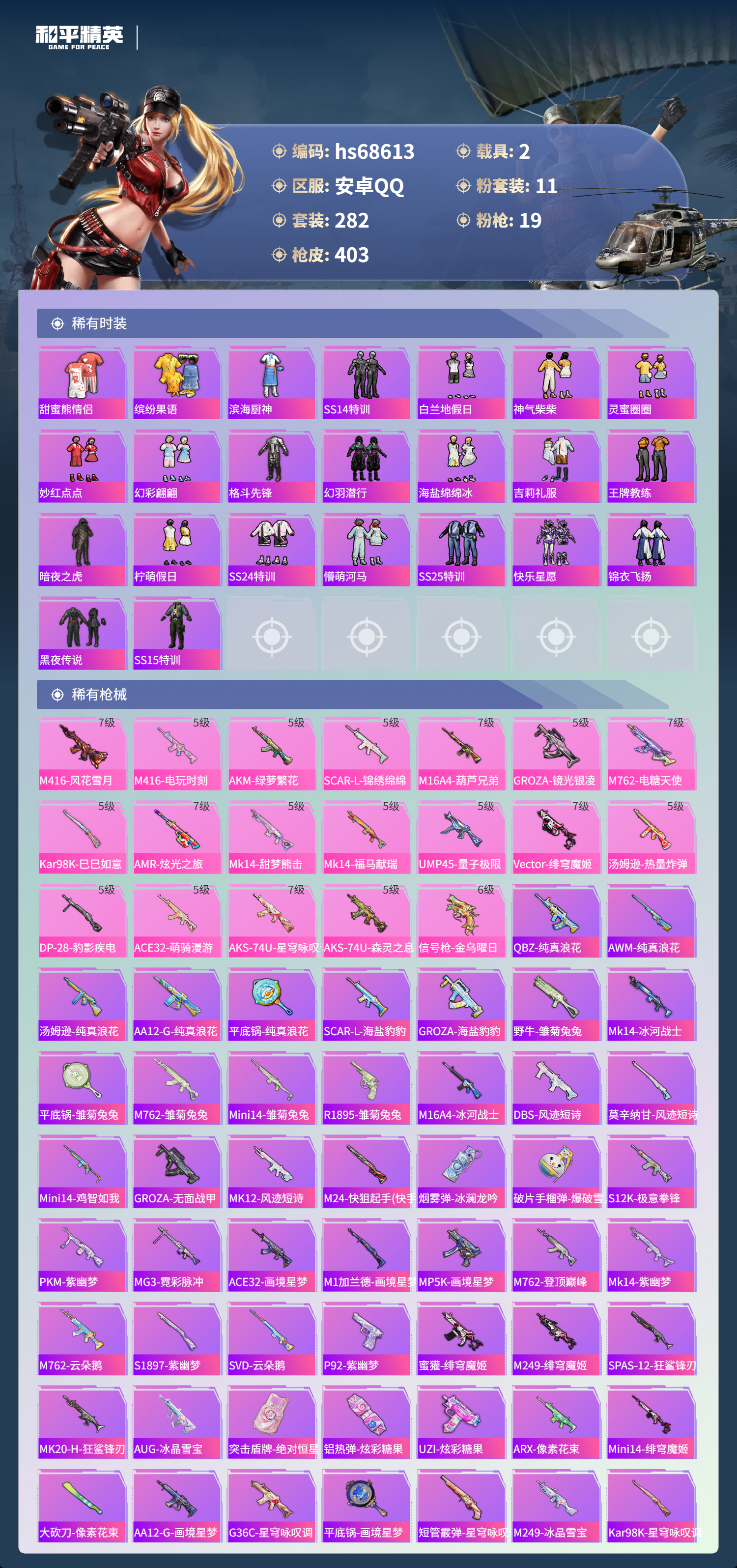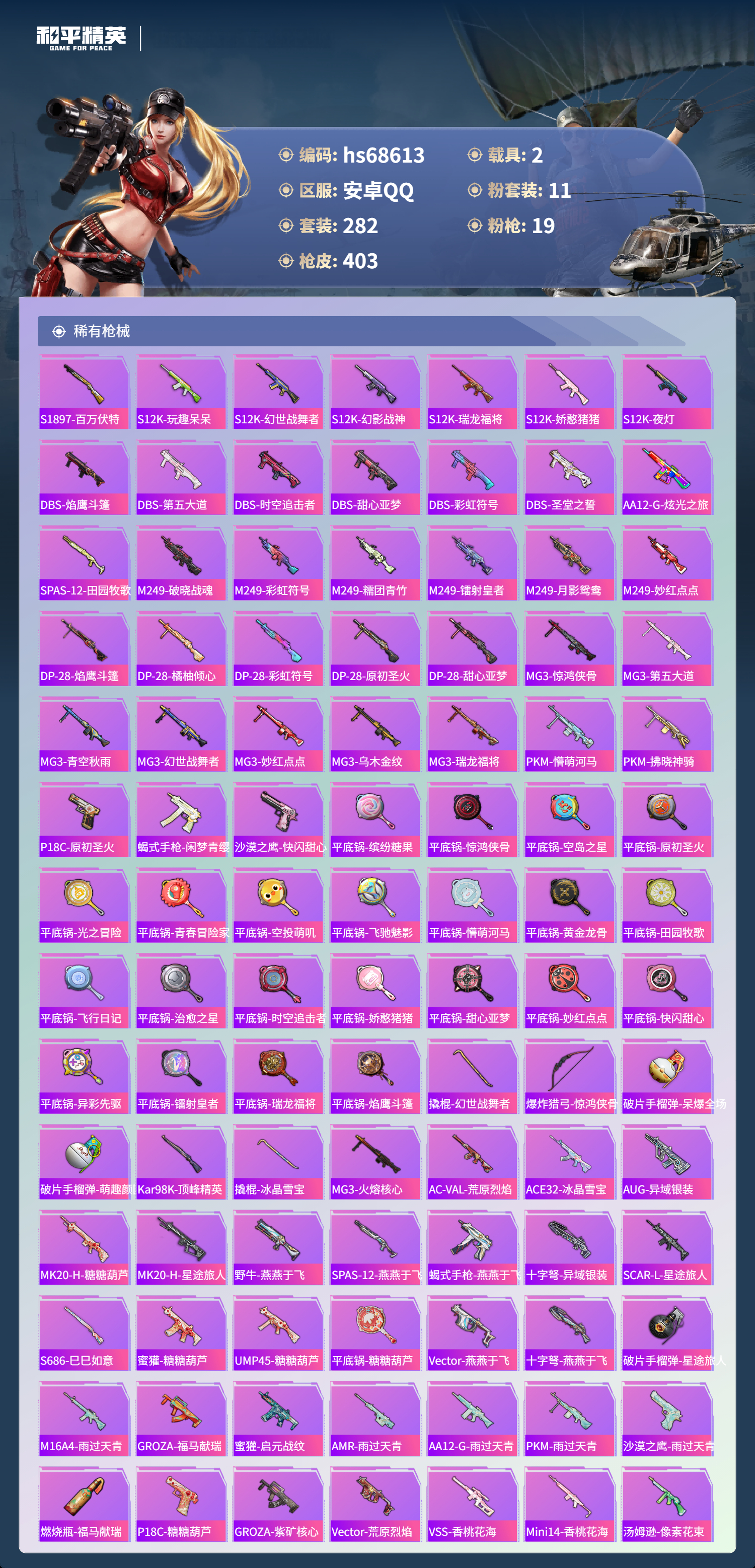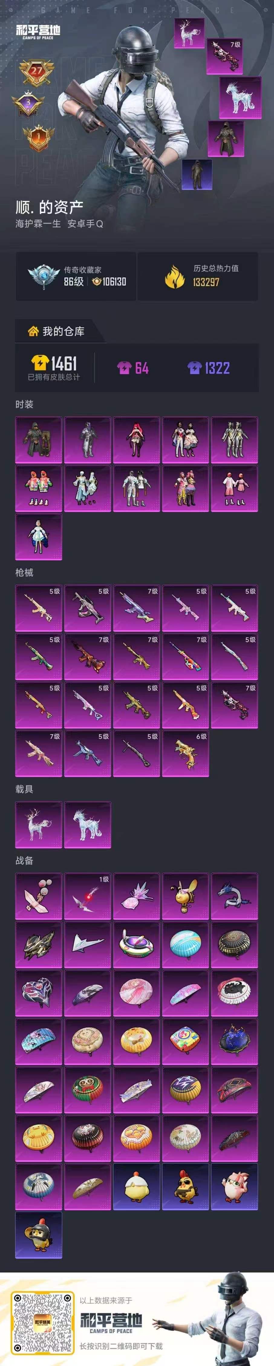 PX_2558624-,安卓手Q-27王牌印记-有战神框-11粉装-19特效枪-2载具-热力值-282套装-403枪皮-3卓越印记-1传奇印记