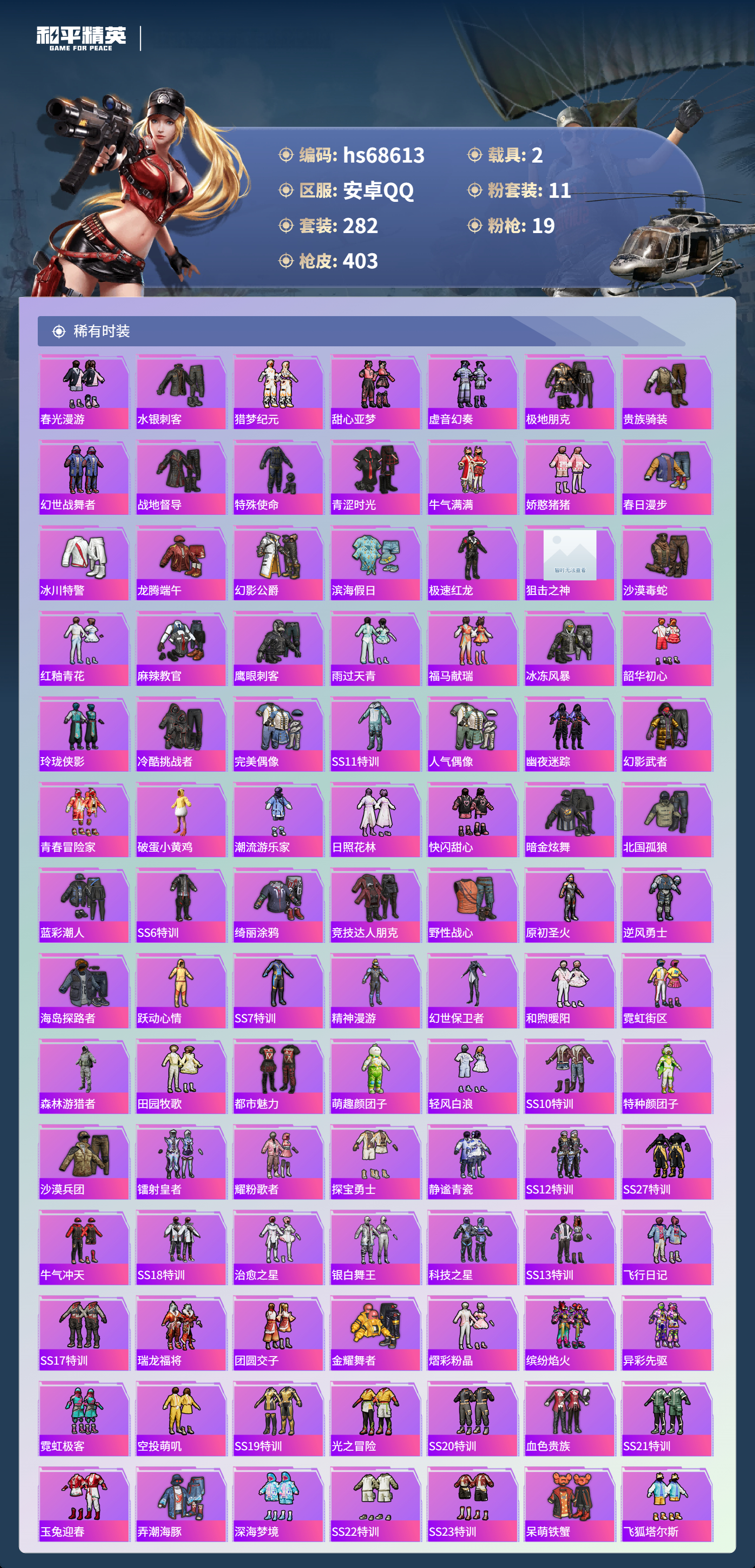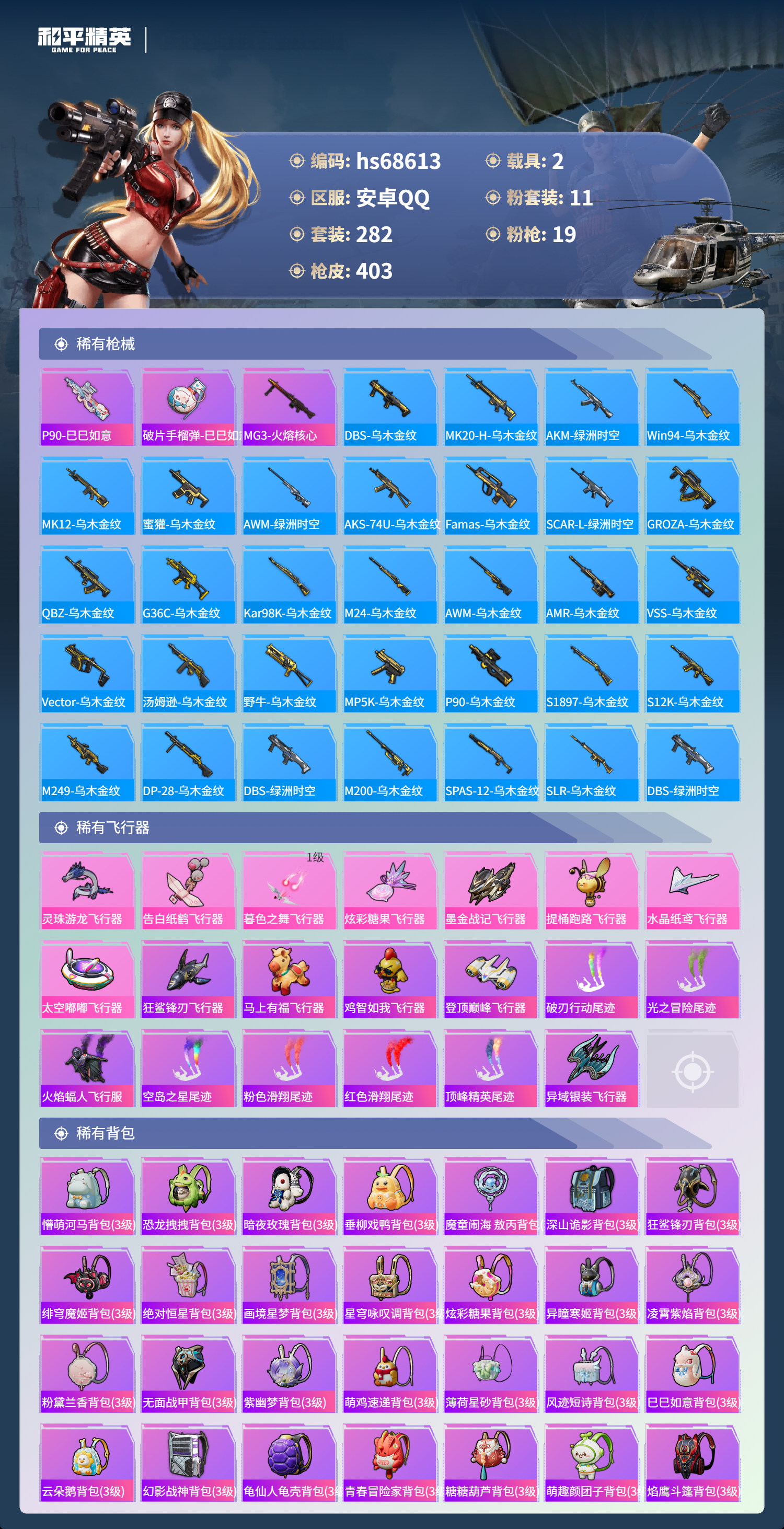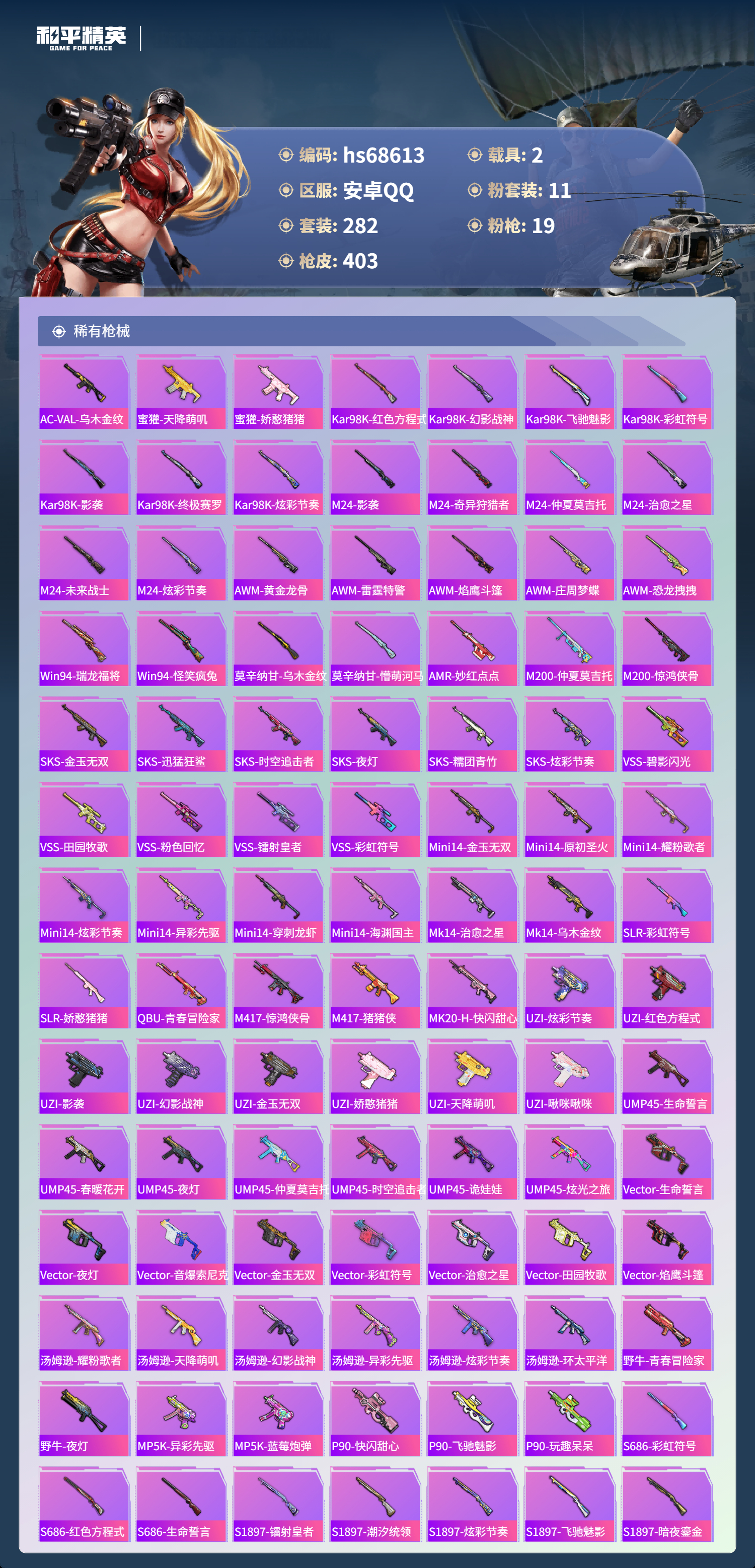 PX_2558624-,安卓手Q-27王牌印记-有战神框-11粉装-19特效枪-2载具-热力值-282套装-403枪皮-3卓越印记-1传奇印记