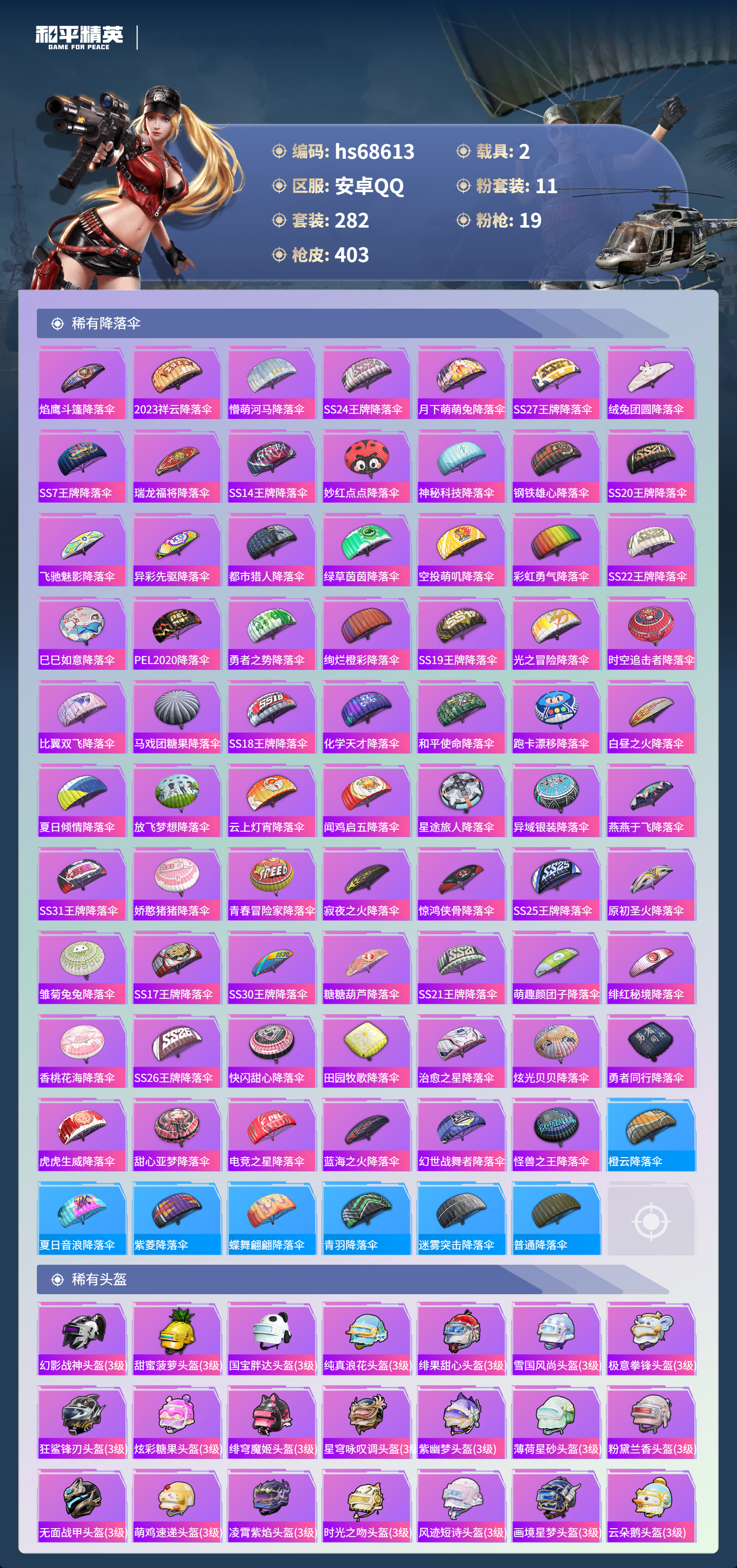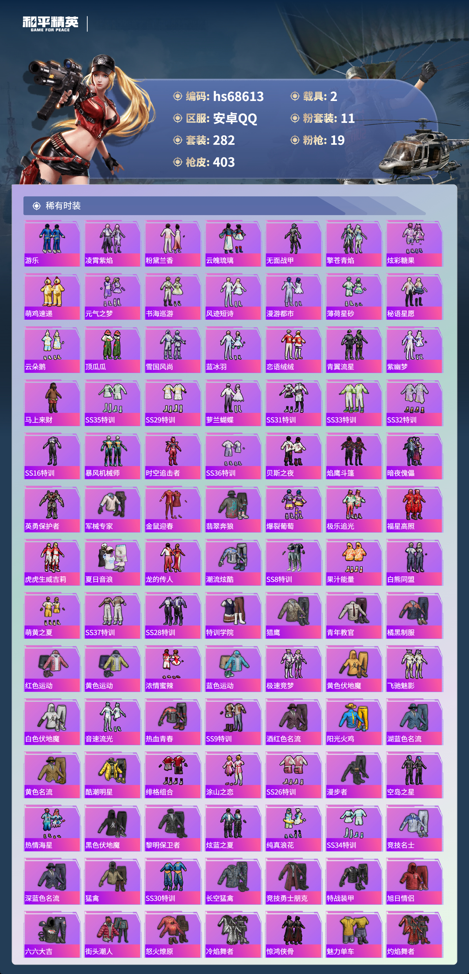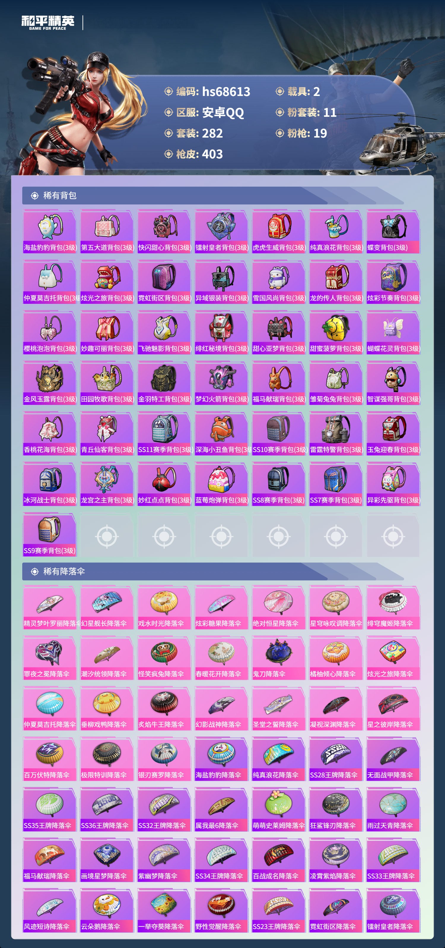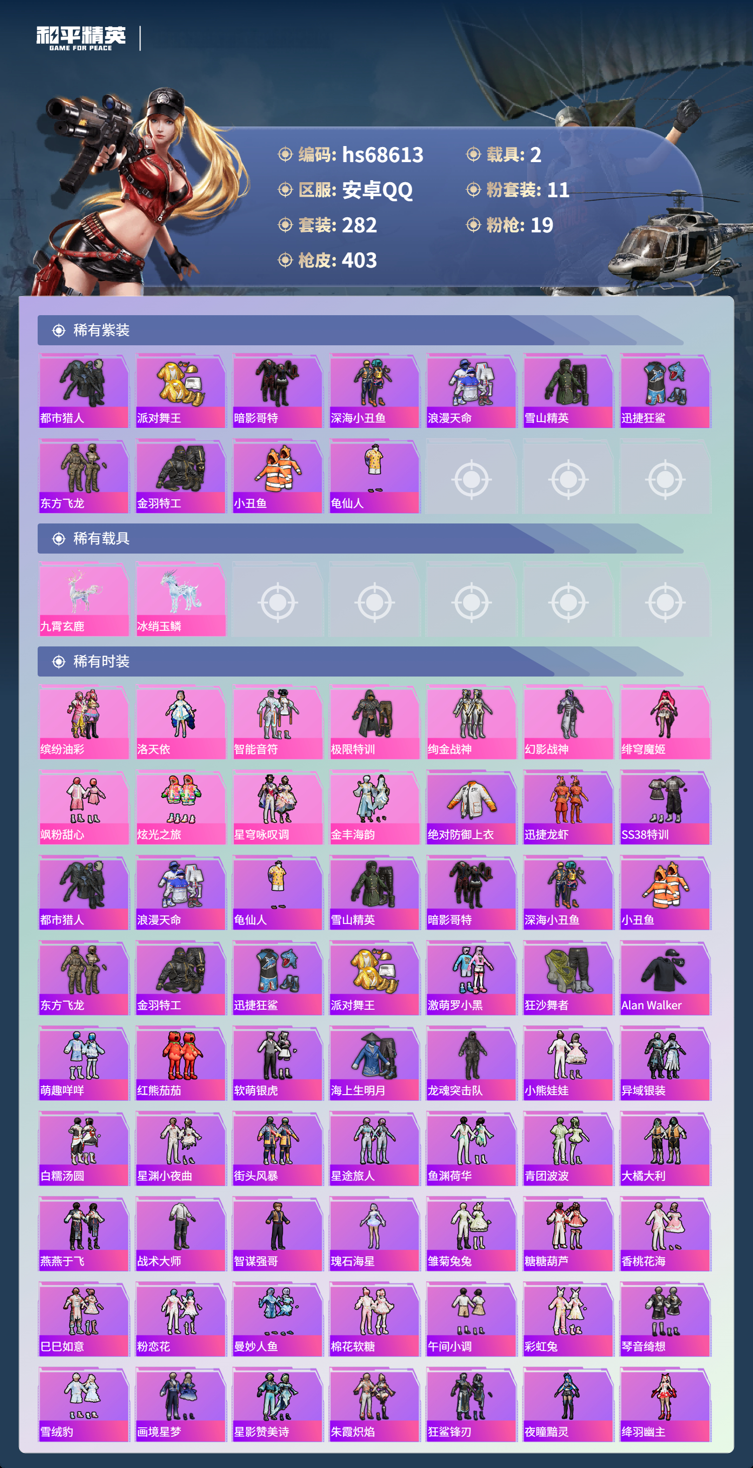 PX_2558624-,安卓手Q-27王牌印记-有战神框-11粉装-19特效枪-2载具-热力值-282套装-403枪皮-3卓越印记-1传奇印记