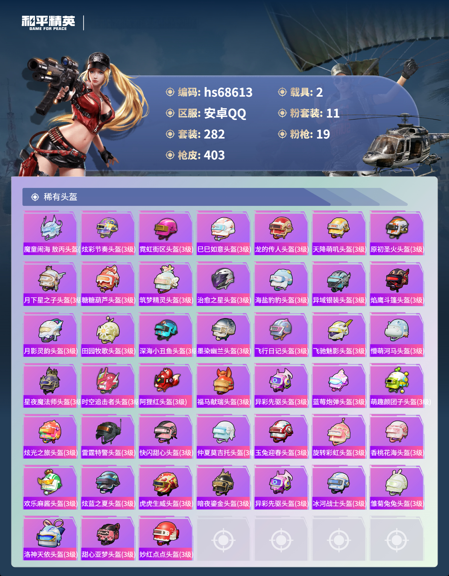 【66稀有头盔】幻影战神头盔(3级),甜蜜菠萝头盔(3级),国宝胖达头盔(3级),纯真浪花头盔(3级),绯果甜心头盔(3级),雪国风尚头盔(3级),极意拳锋头盔(3级),狂鲨锋刃头盔(3级),炫彩糖果头盔(3级),绯穹魔姬头盔(3级),星穹咏叹调头盔(3级),紫幽梦头盔(3级),薄荷星砂头盔(3级),粉黛兰香头盔(3级),无面战甲头盔(3级),萌鸡速递头盔(3级),凌霄紫焰头盔(3级),时光之吻头盔(3级),风迹短诗头盔(3级),画境星梦头盔(3级),云朵鹅头盔(3级),魔童闹海,敖丙头盔(3级),炫彩节奏头盔(3级),霓虹街区头盔(3级),巳巳如意头盔(3级),龙的传人头盔(3级),天降萌叽头盔(3级),原初圣火头盔(3级),月下星之子头盔(3级),糖糖葫芦头盔(3级),筑梦精灵头盔(3级),治愈之星头盔(3级),海盐豹豹头盔(3级),异域银装头盔(3级),焰鹰斗篷头盔(3级),月影灵韵头盔(3级),田园牧歌头盔(3级),深海小丑鱼头盔(3级),墨染幽兰头盔(3级),飞行日记头盔(3级),飞驰魅影头盔(3级),懵萌河马头盔(3级),星夜魔法师头盔(3级),时空追击者头盔(3级),阿狸红头盔(3级),福马献瑞头盔(3级),异彩先驱头盔(3级),蓝莓炮弹头盔(3级),萌趣颜团子头盔(3级),炫光之旅头盔(3级),雷霆特警头盔(3级),快闪甜心头盔(3级),仲夏莫吉托头盔(3级),玉兔迎春头盔(3级),旋转彩虹头盔(3级),香桃花海头盔(3级),欢乐麻酱头盔(3级),炫蓝之夏头盔(3级),虎虎生威头盔(3级),暗夜鎏金头盔(3级),异彩先驱头盔(3级),冰河战士头盔(3级),雏菊兔兔头盔(3级),洛神天依头盔(3级),甜心亚梦头盔(3级),妙红点点头盔(3级)