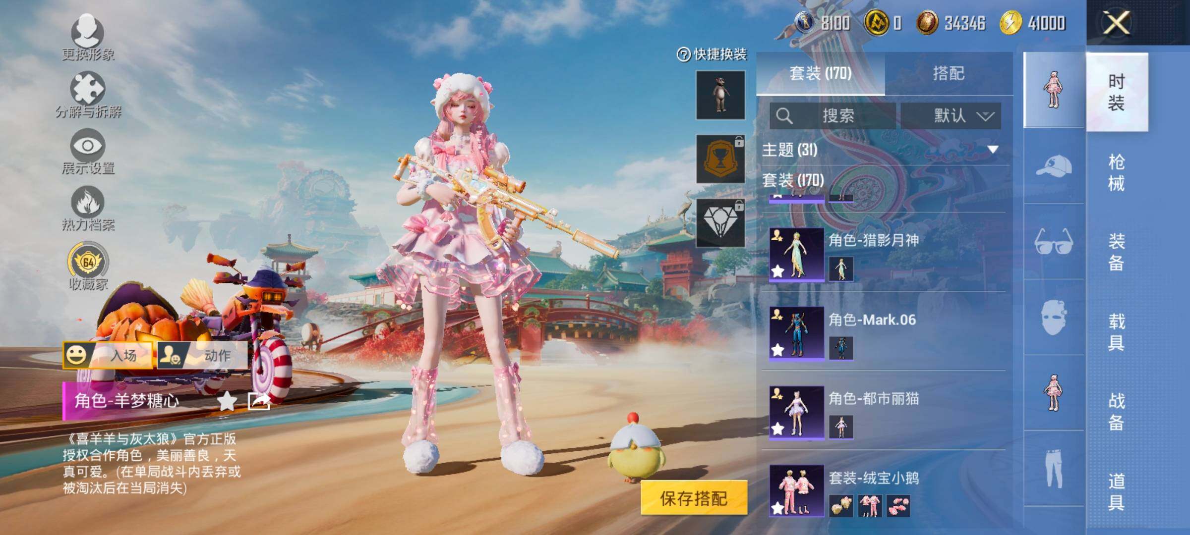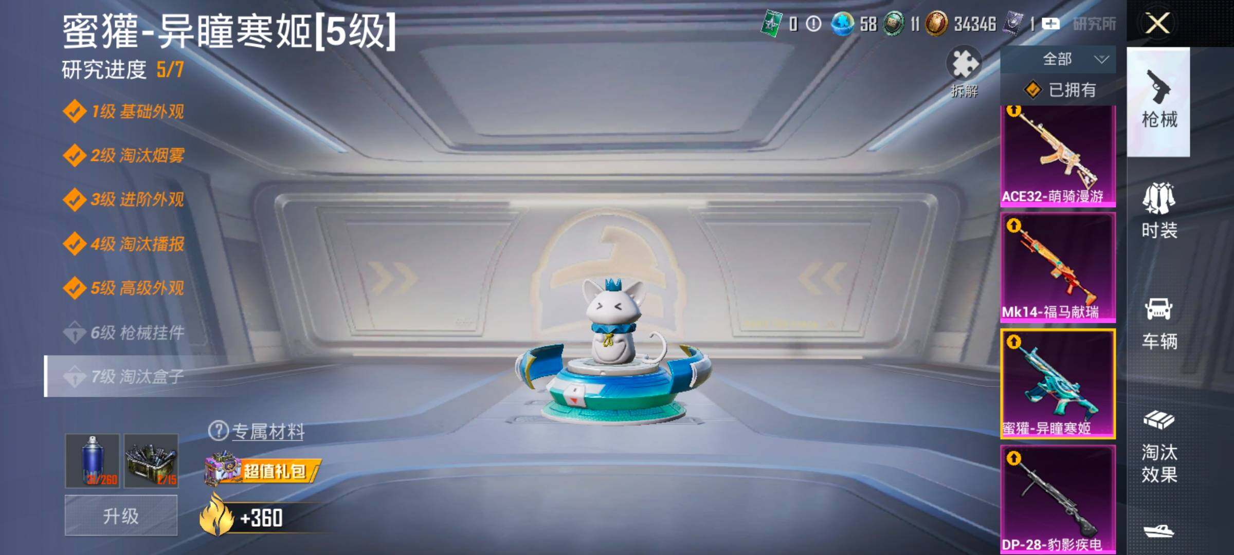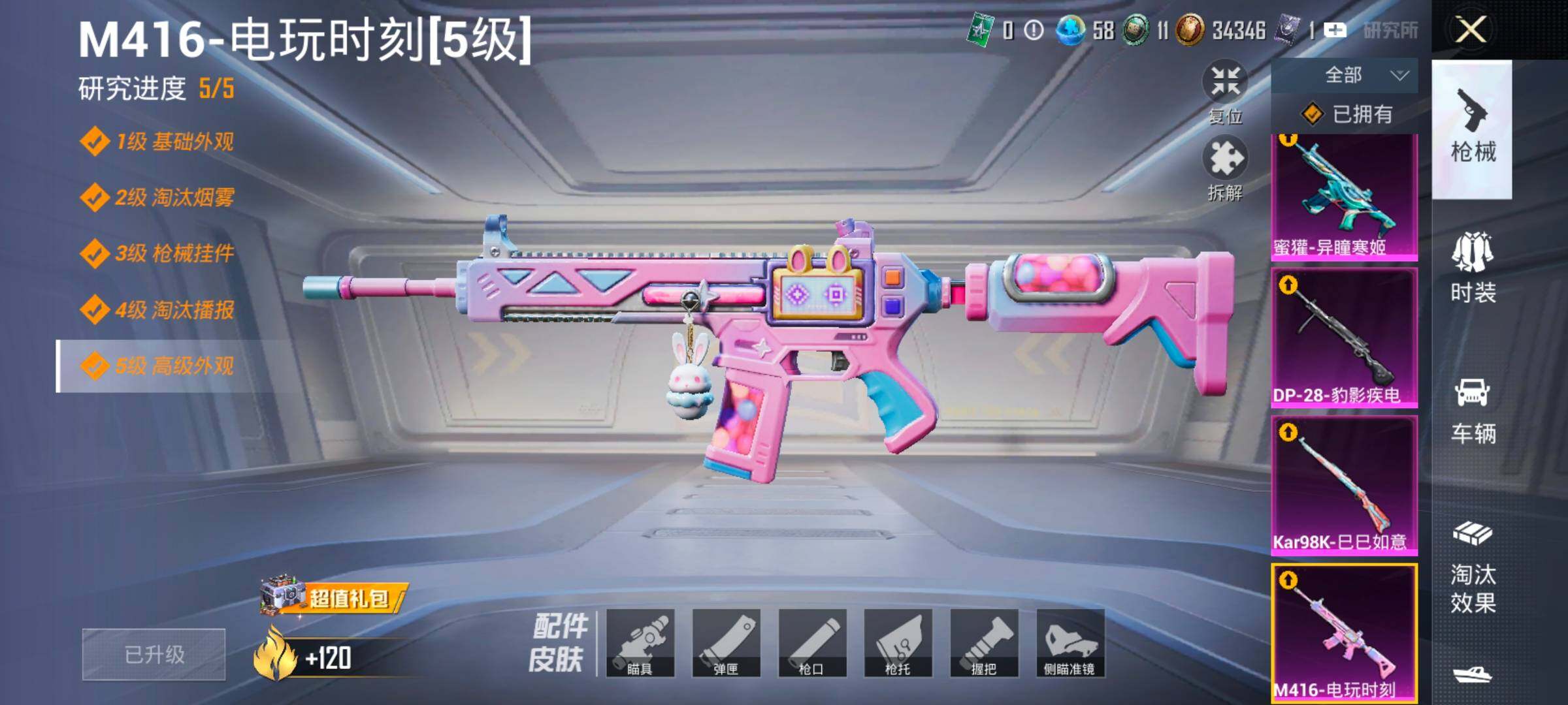 【6特效枪】,M416-电玩时刻,(5级),Kar98K-巳巳如意,(5级),DP-28-豹影疾电,(5级),蜜獾-异瞳寒姬,(5级),Mk14-福马献瑞,(5级),ACE32-萌骑漫游,(5级),