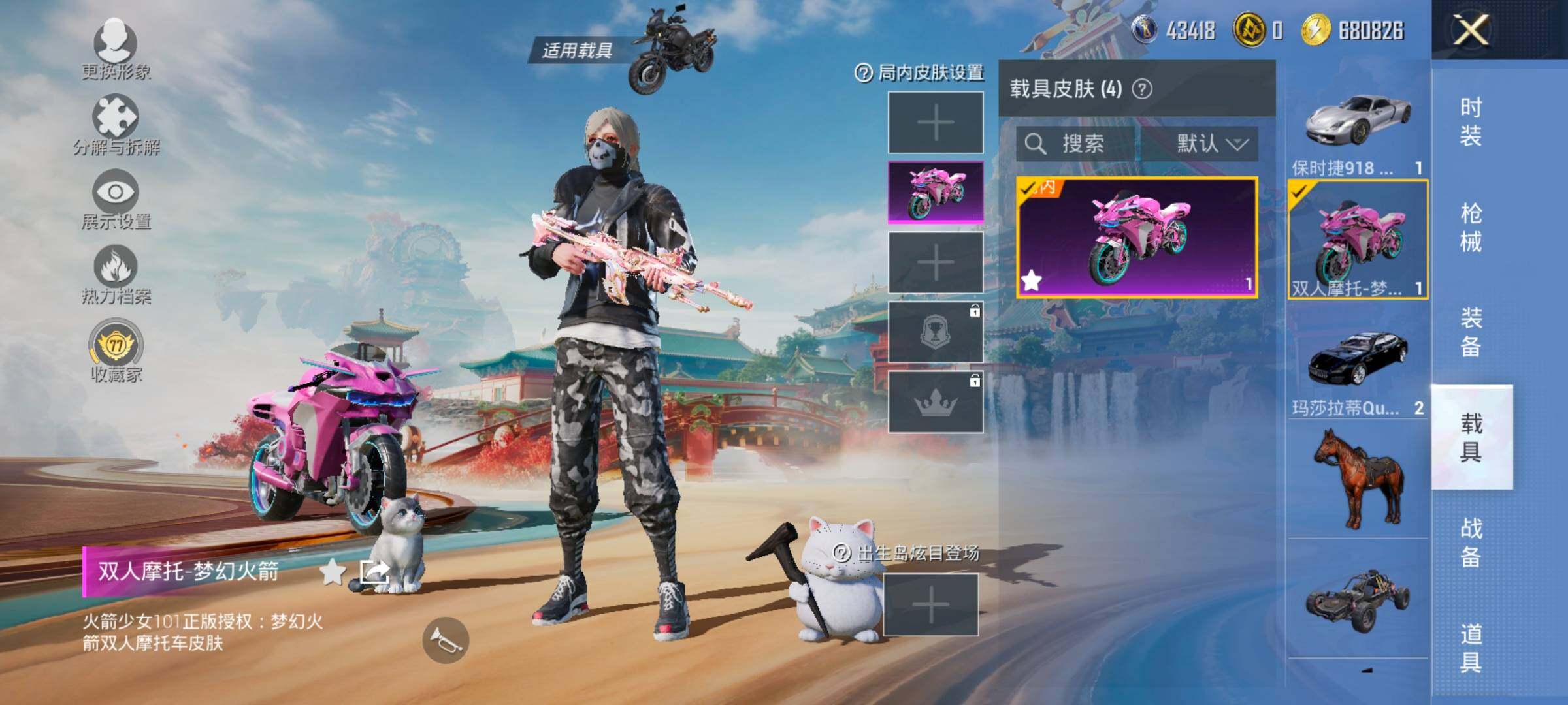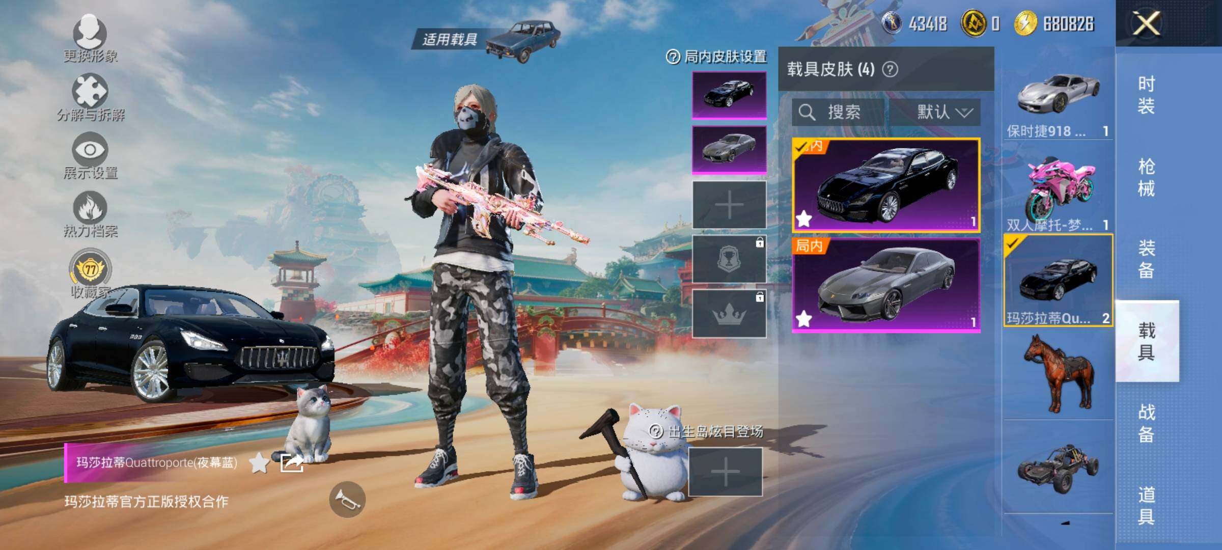 【4载具】,保时捷918Spyder(液态银),玛莎拉蒂Q蓝色,兰博轿车灰色,双人摩托梦幻火箭,