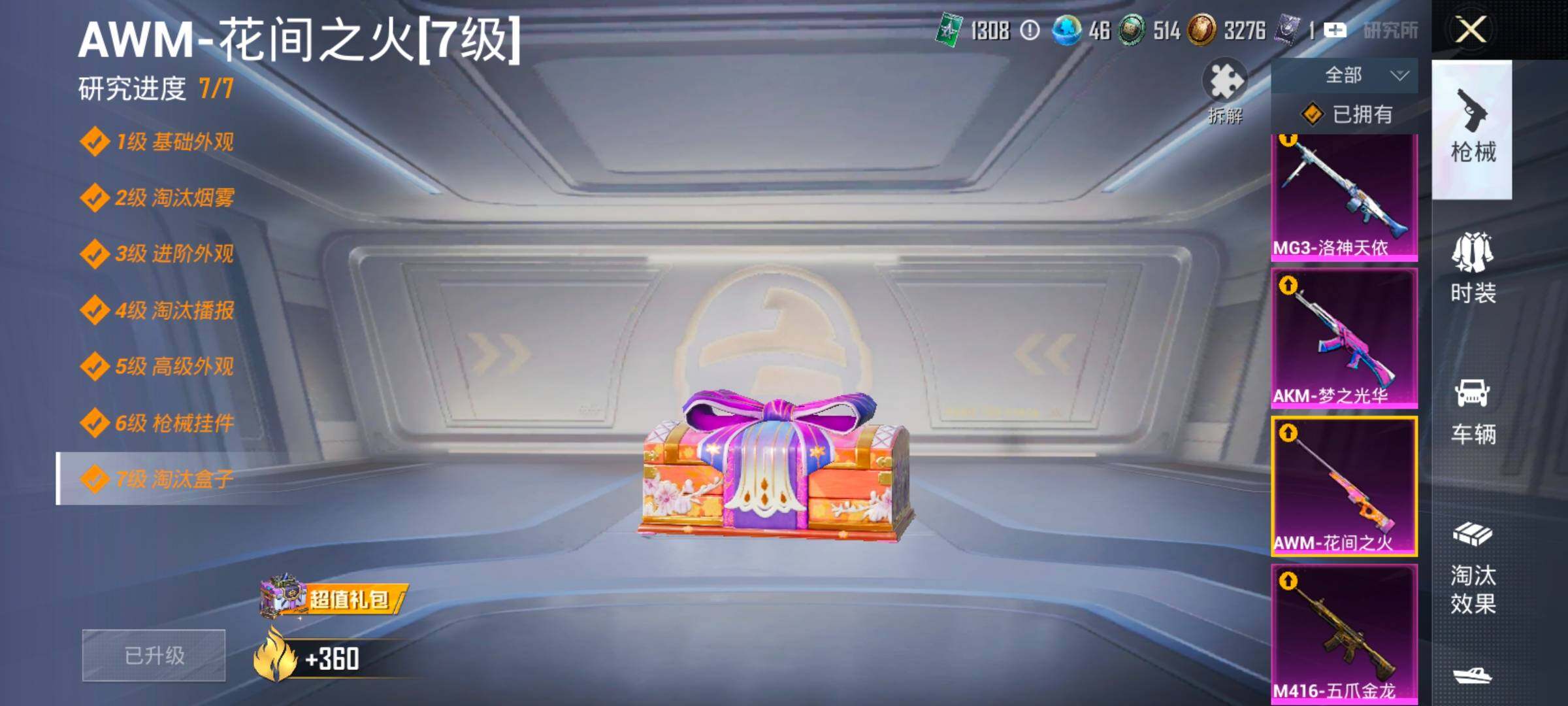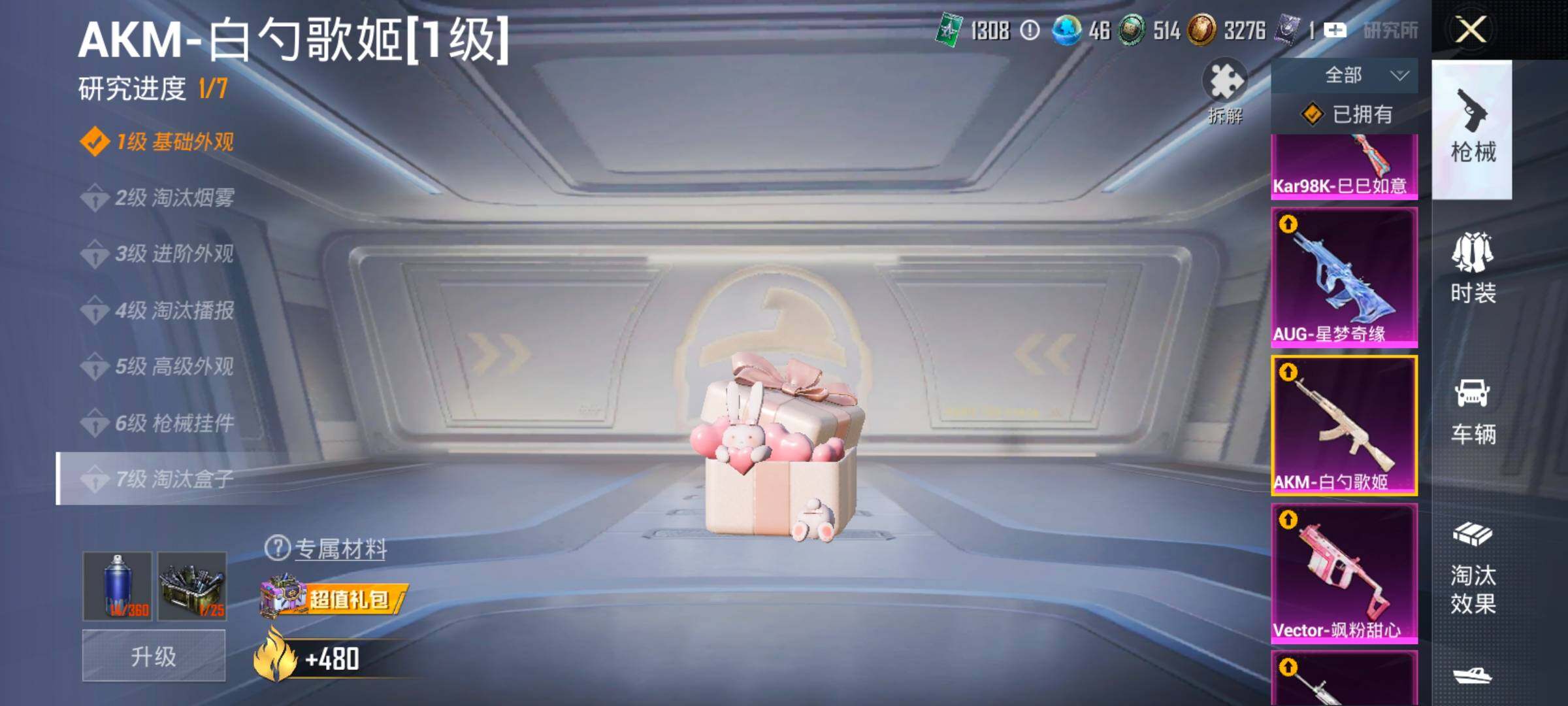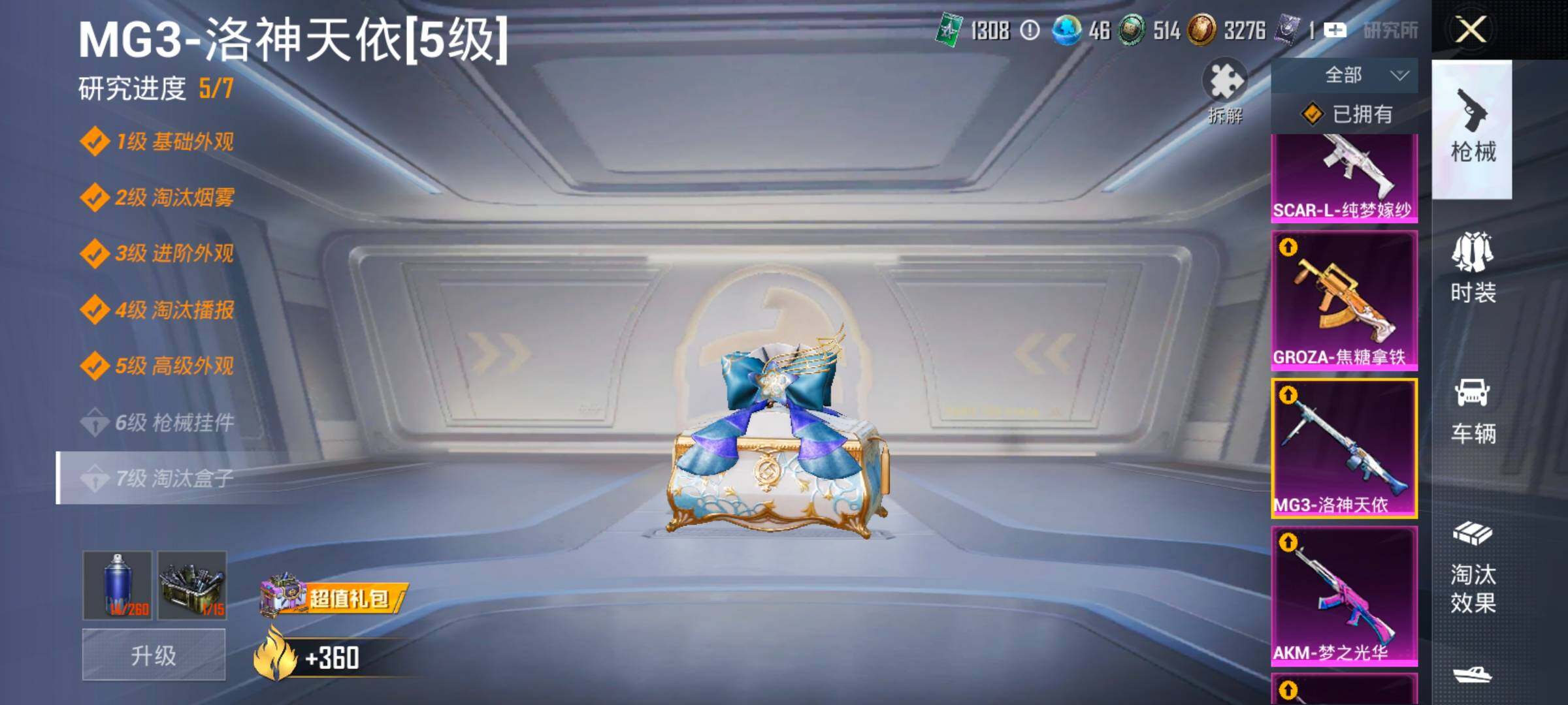 【15特效枪】,M416-五爪金龙,(5级),SCAR-L-纯梦嫁纱,(5级),AKM-白勺歌姬,(1级),AKS-74U-森灵之息,(5级),Kar98K-巳巳如意,(5级),MG3-辉羽雀灵,(1级),Vector-飒粉甜心,(5级),DP-28-豹影疾电,(5级),AUG-星梦奇缘,(3级),AWM-花间之火,(7级),Mk14-盛世惊鸿,(3级),AKM-梦之光华,(6级),MG3-洛神天依,(5级),Mk14-福马献瑞,(1级),GROZA-焦糖拿铁,(6级),