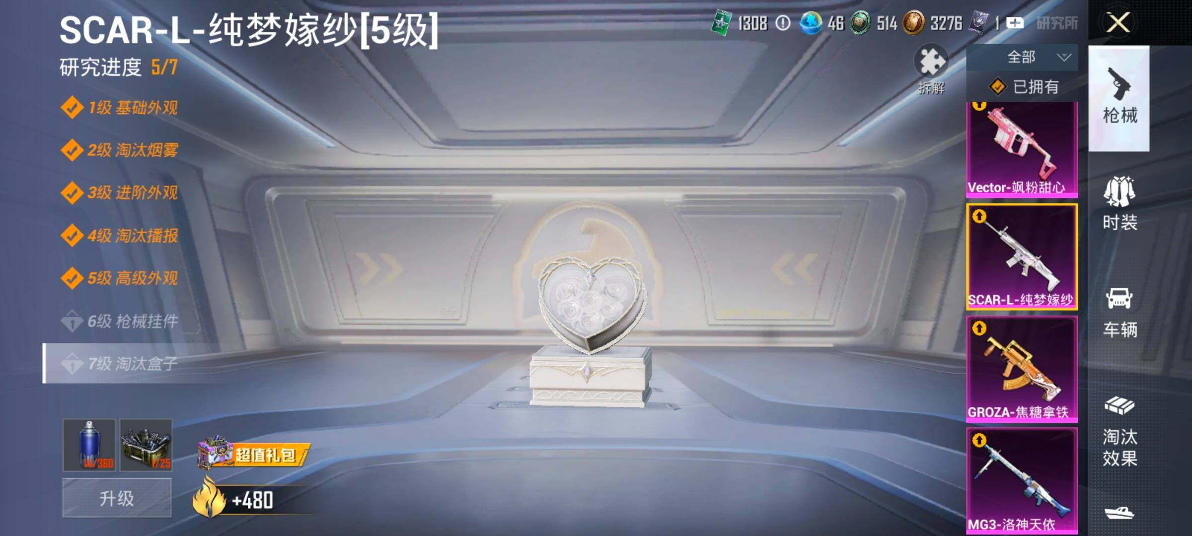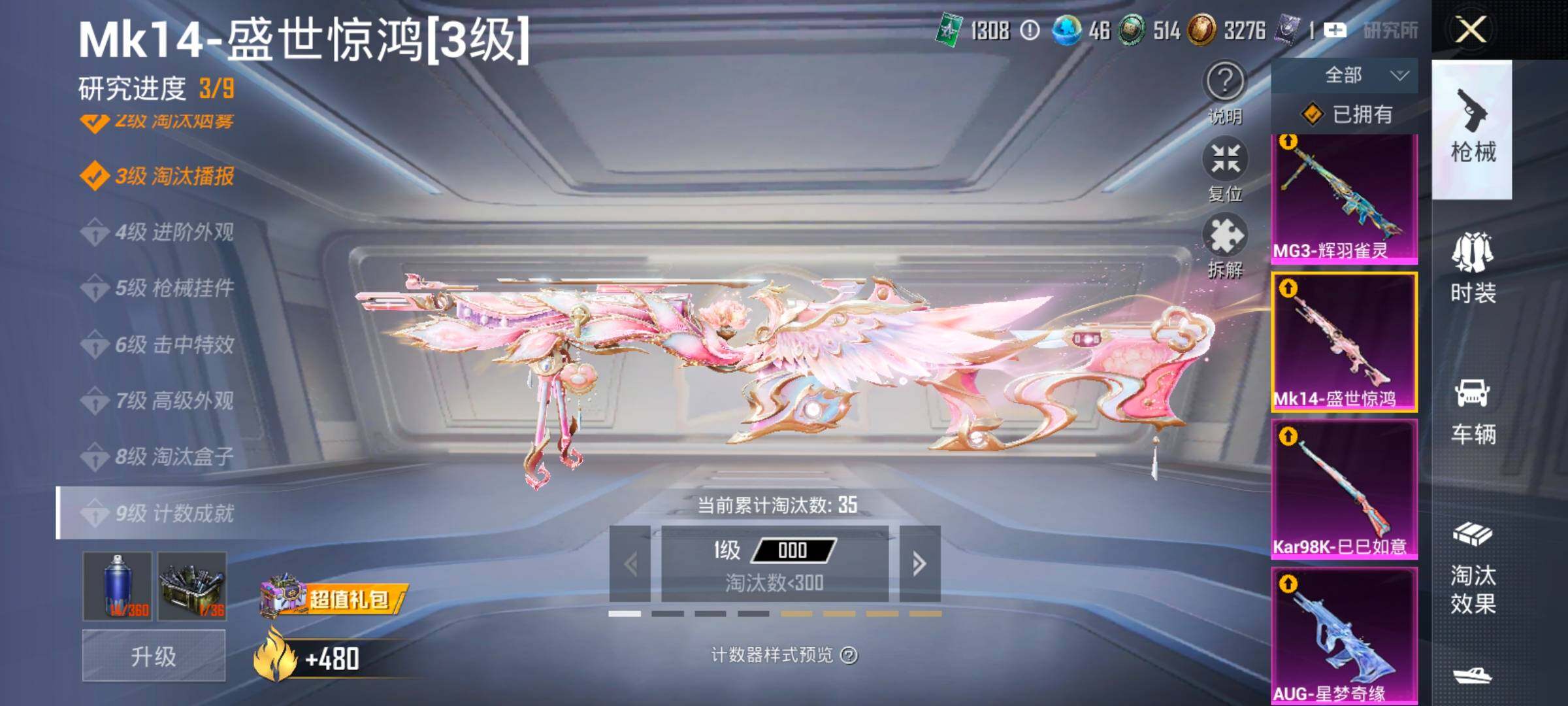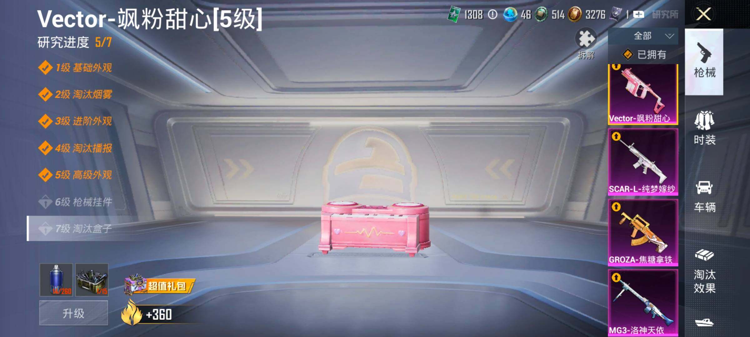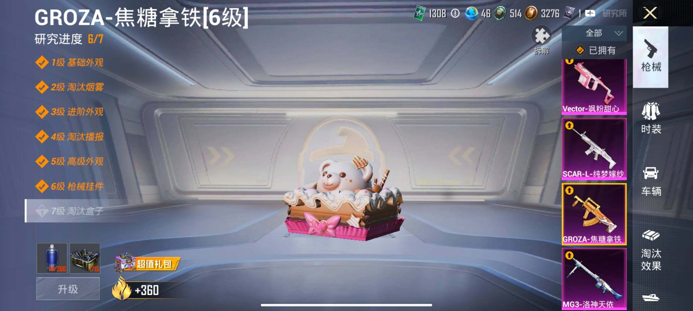 【15特效枪】,M416-五爪金龙,(5级),SCAR-L-纯梦嫁纱,(5级),AKM-白勺歌姬,(1级),AKS-74U-森灵之息,(5级),Kar98K-巳巳如意,(5级),MG3-辉羽雀灵,(1级),Vector-飒粉甜心,(5级),DP-28-豹影疾电,(5级),AUG-星梦奇缘,(3级),AWM-花间之火,(7级),Mk14-盛世惊鸿,(3级),AKM-梦之光华,(6级),MG3-洛神天依,(5级),Mk14-福马献瑞,(1级),GROZA-焦糖拿铁,(6级),