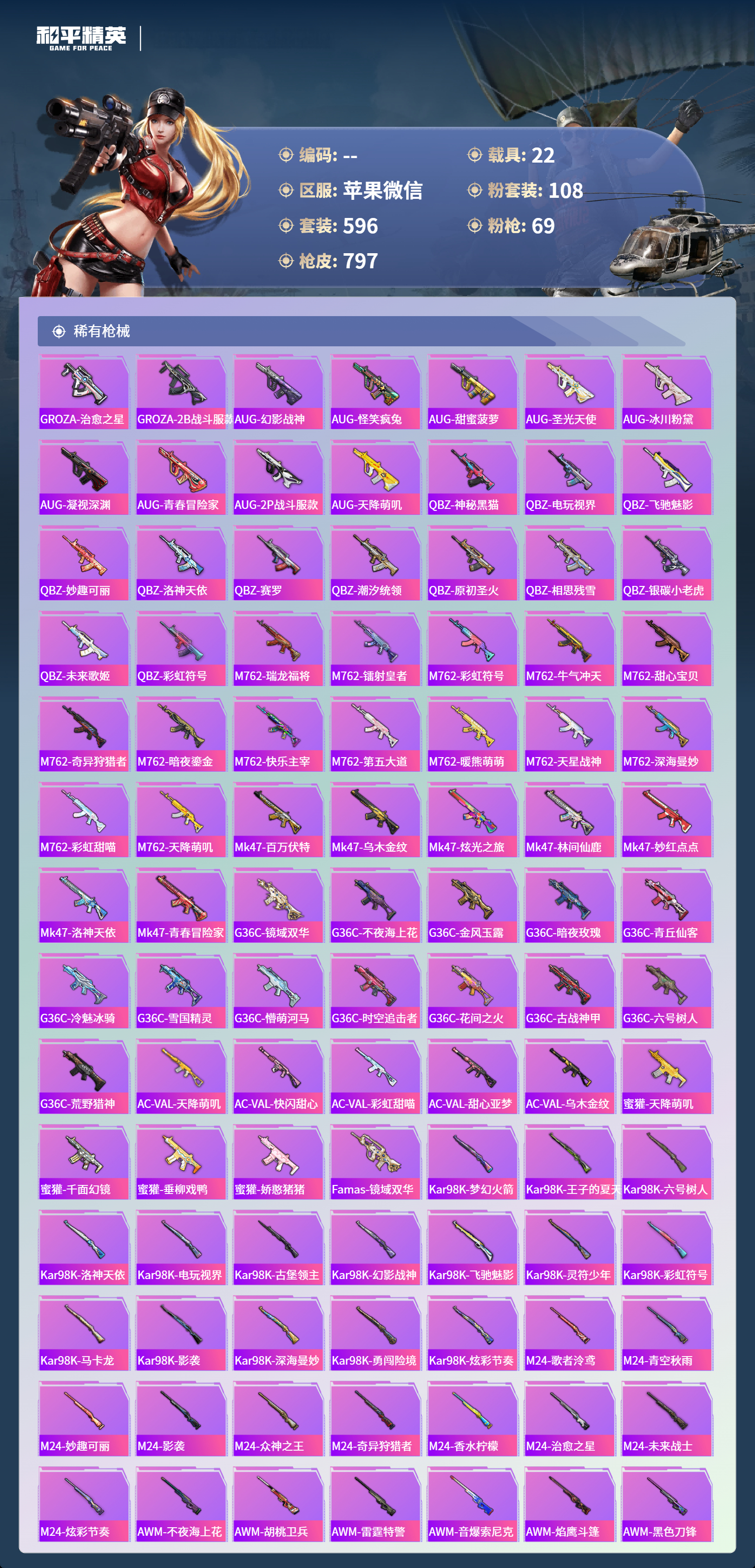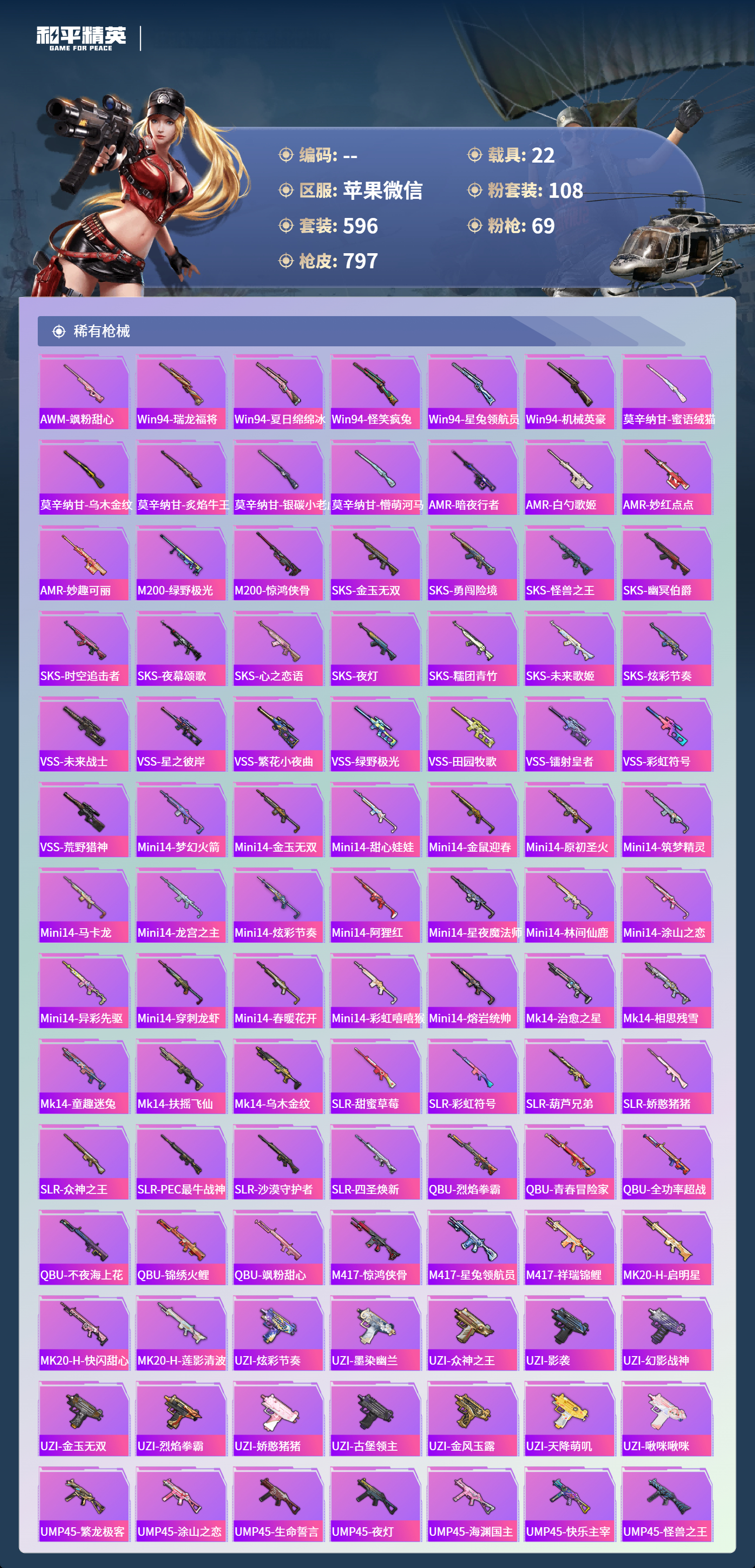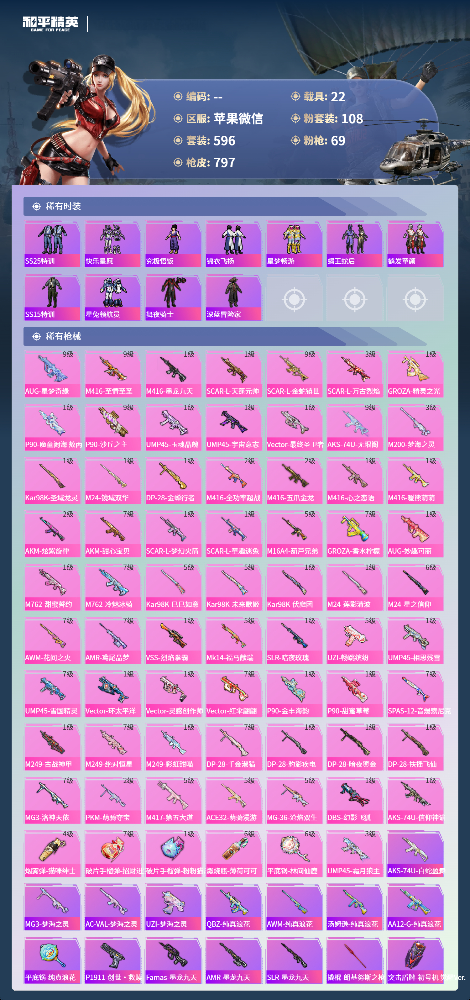 【791稀有枪械】AUG-星梦奇缘/9级,M416-至情至圣/9级,M416-墨龙九天/1级,SCAR-L-天蓬元帅/1级,SCAR-L-金蛇镇世/9级,SCAR-L-万古烈焰/3级,GROZA-精灵之光/1级,P90-魔童闹海,敖丙/1级,P90-沙丘之主/9级,UMP45-玉魂晶魄/1级,UMP45-宇宙意志/1级,Vector-最终圣卫者/1级,AKS-74U-无垠阁/9级,M200-梦海之灵/3级,Kar98K-圣域龙灵/1级,M24-镜域双华/1级,DP-28-金蝉行者/1级,M416-全功率超战/2级,M416-五爪金龙/2级,M416-心之恋语/1级,M416-暖熊萌萌/1级,AKM-炫紫旋律/2级,AKM-甜心宝贝/7级,SCAR-L-梦幻火箭/1级,SCAR-L-童趣迷兔/1级,M16A4-葫芦兄弟/5级,GROZA-香水柠檬/7级,AUG-妙趣可丽/1级,M762-甜蜜誓约/1级,M762-冷魅冰骑/7级,Kar98K-巳巳如意/5级,Kar98K-未来歌姬/5级,Kar98K-伏魔团/1级,M24-莲影清波/1级,M24-星之信仰/6级,AWM-花间之火/7级,AMR-鸢尾晶梦/7级,VSS-烈焰拳霸/1级,Mk14-福马献瑞/5级,SLR-暗夜玫瑰/1级,UZI-畅跳缤纷/5级,UMP45-相思残雪/1级,UMP45-雪国精灵/7级,Vector-环太平洋/1级,Vector-灵感创作师/1级,Vector-红伞翩翩/7级,P90-金丰海韵/1级,P90-甜蜜草莓/1级,SPAS-12-音爆索尼克/7级,M249-古战神甲/1级,M249-绝对恒星/7级,M249-彩虹甜喵/1级,DP-28-千金淑猫/7级,DP-28-豹影疾电/1级,DP-28-暗夜鎏金/1级,DP-28-扶摇飞仙/1级,MG3-洛神天依/7级,PKM-萌骑夺宝/2级,M417-第五大道/5级,ACE32-萌骑漫游/5级,MG-36-沧焰双生/5级,DBS-幻影飞狐/1级,AKS-74U-信仰神谕/1级,烟雾弹-猫咪绅士/4级,破片手榴弹-招财进宝/7级,破片手榴弹-粉粉猫爪/1级,燃烧瓶-薄荷可可/6级,平底锅-林间仙鹿/6级,AKS-74U-白蛇盈舞,MG3-梦海之灵,AC-VAL-梦海之灵,UZI-梦海之灵,QBZ-纯真浪花,AWM-纯真浪花,汤姆逊-纯真浪花,DBS-乌木金纹,AA12-G-纯真浪花,平底锅-纯真浪花,P1911-创世·救赎,Famas-墨龙九天,AMR-墨龙九天,SLR-墨龙九天,撬棍-朗基努斯之枪,突击盾牌-初号机,觉醒Ver.,汤姆逊-星梦奇缘,蜜獾-精灵梦叶罗丽,S1897-精灵梦叶罗丽,MK20-H-星梦奇缘,SCAR-L-海盐豹豹,平底锅-精灵梦叶罗丽,SKS-冠军兔兔,GROZA-海盐豹豹,TMP-9-霓彩节奏,野牛-雏菊兔兔,蝎式手枪-金丰海韵,Mk14-冰河战士,AKS-74U-尼罗河传说,DP-28-尼罗河传说,P92-尼罗河传说,平底锅-雏菊兔兔,M762-雏菊兔兔,Mini14-雏菊兔兔,Famas-突变脉冲,M200-宇宙意志,短管霰弹-宇宙意志,Vector-突变脉冲,R1895-雏菊兔兔,AC-VAL-宇宙意志,M249-金丰海韵,UZI-冰河战士,M16A4-冰河战士,MK20-H-乌木金纹,MK20-H-圣域龙灵,短管霰弹-圣域龙灵,DBS-风迹短诗,莫辛纳甘-风迹短诗,Win94-乌木金纹,MK12-风迹短诗,MK12-乌木金纹,AKS-74U-荧光像素,烟雾弹-冰澜龙吟,破片手榴弹-爆破雪人,S12K-极意拳锋,S1897-绒绒粉兔,P18C-绒绒粉兔,SCAR-L-镜光械姬,MK12-镜光械姬,S12K-镜光械姬,PKM-紫幽梦,MG3-霓彩脉冲,R45-幻彩电音,ACE32-画境星梦,M1加兰德-画境星梦,MP5K-画境星梦,M762-登顶巅峰,Mk14-紫幽梦,蜜獾-乌木金纹,M762-云朵鹅,S1897-紫幽梦,SVD-云朵鹅,P92-紫幽梦,SPAS-12-狂鲨锋刃,Mk14-绒绒粉兔,M417-玩趣呆呆,MK20-H-狂鲨锋刃,AUG-冰晶雪宝,突击盾牌-绝对恒星,铝热弹-炫彩糖果,UZI-炫彩糖果,M416-萌萌史莱姆,UMP45-极意拳锋,MG3-鸢尾珑雾,TMP-9-萌萌史莱姆,AA12-G-画境星梦,G36C-星穹咏叹调,平底锅-画境星梦,短管霰弹-星穹咏叹调,M249-冰晶雪宝,Kar98K-星穹咏叹调,Mk47-风迹短诗,JS9-凌霄紫焰,MG-36-凌霄紫焰,平底锅-紫幽梦,破片手榴弹-海盐豹豹,UMP45-海盐豹豹,ARX-凌霄紫焰,AKS-74U-乌木金纹,AKM-涂鸦街区,电击枪-喜羊羊与灰太狼,蜜獾-风迹短诗,爆炸猎弓-喜羊羊与灰太狼,P92-凌霄紫焰,AMR-喜羊羊与灰太狼,Famas-乌木金纹,Famas-霓彩脉冲,SPAS-12-云朵鹅,破片手榴弹-拽到爆炸,Mini14-辉羽雀灵,UMP45-夜幕侵蚀,S1897-糯团青竹,信号枪-异瞳寒姬,平底锅-凌霄紫焰,Mk14-薄荷星砂,MK20-H-蛇蝎美人,G36C-蛇蝎美人,蝎式手枪-蛇蝎美人,汤姆逊-智耀战神,蜜獾-御兔特攻,DP-28-御兔特攻,沙漠之鹰-云朵鹅,烟雾弹-冰氧夏日,MG-36-薄荷星砂,SCAR-L-绿洲时空,PKM-荧光像素,大砍刀-云朵鹅,PKM-啾咪啾咪,SLR-圣穹绘梦,UMP45-圣穹绘梦,沙漠之鹰-圣穹绘梦,AUG-绝对恒星,M24-天降萌叽,M200-爆裂游戏,撬棍-双重狂想,GROZA-荧海星豚,SLR-霓彩脉冲,平底锅-属我最6,AC-VAL-六号稻草人,SCAR-L-彩虹符号,M200-六号稻草人,蝎式手枪-六号稻草人,蜜獾-冰澜龙吟,大砍刀-冰澜龙吟,M16A4-最终圣卫者,S12K-霓彩脉冲,Kar98k-最终圣卫者,野牛-最终圣卫者,AKM-霓彩脉冲,SKS-圣域龙灵,M416-红色方程式,M416-神秘黑猫,M416-潮汐统领,M416-乌木金纹,M416-夜灯,M416-紫翼圣骑,M416-糯团青竹,M416-暗夜行者,M416-葫芦兄弟,M416-黄金狮王,M416-快乐主宰,M416-南瓜骑士,M416-彩虹嘻嘻猴,AKM-筑梦精灵,AKM-环太平洋,AKM-影袭,AKM-星兔领航员,AKM-王牌投手,AKM-锦绣火鲤,AKM-夜灯,AKM-四圣焕新,AKM-奇异狩猎者,AKM-生命誓言,AKM-星之彼岸,AKM-彩虹符号,AKM-龙的传人,AKM-荒野猎神,AKM-2P战斗服款,AKM-灼热熔岩,AKM-虎虎生威,AKM-星之信仰,AKM-萌趣颜团子,AKM-阿狸红,AKM-霓虹街区,AKM-沙漠守护者,SCAR-L-玉兔迎春,SCAR-L-暗夜玫瑰,SCAR-L-甜蜜誓约,SCAR-L-银碳小老虎,SCAR-L-王牌四分卫,SCAR-L-金风玉露,SCAR-L-夏日绵绵冰,SCAR-L-怪兽之王,SCAR-L-扶摇飞仙,SCAR-L-凝视深渊,SCAR-L-致命红樱,SCAR-L-夜灯,SCAR-L-炫彩节奏,SCAR-L-粉锦千层,SCAR-L-生命誓言,M16A4-南瓜骑士,M16A4-机械英豪,M16A4-快乐主宰,M16A4-红色方程式,M16A4-蓝色火焰,M16A4-冥河战士,M16A4-幻世战舞者,M16A4-凝视深渊,M16A4-甜心亚梦,M16A4-乌木金纹,M16A4-夜灯,M16A4-莲影清波,GROZA-乌木金纹,GROZA-异彩先驱,GROZA-影袭,GROZA-田园牧歌,GROZA-紫翼圣骑,GROZA-懵萌河马,GROZA-彩虹符号,GROZA-林