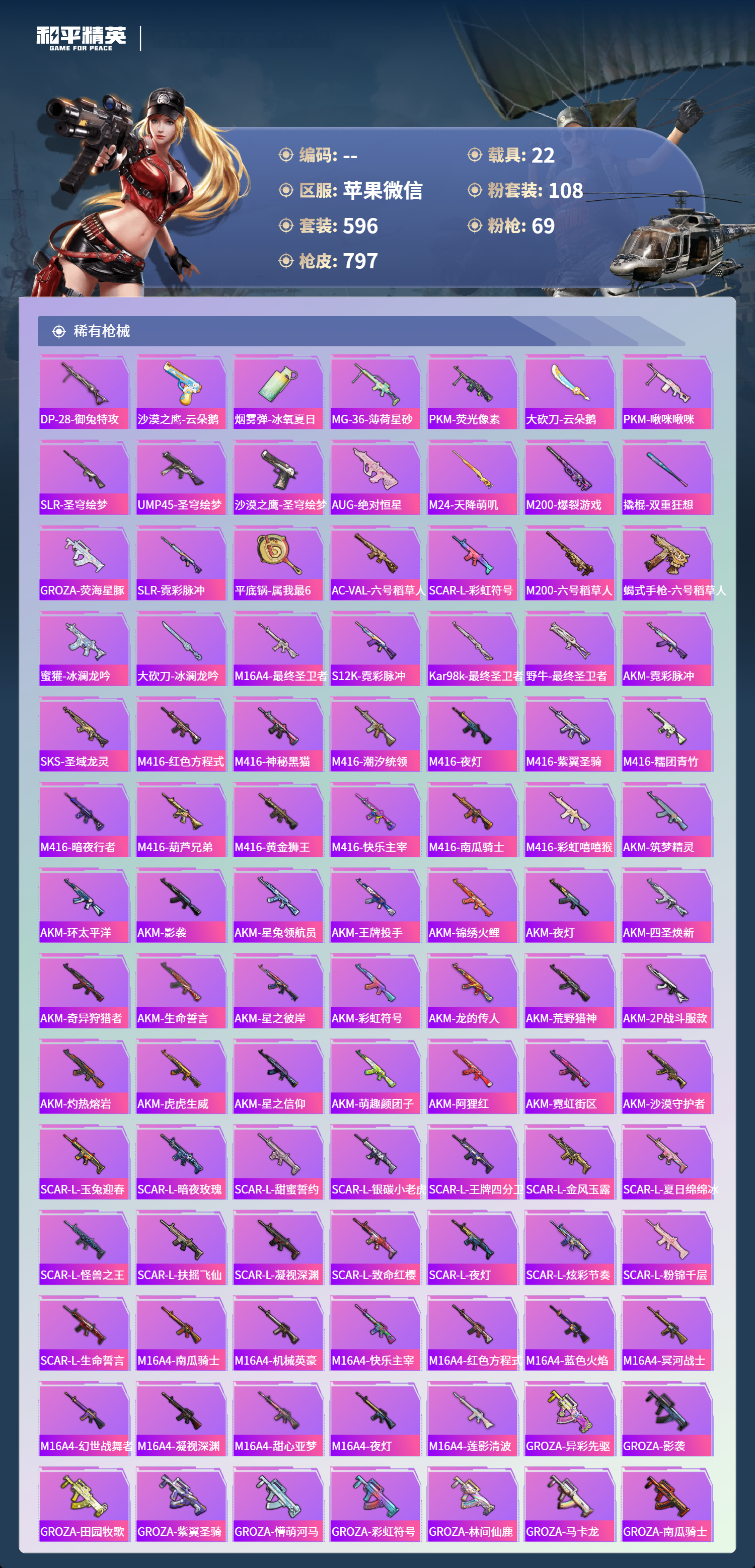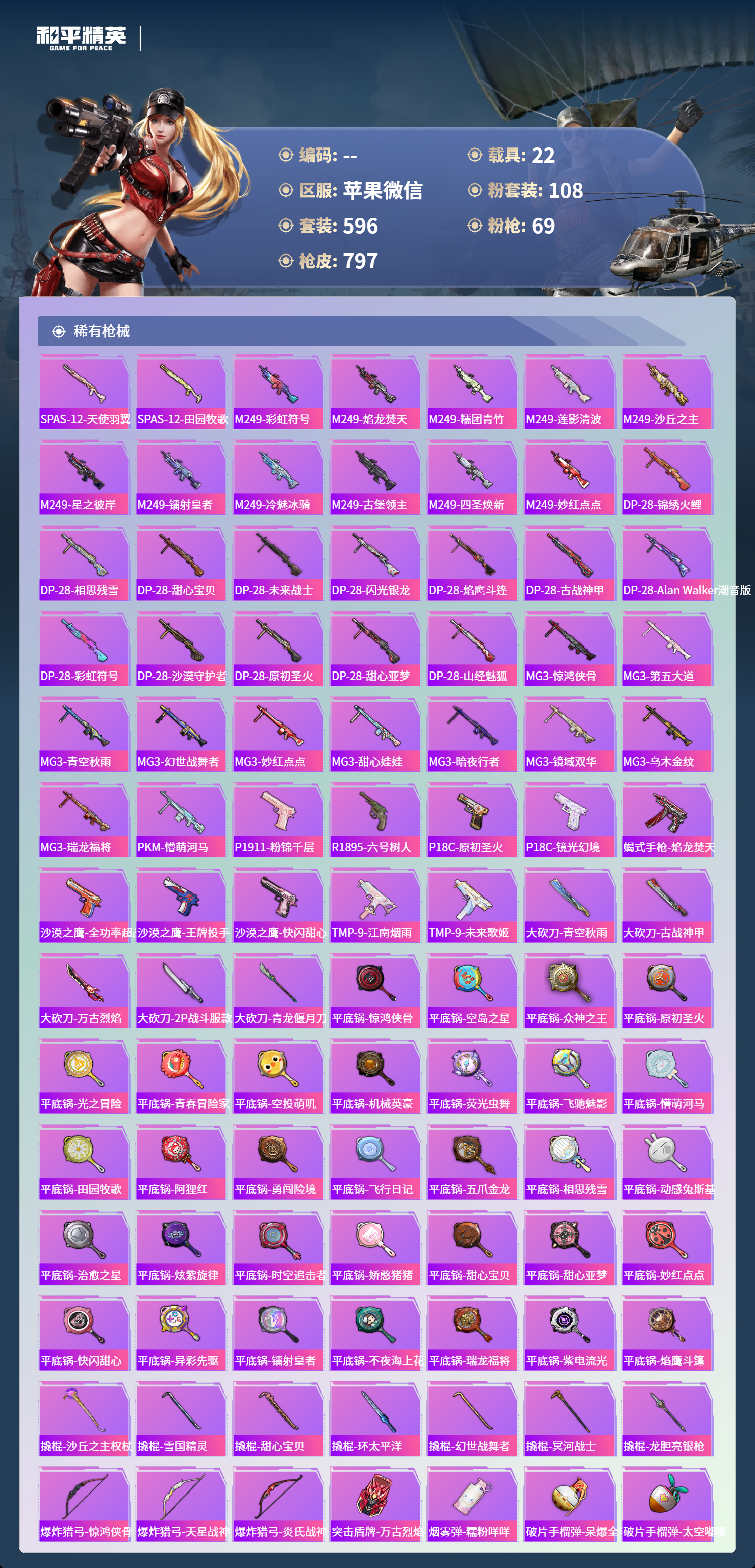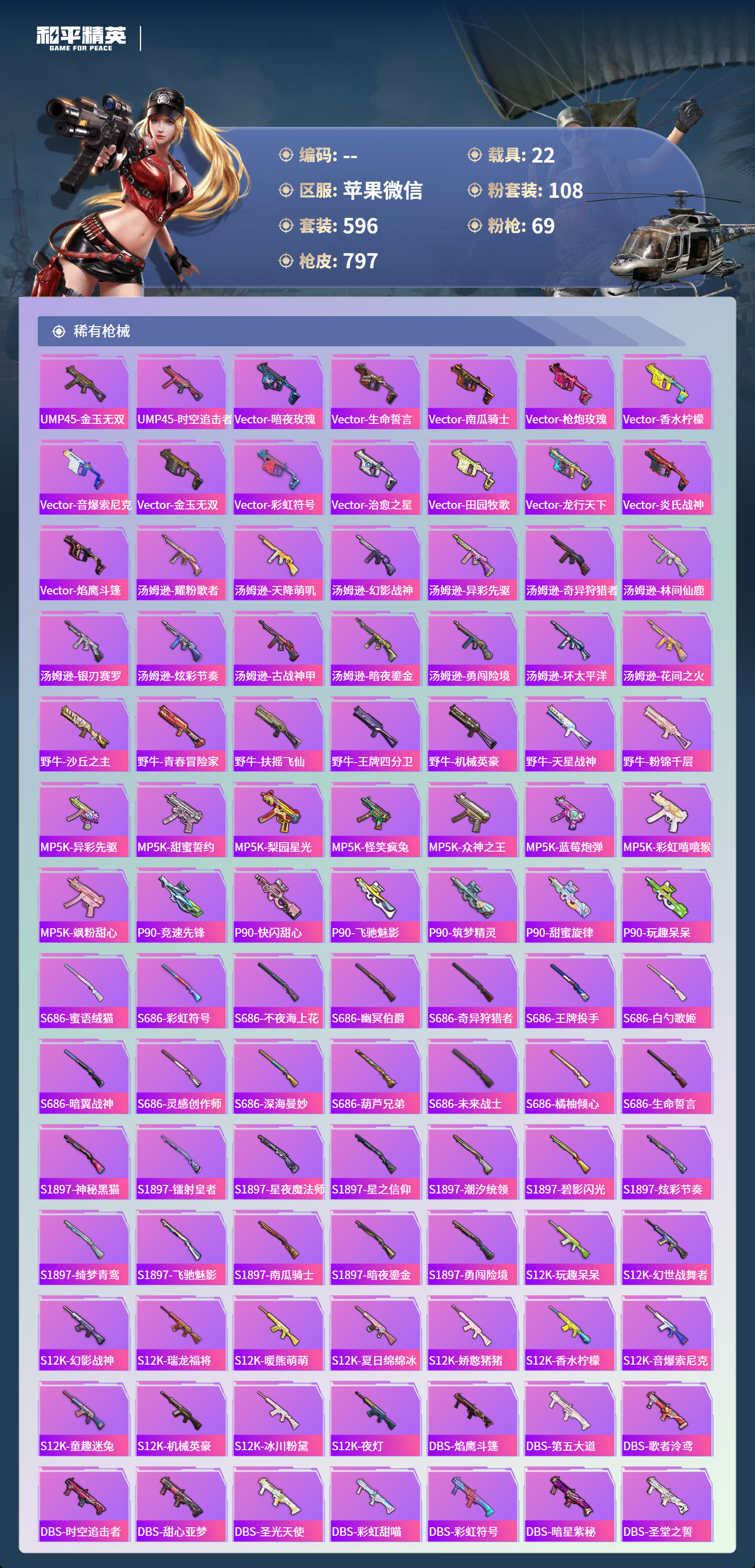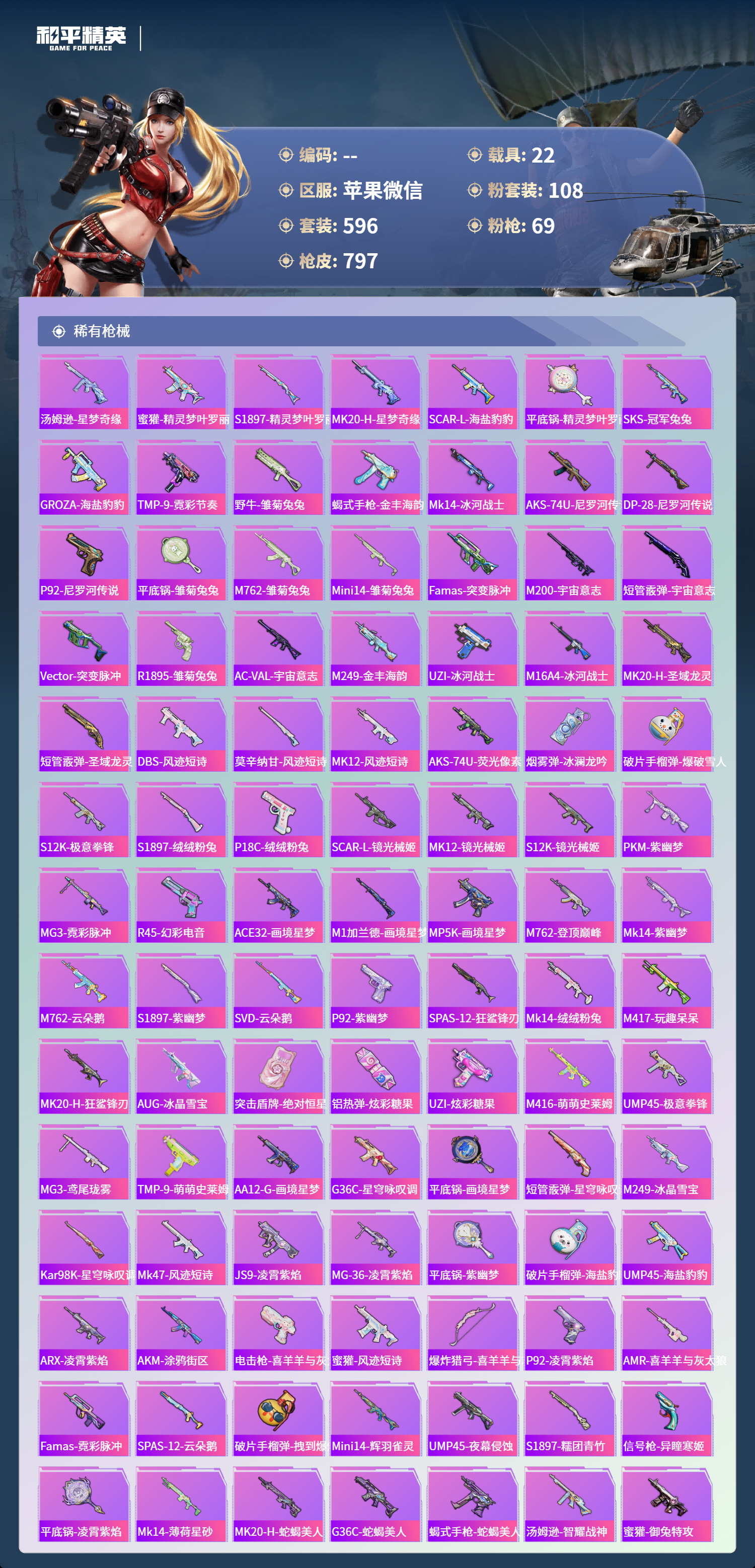 【791稀有枪械】AUG-星梦奇缘/9级,M416-至情至圣/9级,M416-墨龙九天/1级,SCAR-L-天蓬元帅/1级,SCAR-L-金蛇镇世/9级,SCAR-L-万古烈焰/3级,GROZA-精灵之光/1级,P90-魔童闹海,敖丙/1级,P90-沙丘之主/9级,UMP45-玉魂晶魄/1级,UMP45-宇宙意志/1级,Vector-最终圣卫者/1级,AKS-74U-无垠阁/9级,M200-梦海之灵/3级,Kar98K-圣域龙灵/1级,M24-镜域双华/1级,DP-28-金蝉行者/1级,M416-全功率超战/2级,M416-五爪金龙/2级,M416-心之恋语/1级,M416-暖熊萌萌/1级,AKM-炫紫旋律/2级,AKM-甜心宝贝/7级,SCAR-L-梦幻火箭/1级,SCAR-L-童趣迷兔/1级,M16A4-葫芦兄弟/5级,GROZA-香水柠檬/7级,AUG-妙趣可丽/1级,M762-甜蜜誓约/1级,M762-冷魅冰骑/7级,Kar98K-巳巳如意/5级,Kar98K-未来歌姬/5级,Kar98K-伏魔团/1级,M24-莲影清波/1级,M24-星之信仰/6级,AWM-花间之火/7级,AMR-鸢尾晶梦/7级,VSS-烈焰拳霸/1级,Mk14-福马献瑞/5级,SLR-暗夜玫瑰/1级,UZI-畅跳缤纷/5级,UMP45-相思残雪/1级,UMP45-雪国精灵/7级,Vector-环太平洋/1级,Vector-灵感创作师/1级,Vector-红伞翩翩/7级,P90-金丰海韵/1级,P90-甜蜜草莓/1级,SPAS-12-音爆索尼克/7级,M249-古战神甲/1级,M249-绝对恒星/7级,M249-彩虹甜喵/1级,DP-28-千金淑猫/7级,DP-28-豹影疾电/1级,DP-28-暗夜鎏金/1级,DP-28-扶摇飞仙/1级,MG3-洛神天依/7级,PKM-萌骑夺宝/2级,M417-第五大道/5级,ACE32-萌骑漫游/5级,MG-36-沧焰双生/5级,DBS-幻影飞狐/1级,AKS-74U-信仰神谕/1级,烟雾弹-猫咪绅士/4级,破片手榴弹-招财进宝/7级,破片手榴弹-粉粉猫爪/1级,燃烧瓶-薄荷可可/6级,平底锅-林间仙鹿/6级,AKS-74U-白蛇盈舞,MG3-梦海之灵,AC-VAL-梦海之灵,UZI-梦海之灵,QBZ-纯真浪花,AWM-纯真浪花,汤姆逊-纯真浪花,DBS-乌木金纹,AA12-G-纯真浪花,平底锅-纯真浪花,P1911-创世·救赎,Famas-墨龙九天,AMR-墨龙九天,SLR-墨龙九天,撬棍-朗基努斯之枪,突击盾牌-初号机,觉醒Ver.,汤姆逊-星梦奇缘,蜜獾-精灵梦叶罗丽,S1897-精灵梦叶罗丽,MK20-H-星梦奇缘,SCAR-L-海盐豹豹,平底锅-精灵梦叶罗丽,SKS-冠军兔兔,GROZA-海盐豹豹,TMP-9-霓彩节奏,野牛-雏菊兔兔,蝎式手枪-金丰海韵,Mk14-冰河战士,AKS-74U-尼罗河传说,DP-28-尼罗河传说,P92-尼罗河传说,平底锅-雏菊兔兔,M762-雏菊兔兔,Mini14-雏菊兔兔,Famas-突变脉冲,M200-宇宙意志,短管霰弹-宇宙意志,Vector-突变脉冲,R1895-雏菊兔兔,AC-VAL-宇宙意志,M249-金丰海韵,UZI-冰河战士,M16A4-冰河战士,MK20-H-乌木金纹,MK20-H-圣域龙灵,短管霰弹-圣域龙灵,DBS-风迹短诗,莫辛纳甘-风迹短诗,Win94-乌木金纹,MK12-风迹短诗,MK12-乌木金纹,AKS-74U-荧光像素,烟雾弹-冰澜龙吟,破片手榴弹-爆破雪人,S12K-极意拳锋,S1897-绒绒粉兔,P18C-绒绒粉兔,SCAR-L-镜光械姬,MK12-镜光械姬,S12K-镜光械姬,PKM-紫幽梦,MG3-霓彩脉冲,R45-幻彩电音,ACE32-画境星梦,M1加兰德-画境星梦,MP5K-画境星梦,M762-登顶巅峰,Mk14-紫幽梦,蜜獾-乌木金纹,M762-云朵鹅,S1897-紫幽梦,SVD-云朵鹅,P92-紫幽梦,SPAS-12-狂鲨锋刃,Mk14-绒绒粉兔,M417-玩趣呆呆,MK20-H-狂鲨锋刃,AUG-冰晶雪宝,突击盾牌-绝对恒星,铝热弹-炫彩糖果,UZI-炫彩糖果,M416-萌萌史莱姆,UMP45-极意拳锋,MG3-鸢尾珑雾,TMP-9-萌萌史莱姆,AA12-G-画境星梦,G36C-星穹咏叹调,平底锅-画境星梦,短管霰弹-星穹咏叹调,M249-冰晶雪宝,Kar98K-星穹咏叹调,Mk47-风迹短诗,JS9-凌霄紫焰,MG-36-凌霄紫焰,平底锅-紫幽梦,破片手榴弹-海盐豹豹,UMP45-海盐豹豹,ARX-凌霄紫焰,AKS-74U-乌木金纹,AKM-涂鸦街区,电击枪-喜羊羊与灰太狼,蜜獾-风迹短诗,爆炸猎弓-喜羊羊与灰太狼,P92-凌霄紫焰,AMR-喜羊羊与灰太狼,Famas-乌木金纹,Famas-霓彩脉冲,SPAS-12-云朵鹅,破片手榴弹-拽到爆炸,Mini14-辉羽雀灵,UMP45-夜幕侵蚀,S1897-糯团青竹,信号枪-异瞳寒姬,平底锅-凌霄紫焰,Mk14-薄荷星砂,MK20-H-蛇蝎美人,G36C-蛇蝎美人,蝎式手枪-蛇蝎美人,汤姆逊-智耀战神,蜜獾-御兔特攻,DP-28-御兔特攻,沙漠之鹰-云朵鹅,烟雾弹-冰氧夏日,MG-36-薄荷星砂,SCAR-L-绿洲时空,PKM-荧光像素,大砍刀-云朵鹅,PKM-啾咪啾咪,SLR-圣穹绘梦,UMP45-圣穹绘梦,沙漠之鹰-圣穹绘梦,AUG-绝对恒星,M24-天降萌叽,M200-爆裂游戏,撬棍-双重狂想,GROZA-荧海星豚,SLR-霓彩脉冲,平底锅-属我最6,AC-VAL-六号稻草人,SCAR-L-彩虹符号,M200-六号稻草人,蝎式手枪-六号稻草人,蜜獾-冰澜龙吟,大砍刀-冰澜龙吟,M16A4-最终圣卫者,S12K-霓彩脉冲,Kar98k-最终圣卫者,野牛-最终圣卫者,AKM-霓彩脉冲,SKS-圣域龙灵,M416-红色方程式,M416-神秘黑猫,M416-潮汐统领,M416-乌木金纹,M416-夜灯,M416-紫翼圣骑,M416-糯团青竹,M416-暗夜行者,M416-葫芦兄弟,M416-黄金狮王,M416-快乐主宰,M416-南瓜骑士,M416-彩虹嘻嘻猴,AKM-筑梦精灵,AKM-环太平洋,AKM-影袭,AKM-星兔领航员,AKM-王牌投手,AKM-锦绣火鲤,AKM-夜灯,AKM-四圣焕新,AKM-奇异狩猎者,AKM-生命誓言,AKM-星之彼岸,AKM-彩虹符号,AKM-龙的传人,AKM-荒野猎神,AKM-2P战斗服款,AKM-灼热熔岩,AKM-虎虎生威,AKM-星之信仰,AKM-萌趣颜团子,AKM-阿狸红,AKM-霓虹街区,AKM-沙漠守护者,SCAR-L-玉兔迎春,SCAR-L-暗夜玫瑰,SCAR-L-甜蜜誓约,SCAR-L-银碳小老虎,SCAR-L-王牌四分卫,SCAR-L-金风玉露,SCAR-L-夏日绵绵冰,SCAR-L-怪兽之王,SCAR-L-扶摇飞仙,SCAR-L-凝视深渊,SCAR-L-致命红樱,SCAR-L-夜灯,SCAR-L-炫彩节奏,SCAR-L-粉锦千层,SCAR-L-生命誓言,M16A4-南瓜骑士,M16A4-机械英豪,M16A4-快乐主宰,M16A4-红色方程式,M16A4-蓝色火焰,M16A4-冥河战士,M16A4-幻世战舞者,M16A4-凝视深渊,M16A4-甜心亚梦,M16A4-乌木金纹,M16A4-夜灯,M16A4-莲影清波,GROZA-乌木金纹,GROZA-异彩先驱,GROZA-影袭,GROZA-田园牧歌,GROZA-紫翼圣骑,GROZA-懵萌河马,GROZA-彩虹符号,GROZA-林