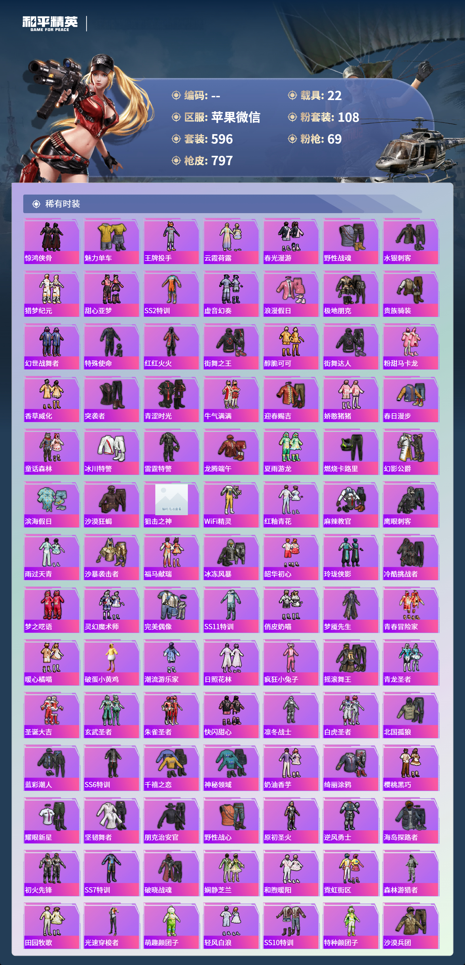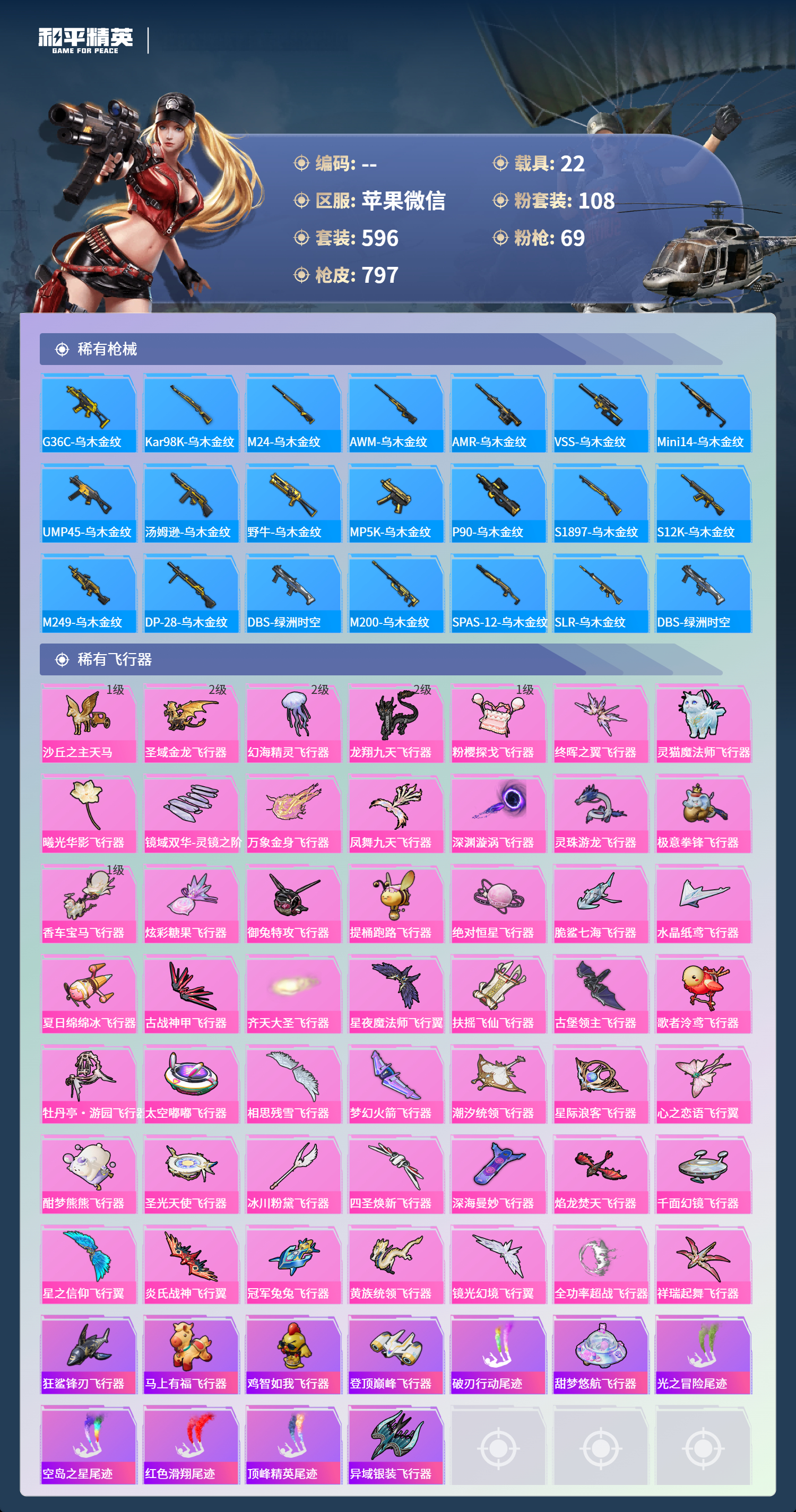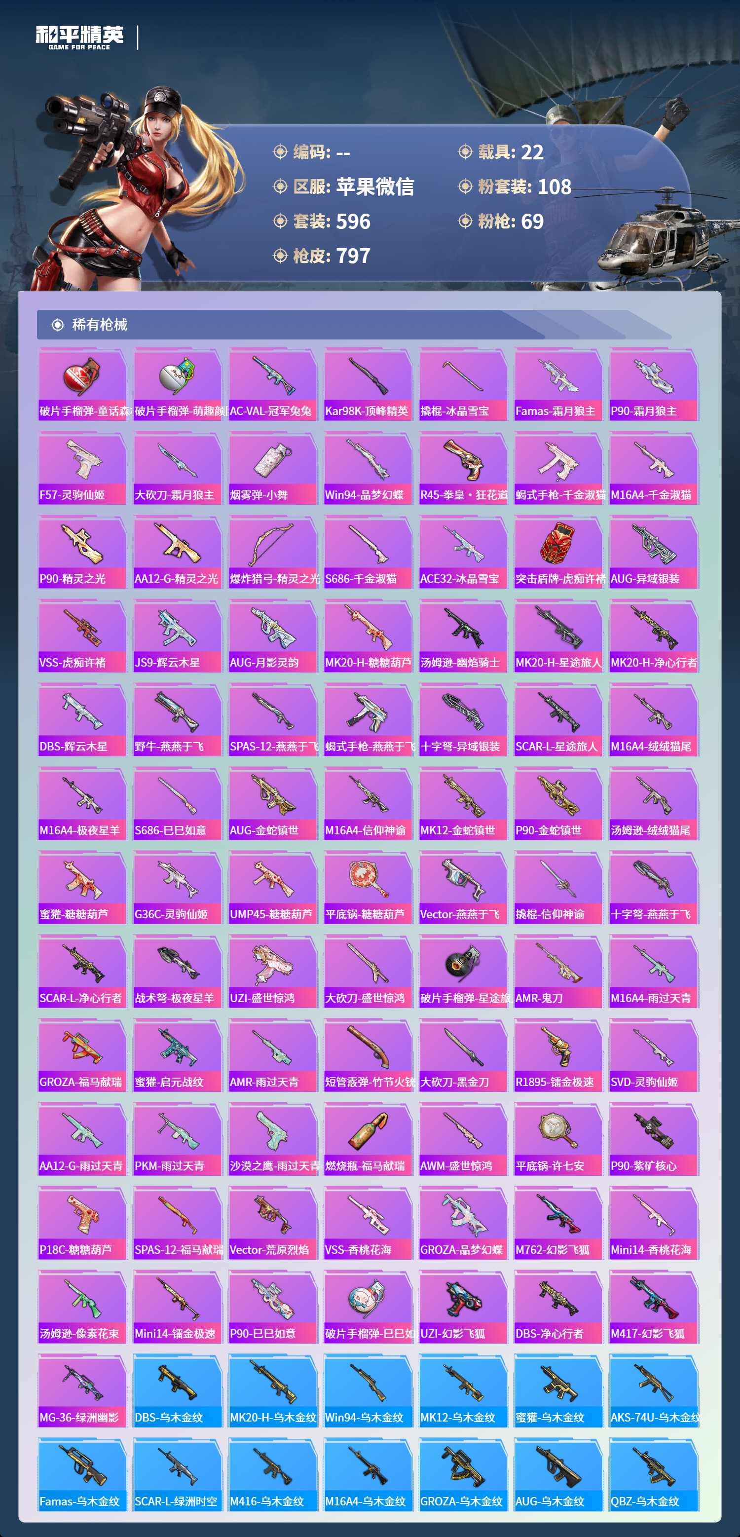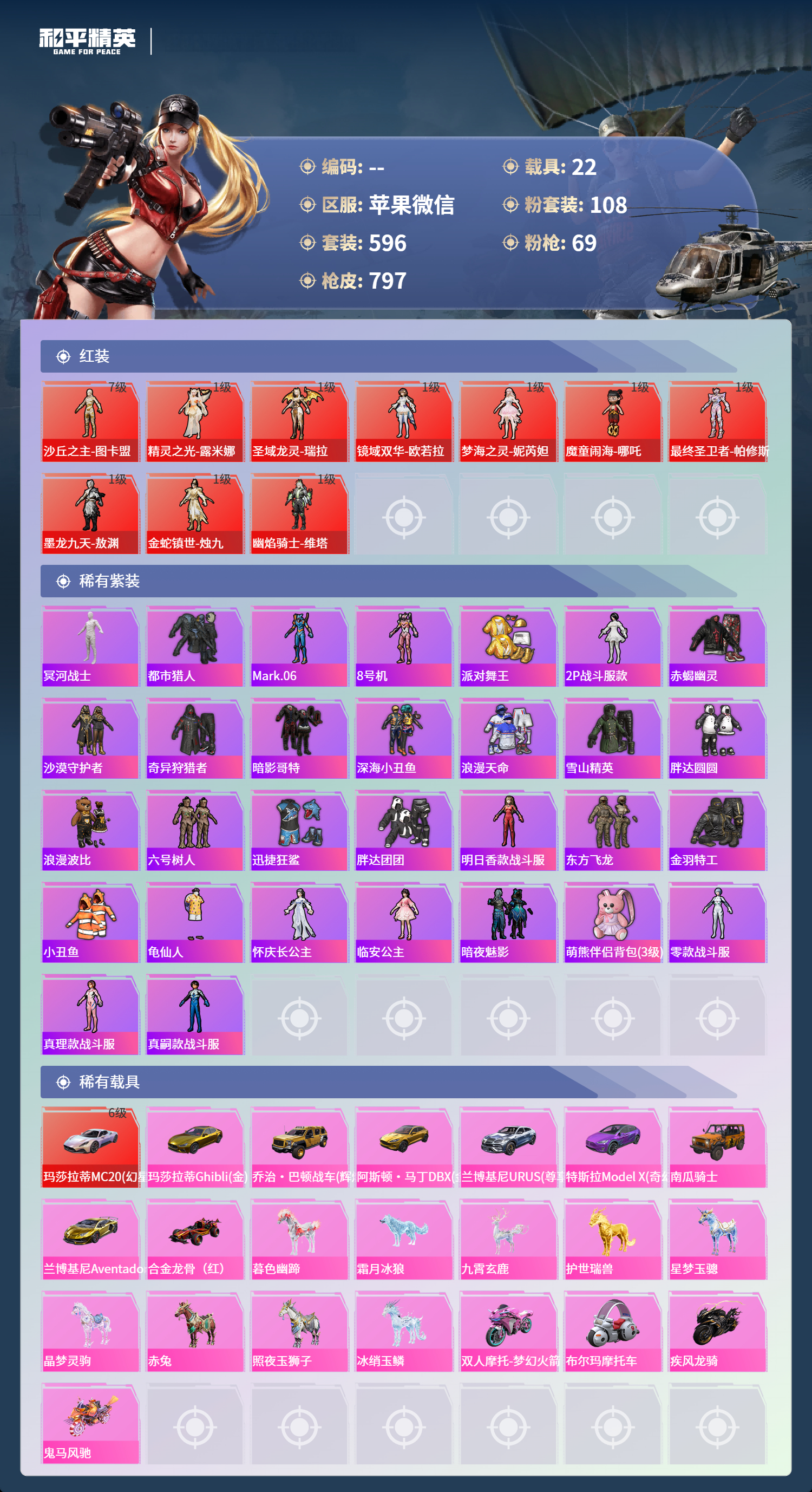 PX_2550114-苹果微信-36王牌印记-有战神框-11红装-108粉装-69特效枪-22载具-热力值-596套装-797枪皮-5卓越印记-2传奇印记