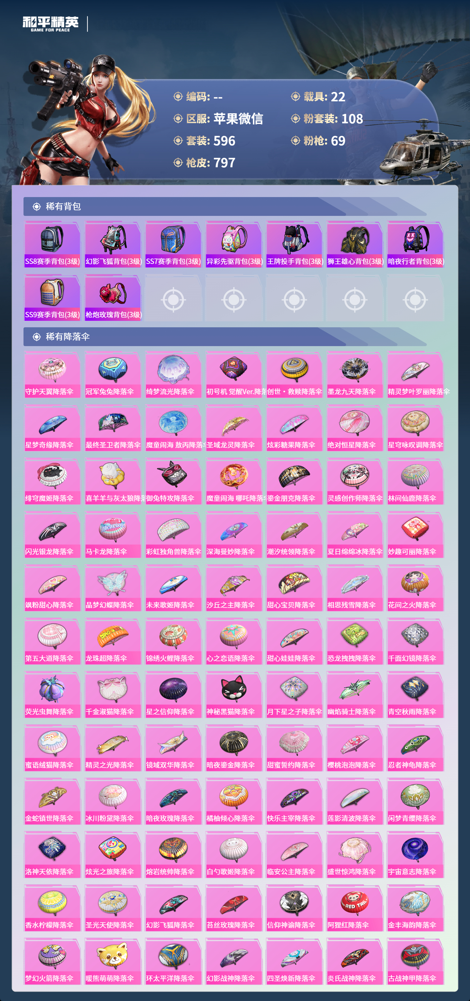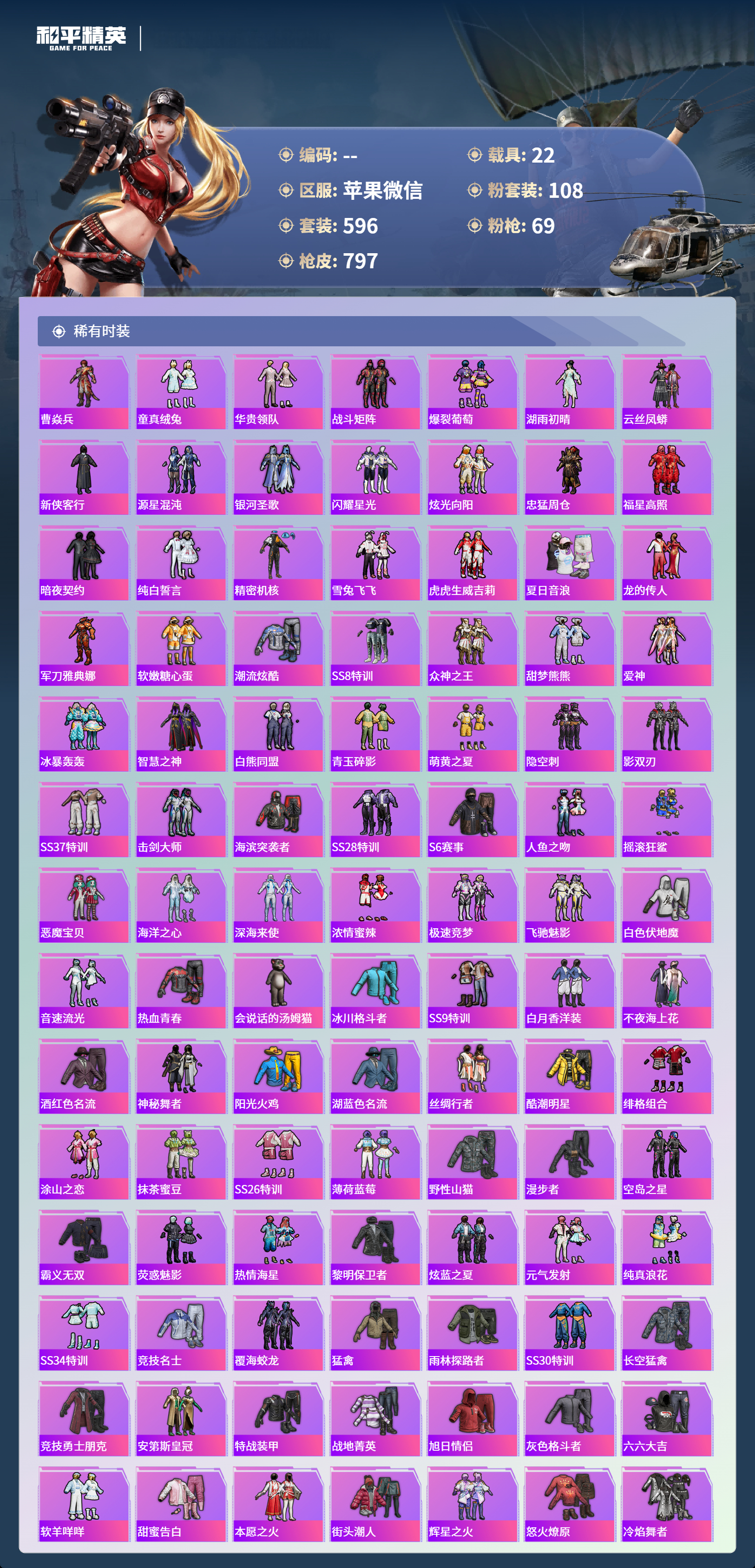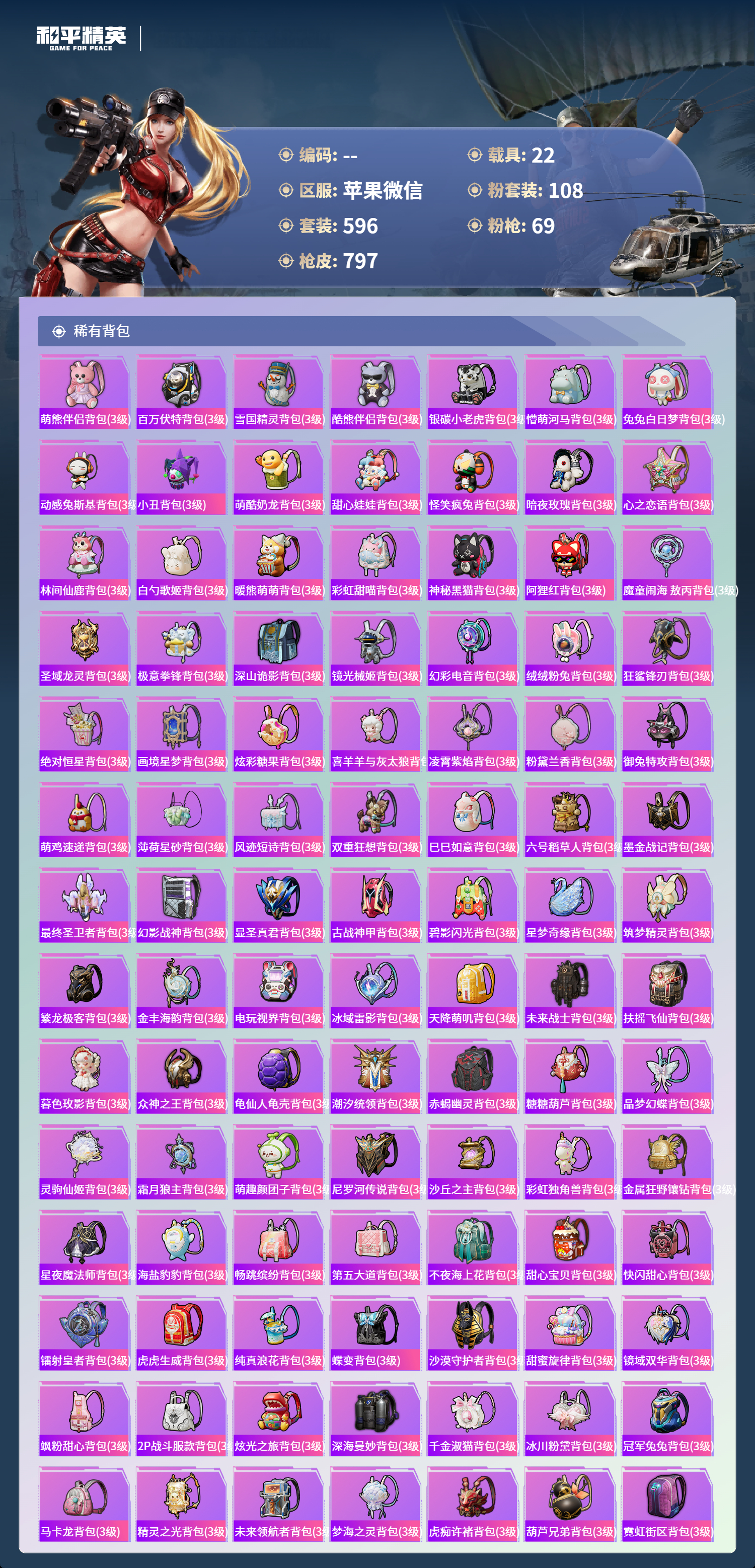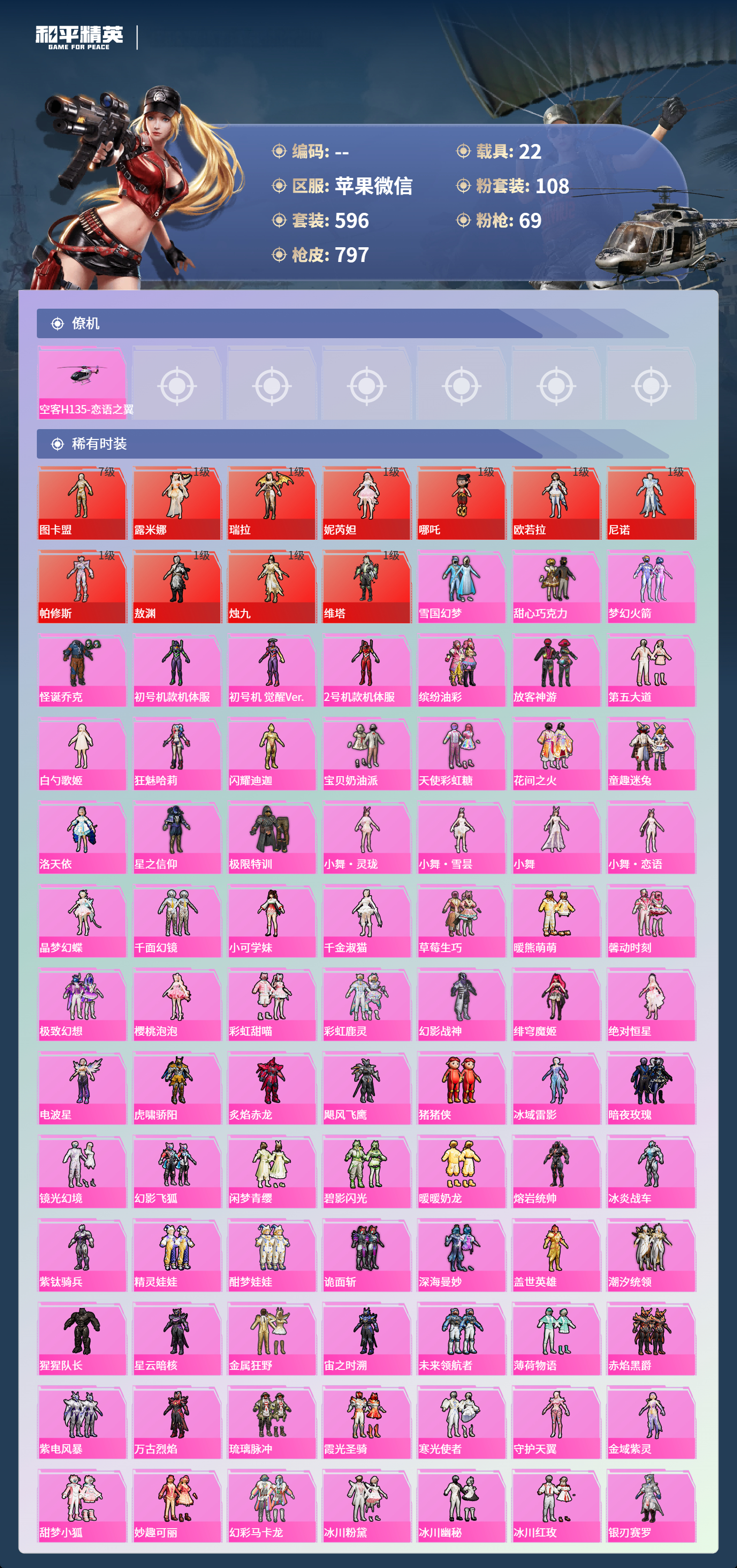 PX_2550114-苹果微信-36王牌印记-有战神框-11红装-108粉装-69特效枪-22载具-热力值-596套装-797枪皮-5卓越印记-2传奇印记