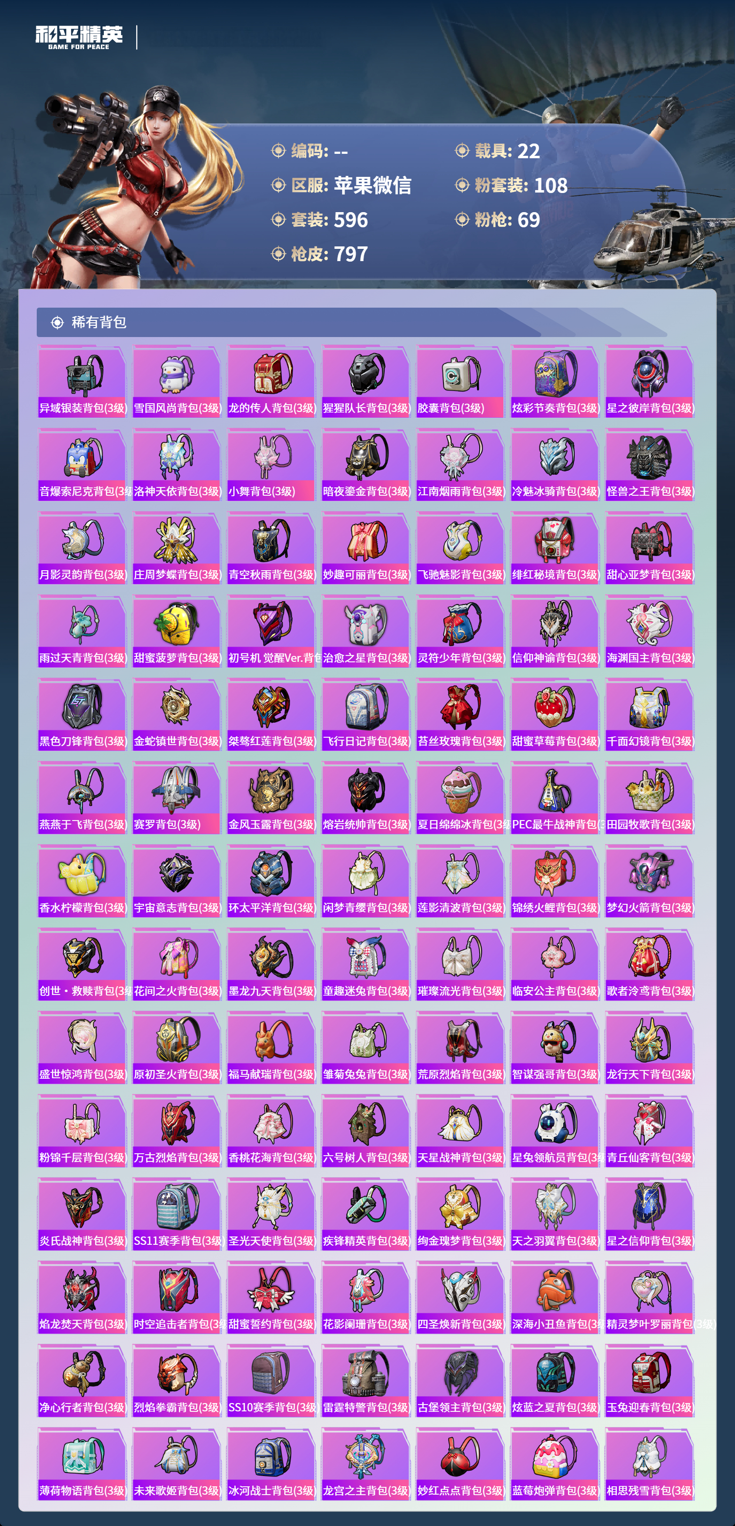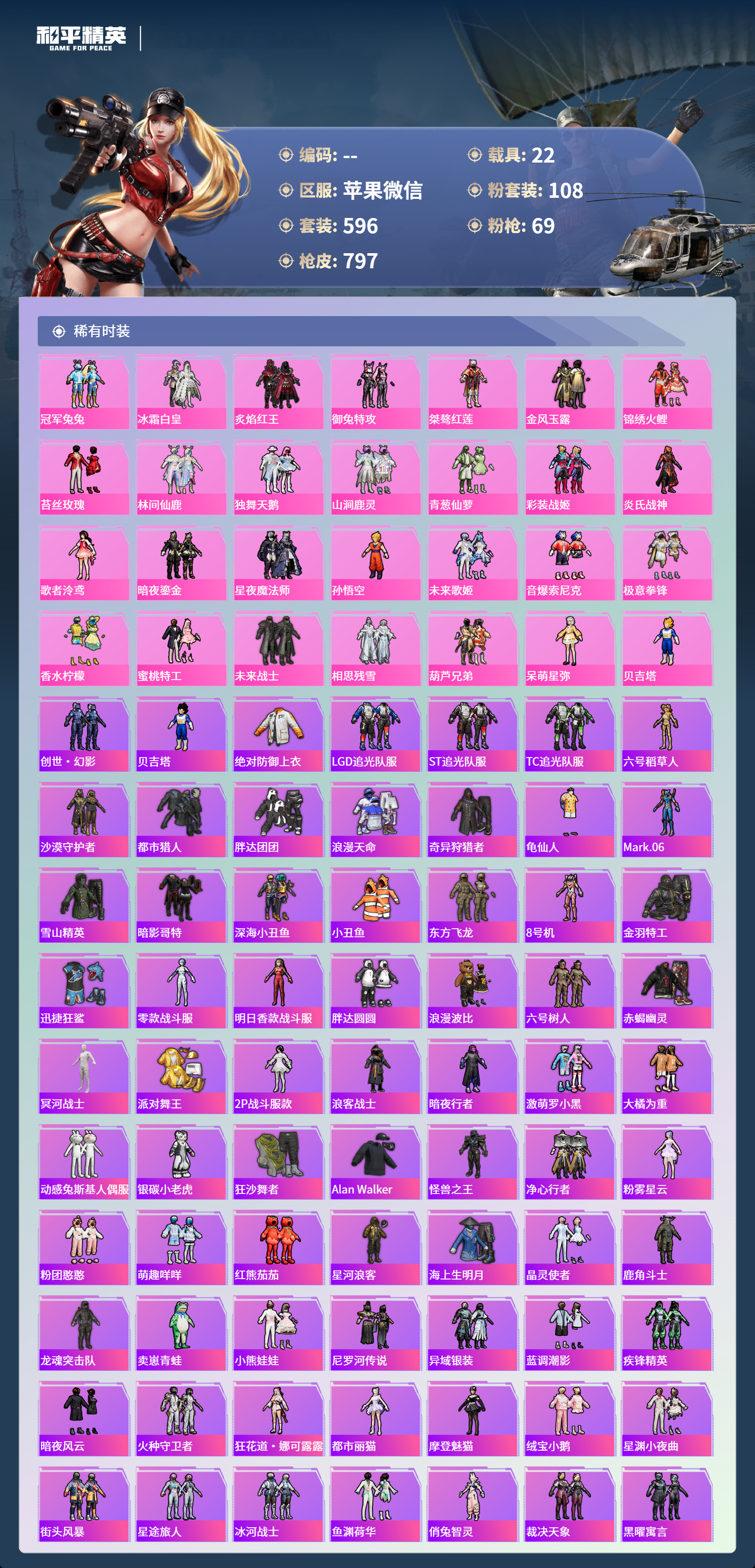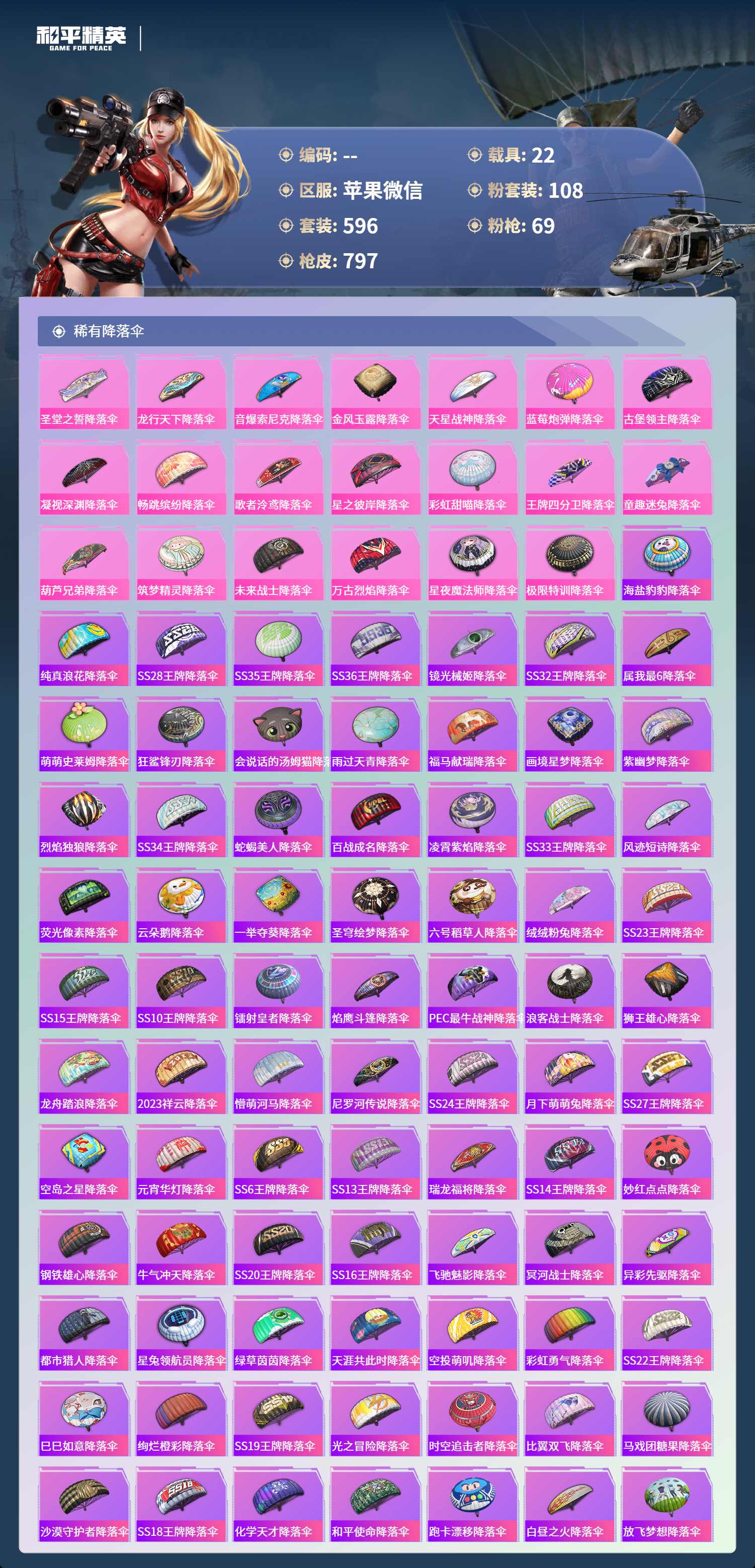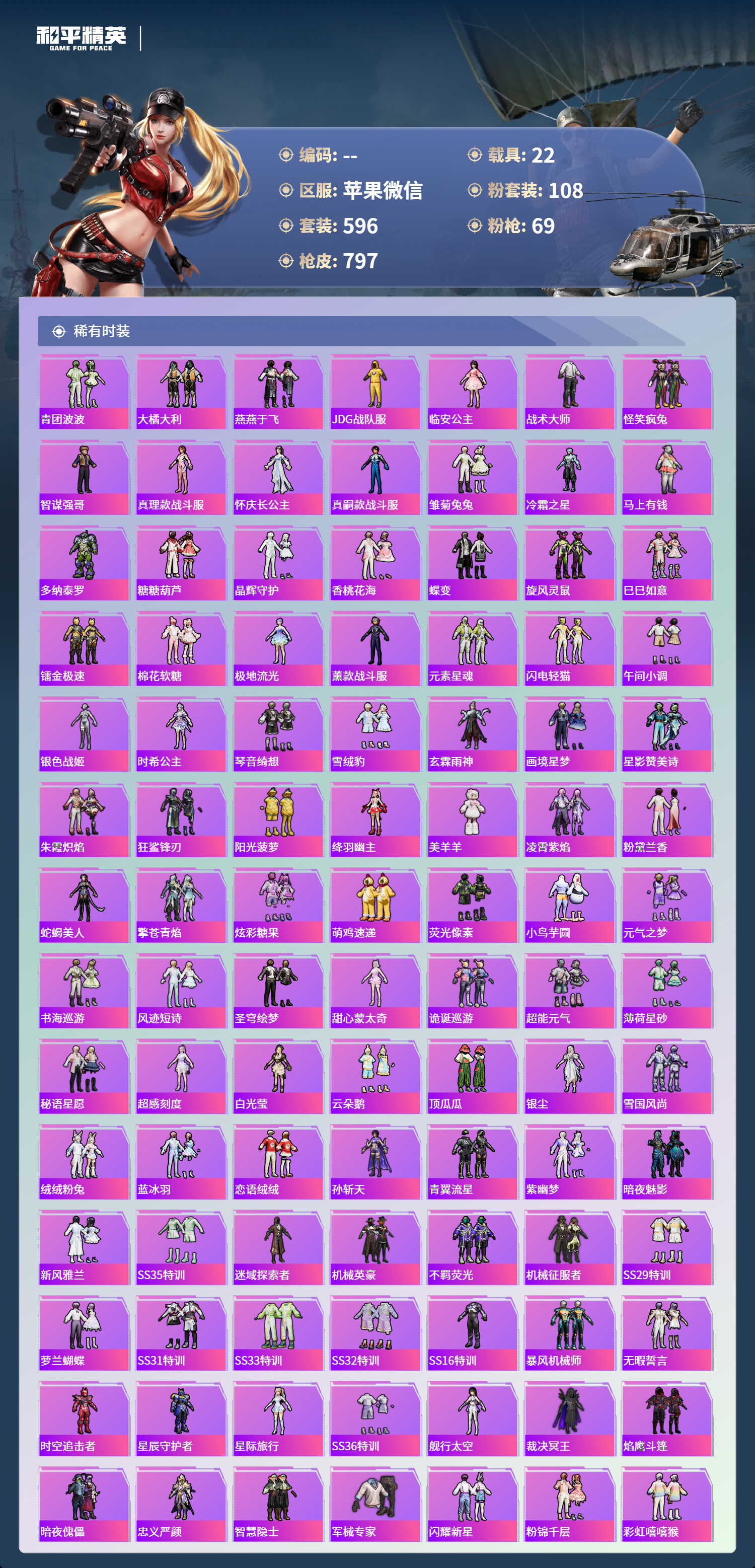 PX_2550114-苹果微信-36王牌印记-有战神框-11红装-108粉装-69特效枪-22载具-热力值-596套装-797枪皮-5卓越印记-2传奇印记