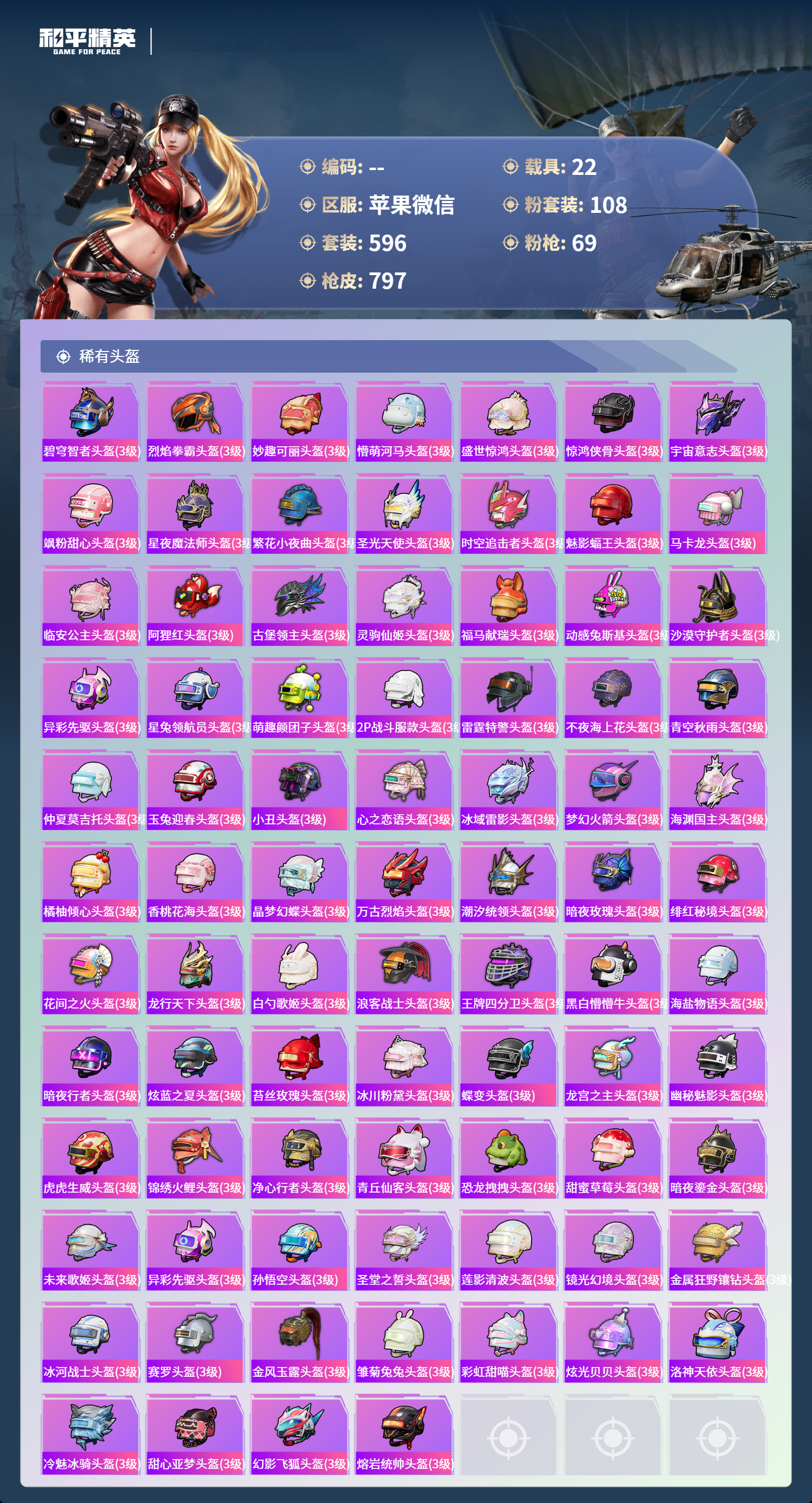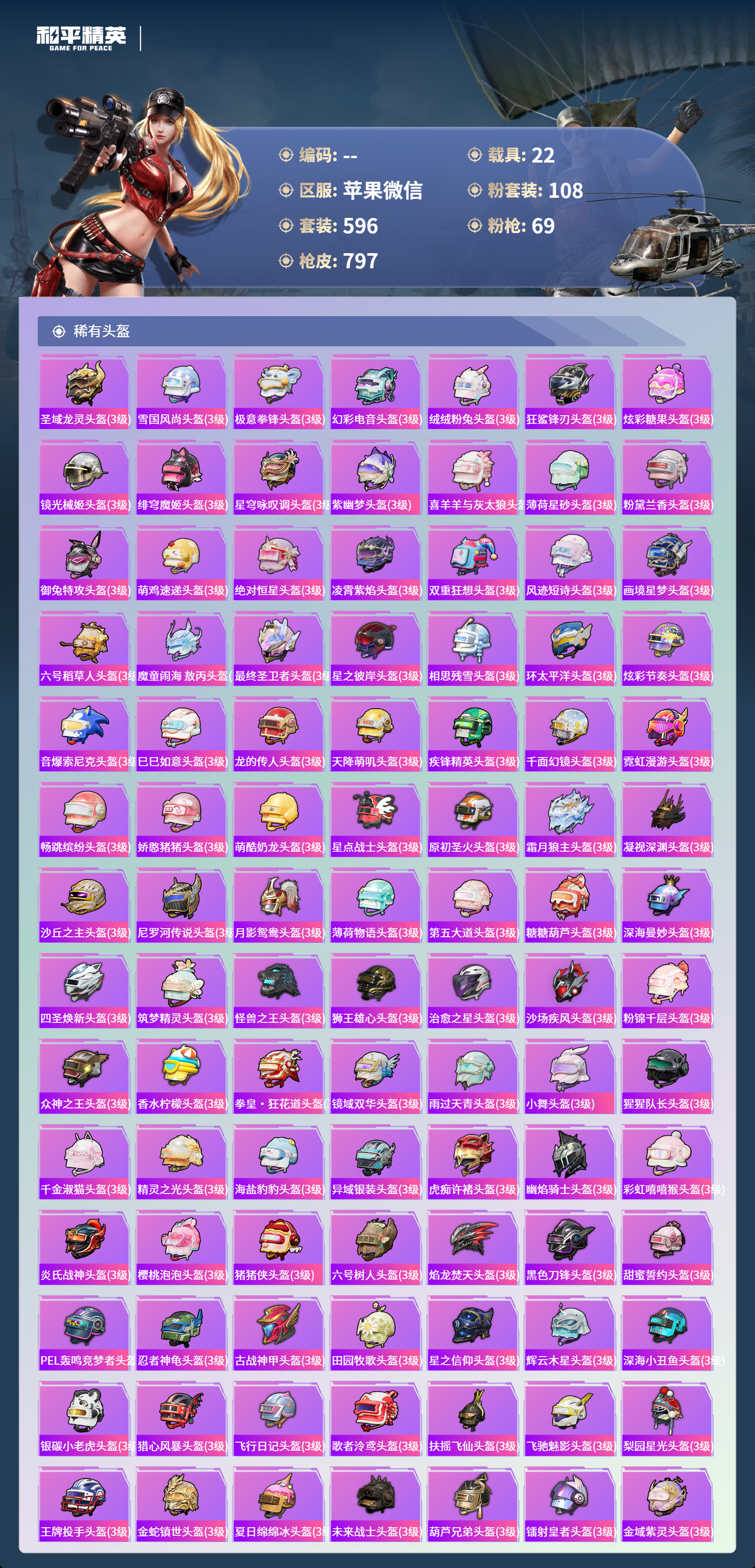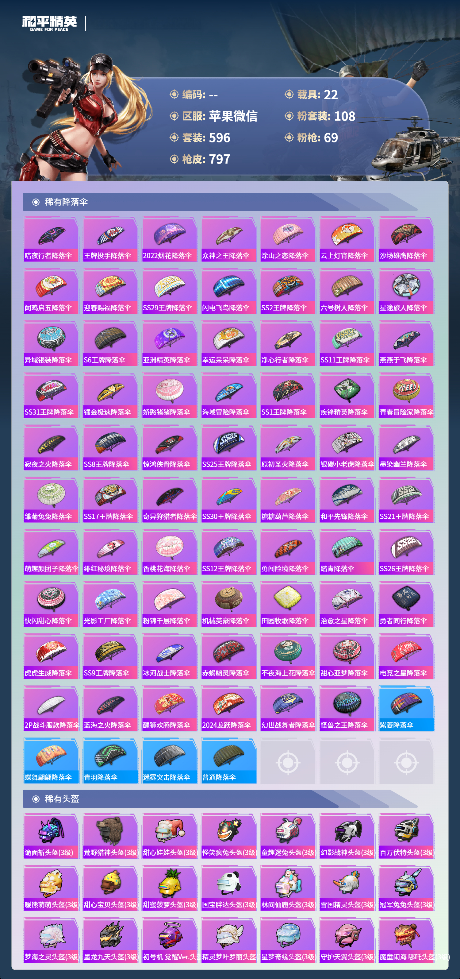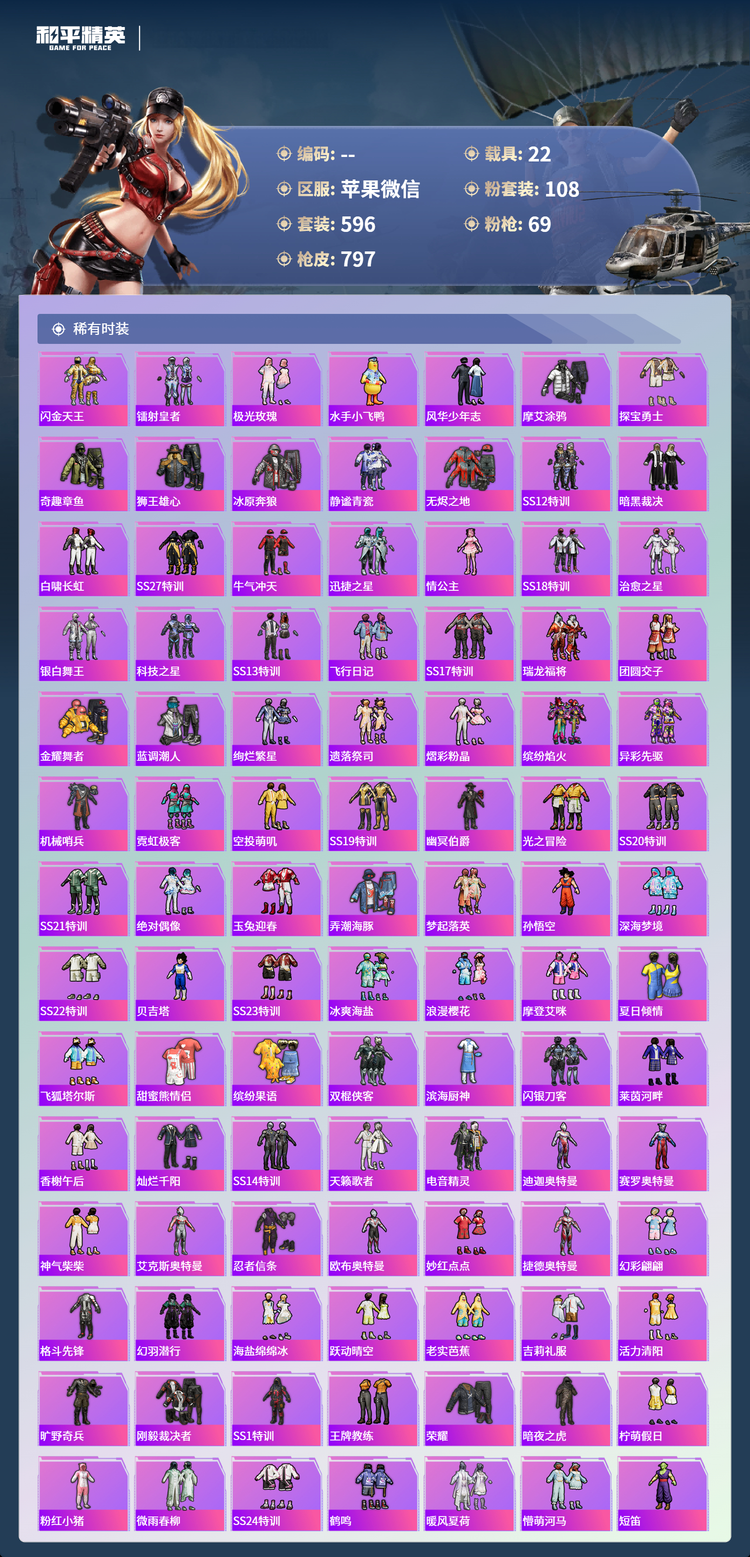 PX_2550114-苹果微信-36王牌印记-有战神框-11红装-108粉装-69特效枪-22载具-热力值-596套装-797枪皮-5卓越印记-2传奇印记