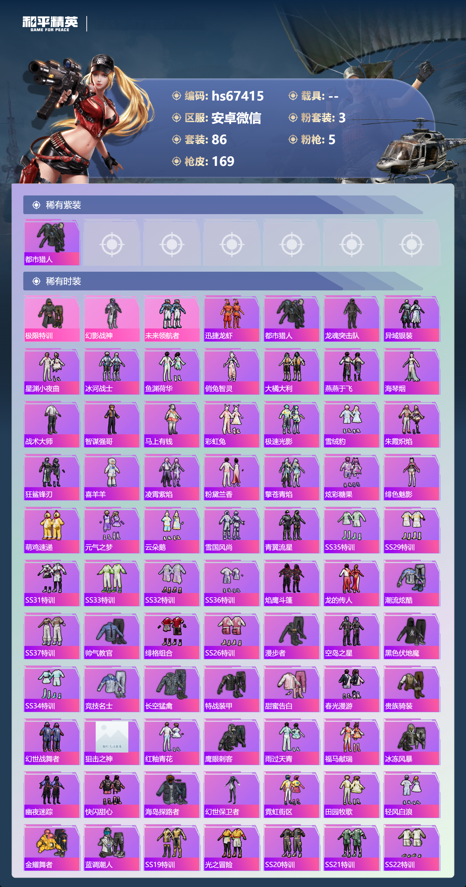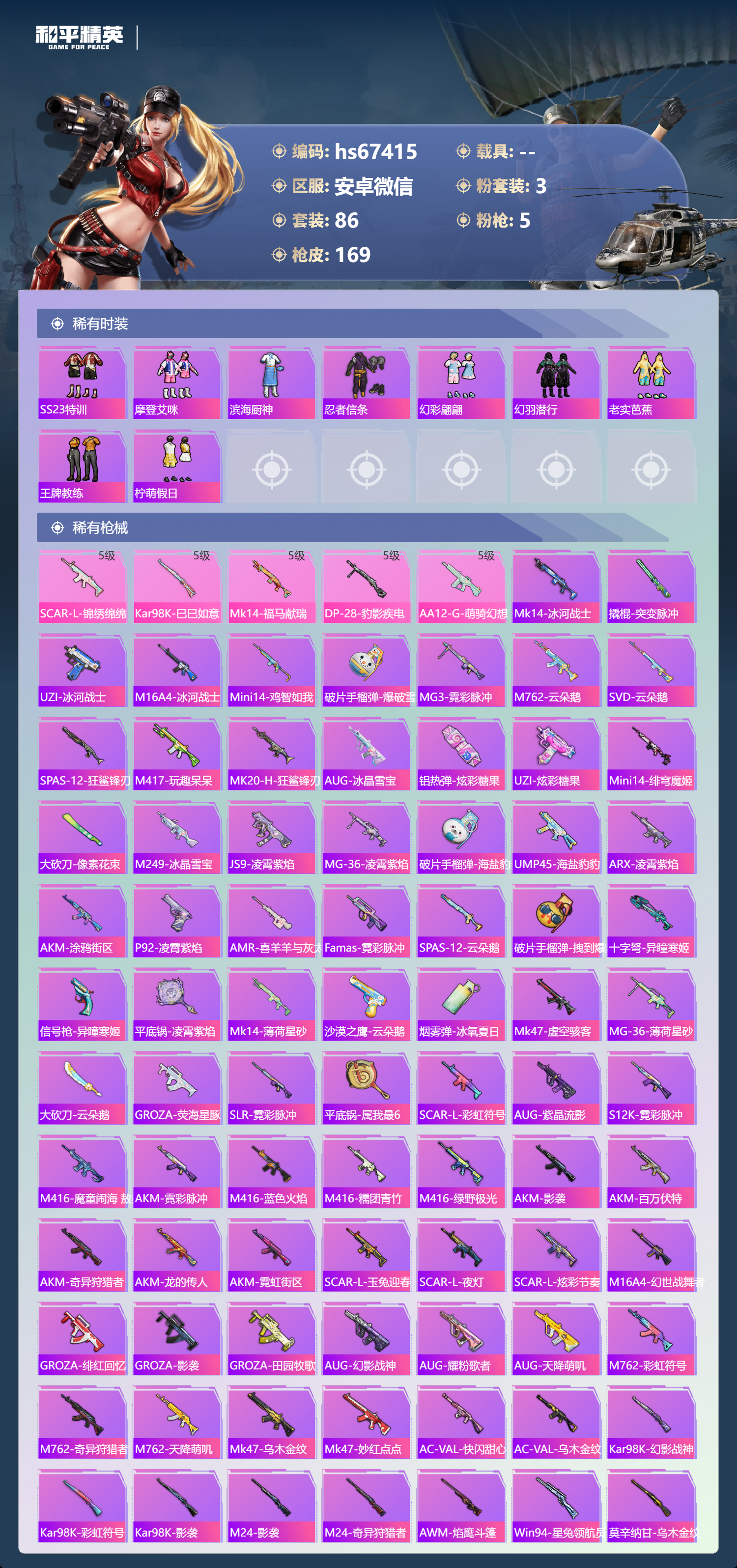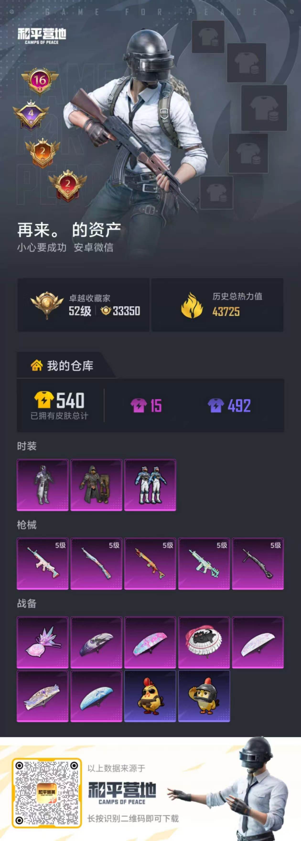PX_2550102-,安卓微信-16王牌印记-3粉装-5特效枪-43725热力值-86套装-169枪皮-4卓越印记-2传奇印记