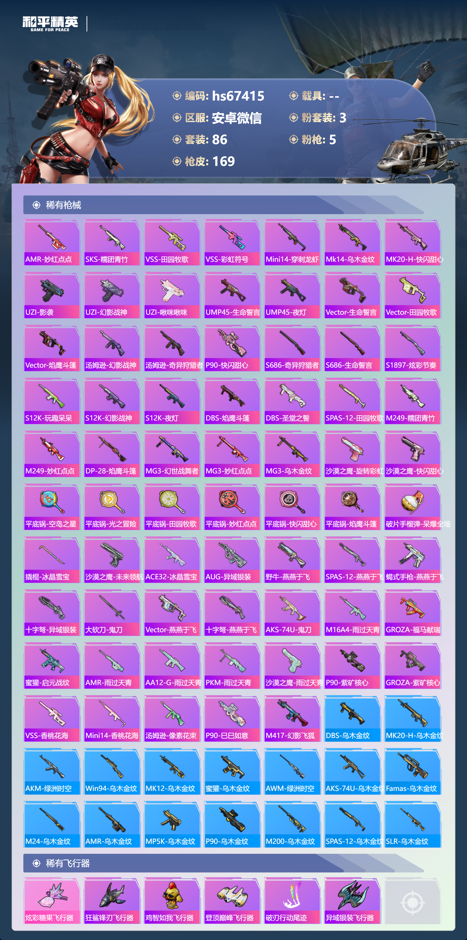 【168稀有枪械】SCAR-L-锦绣绵绵/5级,Kar98K-巳巳如意/5级,Mk14-福马献瑞/5级,DP-28-豹影疾电/5级,AA12-G-萌骑幻想/5级,DBS-乌木金纹,Mk14-冰河战士,撬棍-突变脉冲,UZI-冰河战士,M16A4-冰河战士,MK20-H-乌木金纹,Mini14-鸡智如我,AKM-绿洲时空,Win94-乌木金纹,MK12-乌木金纹,破片手榴弹-爆破雪人,MG3-霓彩脉冲,蜜獾-乌木金纹,M762-云朵鹅,SVD-云朵鹅,AWM-绿洲时空,SPAS-12-狂鲨锋刃,M417-玩趣呆呆,MK20-H-狂鲨锋刃,AUG-冰晶雪宝,铝热弹-炫彩糖果,UZI-炫彩糖果,Mini14-绯穹魔姬,大砍刀-像素花束,M249-冰晶雪宝,JS9-凌霄紫焰,MG-36-凌霄紫焰,破片手榴弹-海盐豹豹,UMP45-海盐豹豹,ARX-凌霄紫焰,AKS-74U-乌木金纹,AKM-涂鸦街区,P92-凌霄紫焰,AMR-喜羊羊与灰太狼,Famas-乌木金纹,Famas-霓彩脉冲,SPAS-12-云朵鹅,破片手榴弹-拽到爆炸,十字弩-异瞳寒姬,信号枪-异瞳寒姬,平底锅-凌霄紫焰,Mk14-薄荷星砂,沙漠之鹰-云朵鹅,烟雾弹-冰氧夏日,Mk47-虚空骇客,MG-36-薄荷星砂,大砍刀-云朵鹅,GROZA-荧海星豚,SLR-霓彩脉冲,平底锅-属我最6,SCAR-L-彩虹符号,AUG-紫晶流影,S12K-霓彩脉冲,M416-魔童闹海,敖闰,AKM-霓彩脉冲,M416-蓝色火焰,M416-糯团青竹,M416-绿野极光,AKM-影袭,AKM-百万伏特,AKM-奇异狩猎者,AKM-龙的传人,AKM-霓虹街区,SCAR-L-玉兔迎春,SCAR-L-夜灯,SCAR-L-炫彩节奏,M16A4-幻世战舞者,GROZA-绯红回忆,GROZA-影袭,GROZA-田园牧歌,AUG-幻影战神,AUG-耀粉歌者,AUG-天降萌叽,M762-彩虹符号,M762-奇异狩猎者,M762-天降萌叽,Mk47-乌木金纹,Mk47-妙红点点,AC-VAL-快闪甜心,AC-VAL-乌木金纹,Kar98K-幻影战神,Kar98K-彩虹符号,Kar98K-影袭,M24-乌木金纹,M24-影袭,M24-奇异狩猎者,AWM-焰鹰斗篷,Win94-星兔领航员,莫辛纳甘-乌木金纹,AMR-乌木金纹,AMR-妙红点点,SKS-糯团青竹,VSS-田园牧歌,VSS-彩虹符号,Mini14-穿刺龙虾,Mk14-乌木金纹,MK20-H-快闪甜心,UZI-影袭,UZI-幻影战神,UZI-啾咪啾咪,UMP45-生命誓言,UMP45-夜灯,Vector-生命誓言,Vector-田园牧歌,Vector-焰鹰斗篷,汤姆逊-幻影战神,汤姆逊-奇异狩猎者,MP5K-乌木金纹,P90-乌木金纹,P90-快闪甜心,S686-奇异狩猎者,S686-生命誓言,S1897-炫彩节奏,S12K-玩趣呆呆,S12K-幻影战神,S12K-夜灯,DBS-焰鹰斗篷,DBS-圣堂之誓,SPAS-12-田园牧歌,M249-糯团青竹,M249-妙红点点,DP-28-焰鹰斗篷,MG3-幻世战舞者,MG3-妙红点点,MG3-乌木金纹,沙漠之鹰-旋转彩虹,沙漠之鹰-快闪甜心,平底锅-空岛之星,平底锅-光之冒险,平底锅-田园牧歌,平底锅-妙红点点,平底锅-快闪甜心,平底锅-焰鹰斗篷,破片手榴弹-呆爆全场,撬棍-冰晶雪宝,沙漠之鹰-未来领航者,ACE32-冰晶雪宝,AUG-异域银装,野牛-燕燕于飞,M200-乌木金纹,SPAS-12-燕燕于飞,蝎式手枪-燕燕于飞,十字弩-异域银装,大砍刀-鬼刀,SPAS-12-乌木金纹,Vector-燕燕于飞,十字弩-燕燕于飞,AKS-74U-鬼刀,M16A4-雨过天青,GROZA-福马献瑞,蜜獾-启元战纹,AMR-雨过天青,SLR-乌木金纹,AA12-G-雨过天青,PKM-雨过天青,沙漠之鹰-雨过天青,P90-紫矿核心,GROZA-紫矿核心,VSS-香桃花海,Mini14-香桃花海,汤姆逊-像素花束,P90-巳巳如意,M417-幻影飞狐