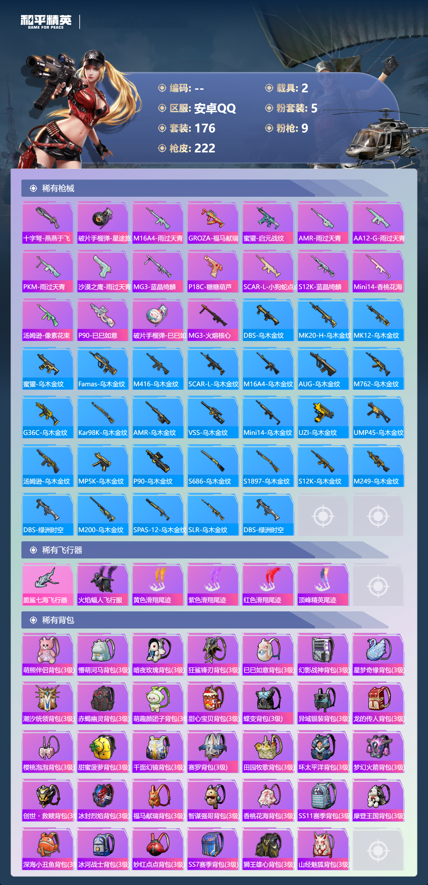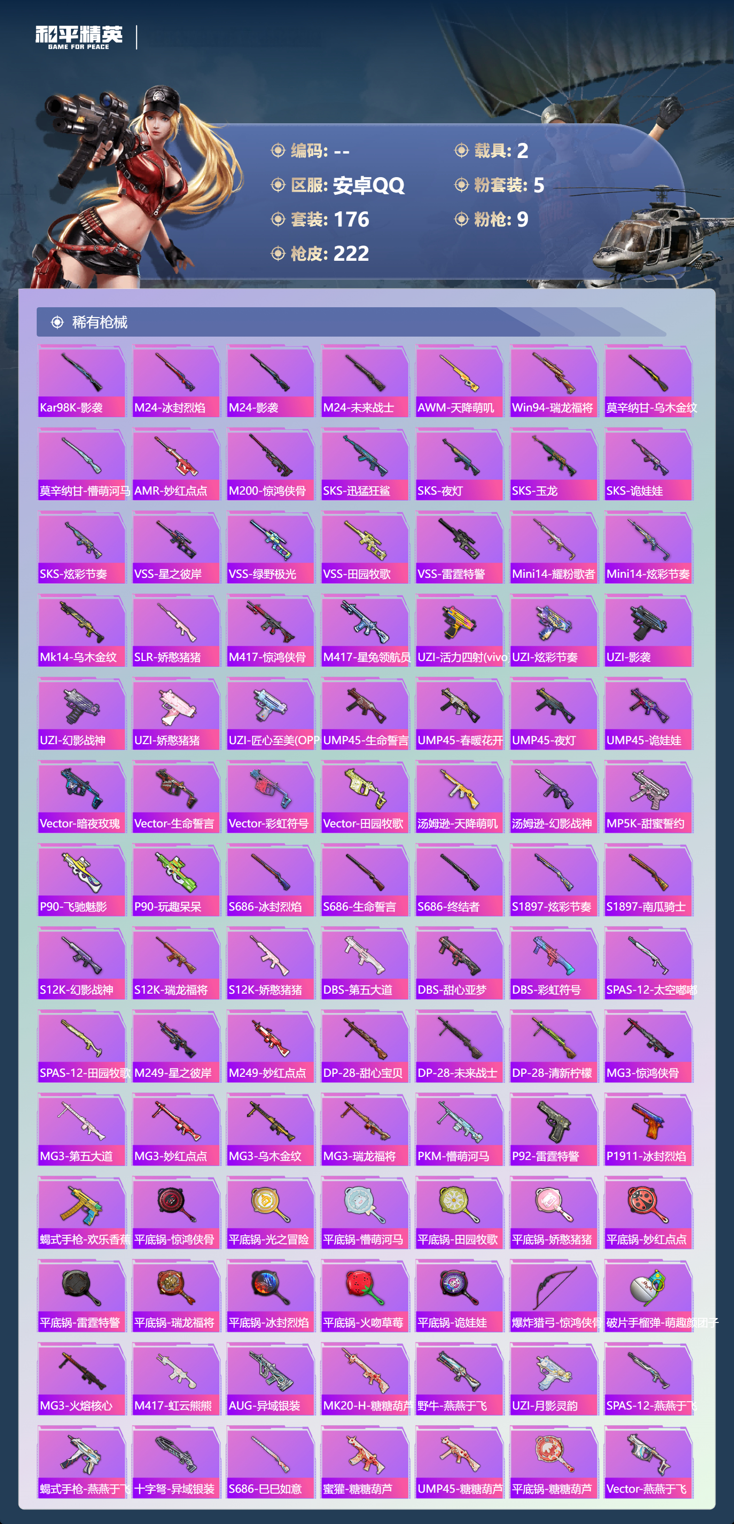 【222稀有枪械】M416-风花雪月/6级,M416-电玩时刻/5级,SCAR-L-青春物语/7级,AUG-许七安/5级,M762-甜蜜誓约/7级,M762-鬼刀/1级,Kar98K-巳巳如意/5级,Mk14-福马献瑞/3级,UMP45-萌骑冒险/3级,QBZ-纯真浪花,AWM-纯真浪花,汤姆逊-纯真浪花,DBS-乌木金纹,AA12-G-纯真浪花,平底锅-纯真浪花,Famas-墨龙九天,汤姆逊-星梦奇缘,S1897-精灵梦叶罗丽,MK20-H-星梦奇缘,SCAR-L-海盐豹豹,SLR-金丰海韵,Mk14-冰河战士,M416-极冰使者,UZI-冰河战士,M16A4-冰河战士,MK20-H-乌木金纹,MK12-乌木金纹,G36C-桃粉嫣然,蜜獾-乌木金纹,ARX-像素花束,大砍刀-像素花束,Kar98K-星穹咏叹调,Famas-乌木金纹,S1897-糯团青竹,汤姆逊-智耀战神,PKM-啾咪啾咪,MG3-青瓷战姬,AKM-霓彩脉冲,M416-红色方程式,M416-乌木金纹,M416-蓝色火焰,M416-动感兔斯基,M416-黄金狮王,M416-摩登王国,AKM-影袭,AKM-墨染幽兰,AKM-夜灯,AKM-缤纷海域,AKM-春暖花开,AKM-冰凉西瓜,AKM-龙的传人,AKM-虎虎生威,AKM-萌趣颜团子,SCAR-L-雷霆特警,SCAR-L-玉兔迎春,SCAR-L-乌木金纹,SCAR-L-甜蜜誓约,M16A4-红色方程式,M16A4-乌木金纹,GROZA-春暖花开,GROZA-异彩先驱,GROZA-影袭,GROZA-田园牧歌,GROZA-懵萌河马,GROZA-南瓜骑士,AUG-乌木金纹,AUG-幻影战神,AUG-耀粉歌者,AUG-甜蜜菠萝,AUG-青春冒险家,AUG-天降萌叽,QBZ-诡娃娃,QBZ-彩虹符号,M762-瑞龙福将,M762-诡娃娃,M762-乌木金纹,M762-天降萌叽,Mk47-乌木金纹,Mk47-妙红点点,Mk47-摩登王国,G36C-乌木金纹,G36C-暗夜玫瑰,G36C-懵萌河马,AC-VAL-天降萌叽,AC-VAL-乌木金纹,蜜獾-天降萌叽,蜜獾-娇憨猪猪,Kar98K-乌木金纹,Kar98K-王子的夏天,Kar98K-影袭,M24-冰封烈焰,M24-影袭,M24-未来战士,AWM-天降萌叽,Win94-瑞龙福将,莫辛纳甘-乌木金纹,莫辛纳甘-懵萌河马,AMR-乌木金纹,AMR-妙红点点,M200-惊鸿侠骨,SKS-迅猛狂鲨,SKS-夜灯,SKS-玉龙,SKS-诡娃娃,SKS-炫彩节奏,VSS-星之彼岸,VSS-乌木金纹,VSS-绿野极光,VSS-田园牧歌,VSS-雷霆特警,Mini14-耀粉歌者,Mini14-乌木金纹,Mini14-炫彩节奏,Mk14-乌木金纹,SLR-娇憨猪猪,M417-惊鸿侠骨,M417-星兔领航员,UZI-活力四射(vivo),UZI-炫彩节奏,UZI-乌木金纹,UZI-影袭,UZI-幻影战神,UZI-娇憨猪猪,UZI-匠心至美(OPPO),UMP45-生命誓言,UMP45-乌木金纹,UMP45-春暖花开,UMP45-夜灯,UMP45-诡娃娃,Vector-暗夜玫瑰,Vector-生命誓言,Vector-彩虹符号,Vector-田园牧歌,汤姆逊-天降萌叽,汤姆逊-幻影战神,汤姆逊-乌木金纹,MP5K-甜蜜誓约,MP5K-乌木金纹,P90-乌木金纹,P90-飞驰魅影,P90-玩趣呆呆,S686-冰封烈焰,S686-乌木金纹,S686-生命誓言,S686-终结者,S1897-乌木金纹,S1897-炫彩节奏,S1897-南瓜骑士,S12K-乌木金纹,S12K-幻影战神,S12K-瑞龙福将,S12K-娇憨猪猪,DBS-第五大道,DBS-甜心亚梦,DBS-彩虹符号,SPAS-12-太空嘟嘟,SPAS-12-田园牧歌,M249-乌木金纹,M249-星之彼岸,M249-妙红点点,DP-28-甜心宝贝,DP-28-未来战士,DP-28-清新柠檬,MG3-惊鸿侠骨,MG3-第五大道,MG3-妙红点点,MG3-乌木金纹,MG3-瑞龙福将,PKM-懵萌河马,P92-雷霆特警,P1911-冰封烈焰,蝎式手枪-欢乐香蕉,平底锅-惊鸿侠骨,平底锅-光之冒险,平底锅-懵萌河马,平底锅-田园牧歌,平底锅-娇憨猪猪,平底锅-妙红点点,平底锅-雷霆特警,平底锅-瑞龙福将,平底锅-冰封烈焰,平底锅-火吻草莓,平底锅-诡娃娃,爆炸猎弓-惊鸿侠骨,破片手榴弹-萌趣颜团子,DBS-绿洲时空,MG3-火熔核心,M417-虹云熊熊,AUG-异域银装,MK20-H-糖糖葫芦,野牛-燕燕于飞,UZI-月影灵韵,M200-乌木金纹,SPAS-12-燕燕于飞,蝎式手枪-燕燕于飞,十字弩-异域银装,S686-巳巳如意,蜜獾-糖糖葫芦,UMP45-糖糖葫芦,SPAS-12-乌木金纹,平底锅-糖糖葫芦,Vector-燕燕于飞,十字弩-燕燕于飞,破片手榴弹-星途旅人,M16A4-雨过天青,GROZA-福马献瑞,蜜獾-启元战纹,AMR-雨过天青,SLR-乌木金纹,AA12-G-雨过天青,PKM-雨过天青,沙漠之鹰-雨过天青,MG3-蓝晶绮麟,P18C-糖糖葫芦,SCAR-L-小狗蛇点点,S12K-蓝晶绮麟,Mini14-香桃花海,汤姆逊-像素花束,P90-巳巳如意,破片手榴弹-巳巳如意,DBS-绿洲时空,MG3-火熔核心