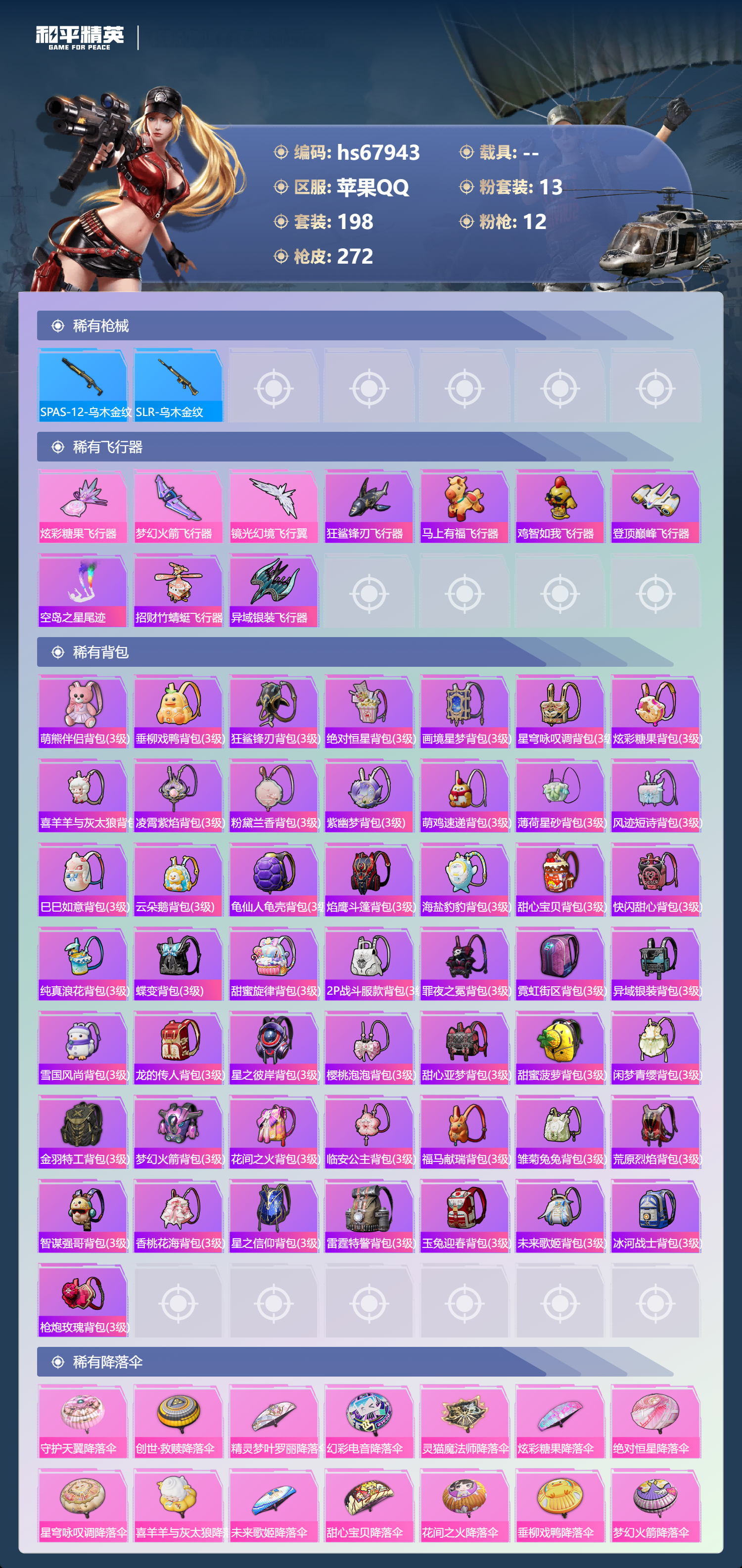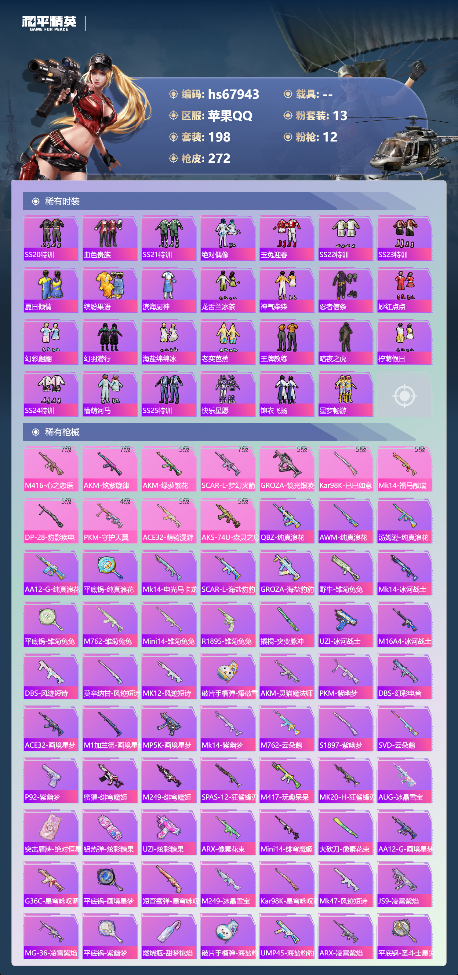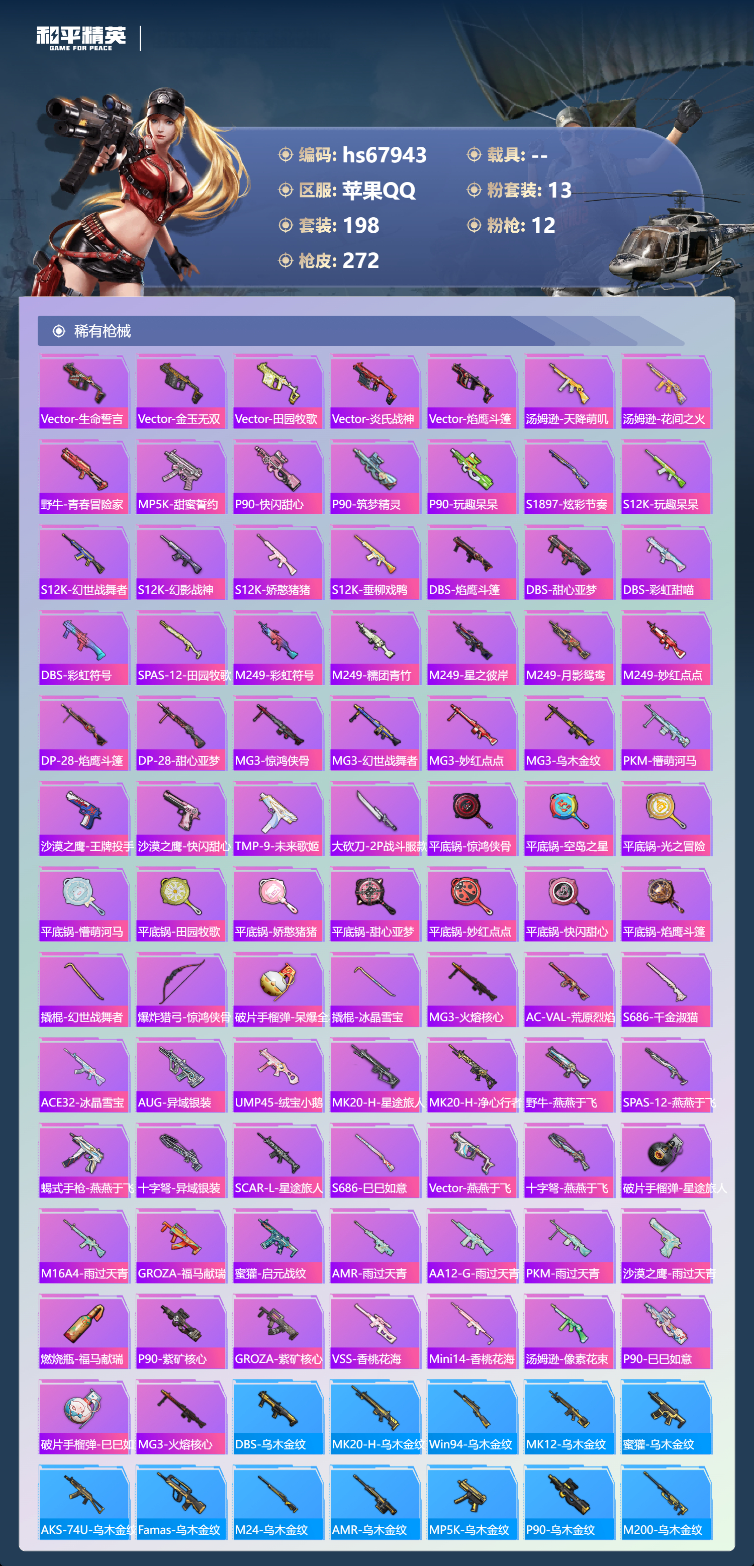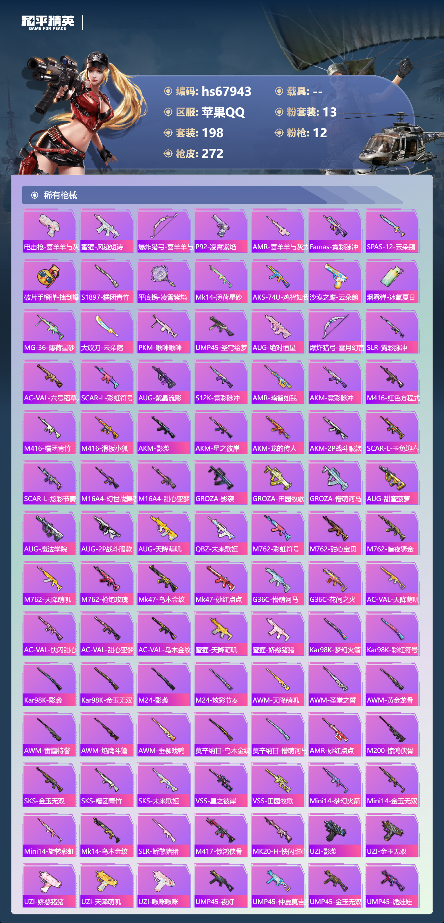 【268稀有枪械】M416-心之恋语/7级,AKM-炫紫旋律/7级,AKM-绿萝繁花/5级,SCAR-L-梦幻火箭/7级,GROZA-镜光银凌/5级,Kar98K-巳巳如意/5级,Mk14-福马献瑞/5级,DP-28-豹影疾电/5级,PKM-守护天翼/4级,ACE32-萌骑漫游/5级,AKS-74U-森灵之息/5级,QBZ-纯真浪花,AWM-纯真浪花,汤姆逊-纯真浪花,DBS-乌木金纹,AA12-G-纯真浪花,平底锅-纯真浪花,Mk14-电光马卡龙,SCAR-L-海盐豹豹,GROZA-海盐豹豹,野牛-雏菊兔兔,Mk14-冰河战士,平底锅-雏菊兔兔,M762-雏菊兔兔,Mini14-雏菊兔兔,R1895-雏菊兔兔,撬棍-突变脉冲,UZI-冰河战士,M16A4-冰河战士,MK20-H-乌木金纹,DBS-风迹短诗,莫辛纳甘-风迹短诗,Win94-乌木金纹,MK12-风迹短诗,MK12-乌木金纹,破片手榴弹-爆破雪人,AKM-灵猫魔法师,PKM-紫幽梦,DBS-幻彩电音,ACE32-画境星梦,M1加兰德-画境星梦,MP5K-画境星梦,Mk14-紫幽梦,蜜獾-乌木金纹,M762-云朵鹅,S1897-紫幽梦,SVD-云朵鹅,P92-紫幽梦,蜜獾-绯穹魔姬,M249-绯穹魔姬,SPAS-12-狂鲨锋刃,M417-玩趣呆呆,MK20-H-狂鲨锋刃,AUG-冰晶雪宝,突击盾牌-绝对恒星,铝热弹-炫彩糖果,UZI-炫彩糖果,ARX-像素花束,Mini14-绯穹魔姬,大砍刀-像素花束,AA12-G-画境星梦,G36C-星穹咏叹调,平底锅-画境星梦,短管霰弹-星穹咏叹调,M249-冰晶雪宝,Kar98K-星穹咏叹调,Mk47-风迹短诗,JS9-凌霄紫焰,MG-36-凌霄紫焰,平底锅-紫幽梦,燃烧瓶-甜梦桃焰,破片手榴弹-海盐豹豹,UMP45-海盐豹豹,ARX-凌霄紫焰,AKS-74U-乌木金纹,平底锅-圣斗士星矢,电击枪-喜羊羊与灰太狼,蜜獾-风迹短诗,爆炸猎弓-喜羊羊与灰太狼,P92-凌霄紫焰,AMR-喜羊羊与灰太狼,Famas-乌木金纹,Famas-霓彩脉冲,SPAS-12-云朵鹅,破片手榴弹-拽到爆炸,S1897-糯团青竹,平底锅-凌霄紫焰,Mk14-薄荷星砂,AKS-74U-鸡智如我,沙漠之鹰-云朵鹅,烟雾弹-冰氧夏日,MG-36-薄荷星砂,大砍刀-云朵鹅,PKM-啾咪啾咪,UMP45-圣穹绘梦,AUG-绝对恒星,爆炸猎弓-雪月幻音,SLR-霓彩脉冲,AC-VAL-六号稻草人,SCAR-L-彩虹符号,AUG-紫晶流影,S12K-霓彩脉冲,AMR-鸡智如我,AKM-霓彩脉冲,M416-红色方程式,M416-糯团青竹,M416-滑板小狐,AKM-影袭,AKM-星之彼岸,AKM-龙的传人,AKM-2P战斗服款,SCAR-L-玉兔迎春,SCAR-L-炫彩节奏,M16A4-幻世战舞者,M16A4-甜心亚梦,GROZA-影袭,GROZA-田园牧歌,GROZA-懵萌河马,AUG-甜蜜菠萝,AUG-魔法学院,AUG-2P战斗服款,AUG-天降萌叽,QBZ-未来歌姬,M762-彩虹符号,M762-甜心宝贝,M762-暗夜鎏金,M762-天降萌叽,M762-枪炮玫瑰,Mk47-乌木金纹,Mk47-妙红点点,G36C-懵萌河马,G36C-花间之火,AC-VAL-天降萌叽,AC-VAL-快闪甜心,AC-VAL-甜心亚梦,AC-VAL-乌木金纹,蜜獾-天降萌叽,蜜獾-娇憨猪猪,Kar98K-梦幻火箭,Kar98K-彩虹符号,Kar98K-影袭,Kar98K-金玉无双,M24-乌木金纹,M24-影袭,M24-炫彩节奏,AWM-天降萌叽,AWM-圣堂之誓,AWM-黄金龙骨,AWM-雷霆特警,AWM-焰鹰斗篷,AWM-垂柳戏鸭,莫辛纳甘-乌木金纹,莫辛纳甘-懵萌河马,AMR-乌木金纹,AMR-妙红点点,M200-惊鸿侠骨,SKS-金玉无双,SKS-糯团青竹,SKS-未来歌姬,VSS-星之彼岸,VSS-田园牧歌,Mini14-梦幻火箭,Mini14-金玉无双,Mini14-旋转彩虹,Mk14-乌木金纹,SLR-娇憨猪猪,M417-惊鸿侠骨,MK20-H-快闪甜心,UZI-影袭,UZI-金玉无双,UZI-娇憨猪猪,UZI-天降萌叽,UZI-啾咪啾咪,UMP45-夜灯,UMP45-仲夏莫吉托,UMP45-金玉无双,UMP45-诡娃娃,Vector-生命誓言,Vector-金玉无双,Vector-田园牧歌,Vector-炎氏战神,Vector-焰鹰斗篷,汤姆逊-天降萌叽,汤姆逊-花间之火,野牛-青春冒险家,MP5K-甜蜜誓约,MP5K-乌木金纹,P90-乌木金纹,P90-快闪甜心,P90-筑梦精灵,P90-玩趣呆呆,S1897-炫彩节奏,S12K-玩趣呆呆,S12K-幻世战舞者,S12K-幻影战神,S12K-娇憨猪猪,S12K-垂柳戏鸭,DBS-焰鹰斗篷,DBS-甜心亚梦,DBS-彩虹甜喵,DBS-彩虹符号,SPAS-12-田园牧歌,M249-彩虹符号,M249-糯团青竹,M249-星之彼岸,M249-月影鸳鸯,M249-妙红点点,DP-28-焰鹰斗篷,DP-28-甜心亚梦,MG3-惊鸿侠骨,MG3-幻世战舞者,MG3-妙红点点,MG3-乌木金纹,PKM-懵萌河马,沙漠之鹰-王牌投手,沙漠之鹰-快闪甜心,TMP-9-未来歌姬,大砍刀-2P战斗服款,平底锅-惊鸿侠骨,平底锅-空岛之星,平底锅-光之冒险,平底锅-懵萌河马,平底锅-田园牧歌,平底锅-娇憨猪猪,平底锅-甜心亚梦,平底锅-妙红点点,平底锅-快闪甜心,平底锅-焰鹰斗篷,撬棍-幻世战舞者,爆炸猎弓-惊鸿侠骨,破片手榴弹-呆爆全场,撬棍-冰晶雪宝,MG3-火熔核心,AC-VAL-荒原烈焰,S686-千金淑猫,ACE32-冰晶雪宝,AUG-异域银装,UMP45-绒宝小鹅,MK20-H-星途旅人,MK20-H-净心行者,野牛-燕燕于飞,M200-乌木金纹,SPAS-12-燕燕于飞,蝎式手枪-燕燕于飞,十字弩-异域银装,SCAR-L-星途旅人,S686-巳巳如意,SPAS-12-乌木金纹,Vector-燕燕于飞,十字弩-燕燕于飞,破片手榴弹-星途旅人,M16A4-雨过天青,GROZA-福马献瑞,蜜獾-启元战纹,AMR-雨过天青,SLR-乌木金纹,AA12-G-雨过天青,PKM-雨过天青,沙漠之鹰-雨过天青,燃烧瓶-福马献瑞,P90-紫矿核心,GROZA-紫矿核心,VSS-香桃花海,Mini14-香桃花海,汤姆逊-像素花束,P90-巳巳如意,破片手榴弹-巳巳如意,MG3-火熔核心