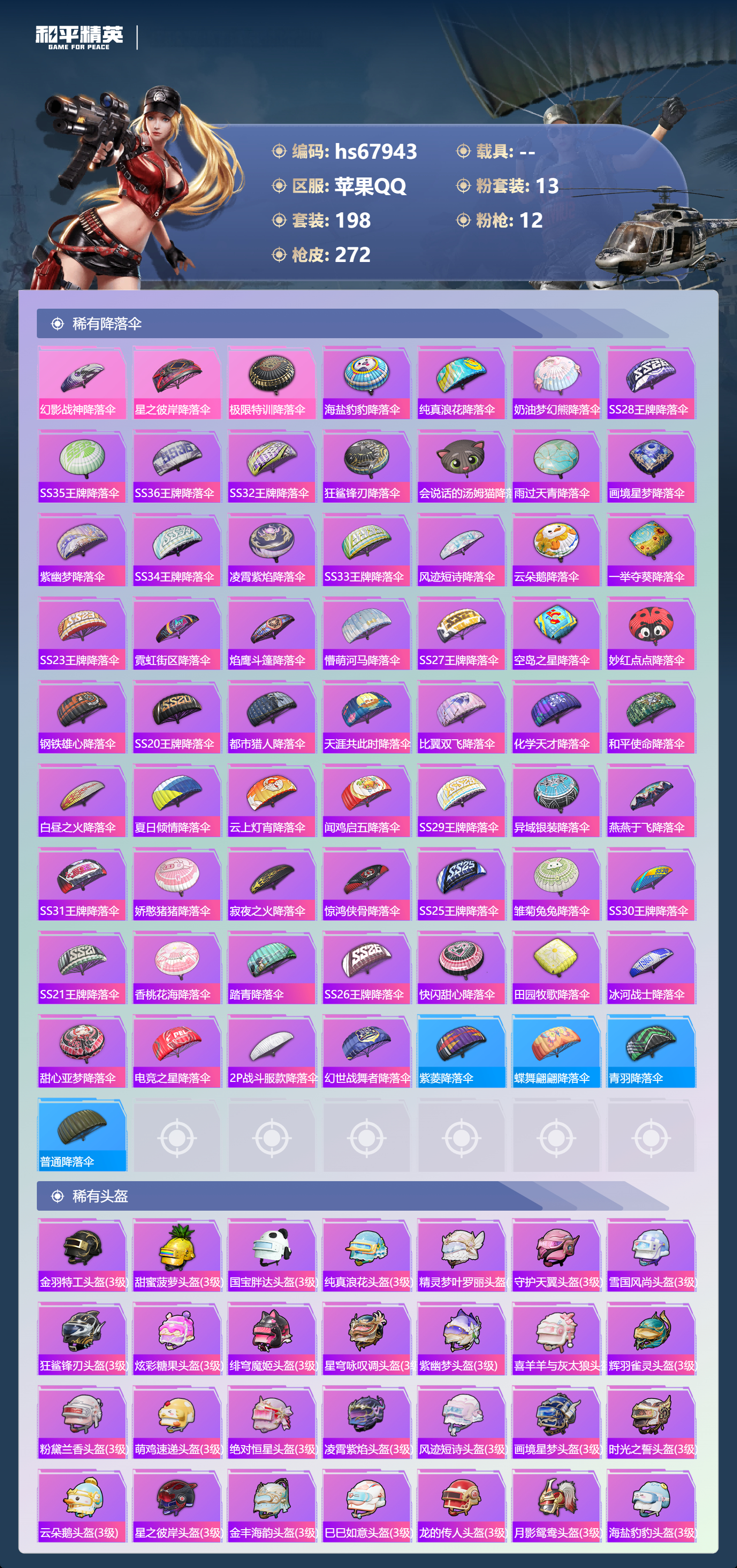 【78稀有降落伞】守护天翼降落伞,海盐豹豹降落伞,纯真浪花降落伞,创世·救赎降落伞,奶油梦幻熊降落伞,精灵梦叶罗丽降落伞,SS28王牌降落伞,SS35王牌降落伞,SS36王牌降落伞,幻彩电音降落伞,灵猫魔法师降落伞,SS32王牌降落伞,炫彩糖果降落伞,绝对恒星降落伞,狂鲨锋刃降落伞,星穹咏叹调降落伞,会说话的汤姆猫降落伞,雨过天青降落伞,画境星梦降落伞,紫幽梦降落伞,SS34王牌降落伞,喜羊羊与灰太狼降落伞,凌霄紫焰降落伞,SS33王牌降落伞,风迹短诗降落伞,云朵鹅降落伞,一举夺葵降落伞,SS23王牌降落伞,霓虹街区降落伞,焰鹰斗篷降落伞,懵萌河马降落伞,未来歌姬降落伞,SS27王牌降落伞,甜心宝贝降落伞,空岛之星降落伞,花间之火降落伞,紫菱降落伞,妙红点点降落伞,钢铁雄心降落伞,SS20王牌降落伞,蝶舞翩翩降落伞,都市猎人降落伞,青羽降落伞,天涯共此时降落伞,普通降落伞,比翼双飞降落伞,化学天才降落伞,和平使命降落伞,白昼之火降落伞,夏日倾情降落伞,云上灯宵降落伞,闻鸡启五降落伞,SS29王牌降落伞,异域银装降落伞,燕燕于飞降落伞,SS31王牌降落伞,娇憨猪猪降落伞,寂夜之火降落伞,惊鸿侠骨降落伞,SS25王牌降落伞,垂柳戏鸭降落伞,雏菊兔兔降落伞,SS30王牌降落伞,SS21王牌降落伞,香桃花海降落伞,踏青降落伞,SS26王牌降落伞,快闪甜心降落伞,梦幻火箭降落伞,幻影战神降落伞,田园牧歌降落伞,冰河战士降落伞,星之彼岸降落伞,甜心亚梦降落伞,电竞之星降落伞,2P战斗服款降落伞,幻世战舞者降落伞,极限特训降落伞