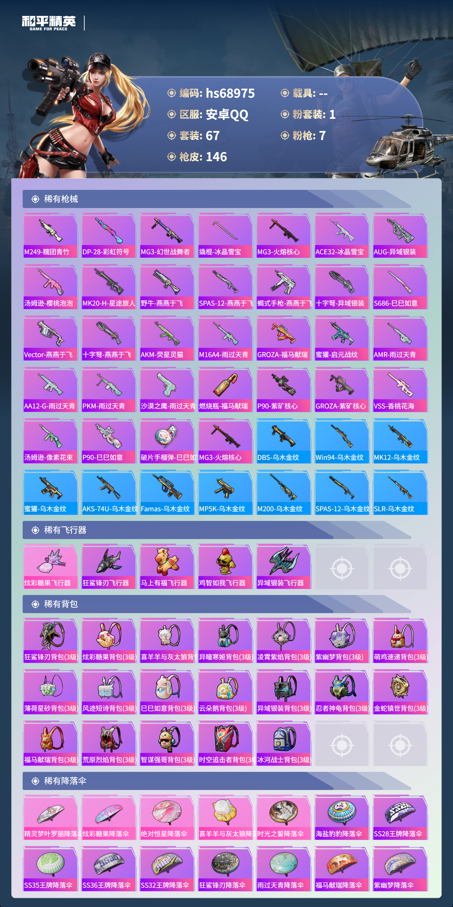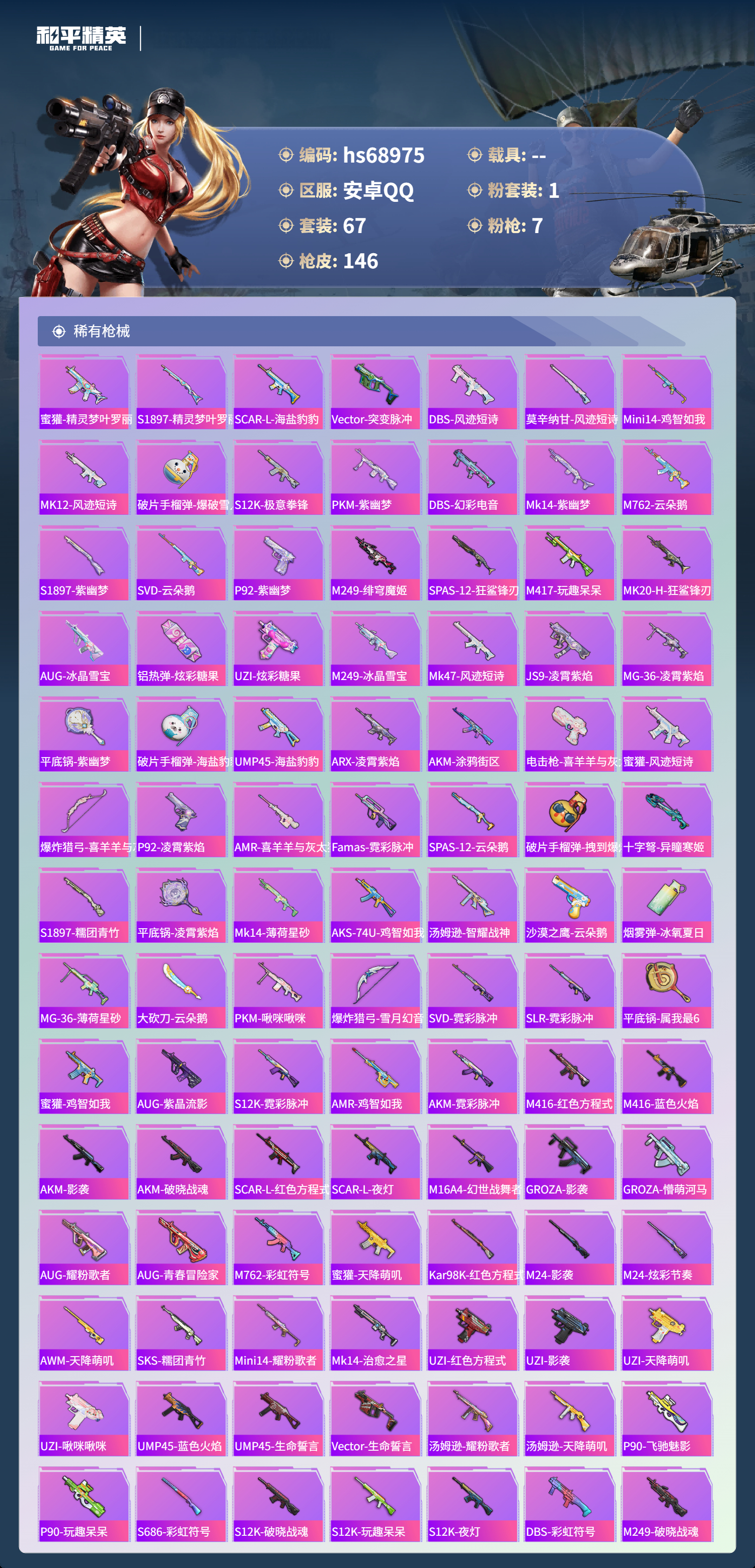 【147稀有枪械】Kar98K-巳巳如意/5级,Mk14-甜梦熊击/5级,Mk14-福马献瑞/5级,DP-28-豹影疾电/5级,ACE32-萌骑漫游/3级,AA12-G-萌骑幻想/2级,AKS-74U-森灵之息/5级,DBS-乌木金纹,蜜獾-精灵梦叶罗丽,S1897-精灵梦叶罗丽,SCAR-L-海盐豹豹,Vector-突变脉冲,DBS-风迹短诗,莫辛纳甘-风迹短诗,Mini14-鸡智如我,Win94-乌木金纹,MK12-风迹短诗,MK12-乌木金纹,破片手榴弹-爆破雪人,S12K-极意拳锋,PKM-紫幽梦,DBS-幻彩电音,Mk14-紫幽梦,蜜獾-乌木金纹,M762-云朵鹅,S1897-紫幽梦,SVD-云朵鹅,P92-紫幽梦,M249-绯穹魔姬,SPAS-12-狂鲨锋刃,M417-玩趣呆呆,MK20-H-狂鲨锋刃,AUG-冰晶雪宝,铝热弹-炫彩糖果,UZI-炫彩糖果,M249-冰晶雪宝,Mk47-风迹短诗,JS9-凌霄紫焰,MG-36-凌霄紫焰,平底锅-紫幽梦,破片手榴弹-海盐豹豹,UMP45-海盐豹豹,ARX-凌霄紫焰,AKS-74U-乌木金纹,AKM-涂鸦街区,电击枪-喜羊羊与灰太狼,蜜獾-风迹短诗,爆炸猎弓-喜羊羊与灰太狼,P92-凌霄紫焰,AMR-喜羊羊与灰太狼,Famas-乌木金纹,Famas-霓彩脉冲,SPAS-12-云朵鹅,破片手榴弹-拽到爆炸,十字弩-异瞳寒姬,S1897-糯团青竹,平底锅-凌霄紫焰,Mk14-薄荷星砂,AKS-74U-鸡智如我,汤姆逊-智耀战神,沙漠之鹰-云朵鹅,烟雾弹-冰氧夏日,MG-36-薄荷星砂,大砍刀-云朵鹅,PKM-啾咪啾咪,爆炸猎弓-雪月幻音,SVD-霓彩脉冲,SLR-霓彩脉冲,平底锅-属我最6,蜜獾-鸡智如我,AUG-紫晶流影,S12K-霓彩脉冲,AMR-鸡智如我,AKM-霓彩脉冲,M416-红色方程式,M416-蓝色火焰,AKM-影袭,AKM-破晓战魂,SCAR-L-红色方程式,SCAR-L-夜灯,M16A4-幻世战舞者,GROZA-影袭,GROZA-懵萌河马,AUG-耀粉歌者,AUG-青春冒险家,M762-彩虹符号,蜜獾-天降萌叽,Kar98K-红色方程式,M24-影袭,M24-炫彩节奏,AWM-天降萌叽,SKS-糯团青竹,Mini14-耀粉歌者,Mk14-治愈之星,UZI-红色方程式,UZI-影袭,UZI-天降萌叽,UZI-啾咪啾咪,UMP45-蓝色火焰,UMP45-生命誓言,Vector-生命誓言,汤姆逊-耀粉歌者,汤姆逊-天降萌叽,MP5K-乌木金纹,P90-飞驰魅影,P90-玩趣呆呆,S686-彩虹符号,S12K-破晓战魂,S12K-玩趣呆呆,S12K-夜灯,DBS-彩虹符号,M249-破晓战魂,M249-糯团青竹,DP-28-彩虹符号,MG3-幻世战舞者,撬棍-冰晶雪宝,MG3-火熔核心,ACE32-冰晶雪宝,AUG-异域银装,汤姆逊-樱桃泡泡,MK20-H-星途旅人,野牛-燕燕于飞,M200-乌木金纹,SPAS-12-燕燕于飞,蝎式手枪-燕燕于飞,十字弩-异域银装,S686-巳巳如意,SPAS-12-乌木金纹,Vector-燕燕于飞,十字弩-燕燕于飞,AKM-荧星灵猫,M16A4-雨过天青,GROZA-福马献瑞,蜜獾-启元战纹,AMR-雨过天青,SLR-乌木金纹,AA12-G-雨过天青,PKM-雨过天青,沙漠之鹰-雨过天青,燃烧瓶-福马献瑞,P90-紫矿核心,GROZA-紫矿核心,VSS-香桃花海,汤姆逊-像素花束,P90-巳巳如意,破片手榴弹-巳巳如意,MG3-火熔核心