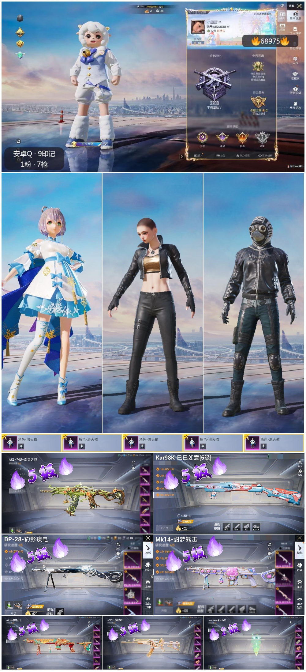 【7特效枪】Kar98K-巳巳如意/5级,AA12-G-萌骑幻想/2级,AKS-74U-森灵之息/5级,DP-28-豹影疾电/5级,ACE32-萌骑漫游/3级,Mk14-福马献瑞/5级,Mk14-甜梦熊击/5级