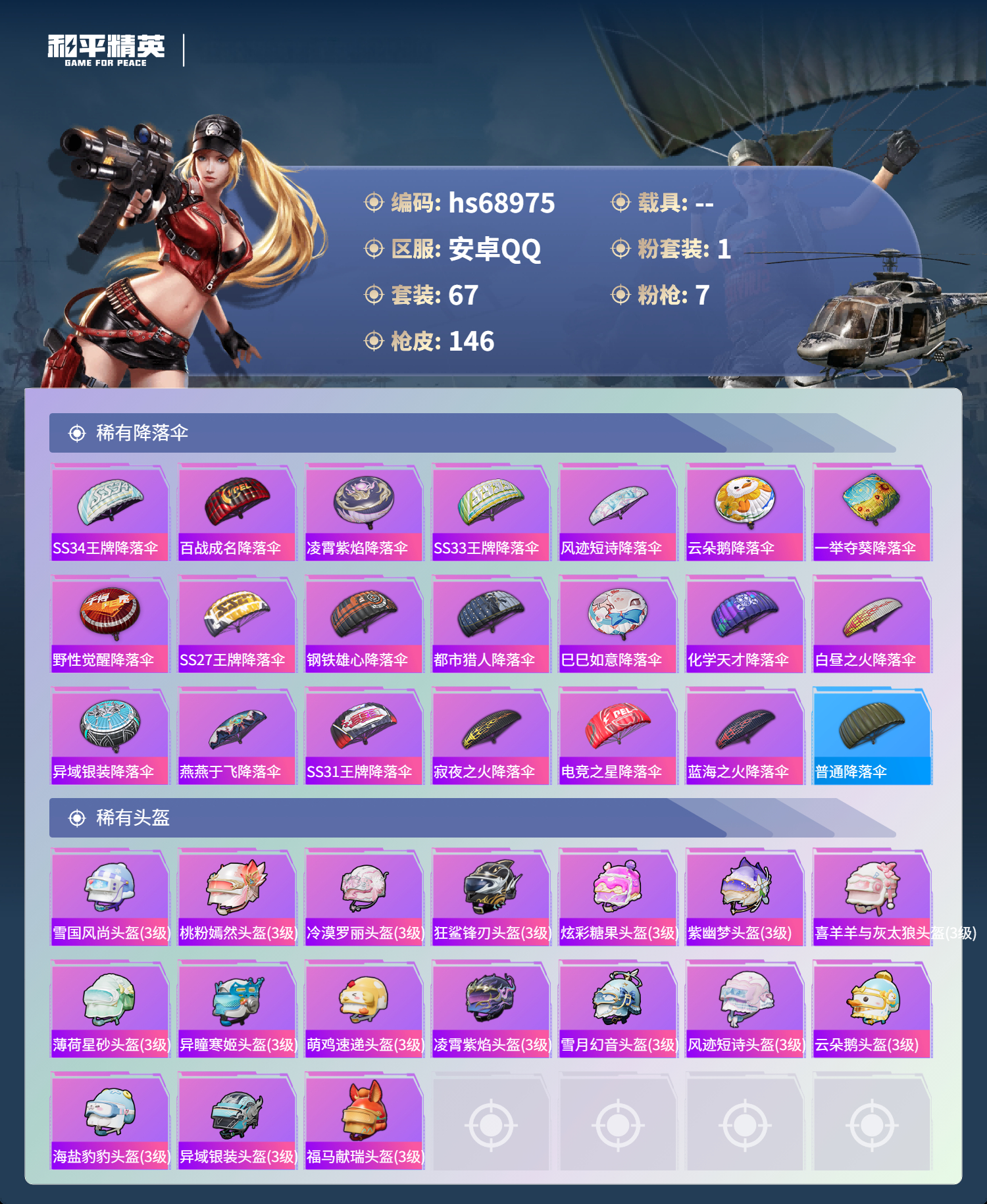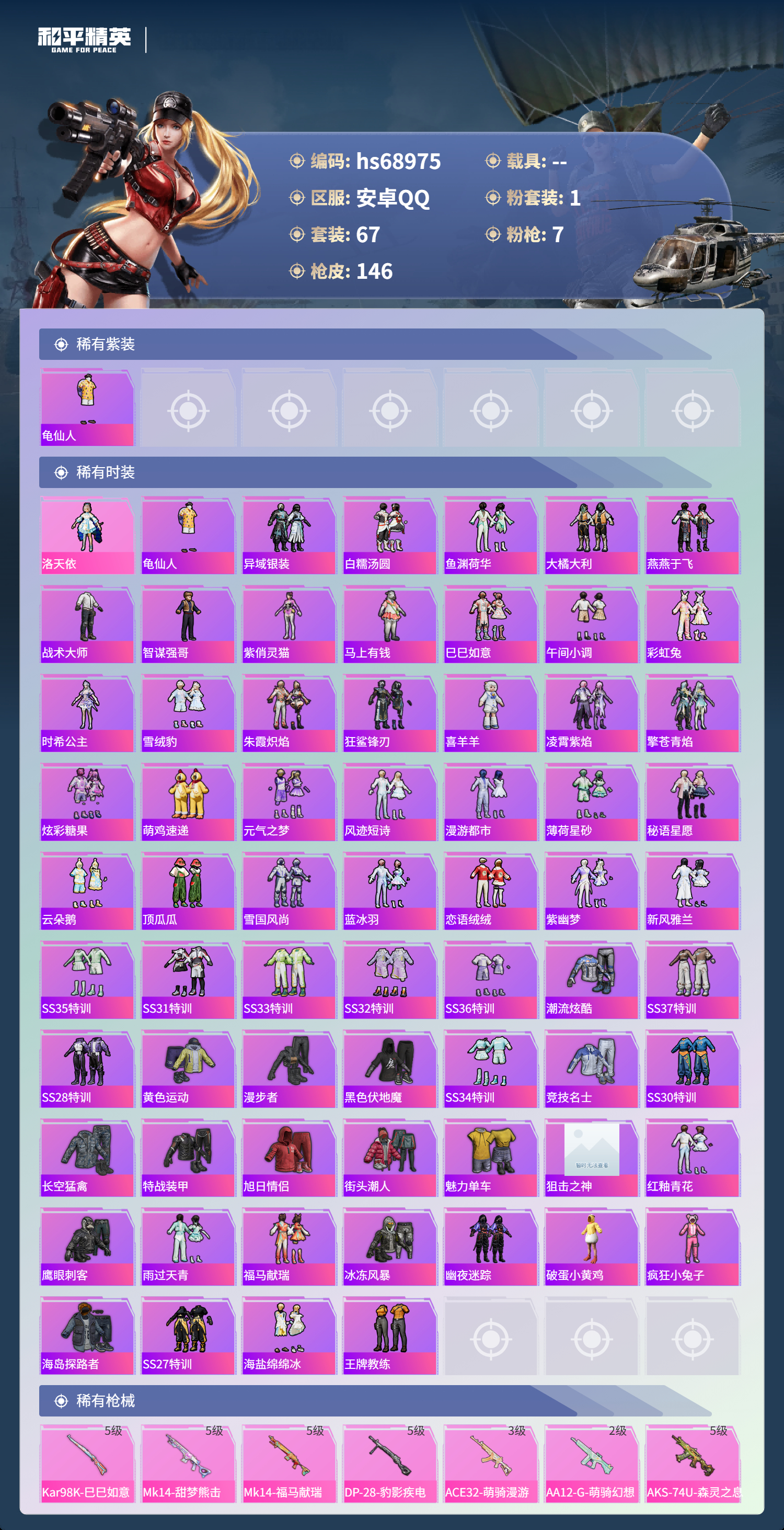 PX_2559592-,安卓手Q-9王牌印记-1粉装-7特效枪-32407热力值-67套装-146枪皮-2卓越印记-1传奇印记