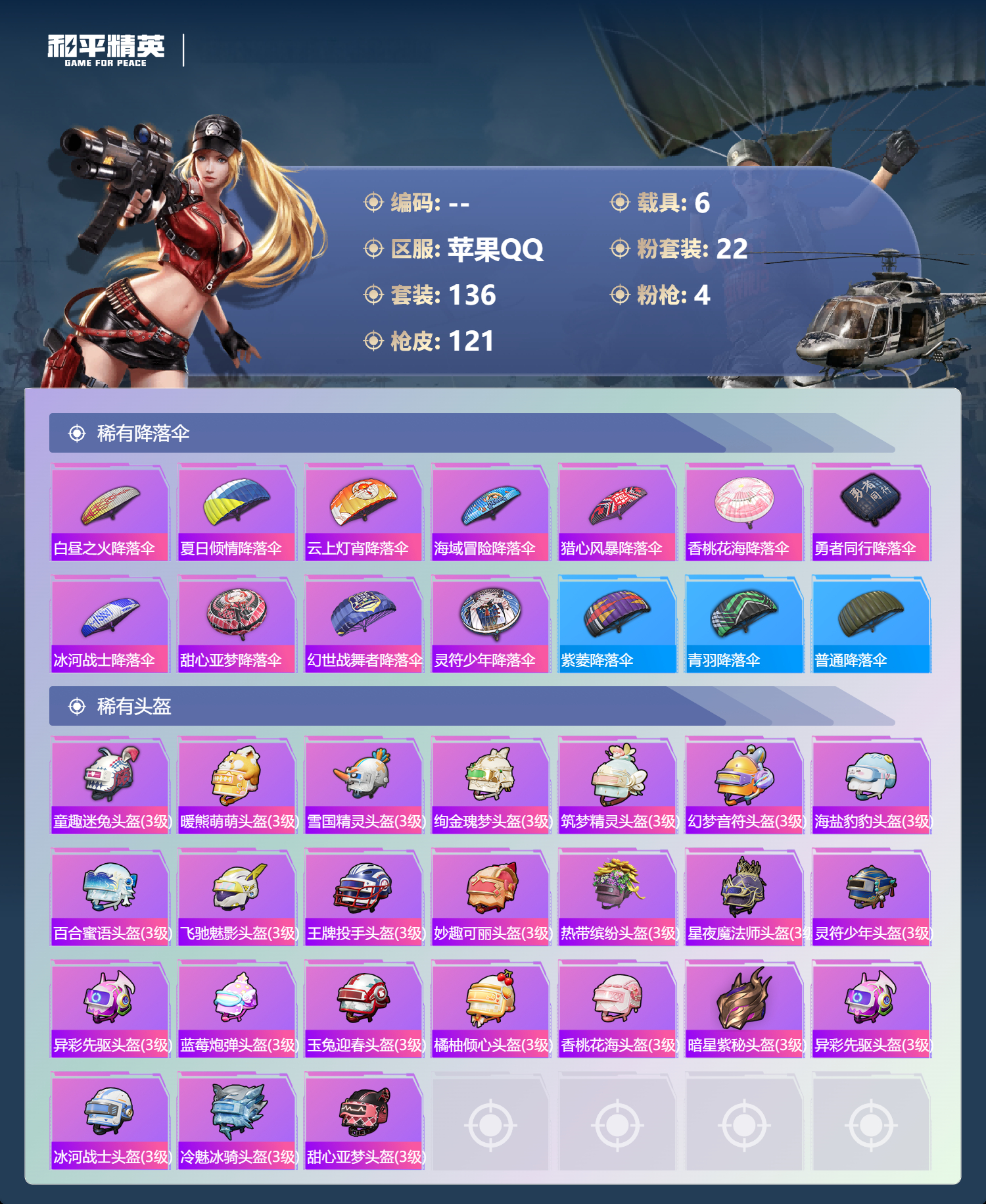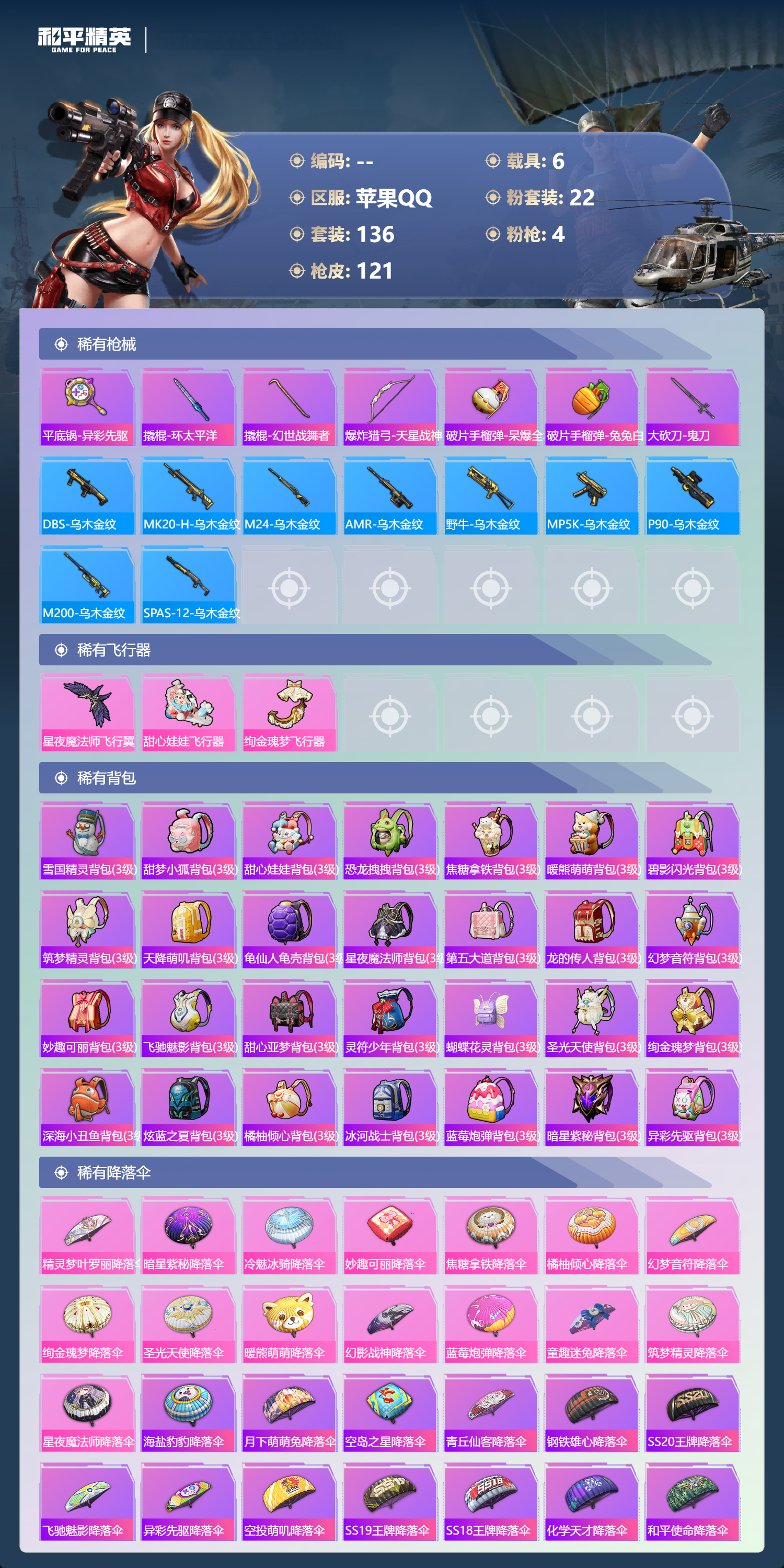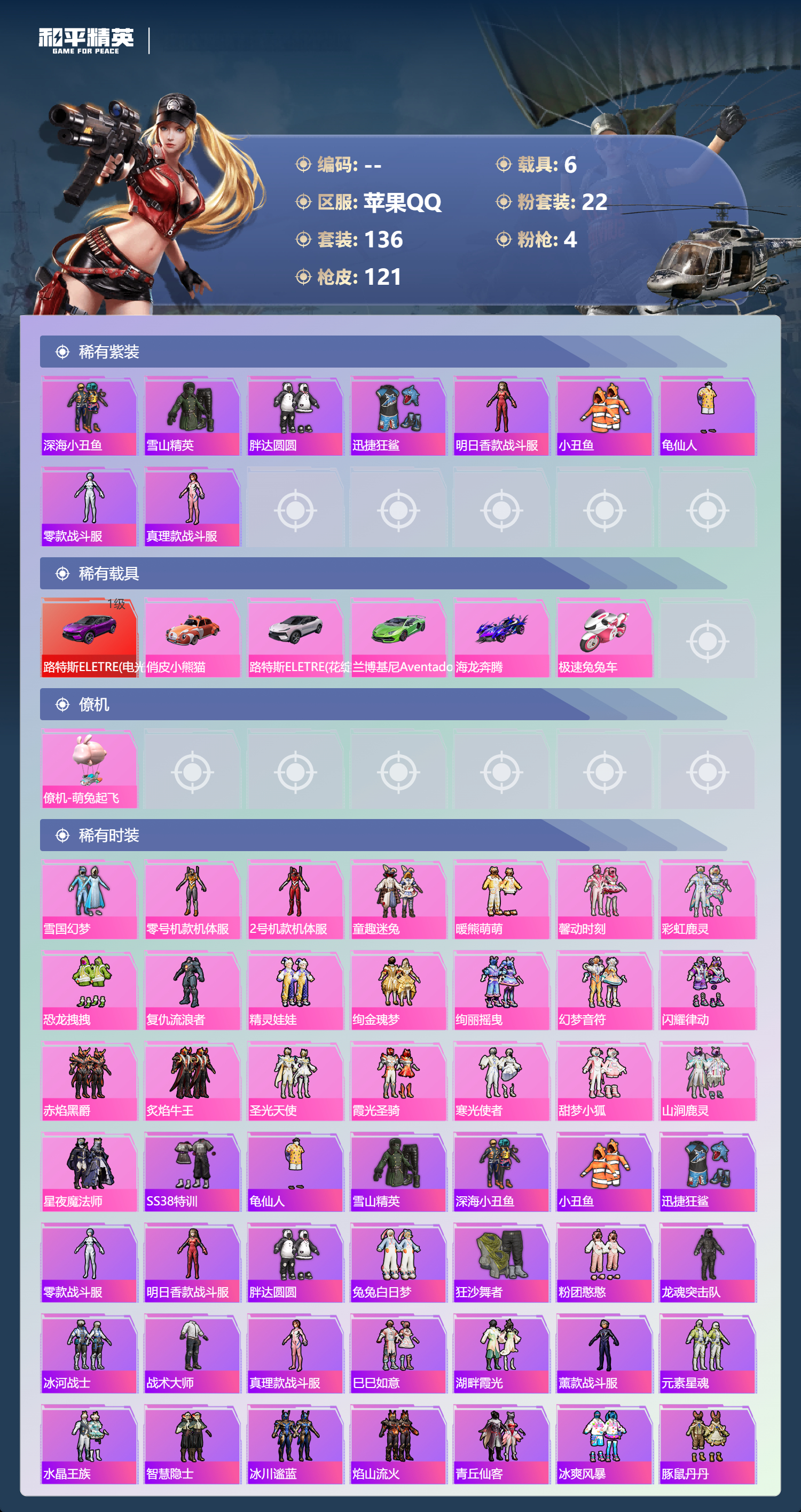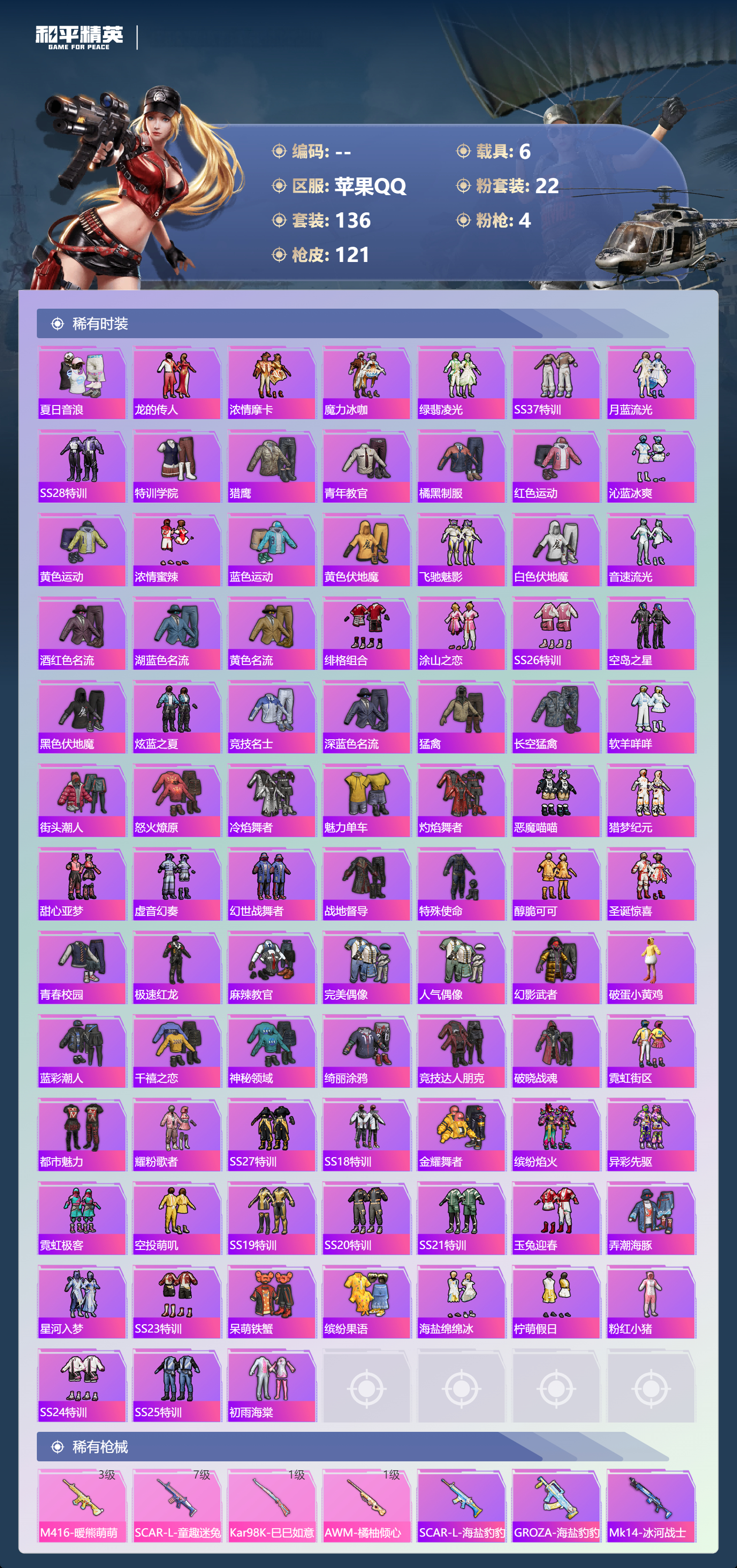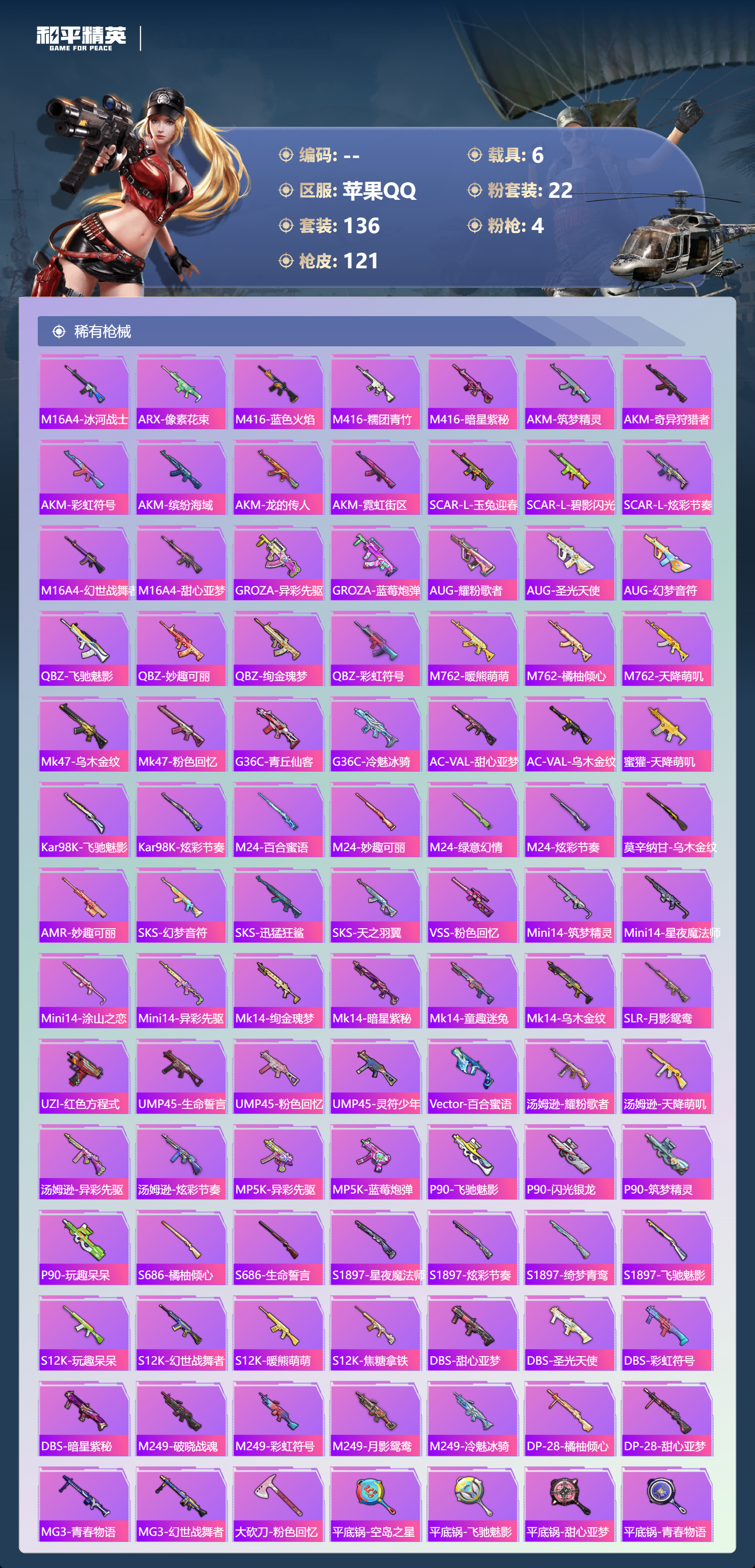 PX_2553866-,苹果手Q-3王牌印记-22粉装-4特效枪-6载具-59567热力值-136套装-121枪皮