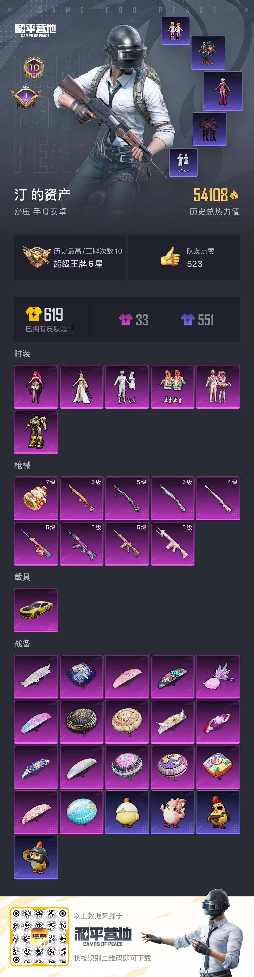 PX_2560874-可二次-安卓Q-1载具6粉装9特效枪8热门132套装164枪皮,54108热力值,极品小号,200多天特权卡,5级M4心之恋语,5级AK炫紫旋律,满级手雷招财进宝,馨动时刻,大黄蜂,炫光之旅,绯穹魔姬,镜光幻境,深海小丑鱼,菲菲,永恒黄蜂,10印记,历史超级王牌6星,【1载具】,永恒黄蜂,【6粉装】,萨利娅,绯穹魔姬,大黄蜂,炫光之旅,镜光幻境,馨动时刻,【9特效枪】,M416-心之恋语,(5级),AKM-炫紫旋律,(5级),Kar98K-巳巳如意,(5级),DP-28-豹影疾电,(5级),AMR-炫光之旅,(5级),M417-第五大道,(5级),M24-莲影清波,(4级),Mk14-福马献瑞,(5级),破片手榴弹-招财进宝,(7级),【8热门】,龟仙人,呆萌铁蟹,深海小丑鱼,粉红小猪,漫步者,破蛋小黄鸡,极速红龙,M24-奇异狩猎者,【1头盔】,智能音符头盔,营地ID:926737607,