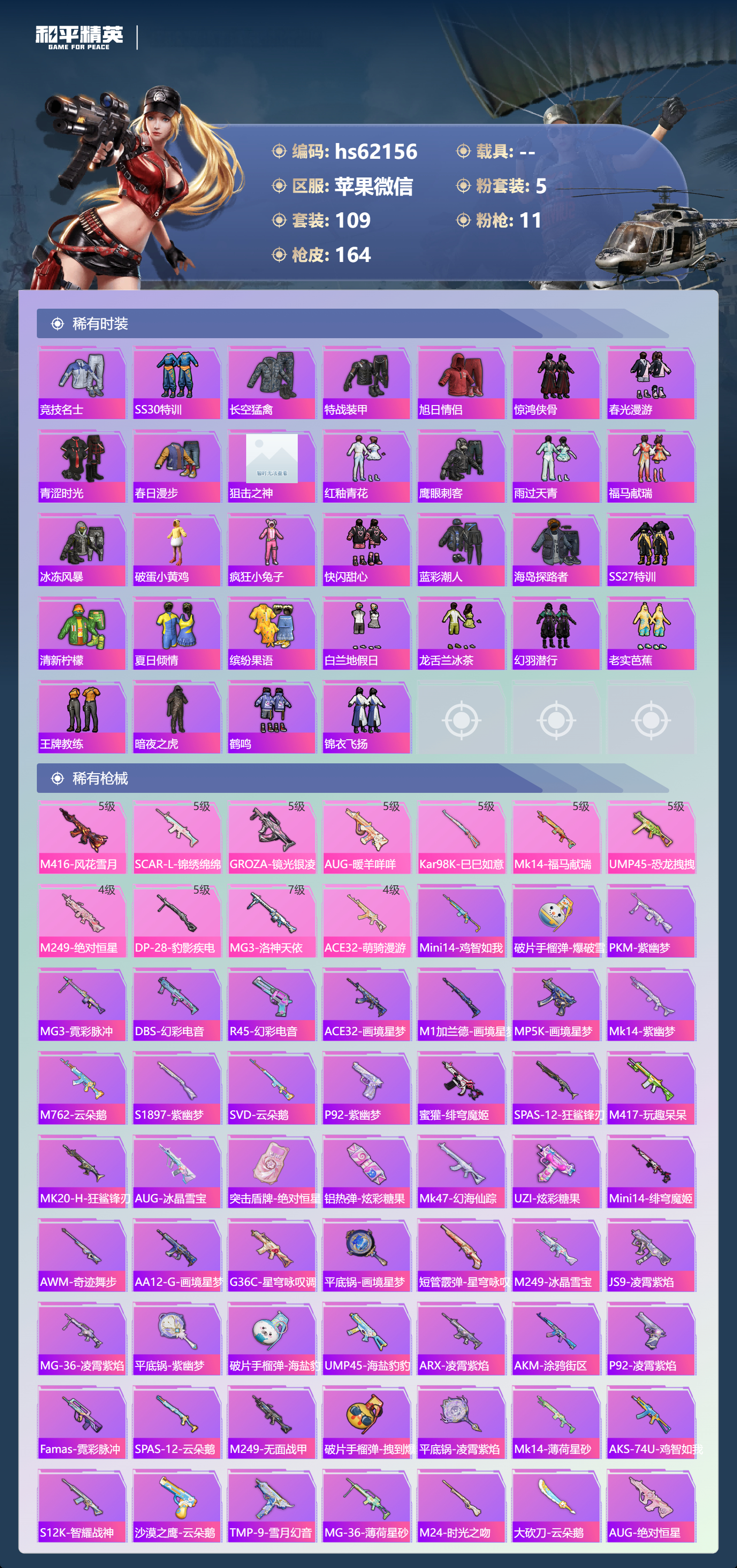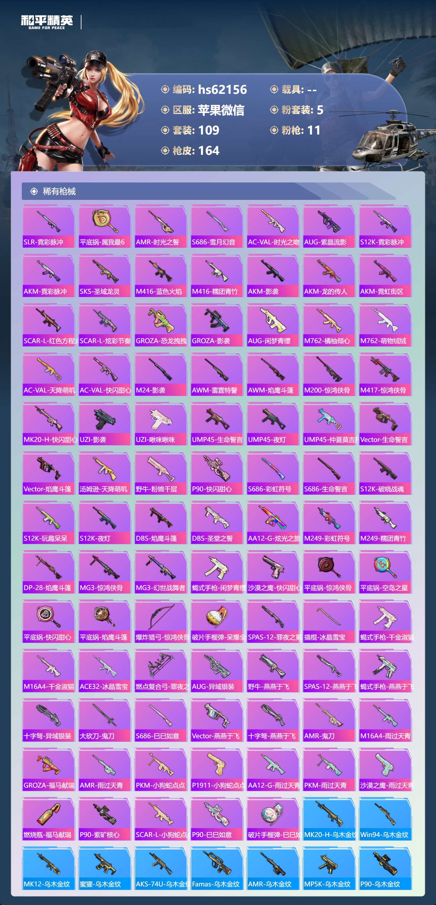 【164稀有枪械】M416-风花雪月/5级,SCAR-L-锦绣绵绵/5级,GROZA-镜光银凌/5级,AUG-暖羊咩咩/5级,Kar98K-巳巳如意/5级,Mk14-福马献瑞/5级,UMP45-恐龙拽拽/5级,M249-绝对恒星/4级,DP-28-豹影疾电/5级,MG3-洛神天依/7级,ACE32-萌骑漫游/4级,MK20-H-乌木金纹,Mini14-鸡智如我,Win94-乌木金纹,MK12-乌木金纹,破片手榴弹-爆破雪人,PKM-紫幽梦,MG3-霓彩脉冲,DBS-幻彩电音,R45-幻彩电音,ACE32-画境星梦,M1加兰德-画境星梦,MP5K-画境星梦,Mk14-紫幽梦,蜜獾-乌木金纹,M762-云朵鹅,S1897-紫幽梦,SVD-云朵鹅,P92-紫幽梦,蜜獾-绯穹魔姬,SPAS-12-狂鲨锋刃,M417-玩趣呆呆,MK20-H-狂鲨锋刃,AUG-冰晶雪宝,突击盾牌-绝对恒星,铝热弹-炫彩糖果,Mk47-幻海仙踪,UZI-炫彩糖果,Mini14-绯穹魔姬,AWM-奇迹舞步,AA12-G-画境星梦,G36C-星穹咏叹调,平底锅-画境星梦,短管霰弹-星穹咏叹调,M249-冰晶雪宝,JS9-凌霄紫焰,MG-36-凌霄紫焰,平底锅-紫幽梦,破片手榴弹-海盐豹豹,UMP45-海盐豹豹,ARX-凌霄紫焰,AKS-74U-乌木金纹,AKM-涂鸦街区,P92-凌霄紫焰,Famas-乌木金纹,Famas-霓彩脉冲,SPAS-12-云朵鹅,M249-无面战甲,破片手榴弹-拽到爆炸,平底锅-凌霄紫焰,Mk14-薄荷星砂,AKS-74U-鸡智如我,S12K-智耀战神,沙漠之鹰-云朵鹅,TMP-9-雪月幻音,MG-36-薄荷星砂,M24-时光之吻,大砍刀-云朵鹅,AUG-绝对恒星,SLR-霓彩脉冲,平底锅-属我最6,AMR-时光之誓,S686-雪月幻音,AC-VAL-时光之吻,AUG-紫晶流影,S12K-霓彩脉冲,AKM-霓彩脉冲,SKS-圣域龙灵,M416-蓝色火焰,M416-糯团青竹,AKM-影袭,AKM-龙的传人,AKM-霓虹街区,SCAR-L-红色方程式,SCAR-L-炫彩节奏,GROZA-恐龙拽拽,GROZA-影袭,AUG-闲梦青缨,M762-橘柚倾心,M762-萌物绒绒,AC-VAL-天降萌叽,AC-VAL-快闪甜心,M24-影袭,AWM-雷霆特警,AWM-焰鹰斗篷,AMR-乌木金纹,M200-惊鸿侠骨,M417-惊鸿侠骨,MK20-H-快闪甜心,UZI-影袭,UZI-啾咪啾咪,UMP45-生命誓言,UMP45-夜灯,UMP45-仲夏莫吉托,Vector-生命誓言,Vector-焰鹰斗篷,汤姆逊-天降萌叽,野牛-粉锦千层,MP5K-乌木金纹,P90-乌木金纹,P90-快闪甜心,S686-彩虹符号,S686-生命誓言,S12K-破晓战魂,S12K-玩趣呆呆,S12K-夜灯,DBS-焰鹰斗篷,DBS-圣堂之誓,AA12-G-炫光之旅,M249-彩虹符号,M249-糯团青竹,DP-28-焰鹰斗篷,MG3-惊鸿侠骨,MG3-幻世战舞者,蝎式手枪-闲梦青缨,沙漠之鹰-快闪甜心,平底锅-惊鸿侠骨,平底锅-空岛之星,平底锅-快闪甜心,平底锅-焰鹰斗篷,爆炸猎弓-惊鸿侠骨,破片手榴弹-呆爆全场,SPAS-12-罪夜之冕,撬棍-冰晶雪宝,蝎式手枪-千金淑猫,M16A4-千金淑猫,ACE32-冰晶雪宝,燃点复合弓-罪夜之冕,AUG-异域银装,野牛-燕燕于飞,M200-乌木金纹,SPAS-12-燕燕于飞,蝎式手枪-燕燕于飞,十字弩-异域银装,大砍刀-鬼刀,S686-巳巳如意,SPAS-12-乌木金纹,Vector-燕燕于飞,十字弩-燕燕于飞,AMR-鬼刀,M16A4-雨过天青,GROZA-福马献瑞,AMR-雨过天青,PKM-小狗蛇点点,SLR-乌木金纹,P1911-小狗蛇点点,AA12-G-雨过天青,PKM-雨过天青,沙漠之鹰-雨过天青,燃烧瓶-福马献瑞,P90-紫矿核心,SCAR-L-小狗蛇点点,P90-巳巳如意,破片手榴弹-巳巳如意