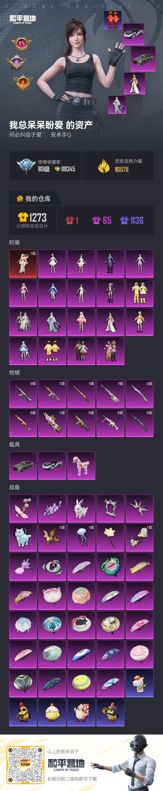 PX_2561601-3载具-266套装-328枪皮-1红装1稀有3载具18粉装10特效枪27热门266套装328枪皮,热力值,15印记,历史超级王牌19星,【1红装】,精灵之光-露米娜,(1级),【1稀有】,浪漫天命,【3载具】,暮色幽蹄,宾利飞驰布罗德盖棕双色,时空跃影(星辉银),【16粉装】,旋星之夜,蜜语粉晶,狂魅哈莉,蝶舞迷情,美琪,宁雨蝶,萨利娅,憨憨奶龙,狂魇小丑,小舞恋语,小舞雪昙,樱桃泡泡,呆萌星弥,垂柳戏鸭,缤纷油彩,冰霜白皇,【10特效枪】,M416-心之恋语,(7级),P90-沙丘之主,(1级),AKS-74U-森灵之息,(5级),AKM-绿萝繁花,(5级),Kar98K-圣域龙灵,(1级),Kar98K-巳巳如意,(5级),DP-28-豹影疾电,(5级),MG-36-虹云熊熊,(5级),AMR-智耀战神,(7级),Mk14-福马献瑞,(5级),【27热门】,龟仙人,2B战斗服款,浪漫假日,红熊茄茄,雪山精英,动感兔斯基,潮萌小黄鸭,软软马卡龙,晶辉守护,小狗蛇点点,兔兔白日梦,激萌罗小黑,浪漫波比,胖达圆圆,暗夜契约,团圆交子,瑞龙福将,纯白誓言,粉红小猪,萌熊伴侣,冰爽海盐,韶华初心,破蛋小黄鸡,风华少年志,极速红龙,英勇保护者,M762-瑞龙福将,【1飞行器】,幻海精灵飞行器,【2头盔】,精灵迷巫头盔,深海小丑鱼头盔,【1背包】,甜蜜誓约背包,营地ID:
