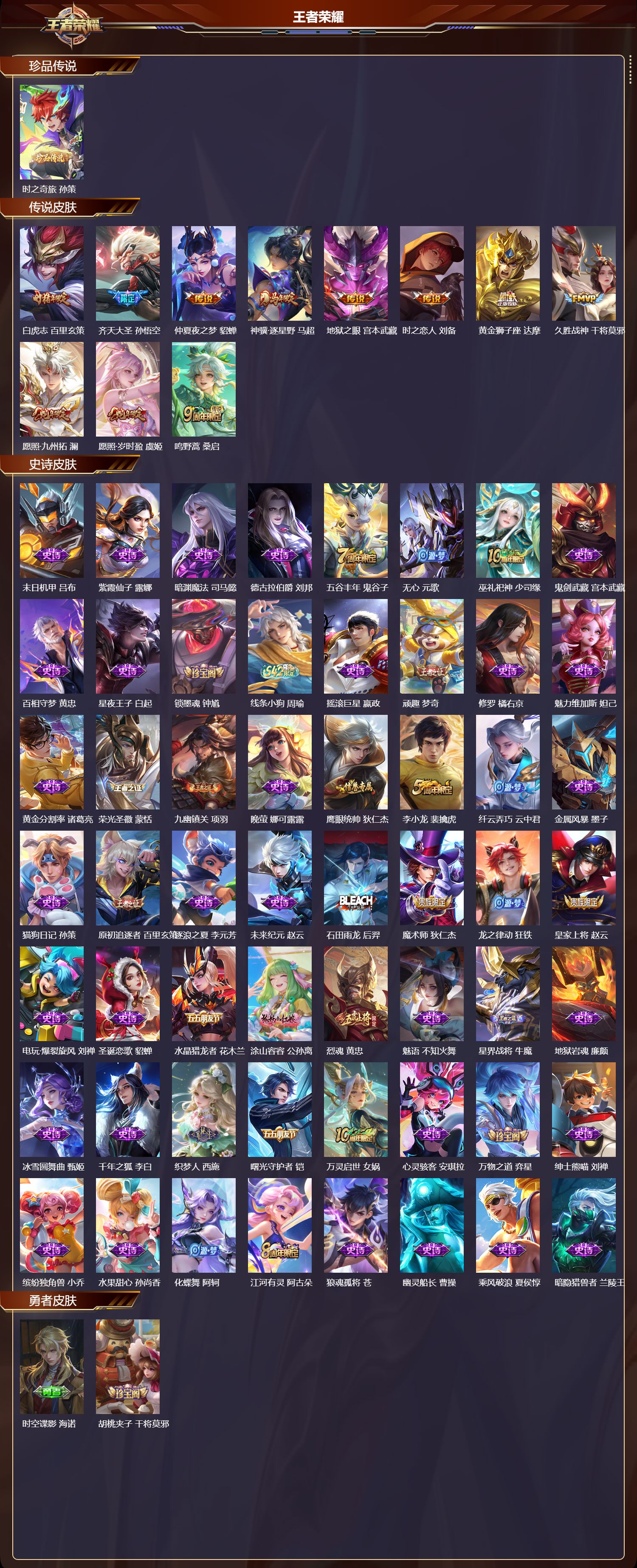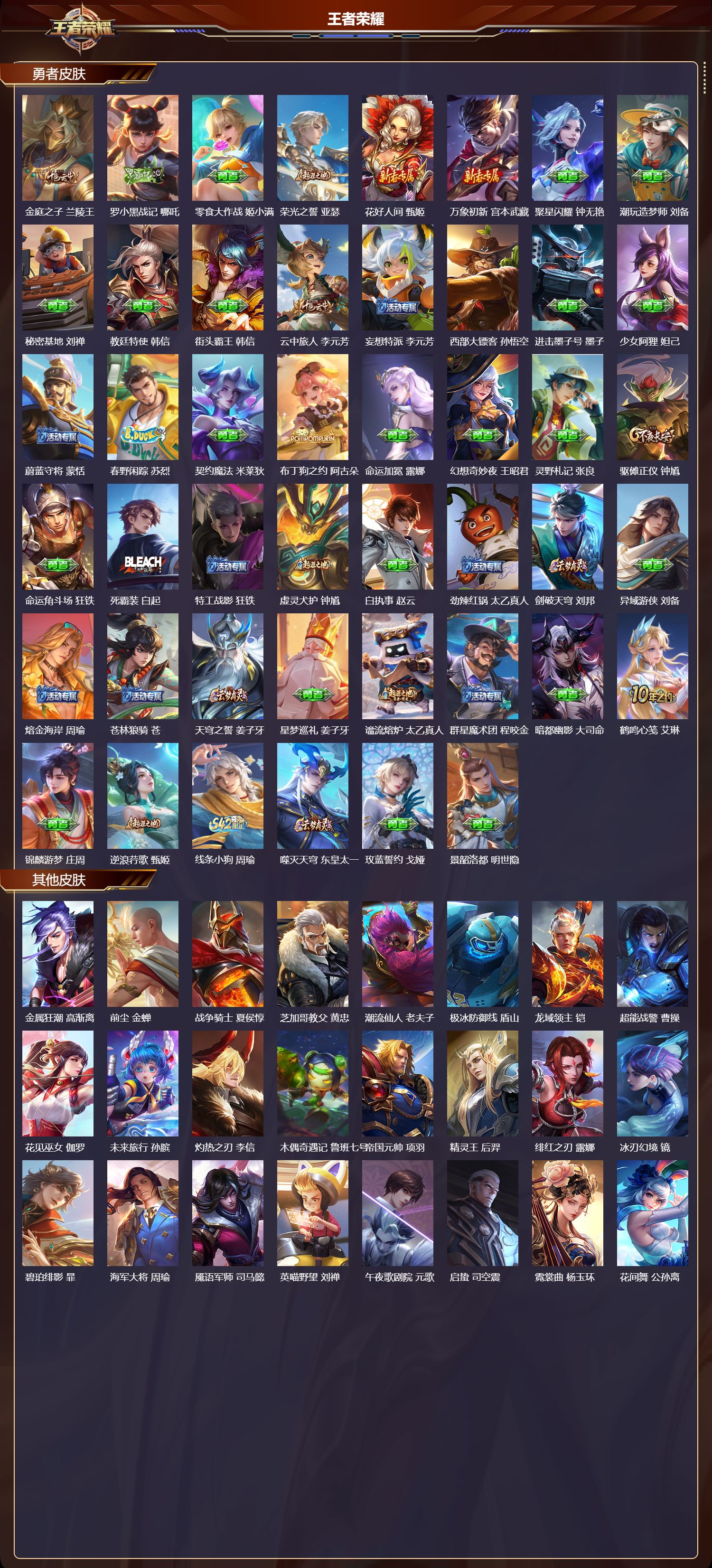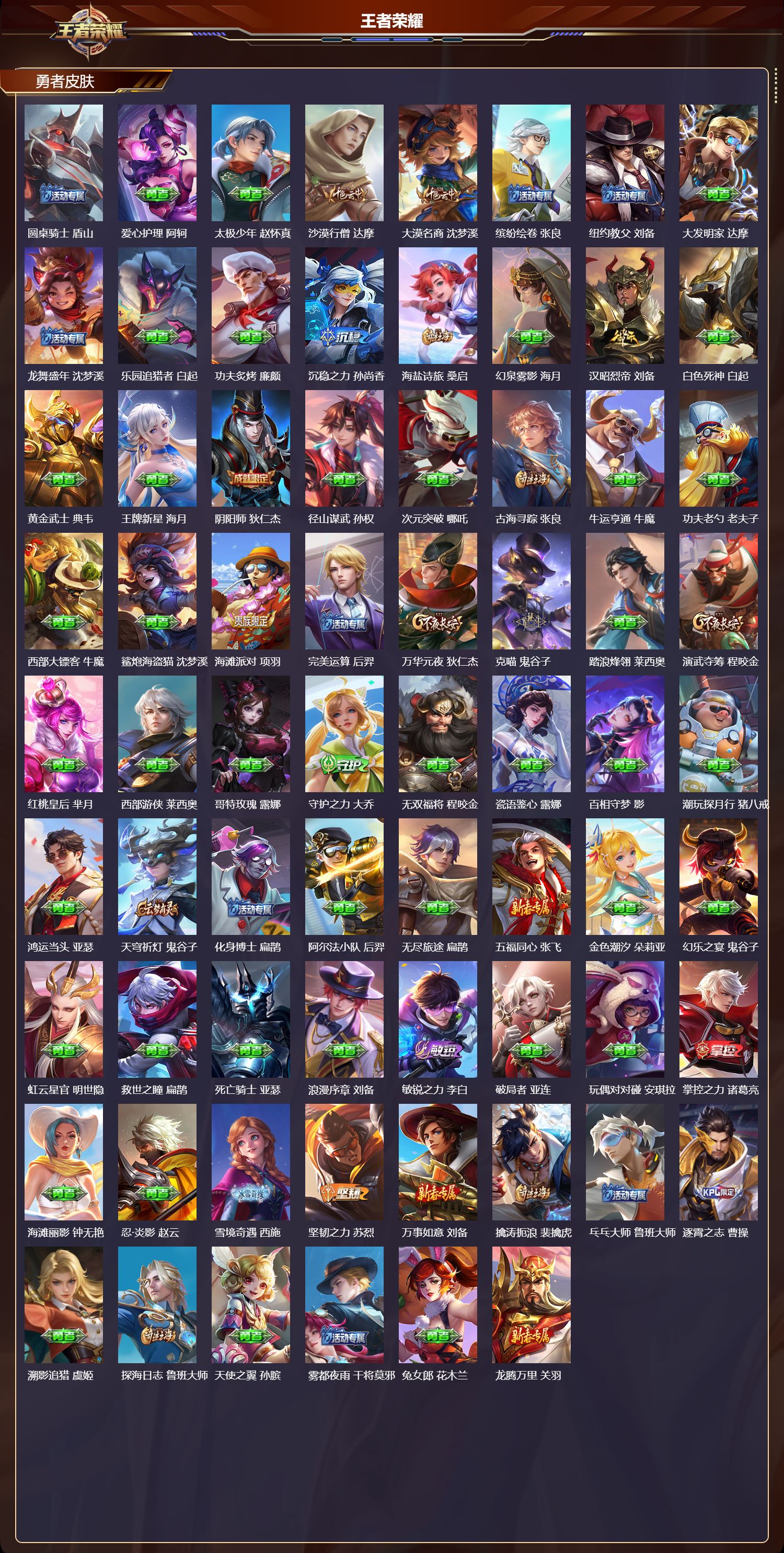 【118,勇者皮肤】时空谍影,海诺,胡桃夹子,干将莫邪,圆桌骑士,盾山,爱心护理,阿轲,太极少年,赵怀真,沙漠行僧,达摩,大漠名商,沈梦溪,缤纷绘卷,张良,纽约教父,刘备,大发明家,达摩,龙舞盛年,沈梦溪,乐园追猎者,白起,功夫炙烤,廉颇,沉稳之力,孙尚香,海盐诗旅,桑启,幻泉雾影,海月,汉昭烈帝,刘备,白色死神,白起,黄金武士,典韦,王牌新星,海月,阴阳师,狄仁杰,径山谋武,孙权,次元突破,哪吒,古海寻踪,张良,牛运亨通,牛魔,功夫老勺,老夫子,西部大镖客,牛魔,鲨炮海盗猫,沈梦溪,海滩派对,项羽,完美运算,后羿,万华元夜,狄仁杰,克喵,鬼谷子,踏浪烽翎,莱西奥,演武夺筹,程咬金,红桃皇后,芈月,西部游侠,莱西奥,哥特玫瑰,露娜,守护之力,大乔,无双福将,程咬金,瓷语鉴心,露娜,百相守梦,影,潮玩探月行,猪八戒,鸿运当头,亚瑟,天穹祈灯,鬼谷子,化身博士,扁鹊,阿尔法小队,后羿,无尽旅途,扁鹊,五福同心,张飞,金色潮汐,朵莉亚,幻乐之宴,鬼谷子,虹云星官,明世隐,救世之瞳,扁鹊,死亡骑士,亚瑟,浪漫序章,刘备,敏锐之力,李白,破局者,亚连,玩偶对对碰,安琪拉,掌控之力,诸葛亮,海滩丽影,钟无艳,忍·炎影,赵云,雪境奇遇,西施,坚韧之力,苏烈,万事如意,刘备,擒涛扼浪,裴擒虎,乓乓大师,鲁班大师,逐霄之志,曹操,溯影追猎,虞姬,探海日志,鲁班大师,天使之翼,孙膑,雾都夜雨,干将莫邪,兔女郎,花木兰,龙腾万里,关羽,金庭之子,兰陵王,罗小黑战记,哪吒,零食大作战,姬小满,荣光之誓,亚瑟,花好人间,甄姬,万象初新,宫本武藏,聚星闪耀,钟无艳,潮玩造梦师,刘备,秘密基地,刘禅,教廷特使,韩信,街头霸王,韩信,云中旅人,李元芳,妄想特派,李元芳,西部大镖客,孙悟空,进击墨子号,墨子,少女阿狸,妲己,蔚蓝守将,蒙恬,春野闲踪,苏烈,契约魔法,米莱狄,布丁狗之约,阿古朵,命运加冕,露娜,幻想奇妙夜,王昭君,灵野札记,张良,驱傩正仪,钟馗,命运角斗场,狂铁,死霸装,白起,特工战影,狂铁,虚灵犬护,钟馗,白执事,赵云,劲辣红锅,太乙真人,剑破天穹,刘邦,异域游侠,刘备,熔金海岸,周瑜,苍林狼骑,苍,天穹之誓,姜子牙,星梦巡礼,姜子牙,谧流熔炉,太乙真人,群星魔术团,程咬金,暗都幽影,大司命,鹤鸣心笺,艾琳,锦麟游梦,庄周,逆浪荇歌,甄姬,线条小狗,周瑜,噬灭天穹,东皇太一,玫蓝誓约,戈娅,景韶洛都,明世隐,