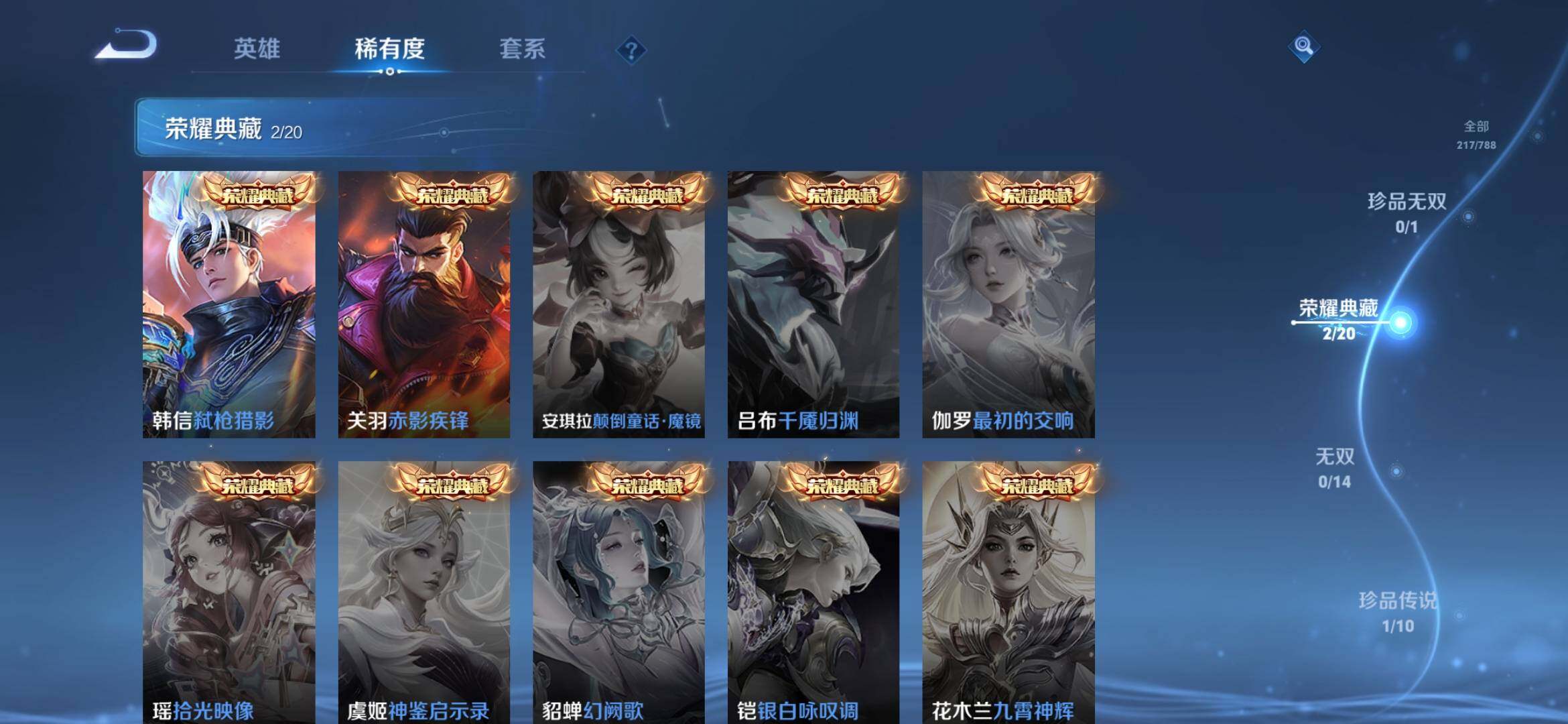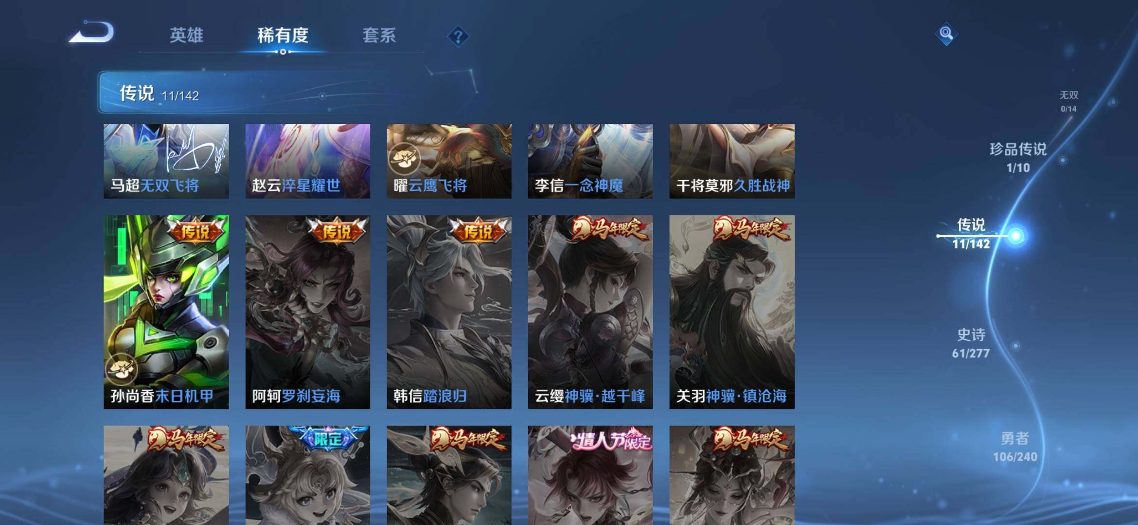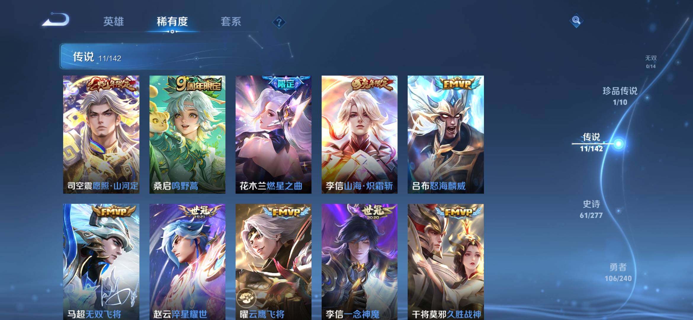【传说皮肤】:司空震愿照山河定,桑启鸣野蒿,花木兰燃星之曲,李信山海炽霜斩,吕布怒海麟威,马超无双飞将,赵云淬星耀世,曜云鹰飞将,李信一念神魔,干将莫邪久胜战神,孙尚香末日机甲