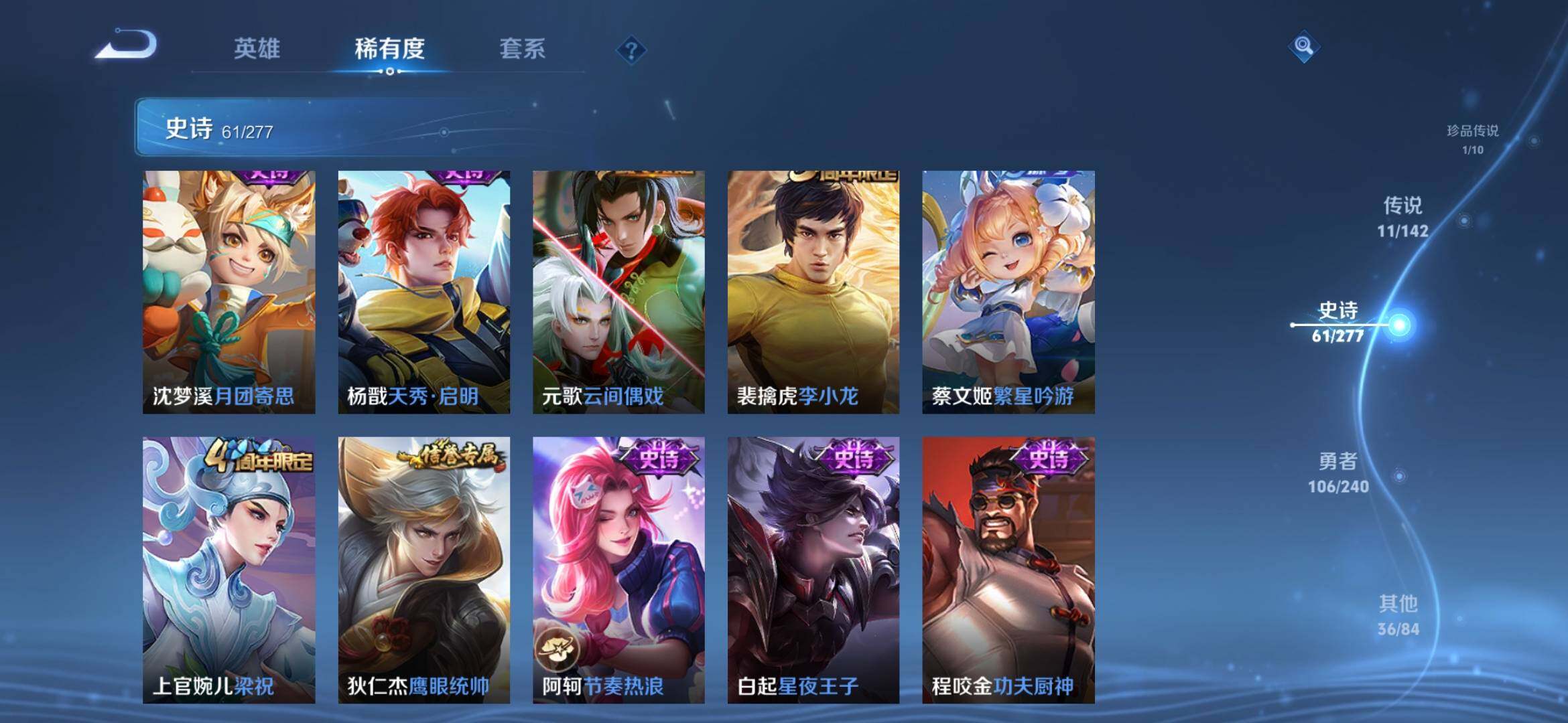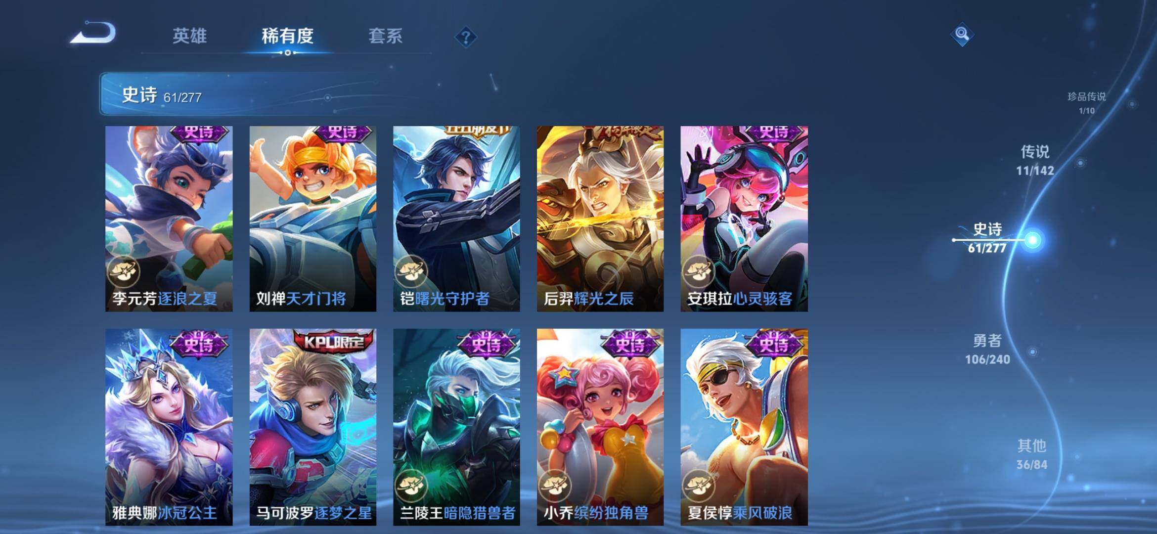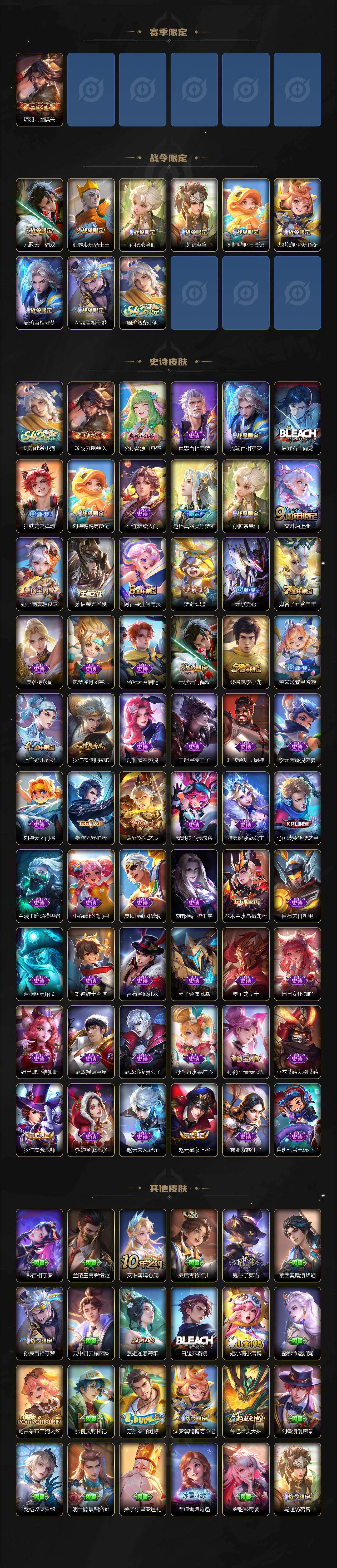 【史诗皮肤】:周瑜线条小狗,项羽九幽镇关,公孙离涂山容容,黄忠百相守梦,周瑜百相守梦,后羿石田雨龙,狂铁龙之律动,刘禅鸭鸭历险记,亚连糖绘人间,赵怀真器灵浮梦炉,孙膑茶境仙,艾琳陌上桑,姬小满妄想食味,蒙恬荣光圣徽,阿古朵江河有灵,梦奇顽趣,元歌无心,鬼谷子五谷丰年,夏洛特永昼,沈梦溪月团寄思,杨戬天秀启明,元歌云间偶戏,裴擒虎李小龙,蔡文姬繁星吟游,上官婉儿梁祝,狄仁杰鹰眼统帅,阿轲节奏热浪,白起星夜王子,程咬金功夫厨神,李元芳逐浪之夏,刘禅天才门将,铠曙光守护者,后羿辉光之辰,安琪拉心灵骇客,雅典娜冰冠公主,马可波罗逐梦之星,兰陵王暗隐猎兽者,小乔缤纷独角兽,夏侯惇乘风破浪,刘邦德古拉伯爵,花木兰水晶猎龙者,吕布末日机甲,曹操幽灵船长,刘禅绅士熊喵,吕布圣诞狂欢,墨子金属风暴,墨子龙骑士,妲己女仆咖啡,妲己魅力维加斯,嬴政摇滚巨星,嬴政暗夜贵公子,孙尚香水果甜心,孙尚香蔷薇恋人,宫本武藏鬼剑武藏,狄仁杰魔术师,貂蝉圣诞恋歌,赵云未来纪元,赵云皇家上将,露娜紫霞仙子,鲁班七号电玩小子