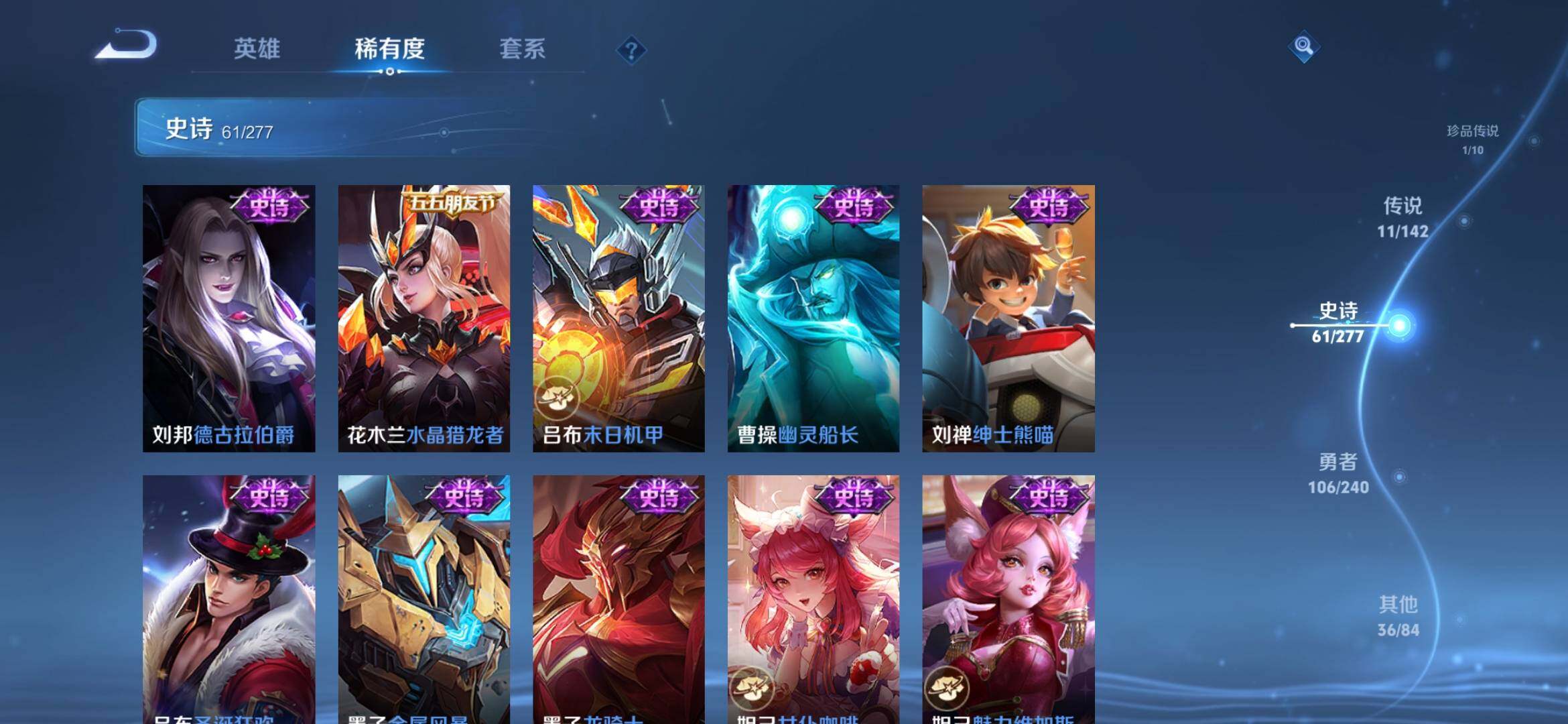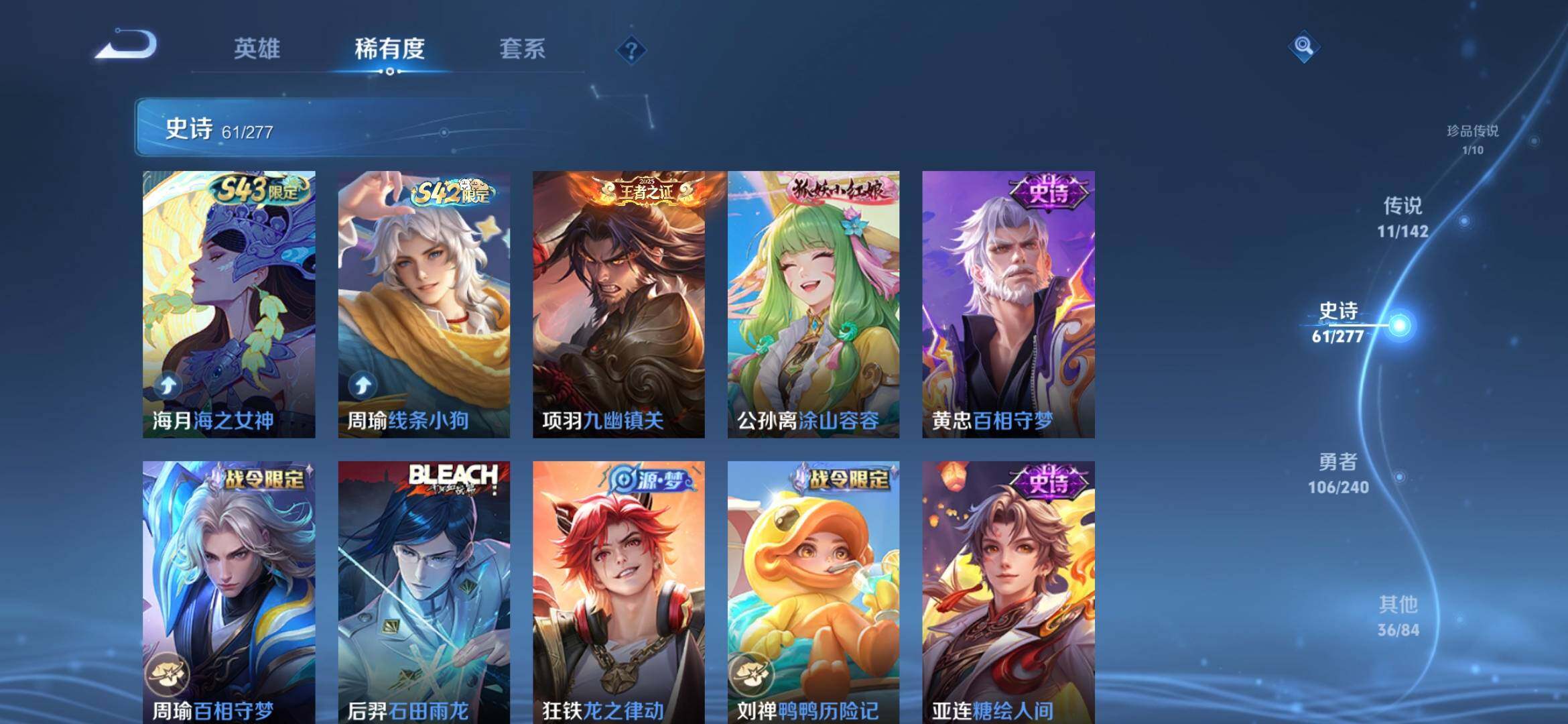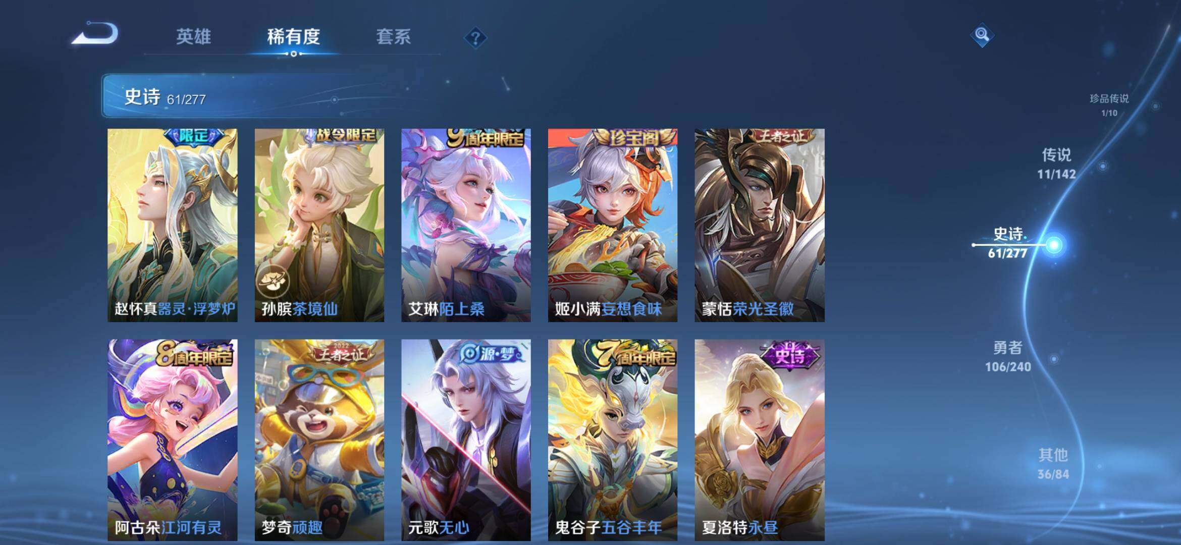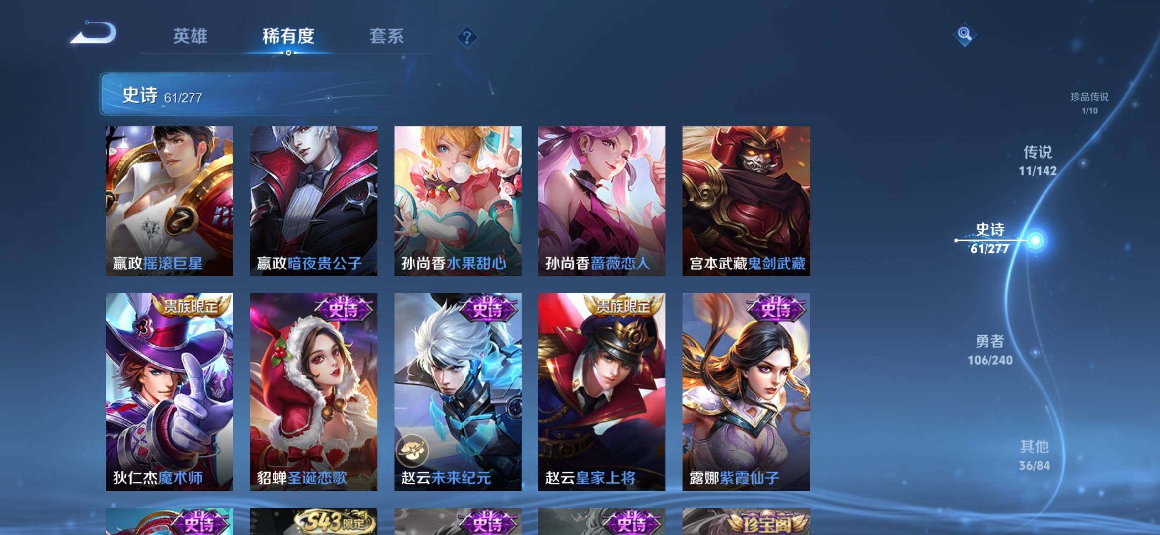 【史诗皮肤】:周瑜线条小狗,项羽九幽镇关,公孙离涂山容容,黄忠百相守梦,周瑜百相守梦,后羿石田雨龙,狂铁龙之律动,刘禅鸭鸭历险记,亚连糖绘人间,赵怀真器灵浮梦炉,孙膑茶境仙,艾琳陌上桑,姬小满妄想食味,蒙恬荣光圣徽,阿古朵江河有灵,梦奇顽趣,元歌无心,鬼谷子五谷丰年,夏洛特永昼,沈梦溪月团寄思,杨戬天秀启明,元歌云间偶戏,裴擒虎李小龙,蔡文姬繁星吟游,上官婉儿梁祝,狄仁杰鹰眼统帅,阿轲节奏热浪,白起星夜王子,程咬金功夫厨神,李元芳逐浪之夏,刘禅天才门将,铠曙光守护者,后羿辉光之辰,安琪拉心灵骇客,雅典娜冰冠公主,马可波罗逐梦之星,兰陵王暗隐猎兽者,小乔缤纷独角兽,夏侯惇乘风破浪,刘邦德古拉伯爵,花木兰水晶猎龙者,吕布末日机甲,曹操幽灵船长,刘禅绅士熊喵,吕布圣诞狂欢,墨子金属风暴,墨子龙骑士,妲己女仆咖啡,妲己魅力维加斯,嬴政摇滚巨星,嬴政暗夜贵公子,孙尚香水果甜心,孙尚香蔷薇恋人,宫本武藏鬼剑武藏,狄仁杰魔术师,貂蝉圣诞恋歌,赵云未来纪元,赵云皇家上将,露娜紫霞仙子,鲁班七号电玩小子