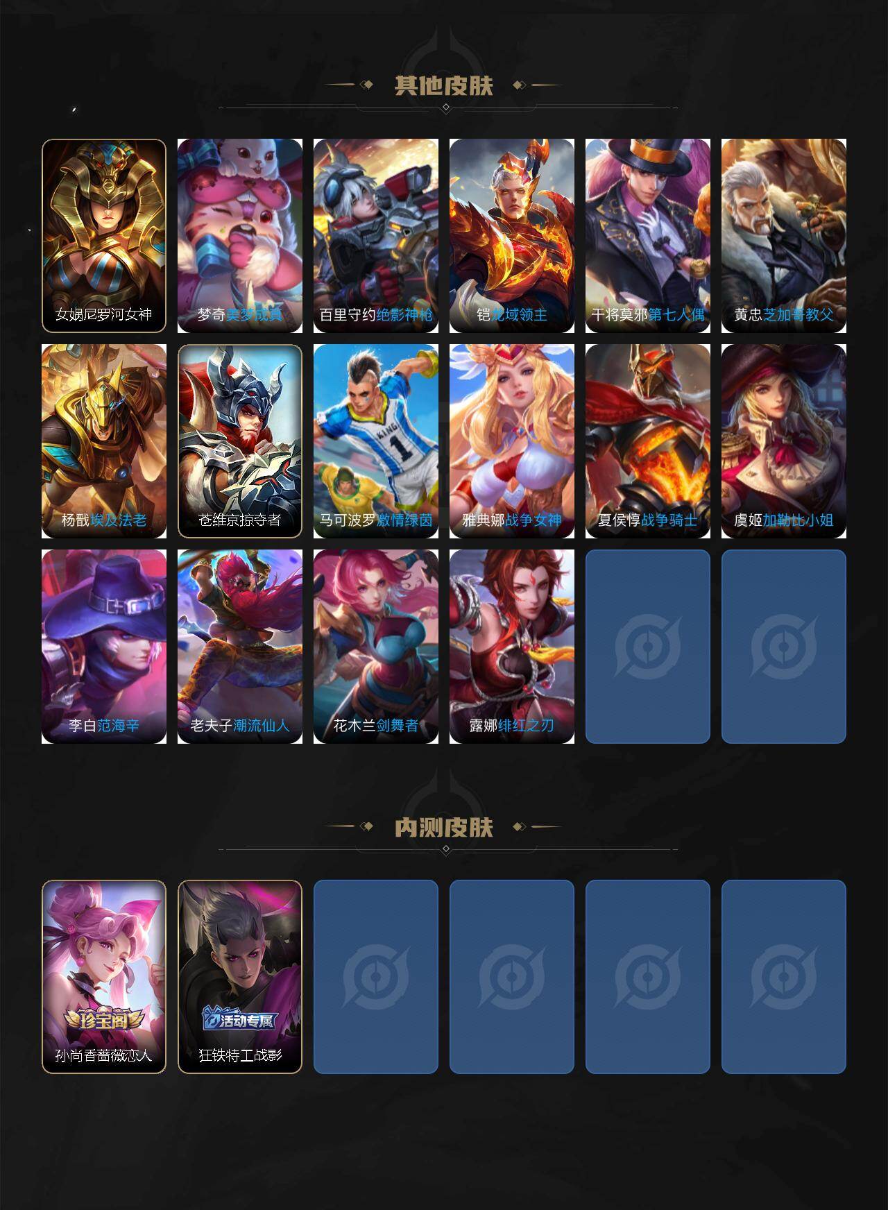 【其他皮肤】:影百相守梦,兰陵王雾影缉谜,艾琳鹤鸣心笺,桑启青衿临川,鬼谷子克喵,莱西奥踏浪烽翎,孙策百相守梦,云中君云械蓝图,甄姬逆浪荇歌,白起死霸装,姬小满小满鸭,露娜命运加冕,阿古朵布丁狗之约,张良灵野札记,苏烈春野闲踪,沈梦溪鸭鸭历险记,钟馗虚灵犬护,刘备浪漫序章,戈娅玫蓝誓约,明世隐景韶洛都,姜子牙星梦巡礼,西施雪境奇遇,影魅影绮裳,马超访茗客,典韦铁骨偃魂,太乙真人谧流熔炉,苍苍林狼骑,吕布逐霄战戟,干将莫邪雾都夜雨,东皇太一噬灭天穹,周瑜熔金海岸,姜子牙天穹之誓,刘邦剑破天穹,廉颇功夫炙烤,海诺时空谍影,鬼谷子天穹祈灯,后羿完美运算,海月王牌新星,张良古海寻踪,李元芳妄想特派,姬小满零食大作战,鲁班大师探海日志,莱西奥西部游侠,太乙真人劲辣红锅,裴擒虎擒涛扼浪,赵怀真太极少年,白起乐园追猎者,猪八戒潮玩探月行,海月幻泉雾影,桑启海盐诗旅,李元芳云中旅人,蒙恬蔚蓝守将,沈梦溪大漠名商,兰陵王金庭之子,程咬金无双福将,达摩沙漠行僧,苏烈千军破阵,鲁班大师乓乓大师,钟馗驱傩正仪,张良缤纷绘卷,程咬金演武夺筹,杨戬次元傲视,刘禅秘密基地,亚瑟潮玩骑士王,狄仁杰万华元夜,鬼谷子原初探秘者,狂铁特工战影,老夫子醍醐杖,明世隐疑决卦,哪吒次元突破,沈梦溪鲨炮海盗猫,吕布野性能量,庄周奇妙博物学,明世隐虹云星官,项羽科学大爆炸,苏烈坚韧之力,鬼谷子幻乐之宴,李白敏锐之力,诸葛亮掌控之力,孙尚香沉稳之力,老夫子功夫老勺,钟无艳海滩丽影,关羽龙腾万里,刘备纽约教父,狄仁杰阴阳师,宫本武藏万象初新,甄姬花好人间,张飞五福同心,达摩拳王,亚瑟死亡骑士,典韦黄金武士,孙膑天使之翼,安琪拉玩偶对对碰,扁鹊救世之瞳,武则天东方不败,牛魔西部大镖客,白起白色死神,程咬金星际陆战队,芈月红桃皇后,赵云忍炎影,达摩大发明家,阿轲爱心护理,露娜哥特玫瑰,韩信街头霸王,韩信教廷特使,项羽海滩派对,暃碧珀绯影,金蝉前尘,云缨赤焰之缨,司空震启蛰,澜孤猎,蒙恬秩序猎龙将,镜冰刃幻境,马超幸存者,曜归虚梦演,云中君荷鲁斯之眼,盘古创世神祝,猪八戒年年有余,嫦娥露花倒影,李信灼热之刃,伽罗花见巫女,盾山极冰防御线,元歌午夜歌剧院,弈星踏雪寻梅,裴擒虎街头旋风,公孙离花间舞,女娲尼罗河女神,梦奇美梦成真,百里守约绝影神枪,铠龙域领主,干将莫邪第七人偶,黄忠芝加哥教父,杨戬埃及法老,苍维京掠夺者,马可波罗激情绿茵,雅典娜战争女神,夏侯惇战争骑士,虞姬加勒比小姐,李白范海辛,老夫子潮流仙人,花木兰剑舞者,露娜绯红之刃