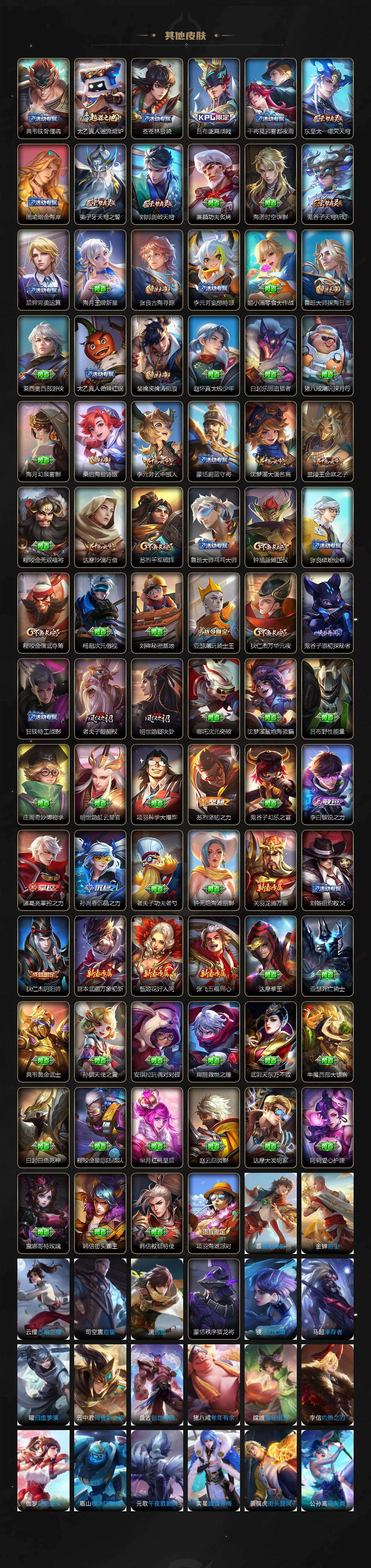 【限定皮肤】:姜子牙天穹之誓,狄仁杰阴阳师,赵云皇家上将,孙尚香蔷薇恋人,元歌云间偶戏,元歌无心,马可波罗逐梦之星,狄仁杰魔术师,狄仁杰万华元夜,达摩沙漠行僧,项羽海滩派对,老夫子醍醐杖,程咬金演武夺筹,兰陵王金庭之子,花木兰燃星之曲,亚瑟潮玩骑士王,后羿辉光之辰,李元芳云中旅人,钟馗驱傩正仪,蔡文姬繁星吟游,鬼谷子原初探秘者,鬼谷子五谷丰年,苏烈千军破阵,梦奇顽趣,沈梦溪大漠名商,明世隐疑决卦,裴擒虎李小龙,裴擒虎擒涛扼浪,李信山海炽霜斩,上官婉儿梁祝,鲁班大师探海日志,桑启海盐诗旅,阿古朵江河有灵,张良古海寻踪,蒙恬荣光圣徽,鬼谷子天穹祈灯,姬小满妄想食味,刘邦剑破天穹,周瑜熔金海岸