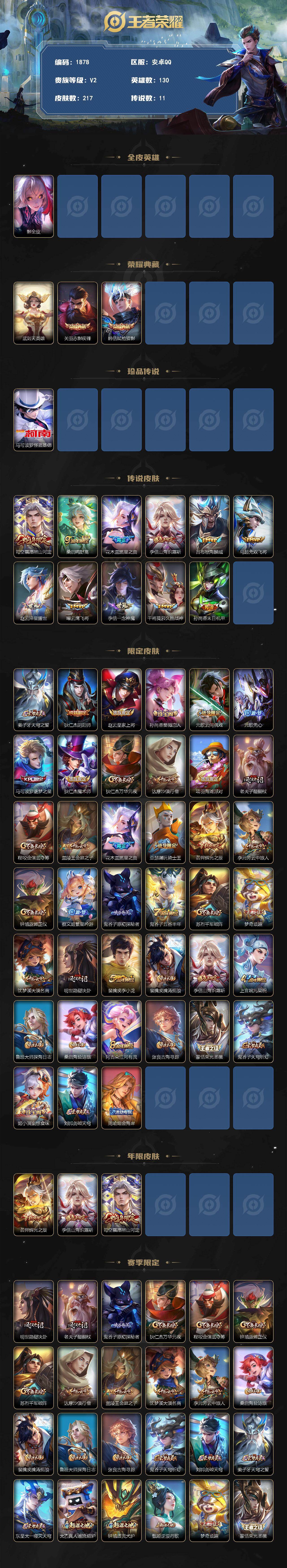 PX_2554598-【马可波罗怪盗基德,关羽赤影疾锋,韩信典藏,武则天】安卓Q-V2-至尊星耀V段位-130英雄-217皮肤-2典藏皮肤-1典藏英雄-1珍品传说-11传说-59史诗