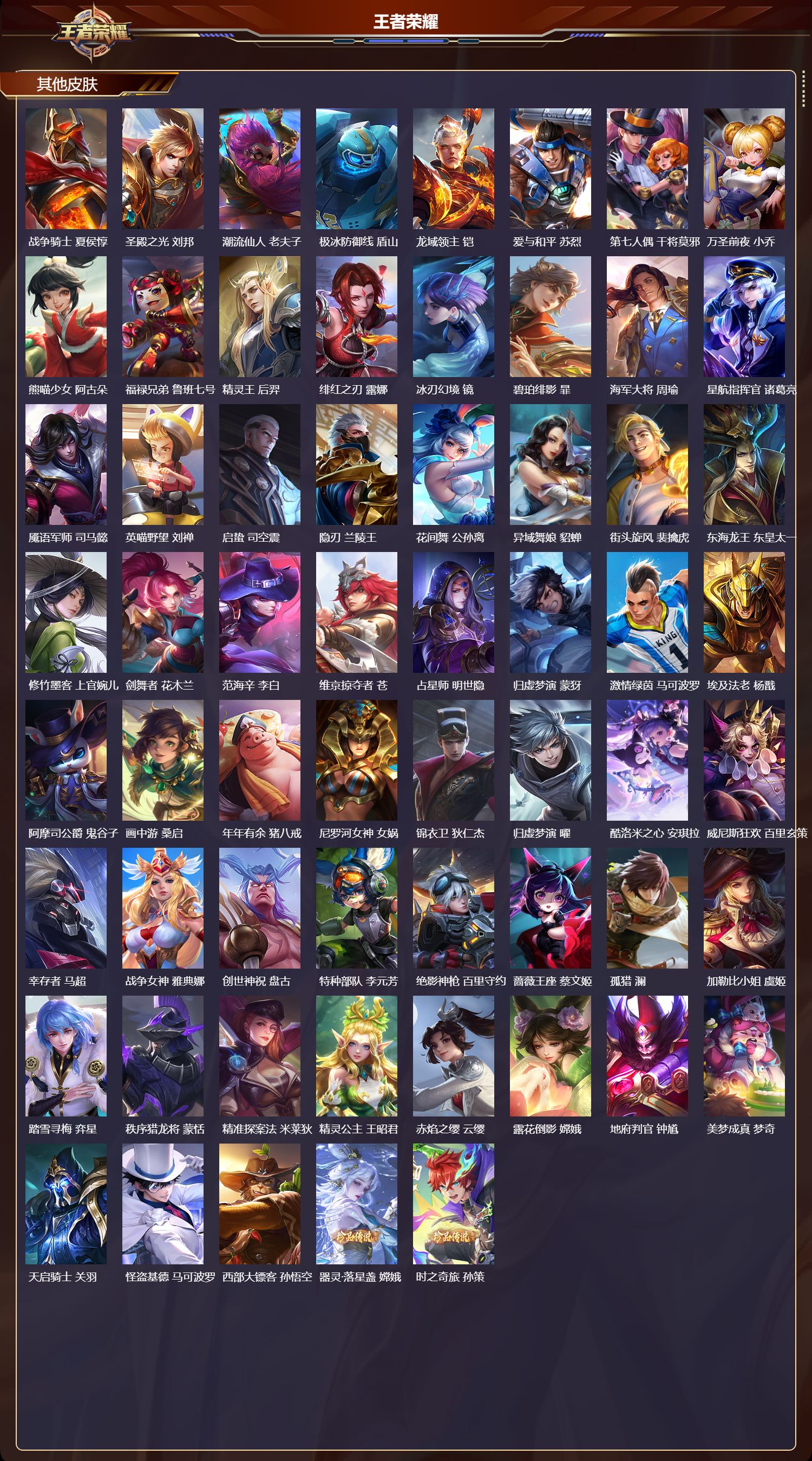 【64,其他皮肤】伊势巫女,大乔,金属狂潮,高渐离,前尘,金蝉,战争骑士,夏侯惇,圣殿之光,刘邦,潮流仙人,老夫子,极冰防御线,盾山,龙域领主,铠,爱与和平,苏烈,第七人偶,干将莫邪,万圣前夜,小乔,熊喵少女,阿古朵,福禄兄弟,鲁班七号,精灵王,后羿,绯红之刃,露娜,冰刃幻境,镜,碧珀绯影,暃,海军大将,周瑜,星航指挥官,诸葛亮,魇语军师,司马懿,英喵野望,刘禅,启蛰,司空震,隐刃,兰陵王,花间舞,公孙离,异域舞娘,貂蝉,街头旋风,裴擒虎,东海龙王,东皇太一,修竹墨客,上官婉儿,剑舞者,花木兰,范海辛,李白,维京掠夺者,苍,占星师,明世隐,归虚梦演,蒙犽,激情绿茵,马可波罗,埃及法老,杨戬,阿摩司公爵,鬼谷子,画中游,桑启,年年有余,猪八戒,尼罗河女神,女娲,锦衣卫,狄仁杰,归虚梦演,曜,酷洛米之心,安琪拉,威尼斯狂欢,百里玄策,幸存者,马超,战争女神,雅典娜,创世神祝,盘古,特种部队,李元芳,绝影神枪,百里守约,蔷薇王座,蔡文姬,孤猎,澜,加勒比小姐,虞姬,踏雪寻梅,弈星,秩序猎龙将,蒙恬,精准探案法,米莱狄,精灵公主,王昭君,赤焰之缨,云缨,露花倒影,嫦娥,地府判官,钟馗,美梦成真,梦奇,天启骑士,关羽,怪盗基德,马可波罗,西部大镖客,孙悟空,器灵·落星盏,嫦娥,时之奇旅,孙策,