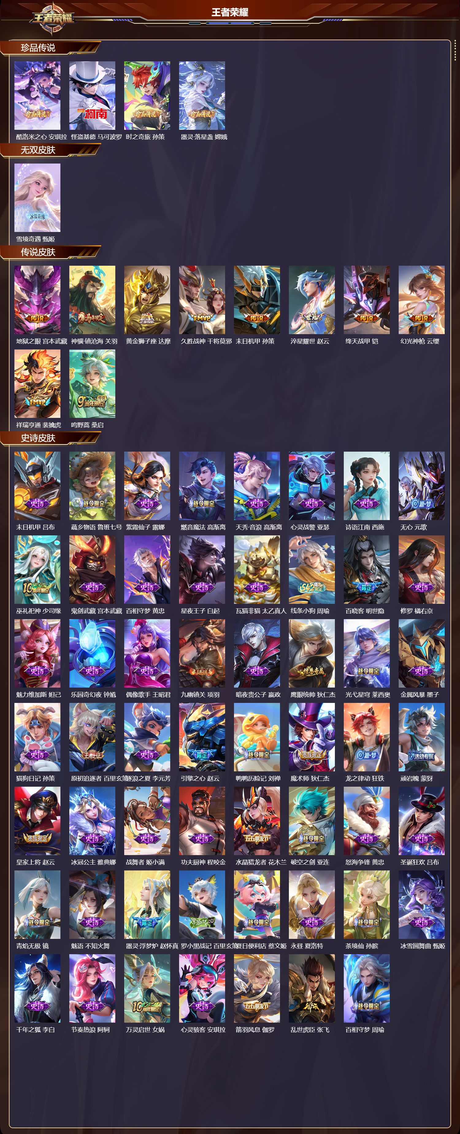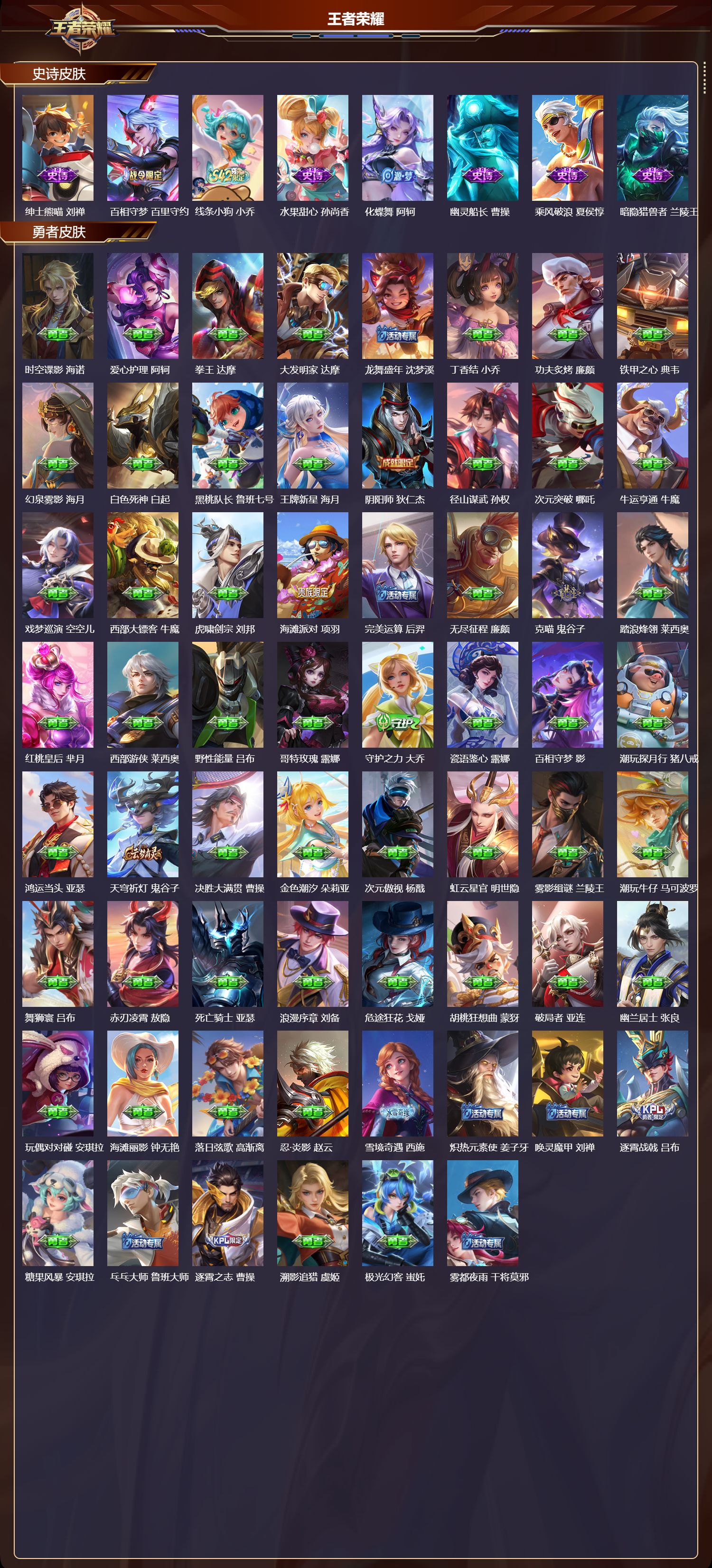 【63,史诗皮肤】末日机甲,吕布,蔬乡物语,鲁班七号,紫霞仙子,露娜,燃音魔法,高渐离,天秀·音浪,高渐离,心灵战警,亚瑟,诗语江南,西施,无心,元歌,巫礼祀神,少司缘,鬼剑武藏,宫本武藏,百相守梦,黄忠,星夜王子,白起,瓦猫非猫,太乙真人,线条小狗,周瑜,百晓客,明世隐,修罗,橘右京,魅力维加斯,妲己,乐园奇幻夜,钟馗,偶像歌手,王昭君,九幽镇关,项羽,暗夜贵公子,嬴政,鹰眼统帅,狄仁杰,光弋星穹,莱西奥,金属风暴,墨子,猫狗日记,孙策,原初追逐者,百里玄策,逐浪之夏,李元芳,引擎之心,赵云,鸭鸭历险记,刘禅,魔术师,狄仁杰,龙之律动,狂铁,顽岩魄,蒙犽,皇家上将,赵云,冰冠公主,雅典娜,战舞者,姬小满,功夫厨神,程咬金,水晶猎龙者,花木兰,破空之剑,亚连,怒海争锋,黄忠,圣诞狂欢,吕布,青焰无极,镜,魅语,不知火舞,器灵·浮梦炉,赵怀真,罗小黑战记,百里玄策,夏日便利店,蔡文姬,永昼,夏洛特,茶境仙,孙膑,冰雪圆舞曲,甄姬,千年之狐,李白,节奏热浪,阿轲,万灵启世,女娲,心灵骇客,安琪拉,箭羽风息,伽罗,乱世虎臣,张飞,百相守梦,周瑜,绅士熊喵,刘禅,百相守梦,百里守约,线条小狗,小乔,水果甜心,孙尚香,化蝶舞,阿轲,幽灵船长,曹操,乘风破浪,夏侯惇,暗隐猎兽者,兰陵王,