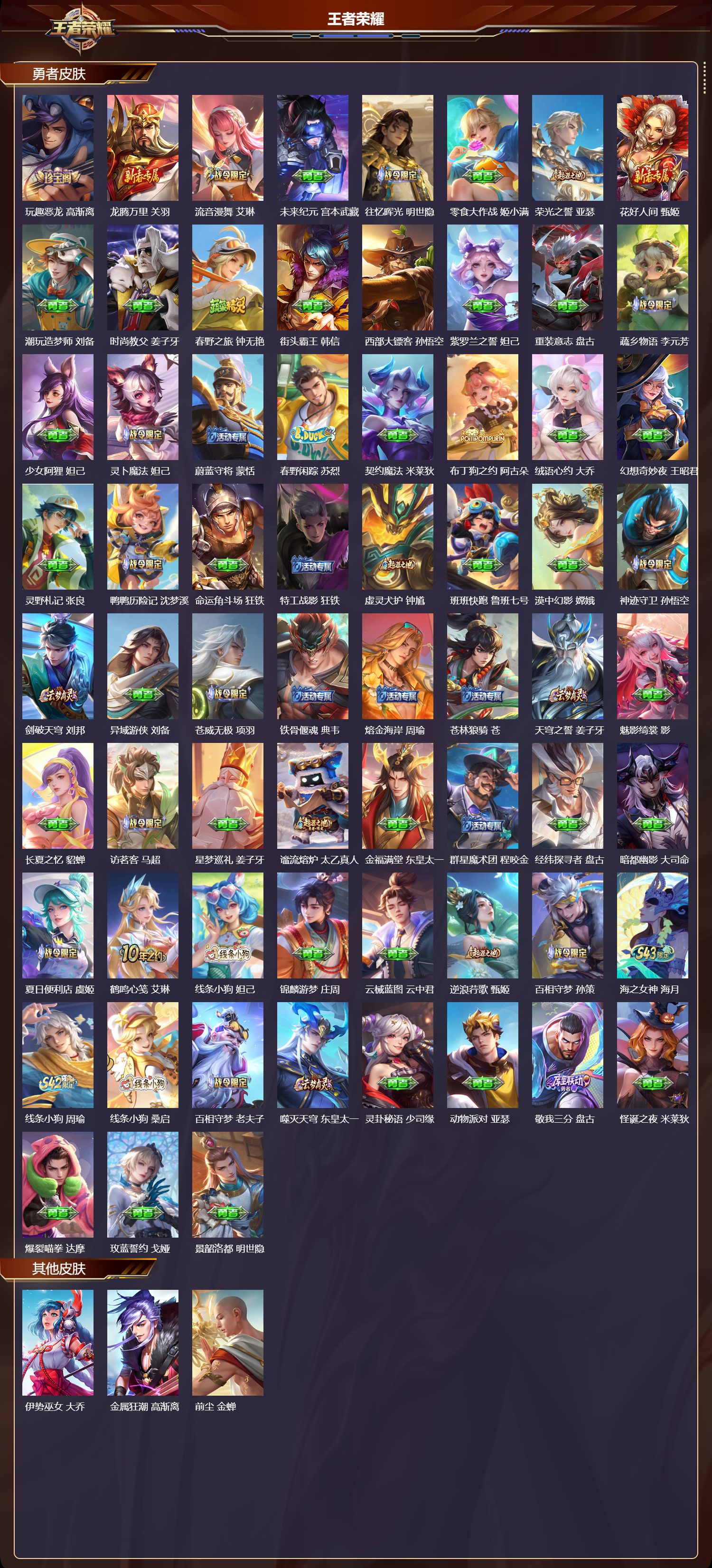 【129,勇者皮肤】时空谍影,海诺,爱心护理,阿轲,拳王,达摩,大发明家,达摩,龙舞盛年,沈梦溪,丁香结,小乔,功夫炙烤,廉颇,铁甲之心,典韦,幻泉雾影,海月,白色死神,白起,黑桃队长,鲁班七号,王牌新星,海月,阴阳师,狄仁杰,径山谋武,孙权,次元突破,哪吒,牛运亨通,牛魔,戏梦巡演,空空儿,西部大镖客,牛魔,虎啸剑宗,刘邦,海滩派对,项羽,完美运算,后羿,无尽征程,廉颇,克喵,鬼谷子,踏浪烽翎,莱西奥,红桃皇后,芈月,西部游侠,莱西奥,野性能量,吕布,哥特玫瑰,露娜,守护之力,大乔,瓷语鉴心,露娜,百相守梦,影,潮玩探月行,猪八戒,鸿运当头,亚瑟,天穹祈灯,鬼谷子,决胜大满贯,曹操,金色潮汐,朵莉亚,次元傲视,杨戬,虹云星官,明世隐,雾影缉谜,兰陵王,潮玩牛仔,马可波罗,舞狮寰,吕布,赤刃凌霄,敖隐,死亡骑士,亚瑟,浪漫序章,刘备,危途狂花,戈娅,胡桃狂想曲,蒙犽,破局者,亚连,幽兰居士,张良,玩偶对对碰,安琪拉,海滩丽影,钟无艳,落日弦歌,高渐离,忍·炎影,赵云,雪境奇遇,西施,炽热元素使,姜子牙,唤灵魔甲,刘禅,逐霄战戟,吕布,糖果风暴,安琪拉,乓乓大师,鲁班大师,逐霄之志,曹操,溯影追猎,虞姬,极光幻客,蚩奼,雾都夜雨,干将莫邪,玩趣恶龙,高渐离,龙腾万里,关羽,流音漫舞,艾琳,未来纪元,宫本武藏,往忆晖光,明世隐,零食大作战,姬小满,荣光之誓,亚瑟,花好人间,甄姬,潮玩造梦师,刘备,时尚教父,姜子牙,春野之旅,钟无艳,街头霸王,韩信,西部大镖客,孙悟空,紫罗兰之誓,妲己,重装意志,盘古,蔬乡物语,李元芳,少女阿狸,妲己,灵卜魔法,妲己,蔚蓝守将,蒙恬,春野闲踪,苏烈,契约魔法,米莱狄,布丁狗之约,阿古朵,绒语心约,大乔,幻想奇妙夜,王昭君,灵野札记,张良,鸭鸭历险记,沈梦溪,命运角斗场,狂铁,特工战影,狂铁,虚灵犬护,钟馗,班班快跑,鲁班七号,漠中幻影,嫦娥,神迹守卫,孙悟空,剑破天穹,刘邦,异域游侠,刘备,苍威无极,项羽,铁骨偃魂,典韦,熔金海岸,周瑜,苍林狼骑,苍,天穹之誓,姜子牙,魅影绮裳,影,长夏之忆,貂蝉,访茗客,马超,星梦巡礼,姜子牙,谧流熔炉,太乙真人,金福满堂,东皇太一,群星魔术团,程咬金,经纬探寻者,盘古,暗都幽影,大司命,夏日便利店,虞姬,鹤鸣心笺,艾琳,线条小狗,妲己,锦麟游梦,庄周,云械蓝图,云中君,逆浪荇歌,甄姬,百相守梦,孙策,海之女神,海月,线条小狗,周瑜,线条小狗,桑启,百相守梦,老夫子,噬灭天穹,东皇太一,灵卦秘语,少司缘,动物派对,亚瑟,敬我三分,盘古,怪诞之夜,米莱狄,爆裂喵拳,达摩,玫蓝誓约,戈娅,景韶洛都,明世隐,