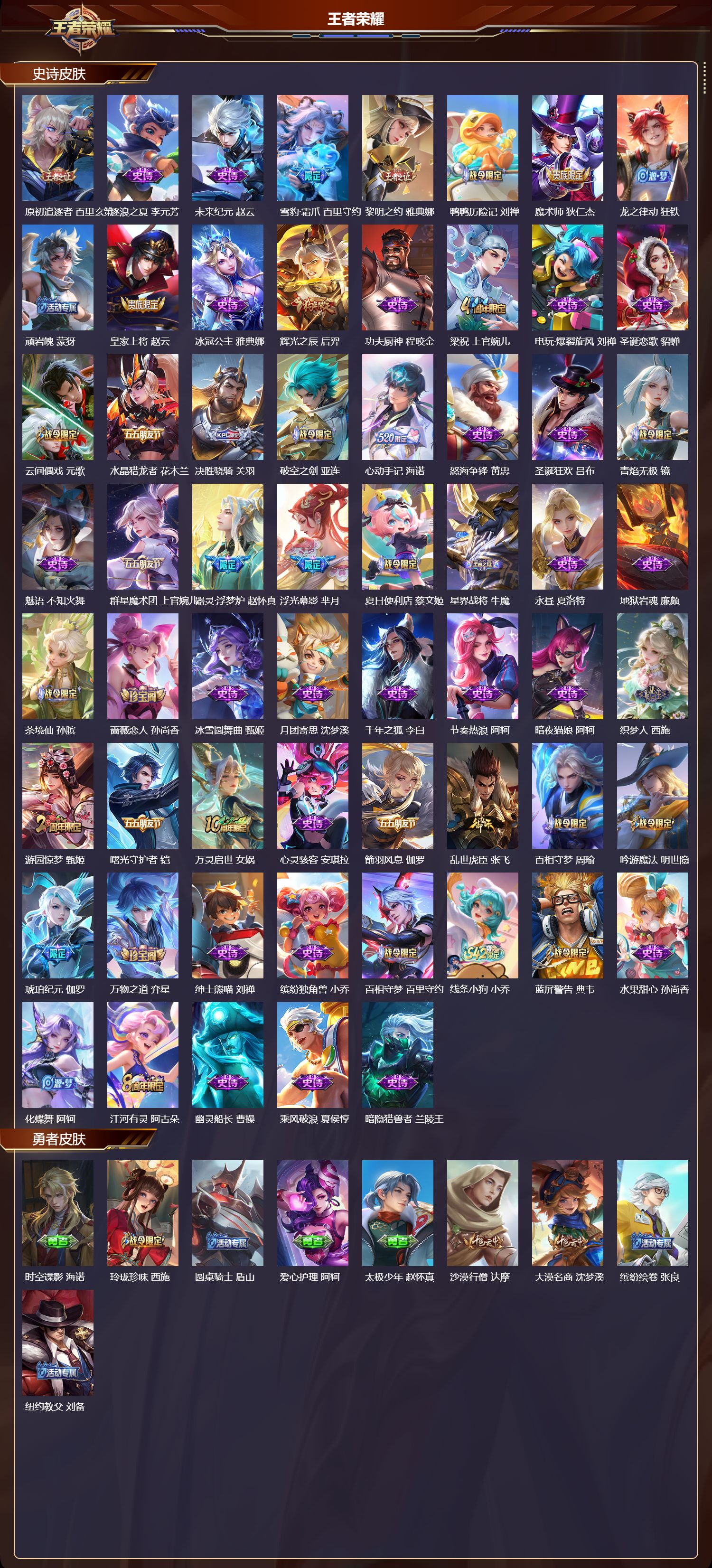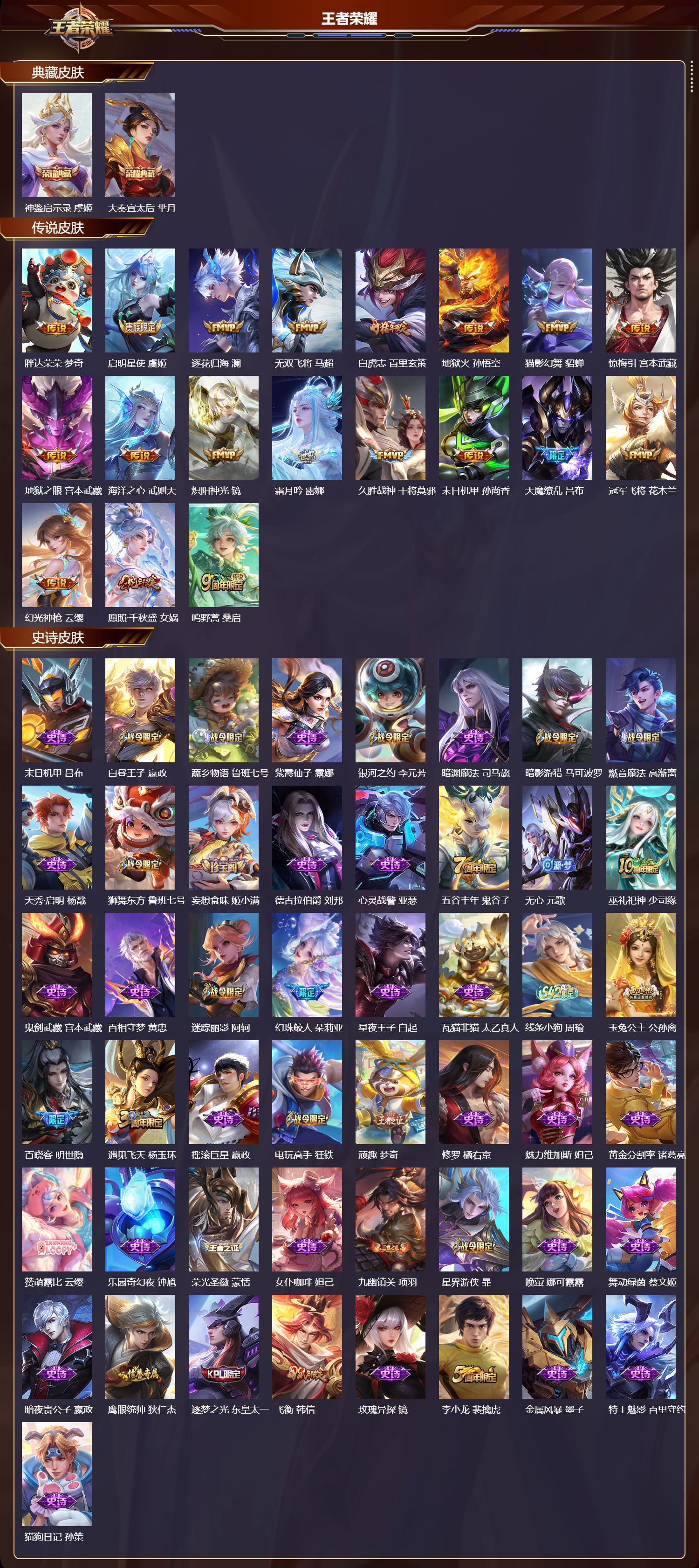 【110,史诗皮肤】末日机甲,吕布,白昼王子,嬴政,蔬乡物语,鲁班七号,紫霞仙子,露娜,银河之约,李元芳,暗渊魔法,司马懿,暗影游猎,马可波罗,燃音魔法,高渐离,天秀·启明,杨戬,狮舞东方,鲁班七号,妄想食味,姬小满,德古拉伯爵,刘邦,心灵战警,亚瑟,五谷丰年,鬼谷子,无心,元歌,巫礼祀神,少司缘,鬼剑武藏,宫本武藏,百相守梦,黄忠,迷踪丽影,阿轲,幻珠鲛人,朵莉亚,星夜王子,白起,瓦猫非猫,太乙真人,线条小狗,周瑜,玉兔公主,公孙离,百晓客,明世隐,遇见飞天,杨玉环,摇滚巨星,嬴政,电玩高手,狂铁,顽趣,梦奇,修罗,橘右京,魅力维加斯,妲己,黄金分割率,诸葛亮,赞萌露比,云缨,乐园奇幻夜,钟馗,荣光圣徽,蒙恬,女仆咖啡,妲己,九幽镇关,项羽,星界游侠,暃,晚萤,娜可露露,舞动绿茵,蔡文姬,暗夜贵公子,嬴政,鹰眼统帅,狄仁杰,逐梦之光,东皇太一,飞衡,韩信,玫瑰异探,镜,李小龙,裴擒虎,金属风暴,墨子,特工魅影,百里守约,猫狗日记,孙策,原初追逐者,百里玄策,逐浪之夏,李元芳,未来纪元,赵云,雪豹·霜爪,百里守约,黎明之约,雅典娜,鸭鸭历险记,刘禅,魔术师,狄仁杰,龙之律动,狂铁,顽岩魄,蒙犽,皇家上将,赵云,冰冠公主,雅典娜,辉光之辰,后羿,功夫厨神,程咬金,梁祝,上官婉儿,电玩·爆裂旋风,刘禅,圣诞恋歌,貂蝉,云间偶戏,元歌,水晶猎龙者,花木兰,决胜骁骑,关羽,破空之剑,亚连,心动手记,海诺,怒海争锋,黄忠,圣诞狂欢,吕布,青焰无极,镜,魅语,不知火舞,群星魔术团,上官婉儿,器灵·浮梦炉,赵怀真,浮光幕影,芈月,夏日便利店,蔡文姬,星界战将,牛魔,永昼,夏洛特,地狱岩魂,廉颇,茶境仙,孙膑,蔷薇恋人,孙尚香,冰雪圆舞曲,甄姬,月团寄思,沈梦溪,千年之狐,李白,节奏热浪,阿轲,暗夜猫娘,阿轲,织梦人,西施,游园惊梦,甄姬,曙光守护者,铠,万灵启世,女娲,心灵骇客,安琪拉,箭羽风息,伽罗,乱世虎臣,张飞,百相守梦,周瑜,吟游魔法,明世隐,琥珀纪元,伽罗,万物之道,弈星,绅士熊喵,刘禅,缤纷独角兽,小乔,百相守梦,百里守约,线条小狗,小乔,蓝屏警告,典韦,水果甜心,孙尚香,化蝶舞,阿轲,江河有灵,阿古朵,幽灵船长,曹操,乘风破浪,夏侯惇,暗隐猎兽者,兰陵王,