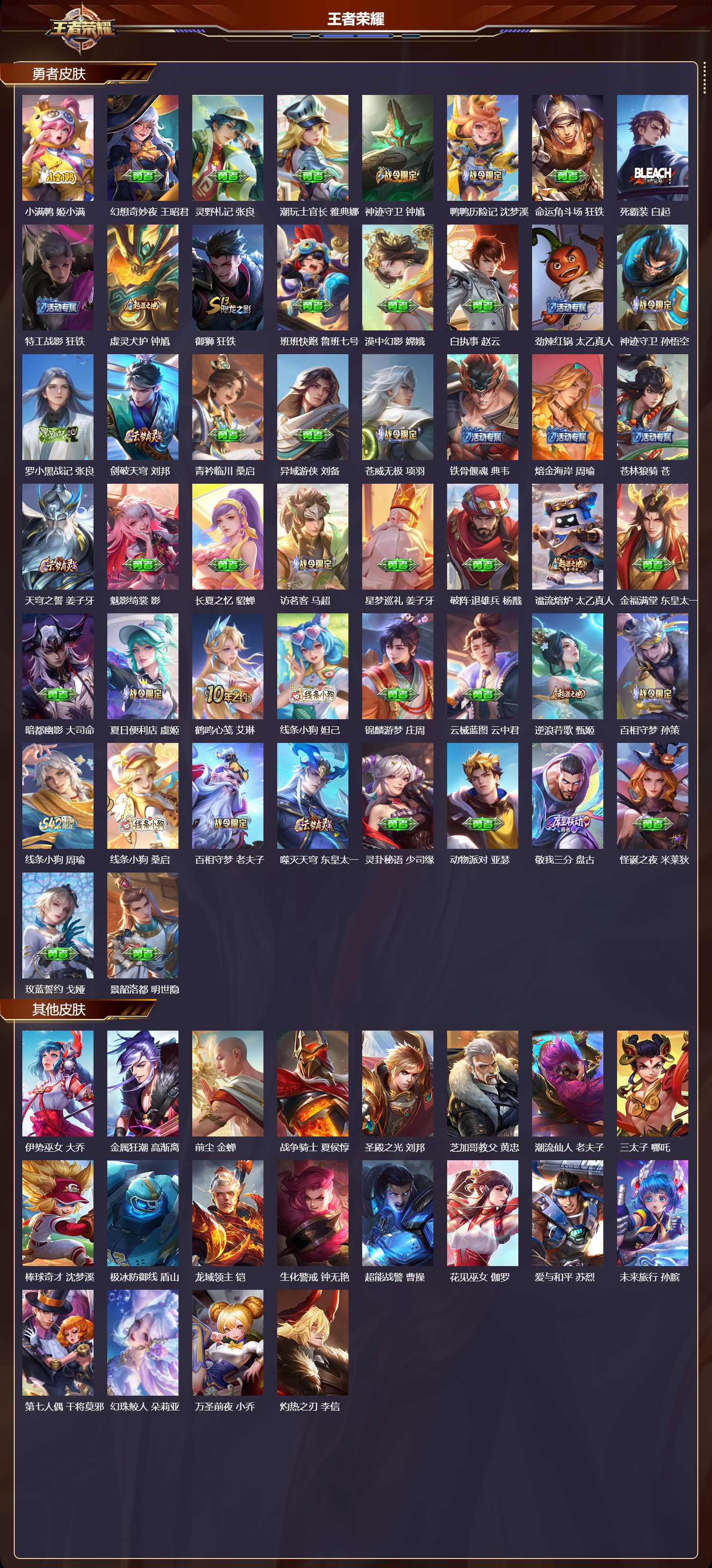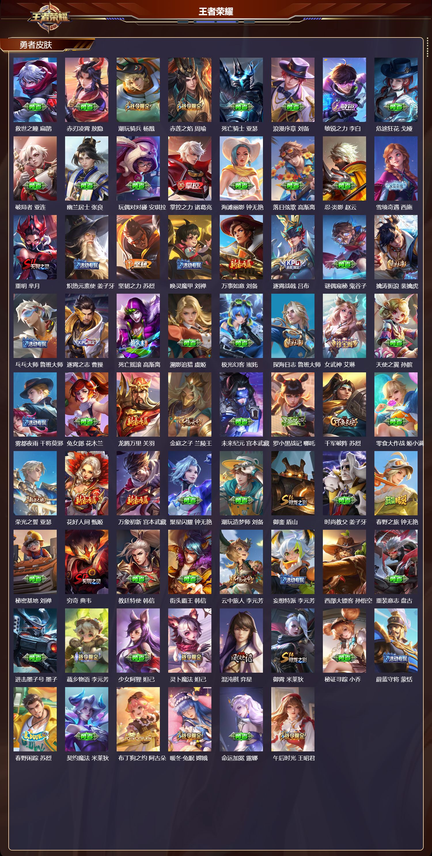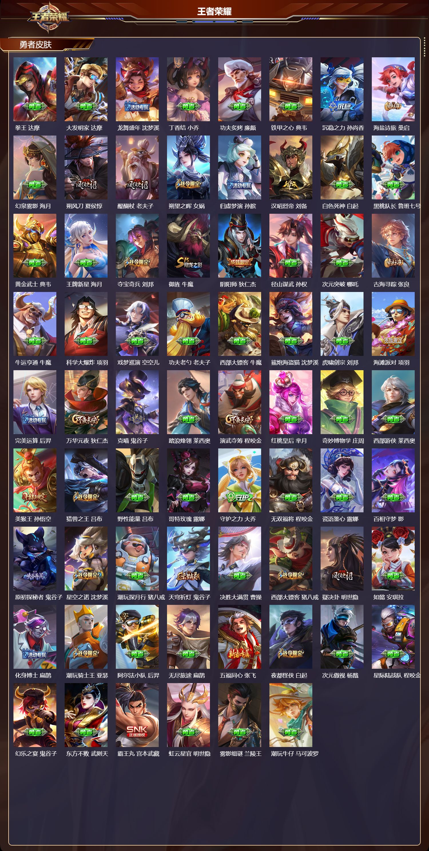 【199,勇者皮肤】时空谍影,海诺,玲珑珍味,西施,圆桌骑士,盾山,爱心护理,阿轲,太极少年,赵怀真,沙漠行僧,达摩,大漠名商,沈梦溪,缤纷绘卷,张良,纽约教父,刘备,拳王,达摩,大发明家,达摩,龙舞盛年,沈梦溪,丁香结,小乔,功夫炙烤,廉颇,铁甲之心,典韦,沉稳之力,孙尚香,海盐诗旅,桑启,幻泉雾影,海月,朔风刀,夏侯惇,醍醐杖,老夫子,朔望之晖,女娲,归虚梦演,孙膑,汉昭烈帝,刘备,白色死神,白起,黑桃队长,鲁班七号,黄金武士,典韦,王牌新星,海月,夺宝奇兵,刘邦,御旌,牛魔,阴阳师,狄仁杰,径山谋武,孙权,次元突破,哪吒,古海寻踪,张良,牛运亨通,牛魔,科学大爆炸,项羽,戏梦巡演,空空儿,功夫老勺,老夫子,西部大镖客,牛魔,鲨炮海盗猫,沈梦溪,虎啸剑宗,刘邦,海滩派对,项羽,完美运算,后羿,万华元夜,狄仁杰,克喵,鬼谷子,踏浪烽翎,莱西奥,演武夺筹,程咬金,红桃皇后,芈月,奇妙博物学,庄周,西部游侠,莱西奥,美猴王,孙悟空,猎兽之王,吕布,野性能量,吕布,哥特玫瑰,露娜,守护之力,大乔,无双福将,程咬金,瓷语鉴心,露娜,百相守梦,影,原初探秘者,鬼谷子,星空之诺,沈梦溪,潮玩探月行,猪八戒,天穹祈灯,鬼谷子,决胜大满贯,曹操,西部大镖客,猪八戒,疑决卦,明世隐,如懿,安琪拉,化身博士,扁鹊,潮玩骑士王,亚瑟,阿尔法小队,后羿,无尽旅途,扁鹊,五福同心,张飞,夜都怪侠,白起,次元傲视,杨戬,星际陆战队,程咬金,幻乐之宴,鬼谷子,东方不败,武则天,霸王丸,宫本武藏,虹云星官,明世隐,雾影缉谜,兰陵王,潮玩牛仔,马可波罗,救世之瞳,扁鹊,赤刃凌霄,敖隐,潮玩骑兵,杨戬,赤莲之焰,周瑜,死亡骑士,亚瑟,浪漫序章,刘备,敏锐之力,李白,危途狂花,戈娅,破局者,亚连,幽兰居士,张良,玩偶对对碰,安琪拉,掌控之力,诸葛亮,海滩丽影,钟无艳,落日弦歌,高渐离,忍·炎影,赵云,雪境奇遇,西施,重明,芈月,炽热元素使,姜子牙,坚韧之力,苏烈,唤灵魔甲,刘禅,万事如意,刘备,逐霄战戟,吕布,谜偶窥秘,鬼谷子,擒涛扼浪,裴擒虎,乓乓大师,鲁班大师,逐霄之志,曹操,死亡摇滚,高渐离,溯影追猎,虞姬,极光幻客,蚩奼,探海日志,鲁班大师,女武神,艾琳,天使之翼,孙膑,雾都夜雨,干将莫邪,兔女郎,花木兰,龙腾万里,关羽,金庭之子,兰陵王,未来纪元,宫本武藏,罗小黑战记,哪吒,千军破阵,苏烈,零食大作战,姬小满,荣光之誓,亚瑟,花好人间,甄姬,万象初新,宫本武藏,聚星闪耀,钟无艳,潮玩造梦师,刘备,御銮,盾山,时尚教父,姜子牙,春野之旅,钟无艳,秘密基地,刘禅,穷奇,典韦,教廷特使,韩信,街头霸王,韩信,云中旅人,李元芳,妄想特派,李元芳,西部大镖客,孙悟空,重装意志,盘古,进击墨子号,墨子,蔬乡物语,李元芳,少女阿狸,妲己,灵卜魔法,妲己,混沌棋,弈星,御霄,米莱狄,秘证寻踪,小乔,蔚蓝守将,蒙恬,春野闲踪,苏烈,契约魔法,米莱狄,布丁狗之约,阿古朵,暖冬·兔眠,嫦娥,命运加冕,露娜,午后时光,王昭君,小满鸭,姬小满,幻想奇妙夜,王昭君,灵野札记,张良,潮玩士官长,雅典娜,神迹守卫,钟馗,鸭鸭历险记,沈梦溪,命运角斗场,狂铁,死霸装,白起,特工战影,狂铁,虚灵犬护,钟馗,御狮,狂铁,班班快跑,鲁班七号,漠中幻影,嫦娥,白执事,赵云,劲辣红锅,太乙真人,神迹守卫,孙悟空,罗小黑战记,张良,剑破天穹,刘邦,青衿临川,桑启,异域游侠,刘备,苍威无极,项羽,铁骨偃魂,典韦,熔金海岸,周瑜,苍林狼骑,苍,天穹之誓,姜子牙,魅影绮裳,影,长夏之忆,貂蝉,访茗客,马超,星梦巡礼,姜子牙,破阵·退雄兵,杨戬,谧流熔炉,太乙真人,金福满堂,东皇太一,暗都幽影,大司命,夏日便利店,虞姬,鹤鸣心笺,艾琳,线条小狗,妲己,锦麟游梦,庄周,云械蓝图,云中君,逆浪荇歌,甄姬,百相守梦,孙策,线条小狗,周瑜,线条小狗,桑启,百相守梦,老夫子,噬灭天穹,东皇太一,灵卦秘语,少司缘,动物派对,亚瑟,敬我三分,盘古,怪诞之夜,米莱狄,玫蓝誓约,戈娅,景韶洛都,明世隐,